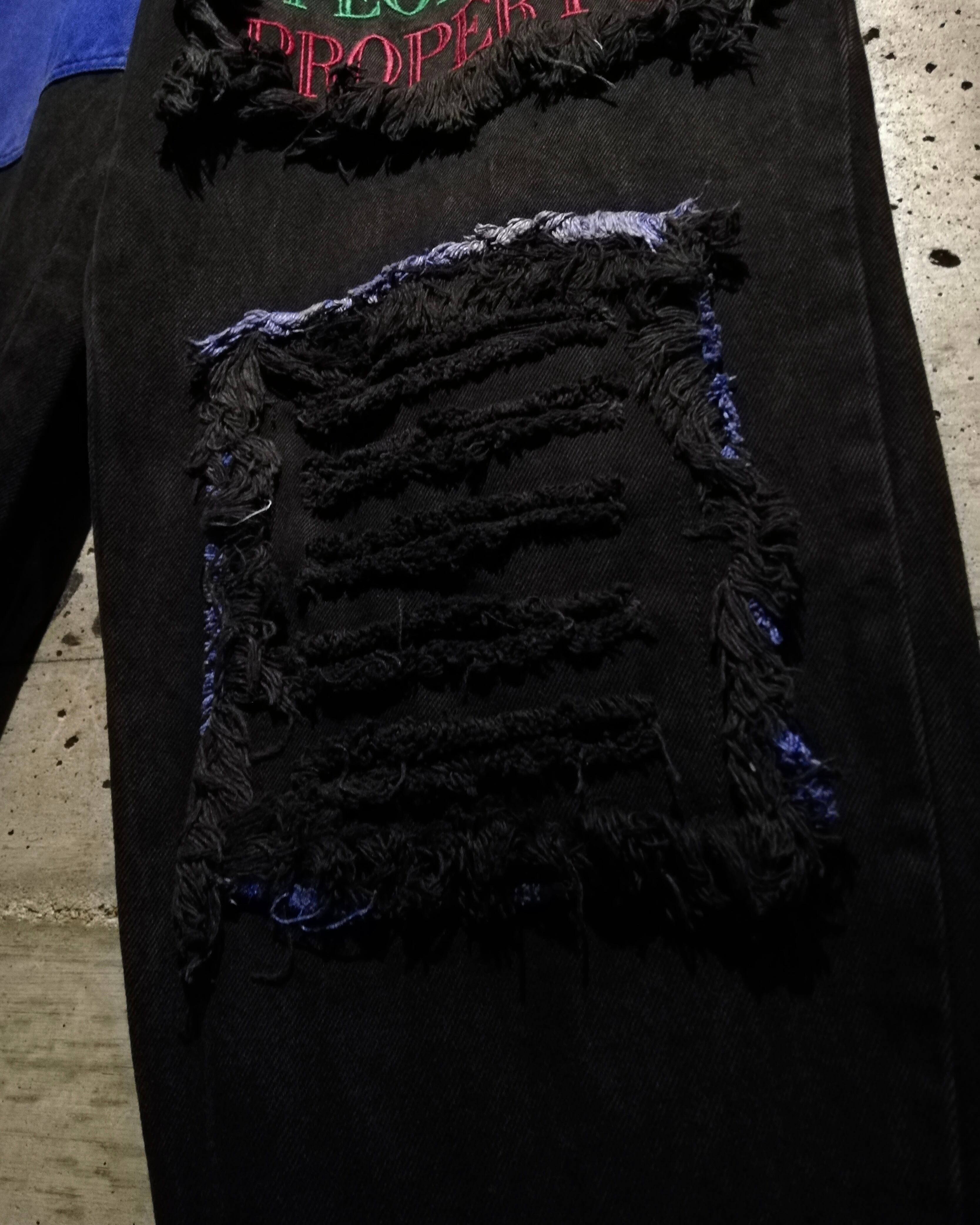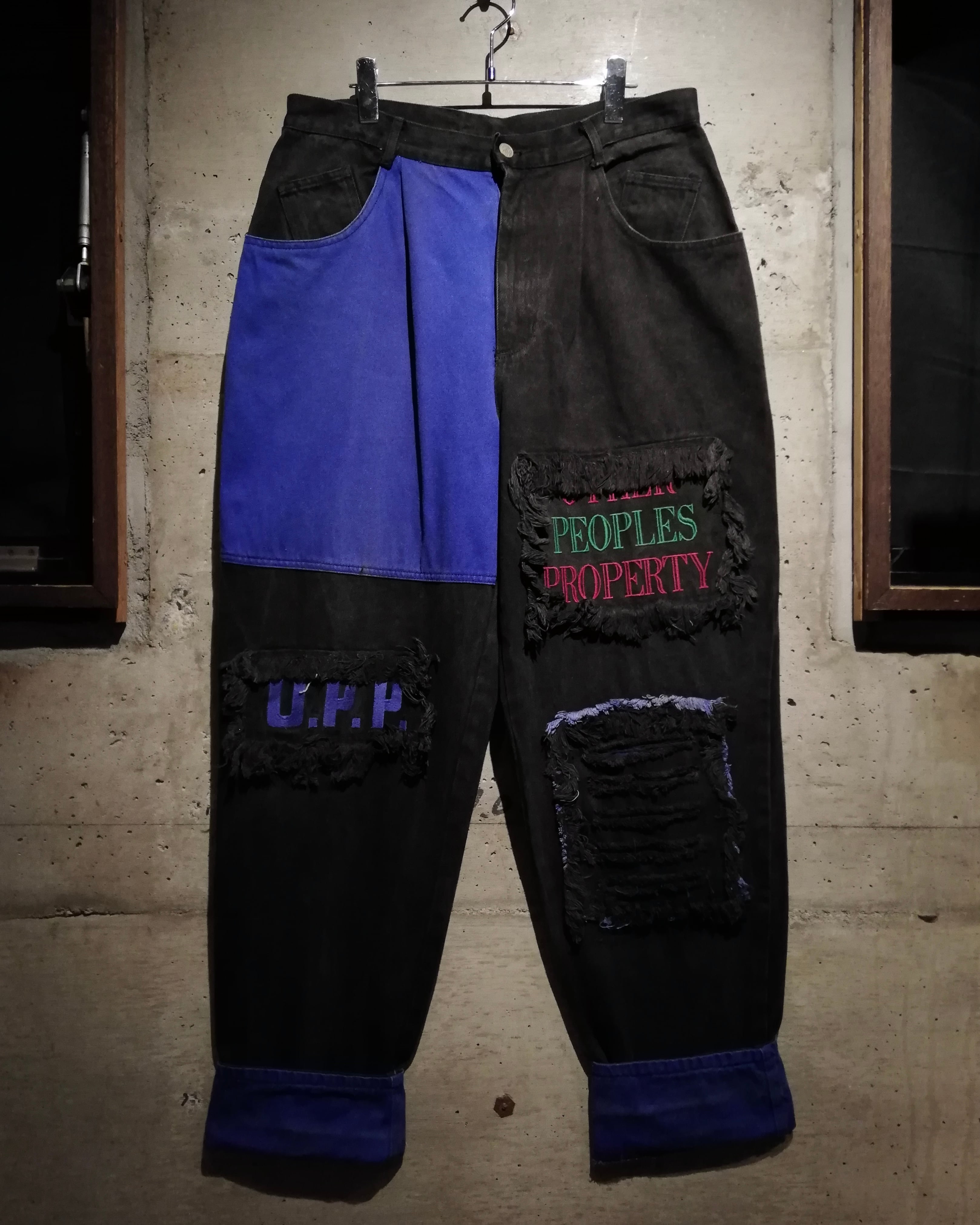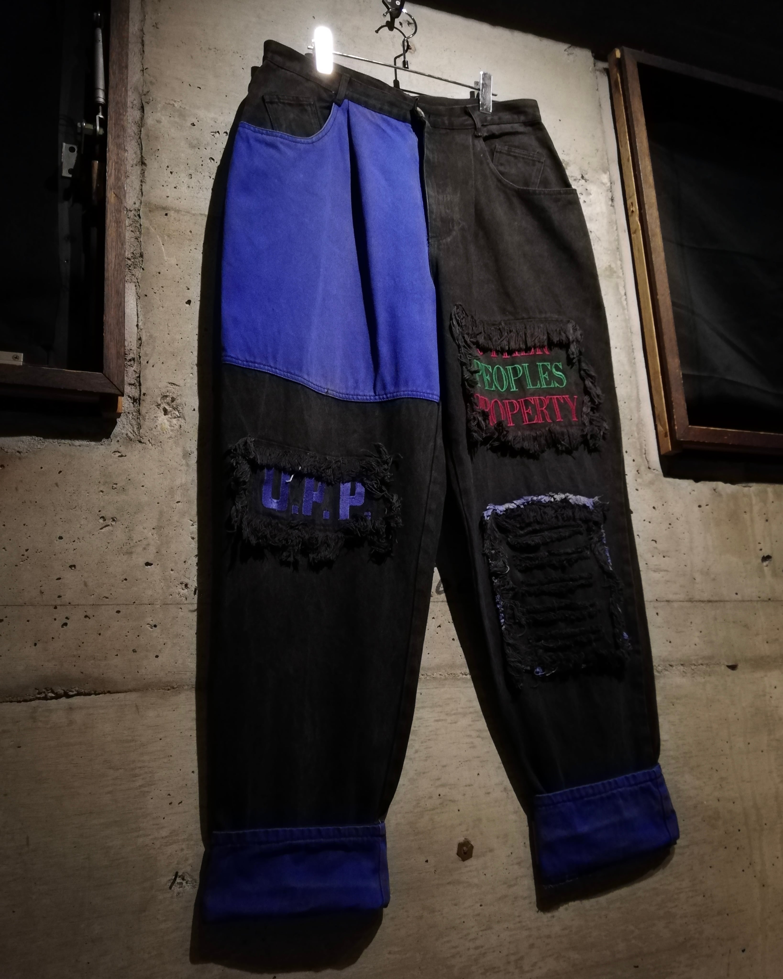 フェードの効いたブラックデニムをベースに、フロント右腿にはパネル状にパープルの切り替え。さらに「PEOPLES PROPERTY」「U.P.P.」といった刺繍をダメージ風のフリンジ加工と組み合わせた、メッセージ性とラギッドなムードを兼ね備えた唯一無二の存在感を見せる1本。