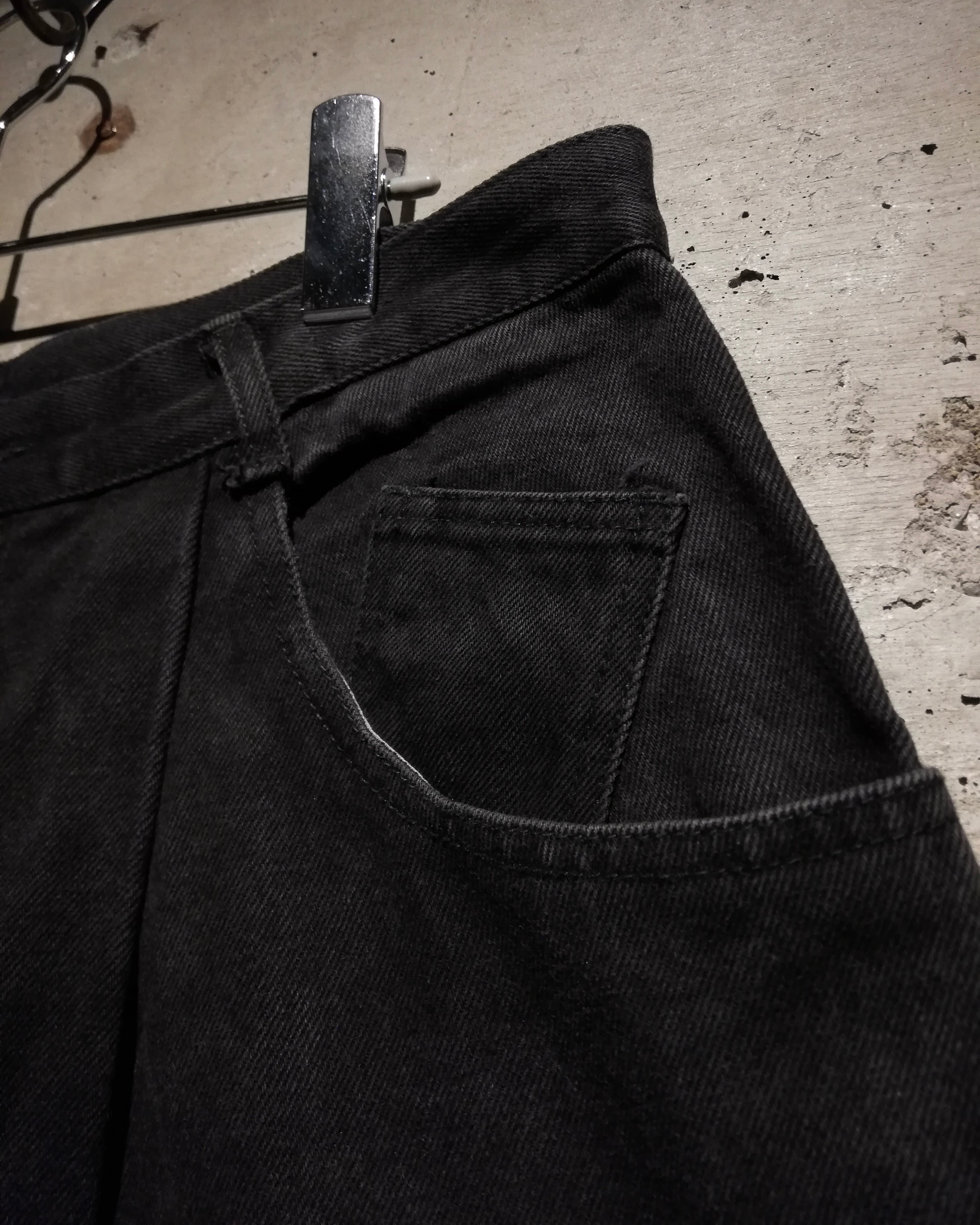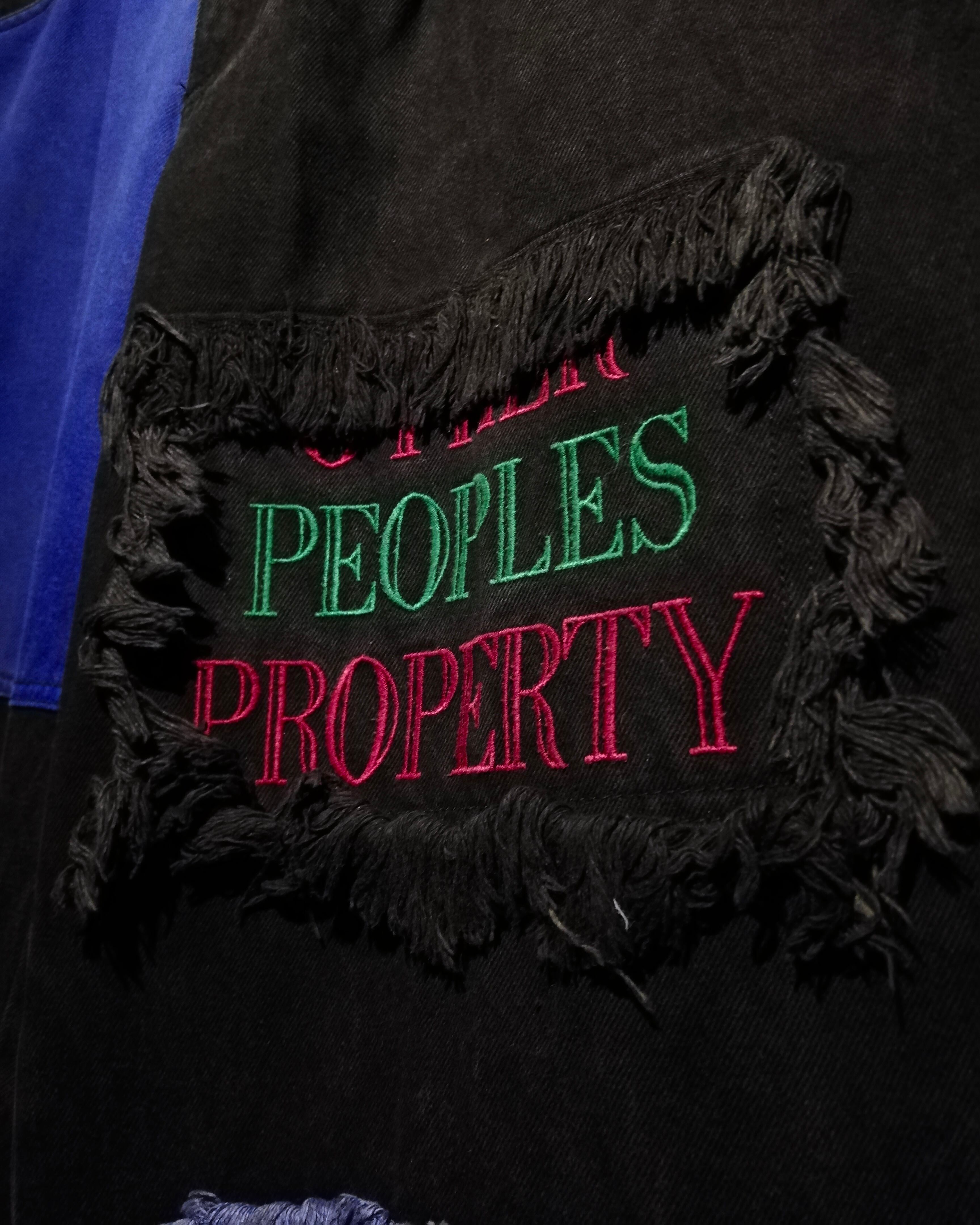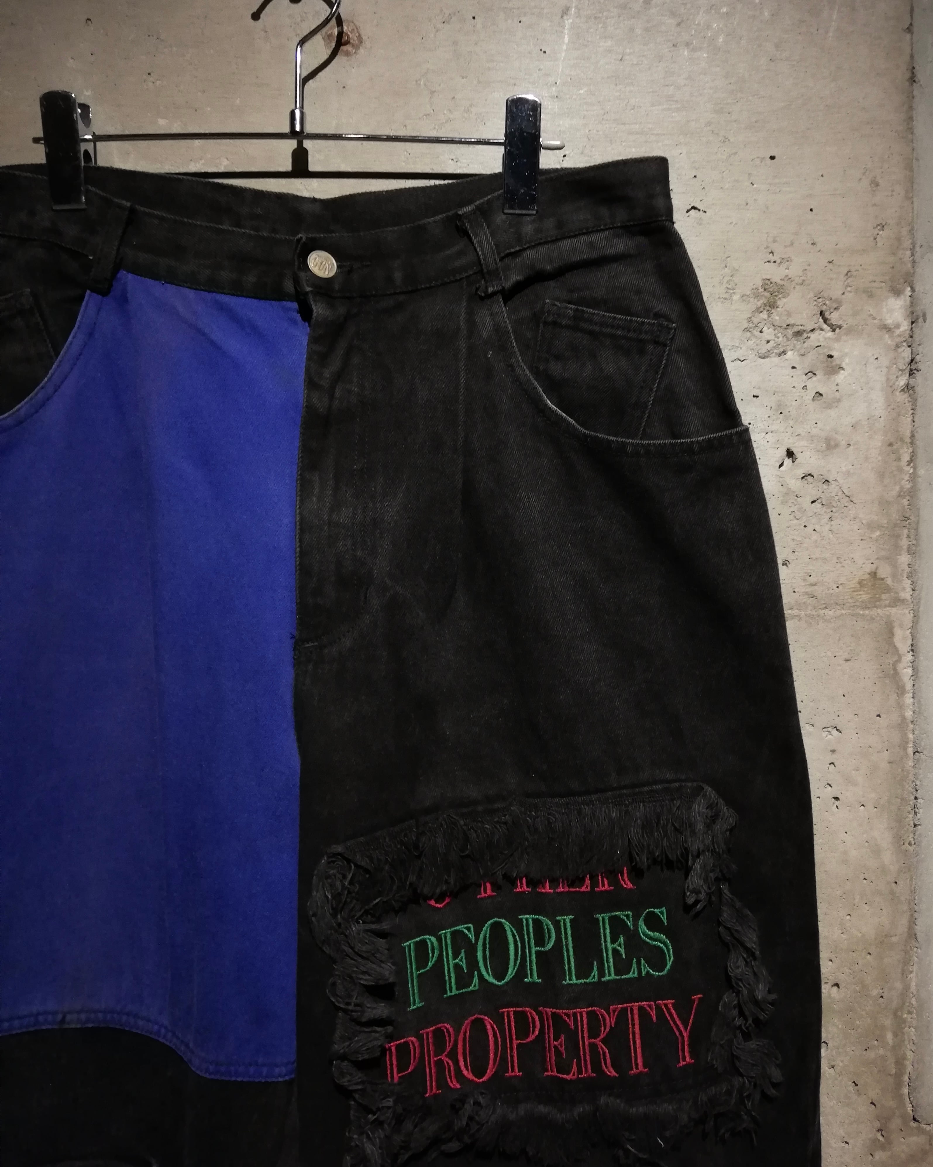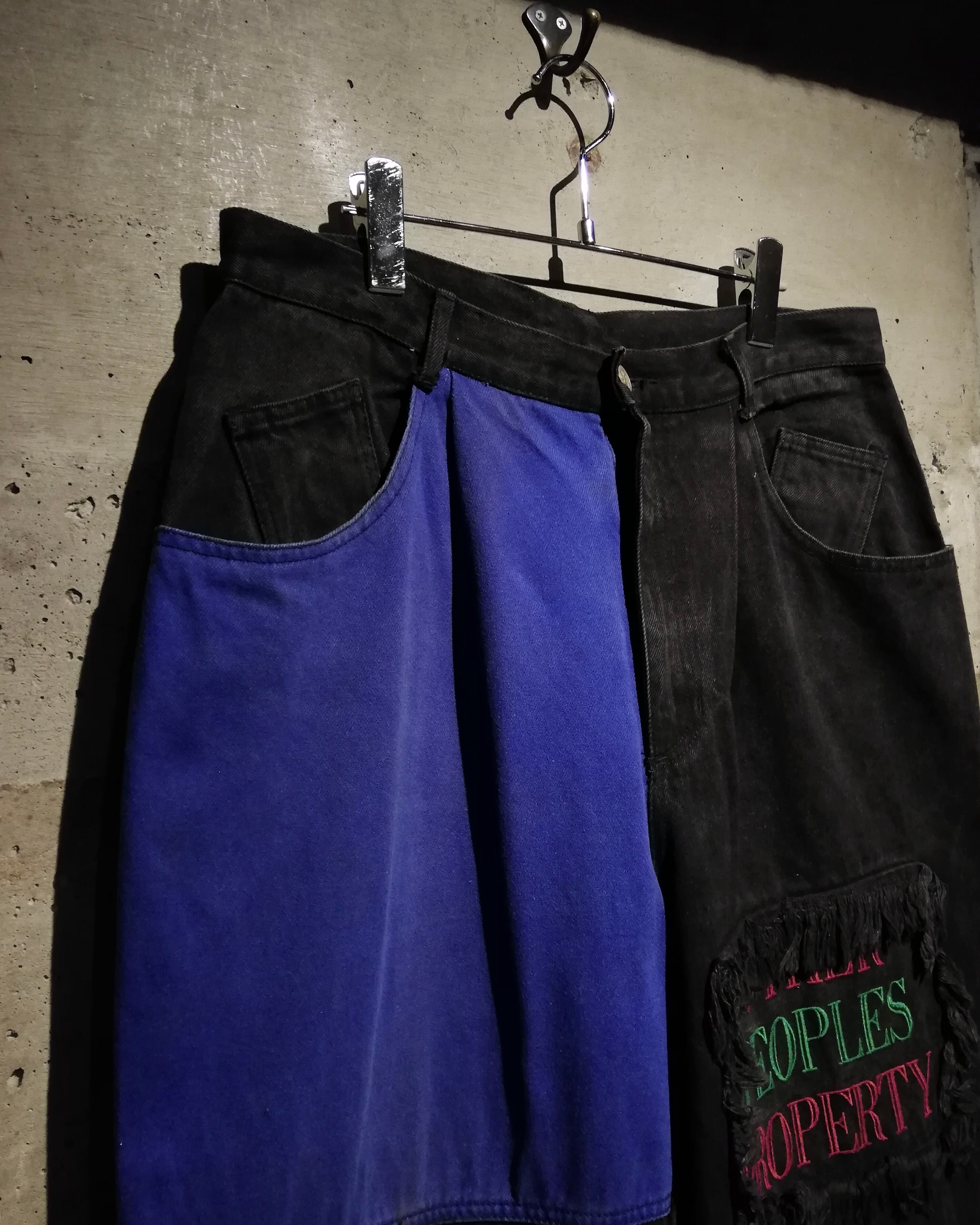フェードの効いたブラックデニムをベースに、フロント右腿にはパネル状にパープルの切り替え。さらに「PEOPLES PROPERTY」「U.P.P.」といった刺繍をダメージ風のフリンジ加工と組み合わせた、メッセージ性とラギッドなムードを兼ね備えた唯一無二の存在感を見せる1本。