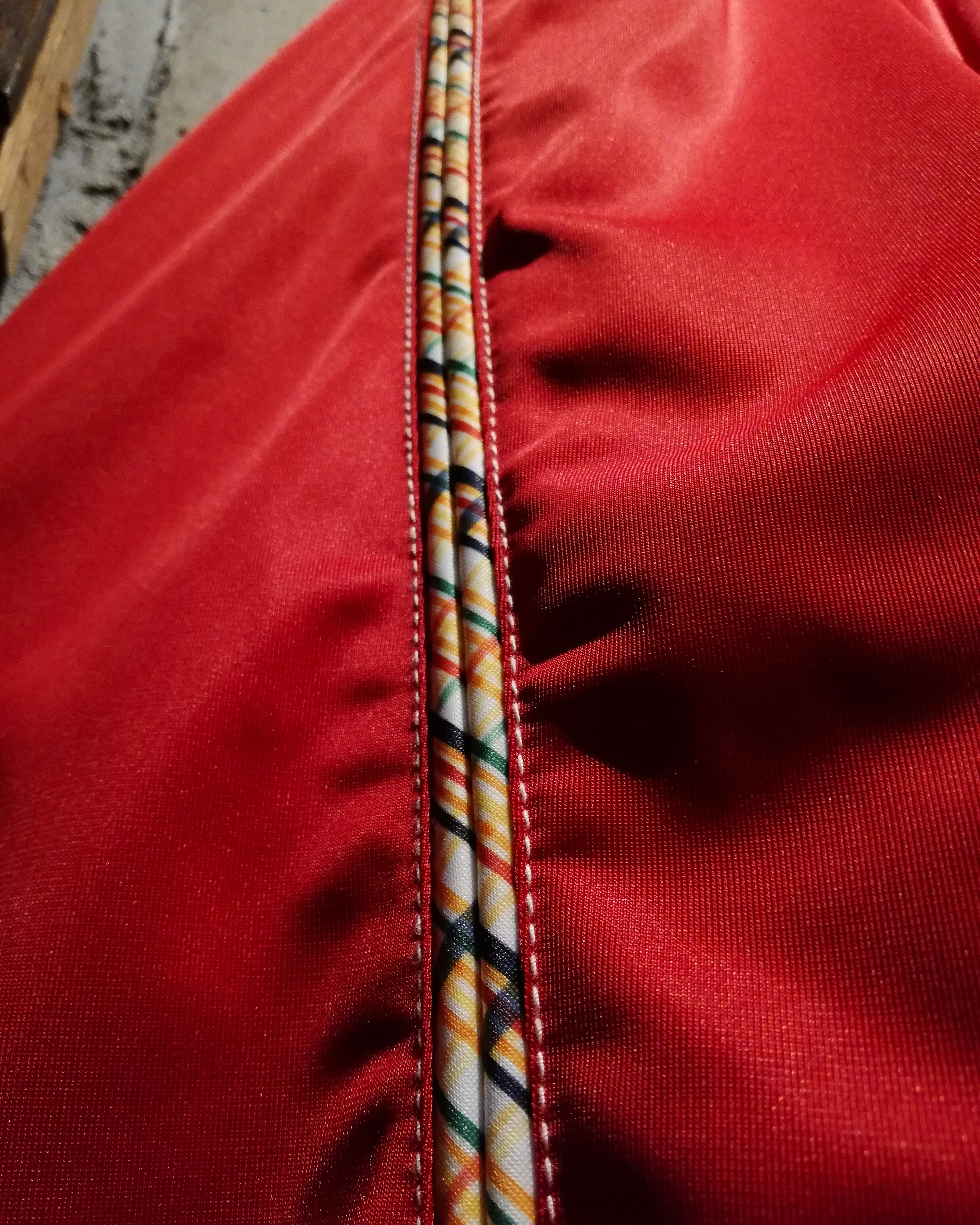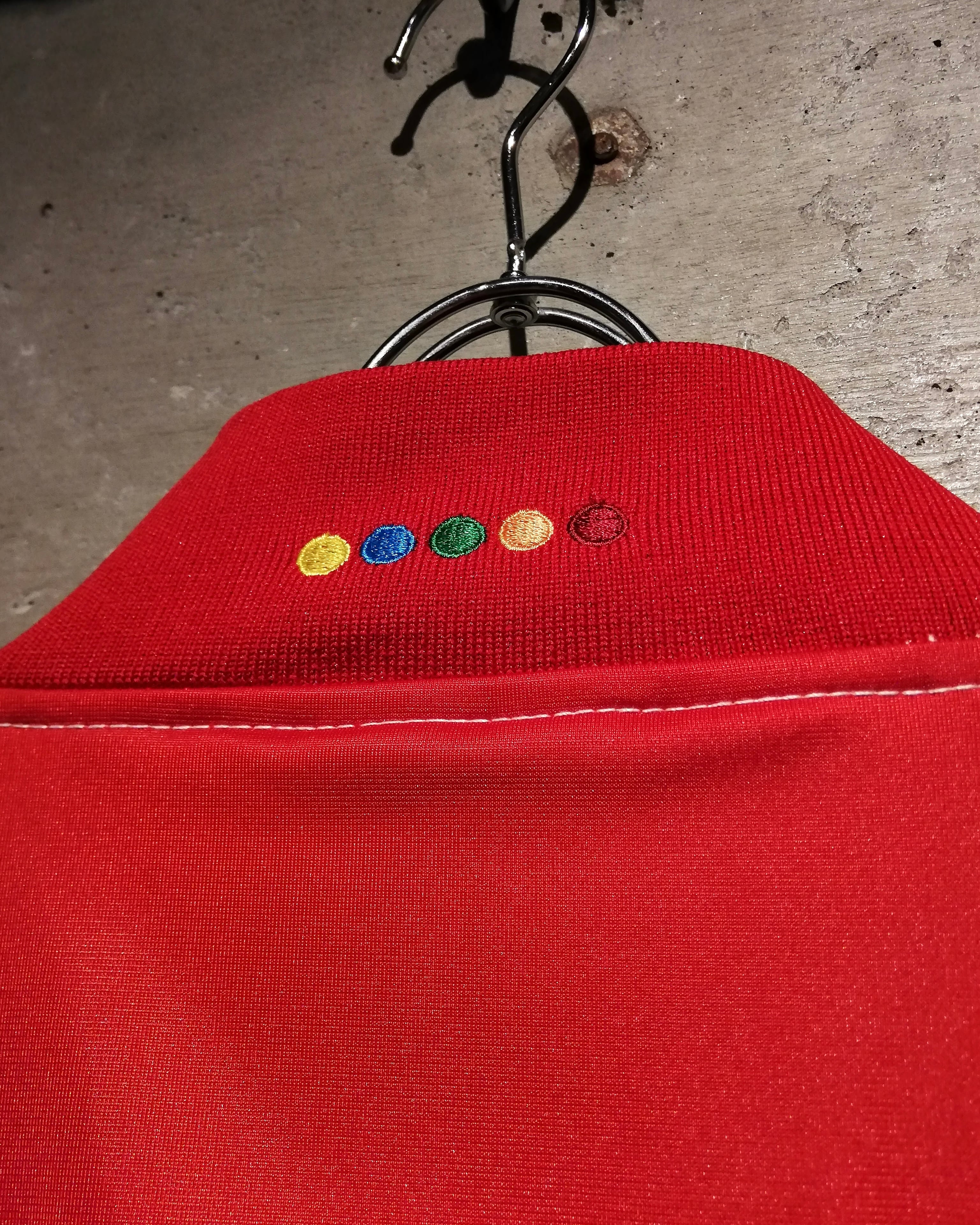 鮮やかな赤のボディをベースに、両胸にエンブレム、バックにブランドロゴの大判な刺繍を施したアイコニックな一着。