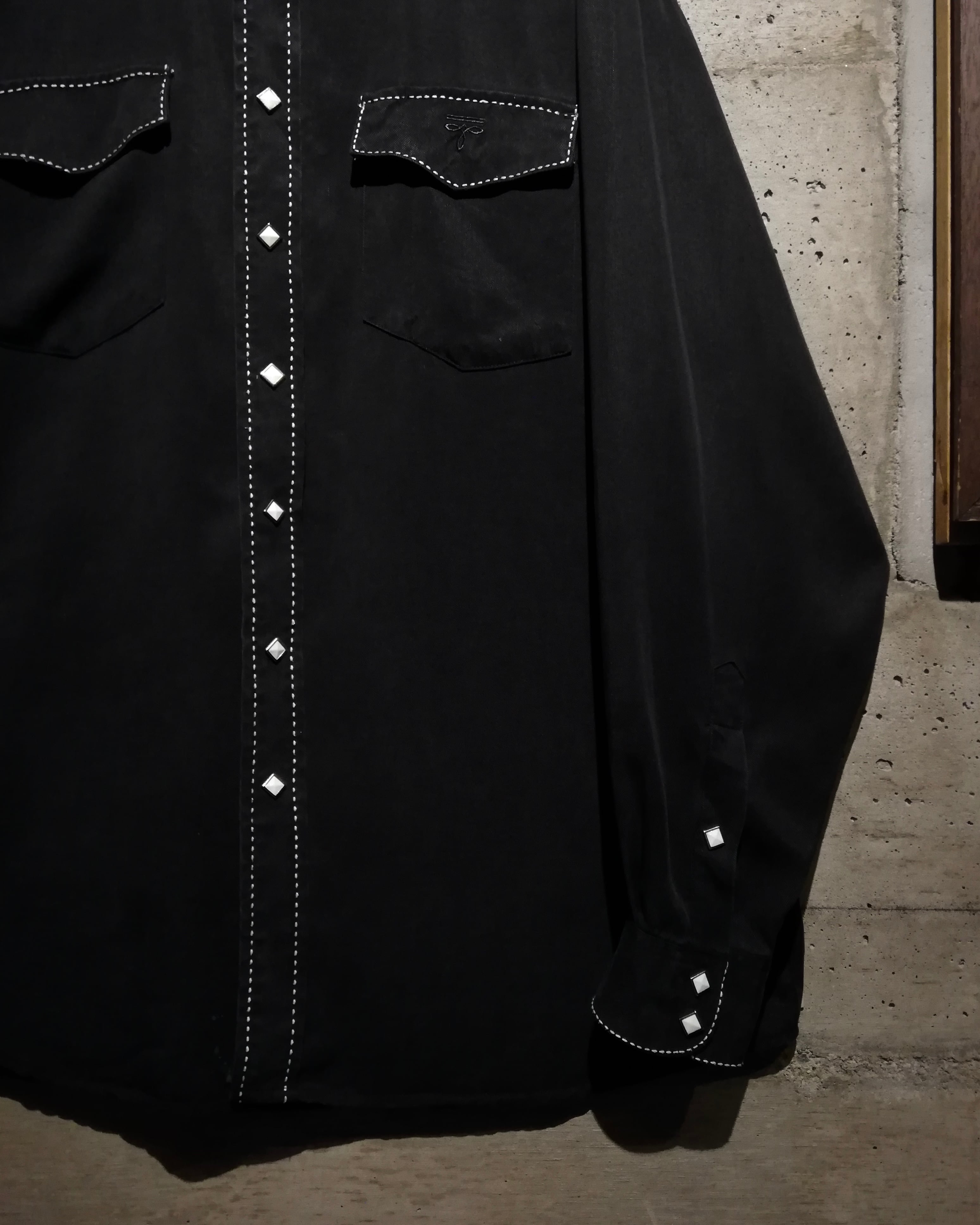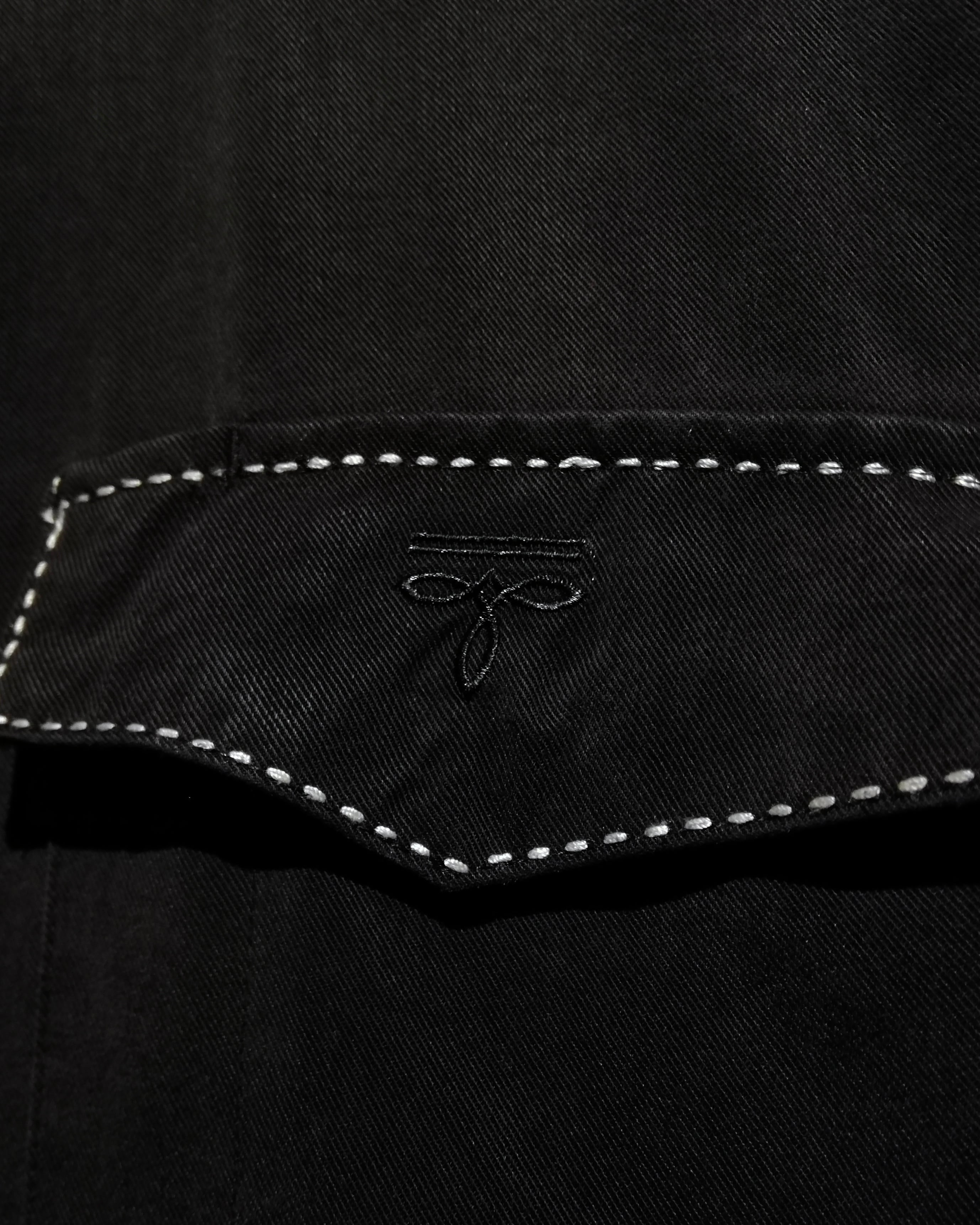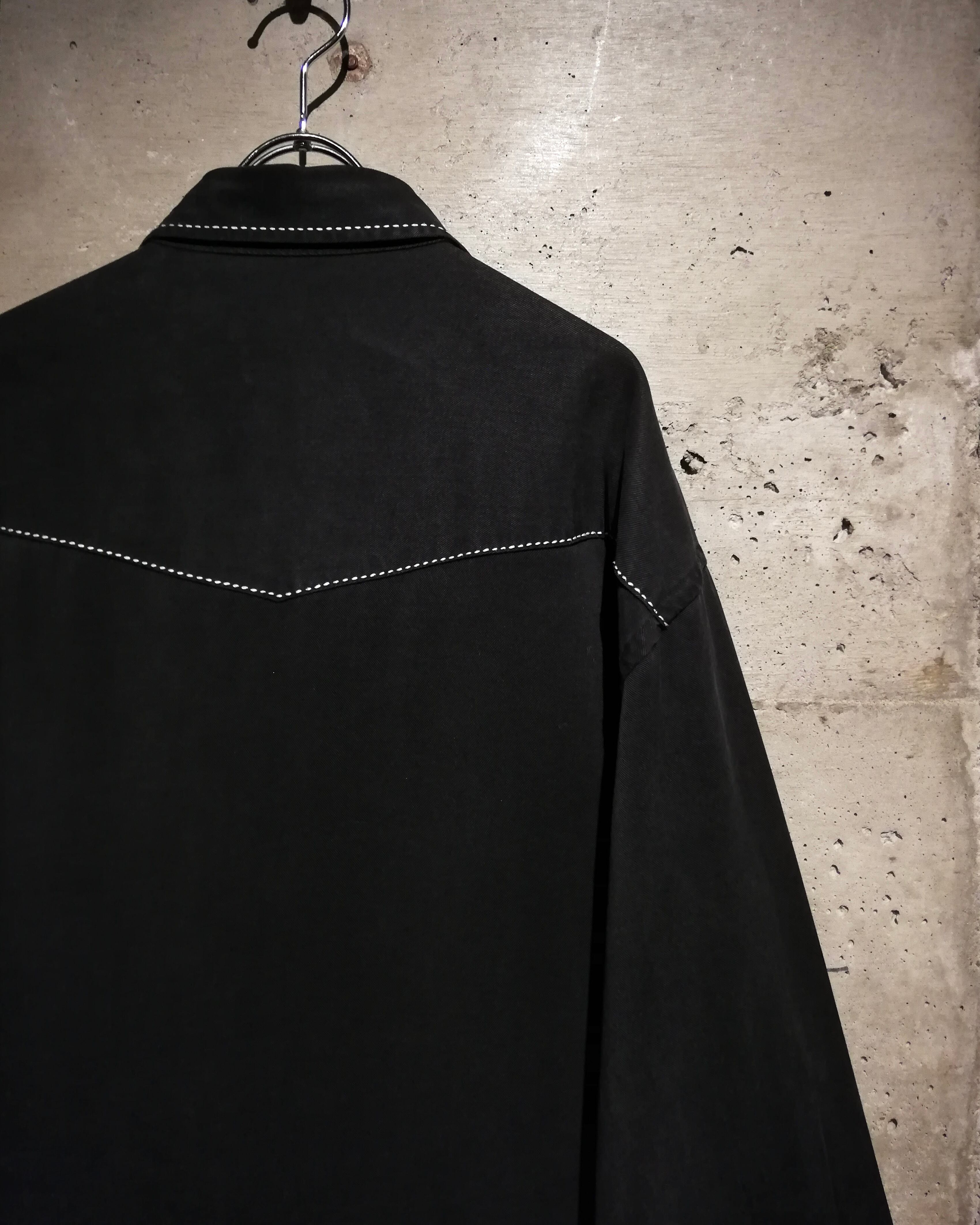 フロント、袖口に施された菱型のスナップボタンがアクセントに。ミニマルなデザインとモノトーンのカラーリングも相まって、クラシックなウエスタンシャツのディテールを踏襲しながらも、モードな雰囲気漂う仕上がり。