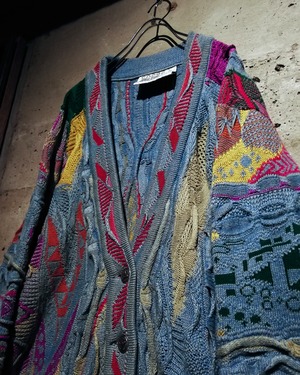 インディゴを基調に、レッドやグリーン、イエローといった鮮やかなカラーを散りばめたマルチカラーのクレイジーパターンを、高い技術による立体的な編みで表現。奥行きのある陰影と独特のテクスチャが抜群の存在感を見せる、クージーならではのスペシャルな3Dニットカーディガン。