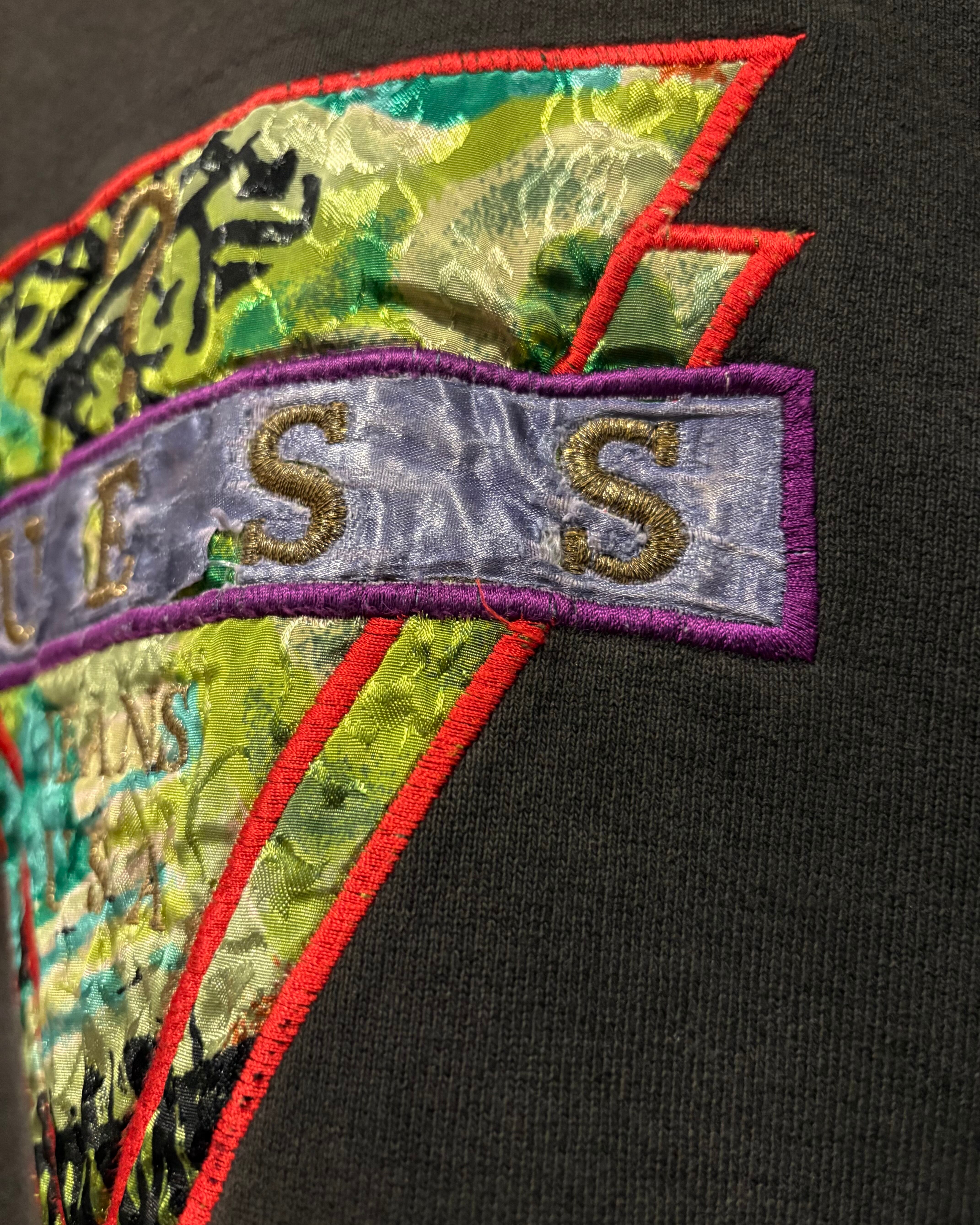 程よくフェードの効いたブラックのボディをベースに、ブランドを象徴するトライアングルロゴをフロントへ豪華に刺繍で配置。マルチカラーの光沢感ある生地を用いた装飾に刺繍が立体感を演出し、当時のハイストリートな雰囲気を存分に醸し出しています。