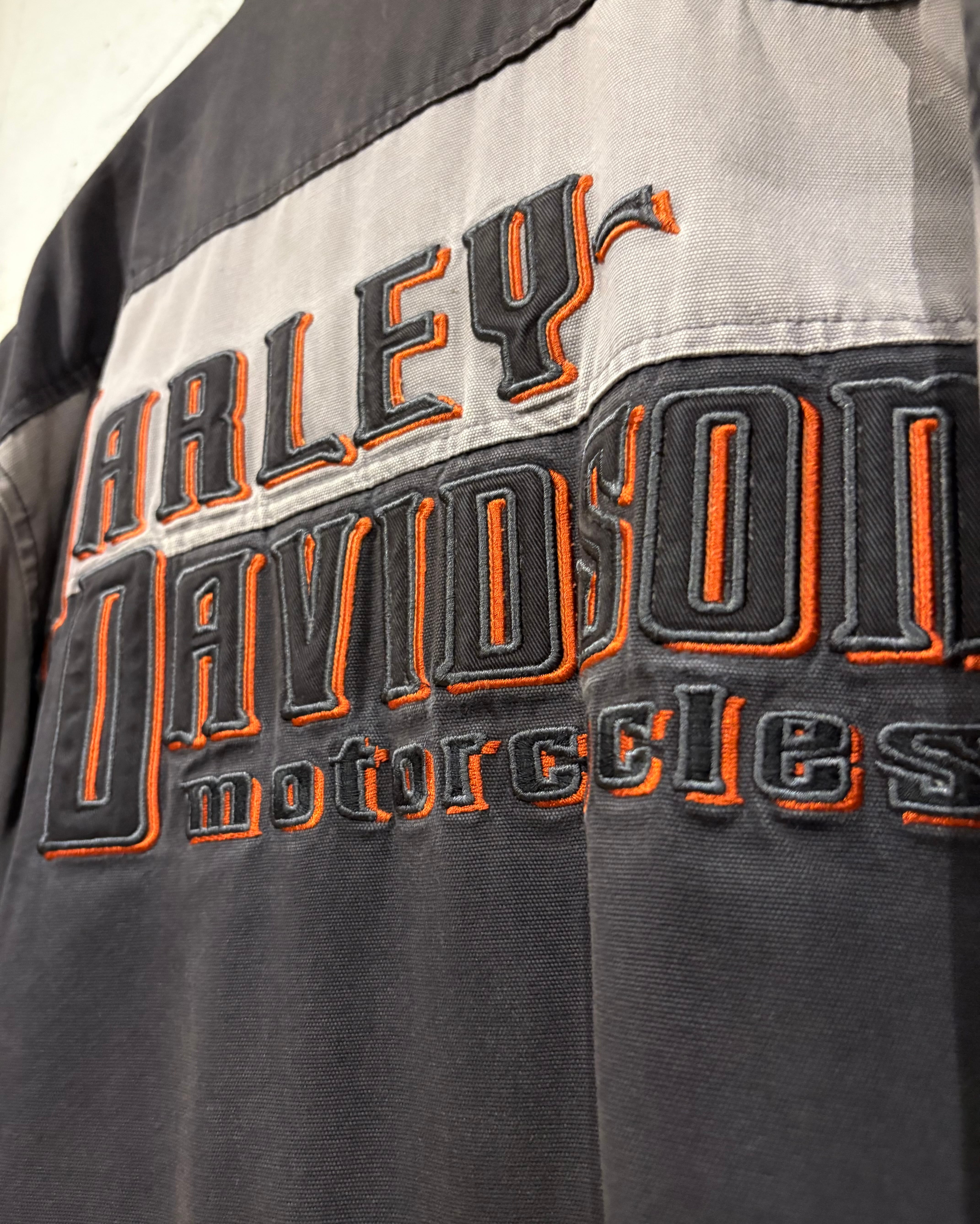 フロントにはブランドロゴの刺繍、背面には迫力ある大判のロゴデザインが施されており、ハーレーならではの存在感を放っています。
