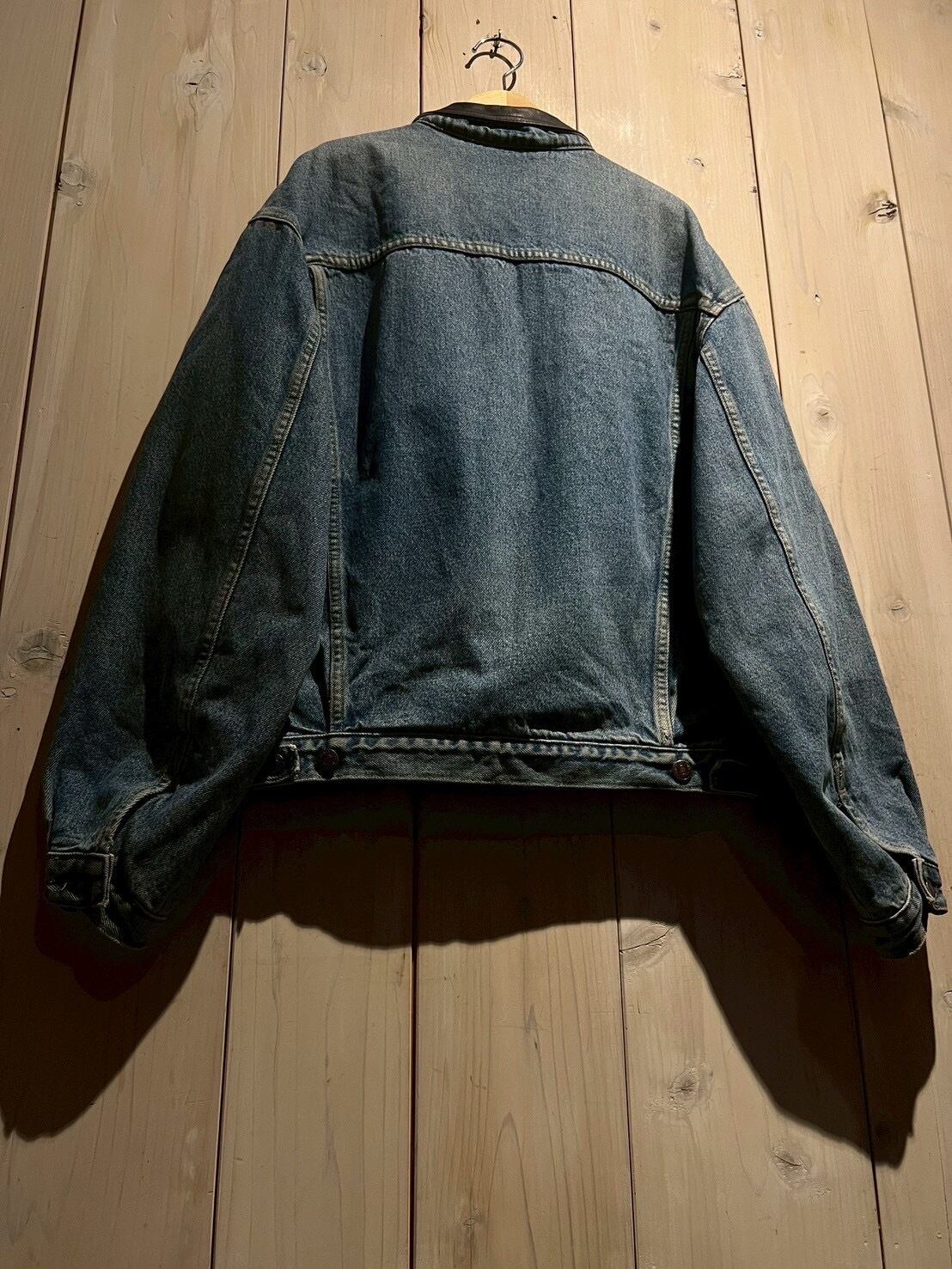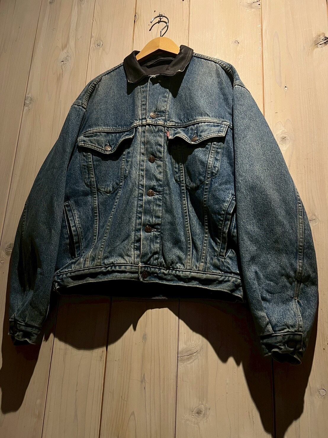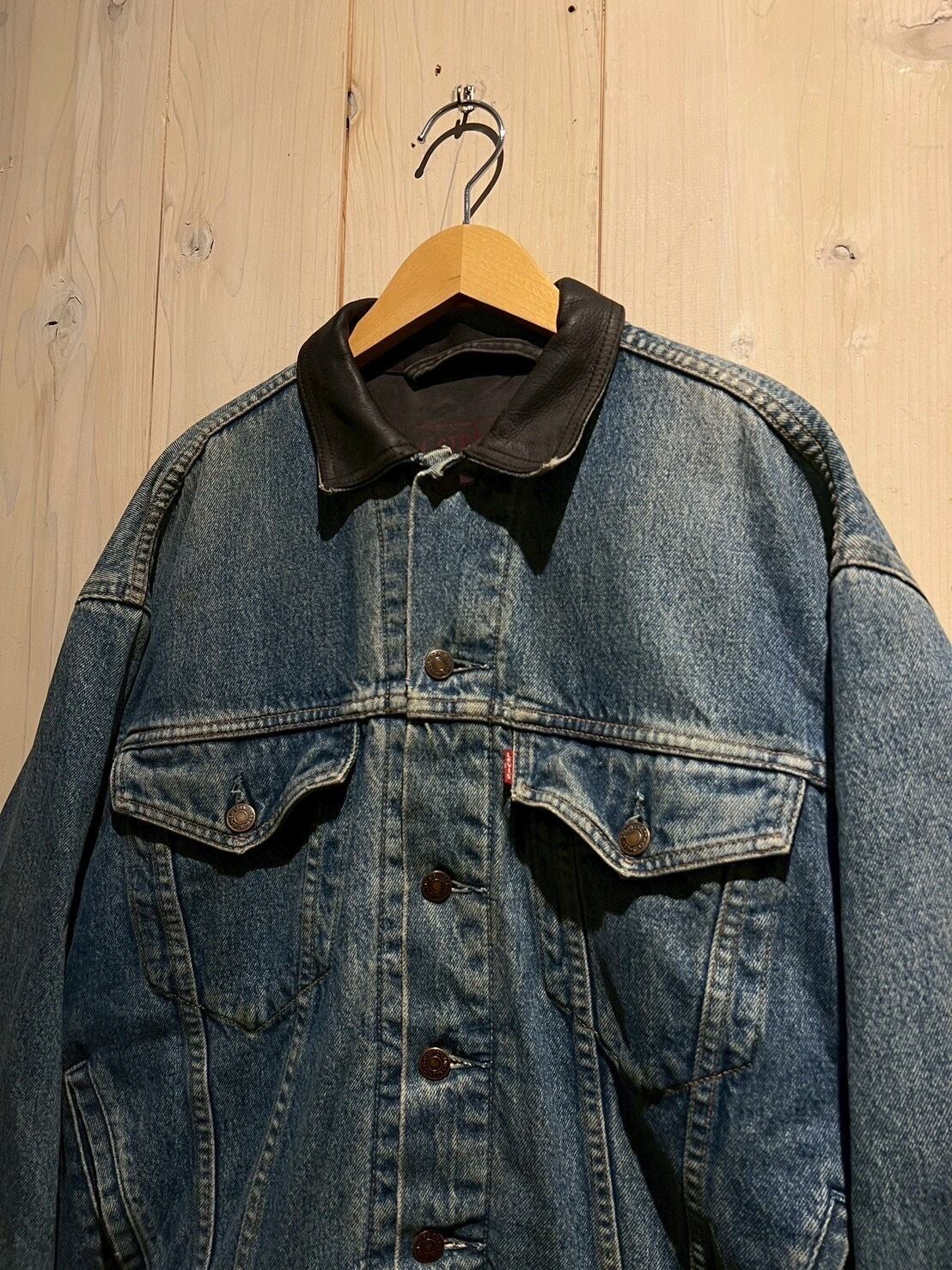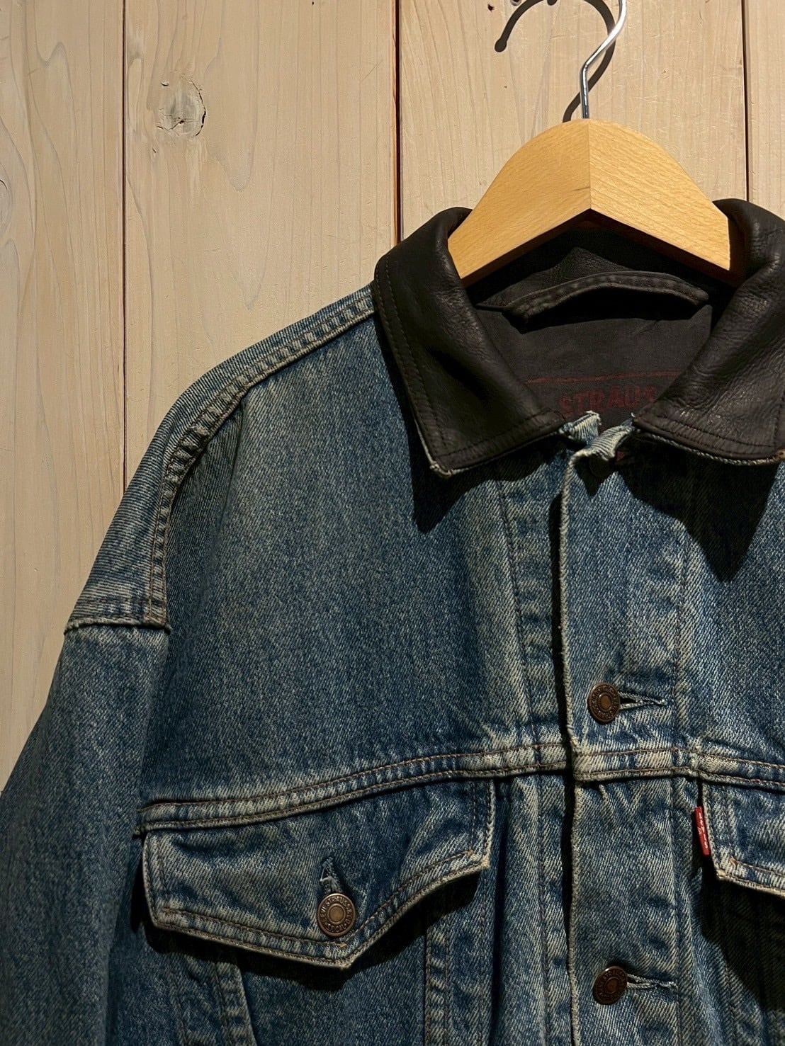 リーバイスのデニムジャケットといえば誰もが思い浮かべる定番アイテムですが、こちらはその中でも数が少なく市場でも見かけることの少ない特別な1着。通常のデニムカラーではなく、本革を使用したレザー襟仕様になっており、武骨さの中に色気を漂わせるデザインとなっています。