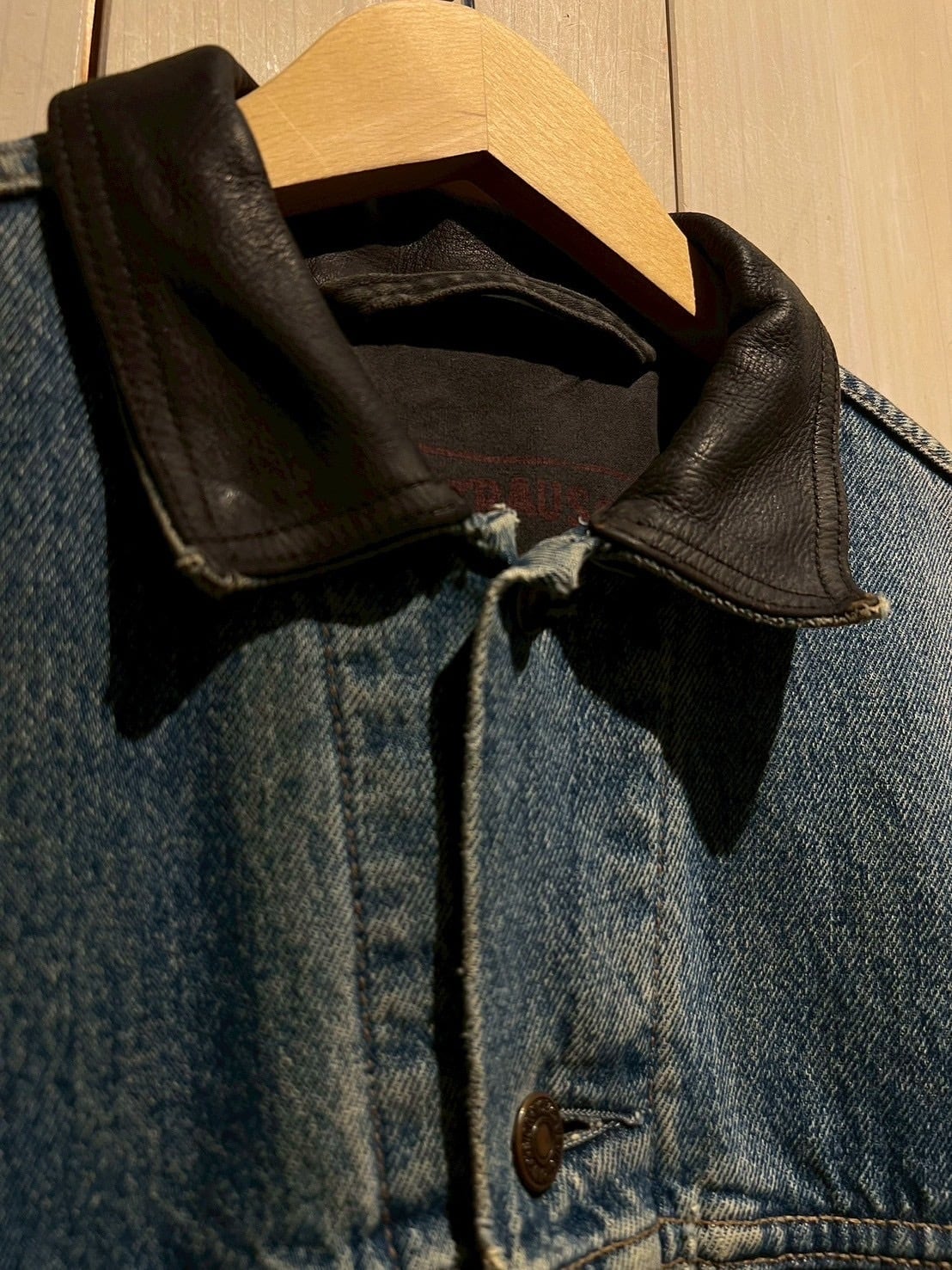 インディゴデニムは着用や経年によって程よくフェードしており、古着ならではの一点物らしい表情を見せています。デニム特有のタテ落ちや色ムラが、無骨さとともに奥行きのある雰囲気を演出。レザー襟とのコンビネーションが絶妙で、シンプルに羽織るだけでも存在感のあるスタイルを作り上げてくれます。