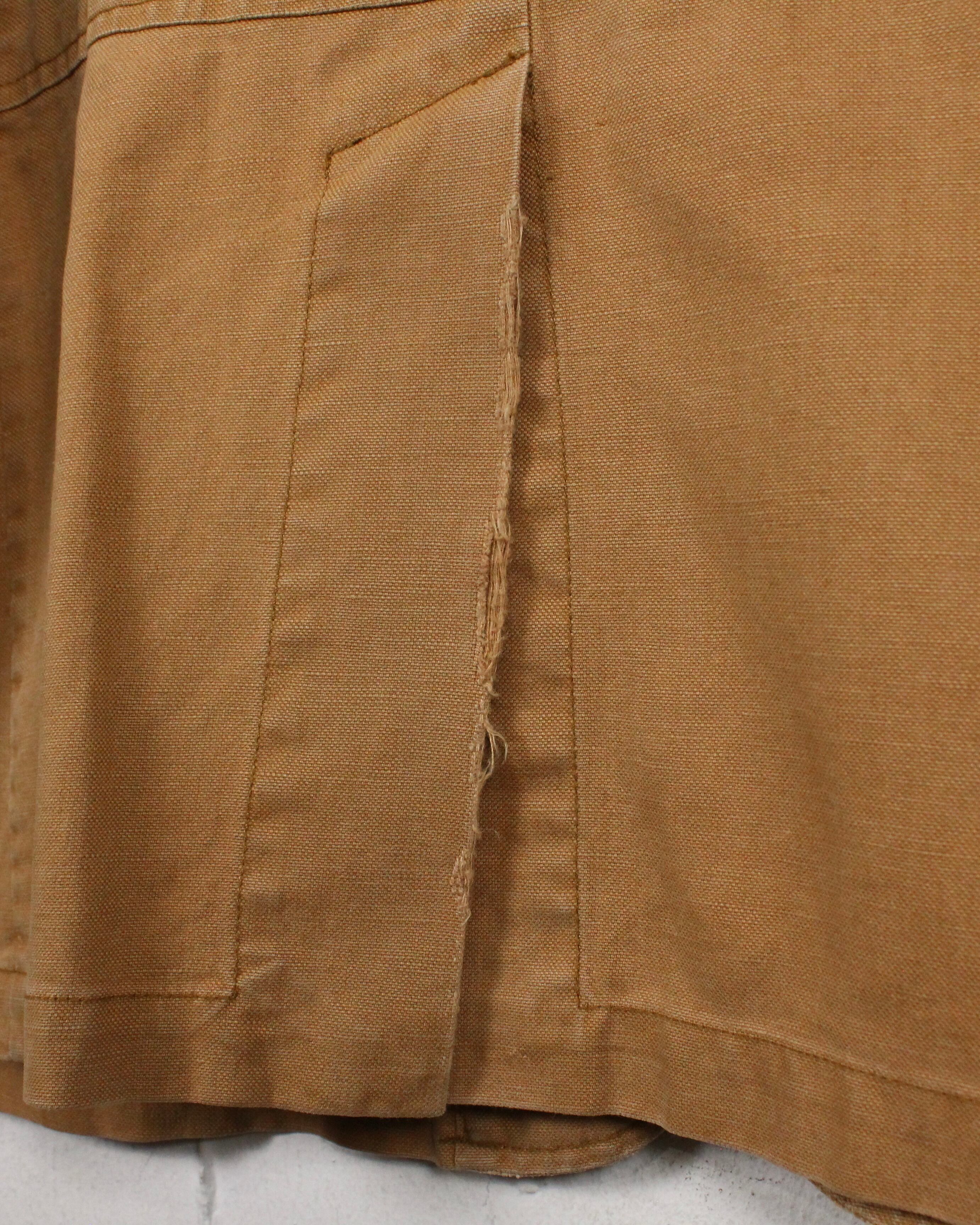 しっかりと目の詰まったダック地を用いたボディはワーク由来の耐久性を感じさせつつも柔らかさを持ち、着用を重ねるごとに深みある表情へと育つエイジングも魅力の一つ。