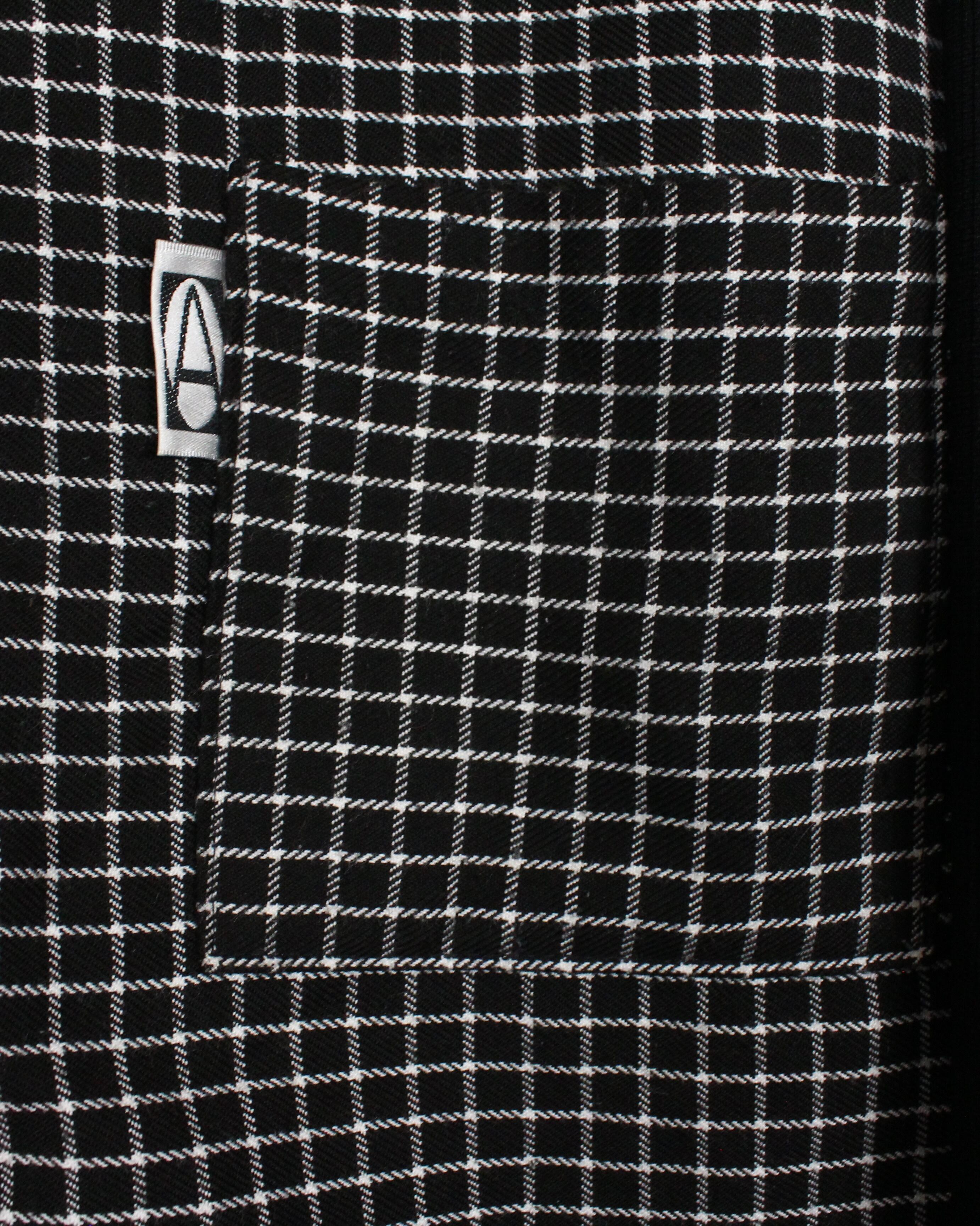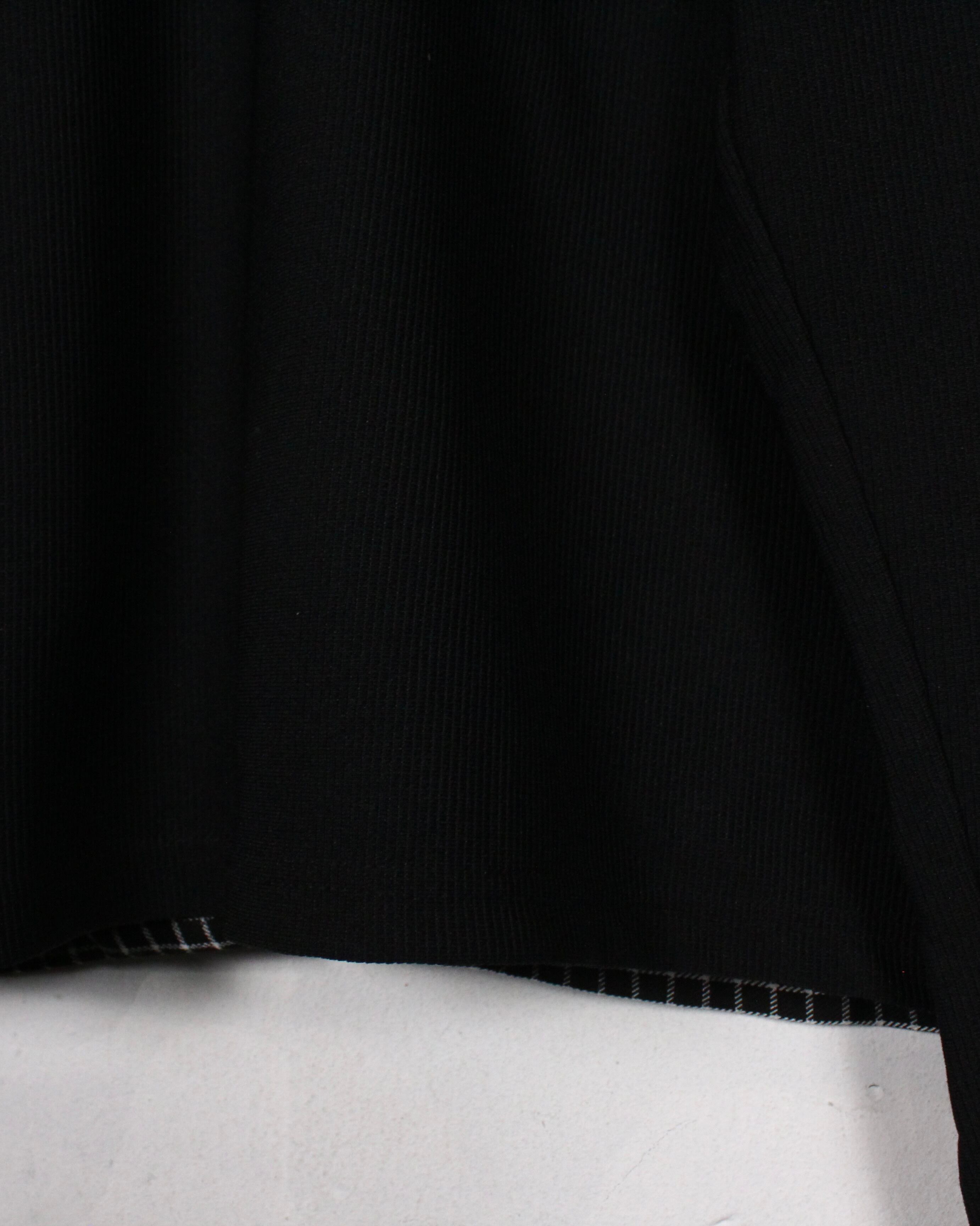 格子柄部分はホワイトラインが効いたチェックで、無地の切り替えと相まってモダンで洗練された印象に。バックスタイルはシンプルなブラックでまとめられており、フロントとのギャップも楽しめるデザインとなっています。
