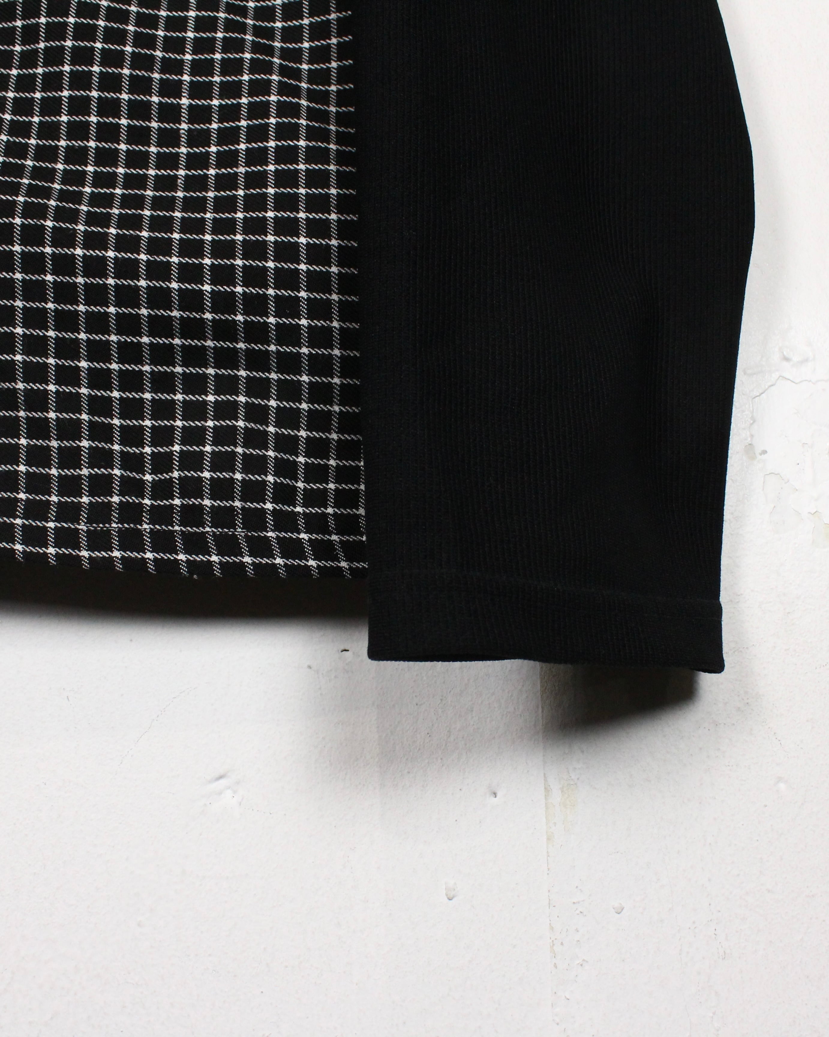 フロントに格子柄を配し、袖、襟、背面をブラックの無地で切り替えたジップアップシャツジャケット。