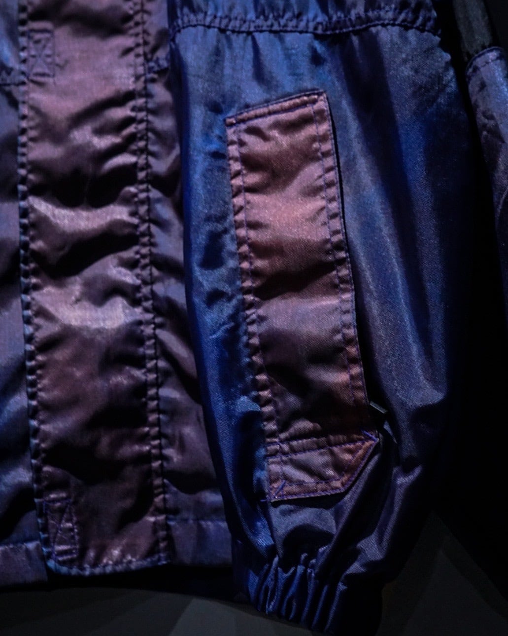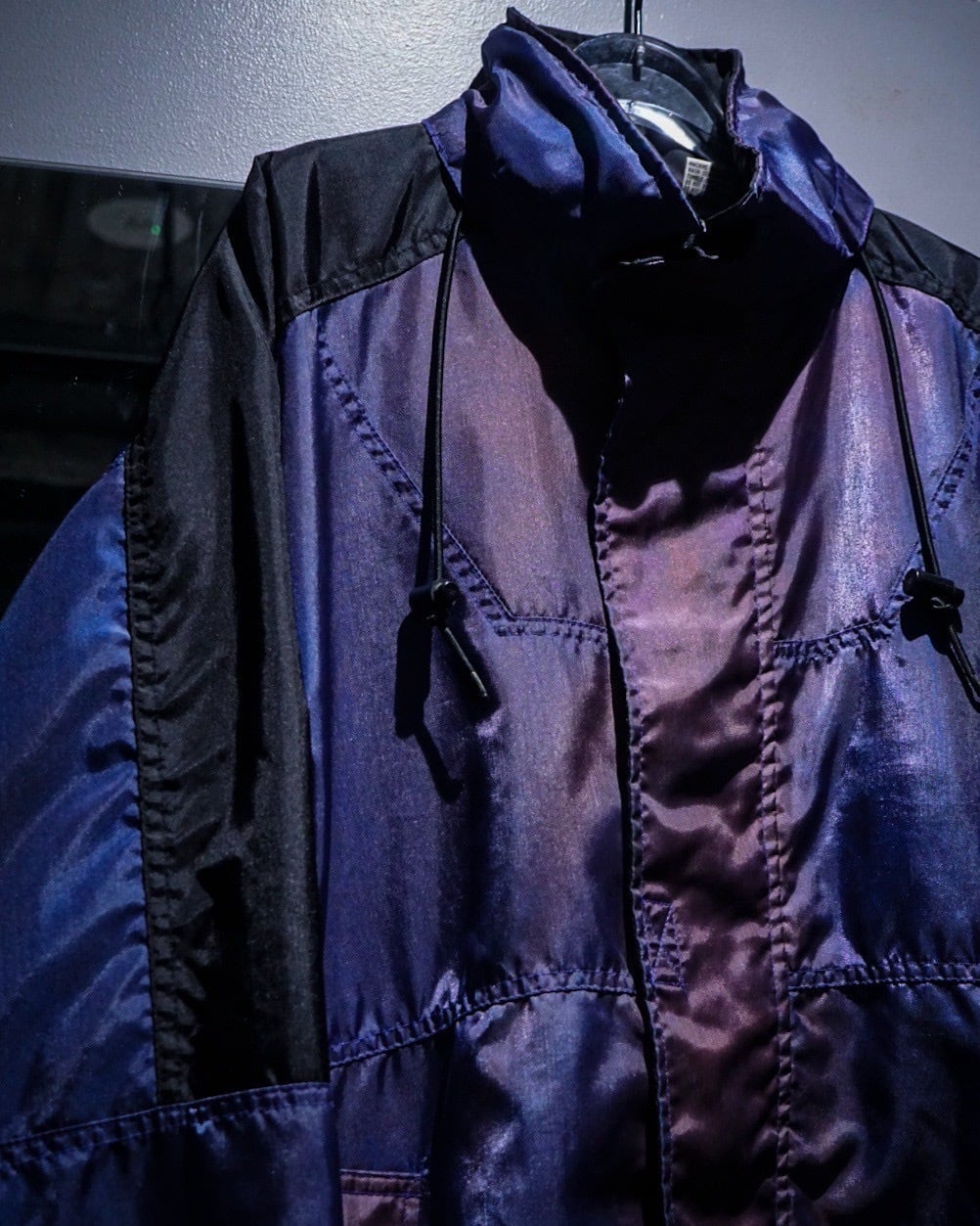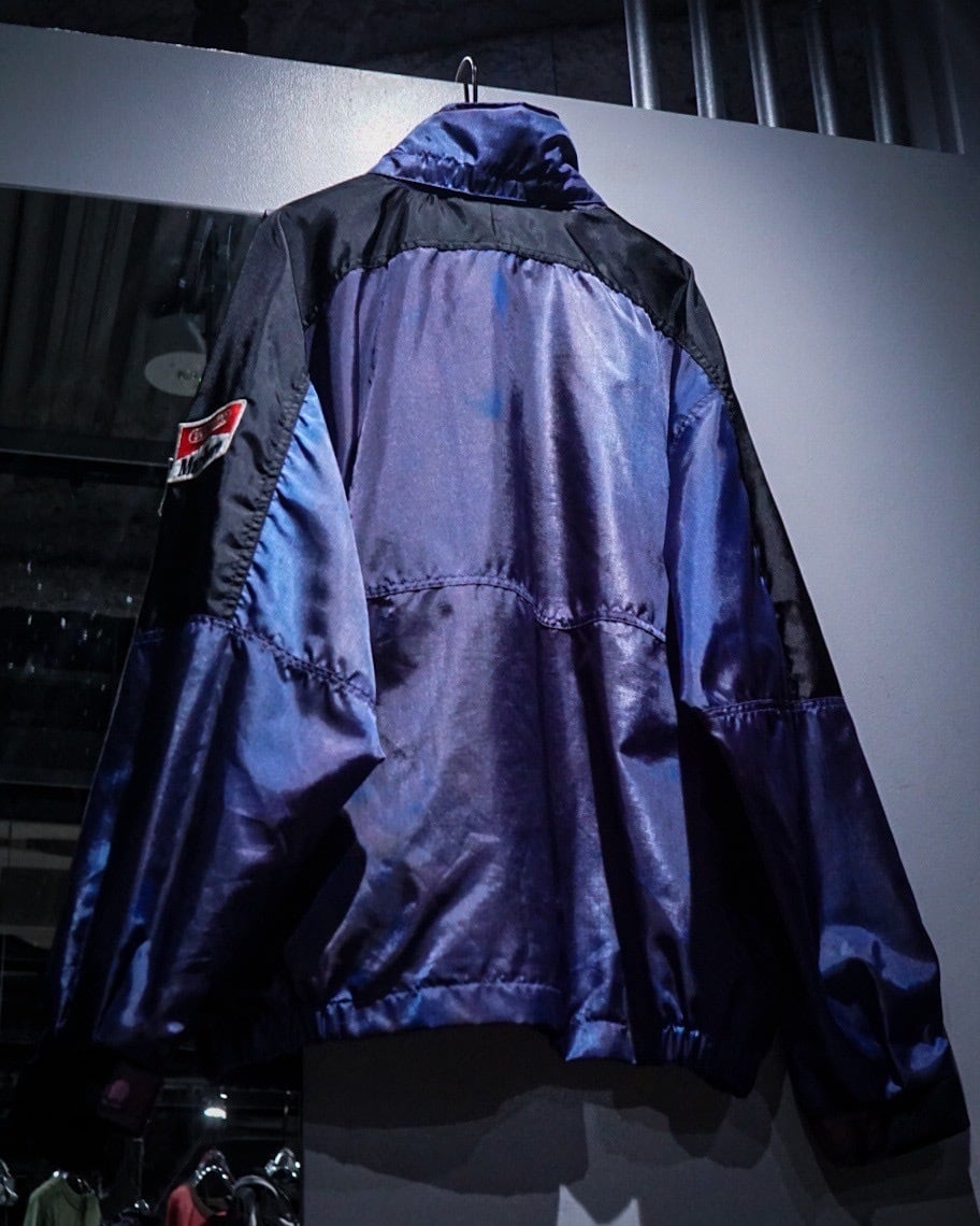 パープル、ブルーの光沢を帯びた独特のグラデーションの表情を見せる、経年によるフェードが効いたナイロンジャケット。
