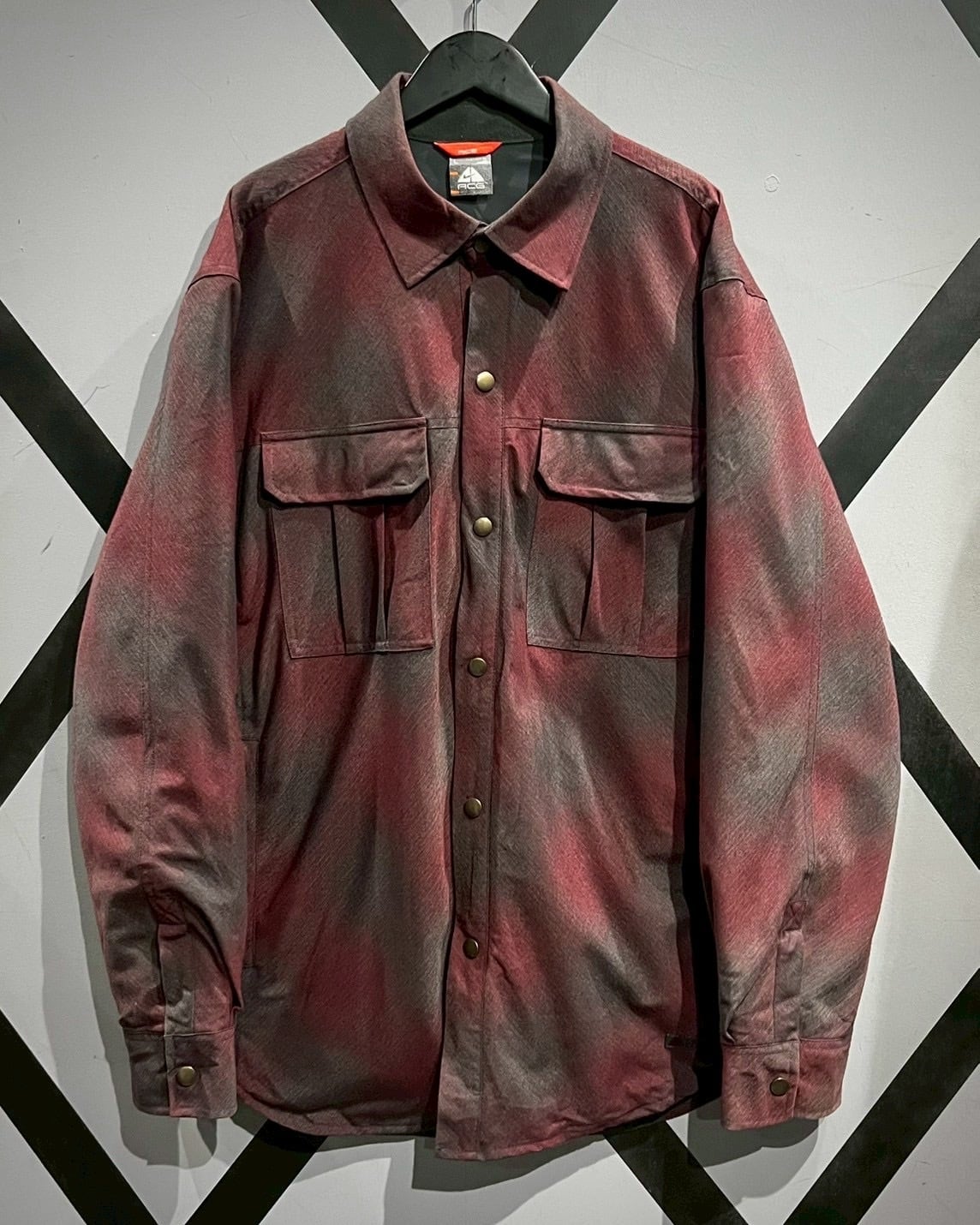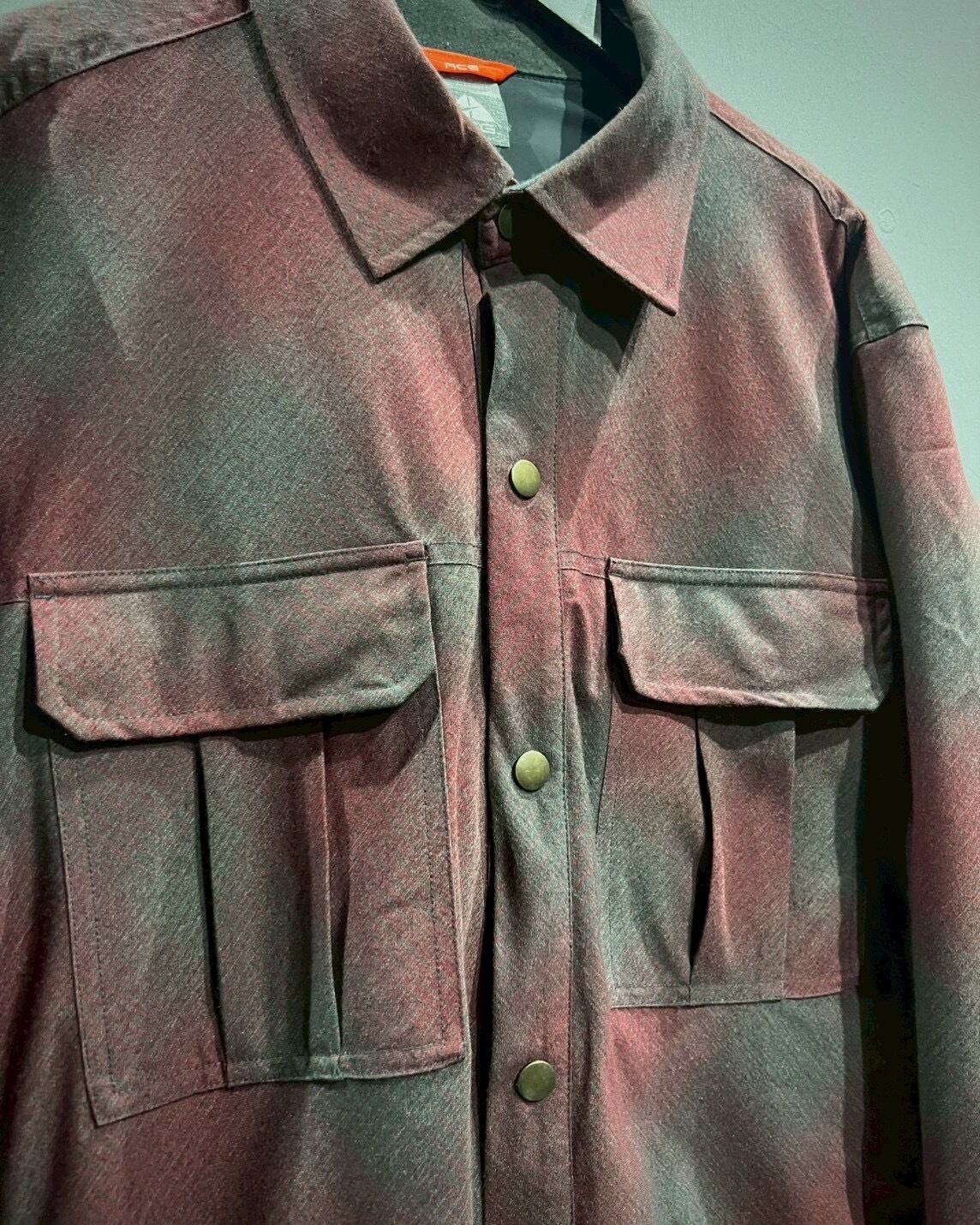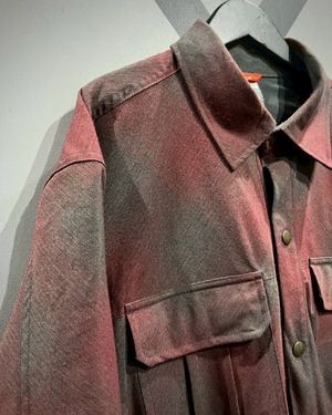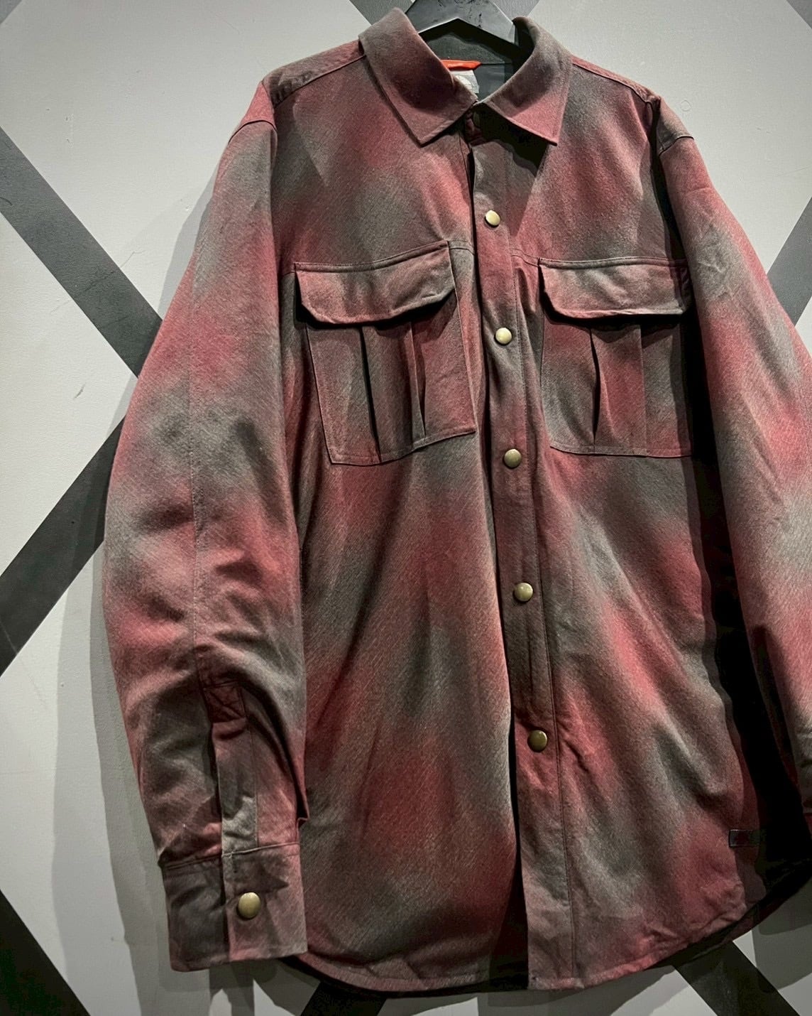 深みのある赤とチャコールをベースにしたオンブレチェックのシャツジャケット。グラデーションのように色が溶け合い、クラシックでありながらモダンな表情を演出します。