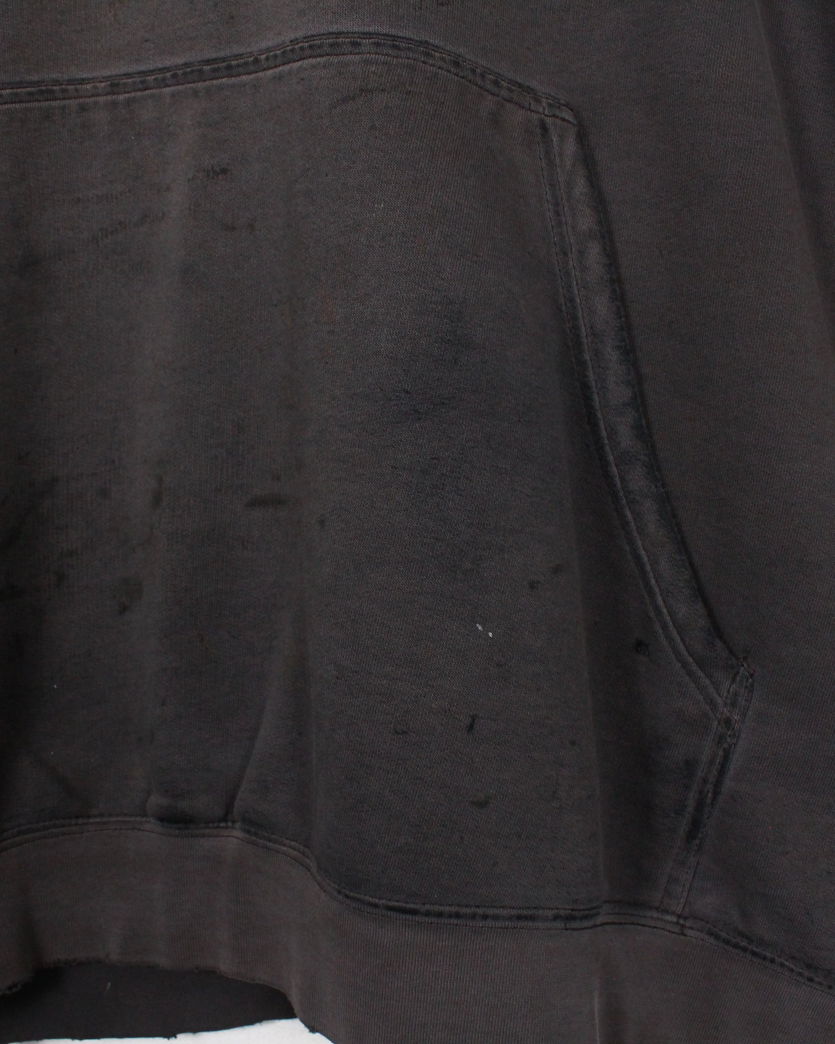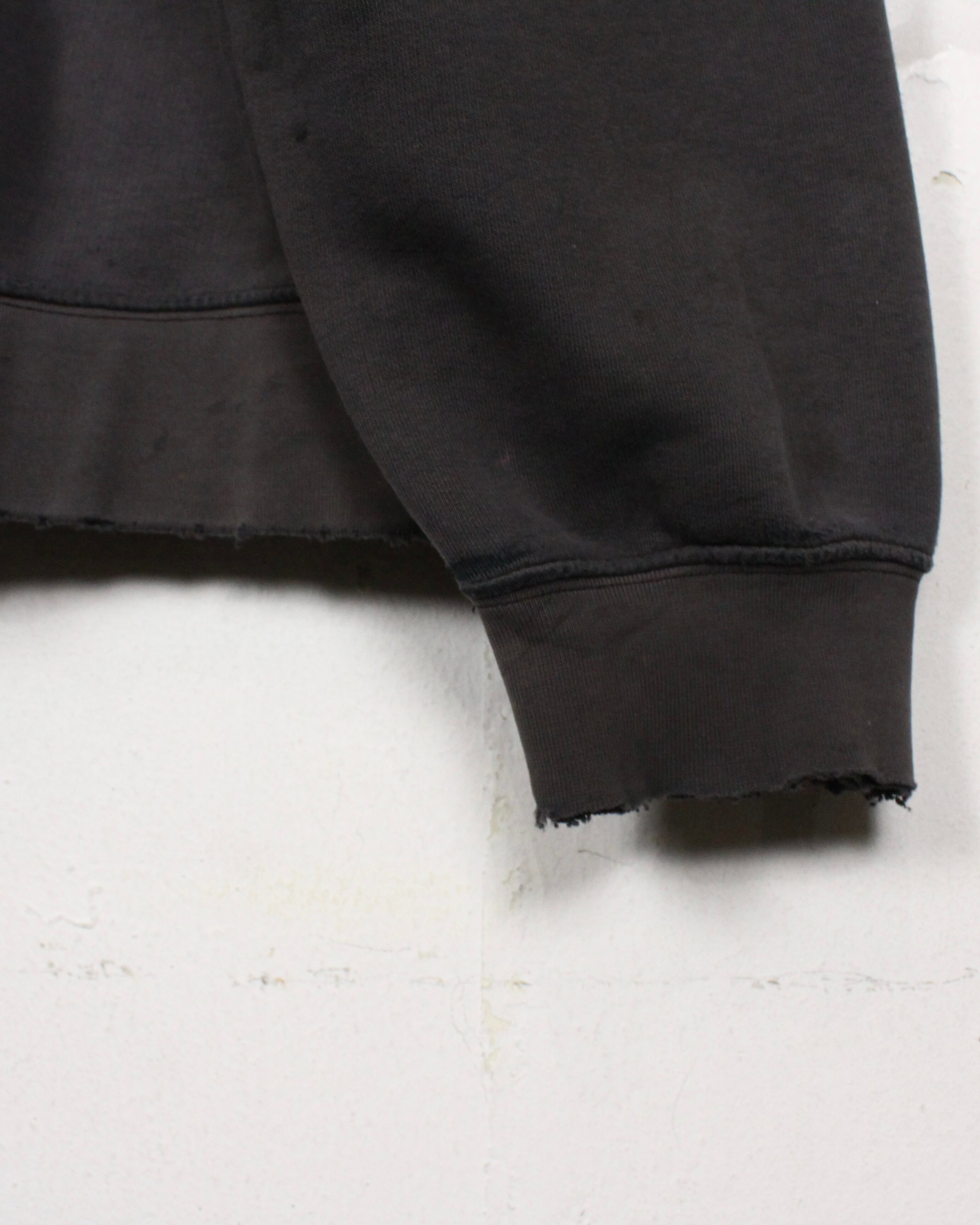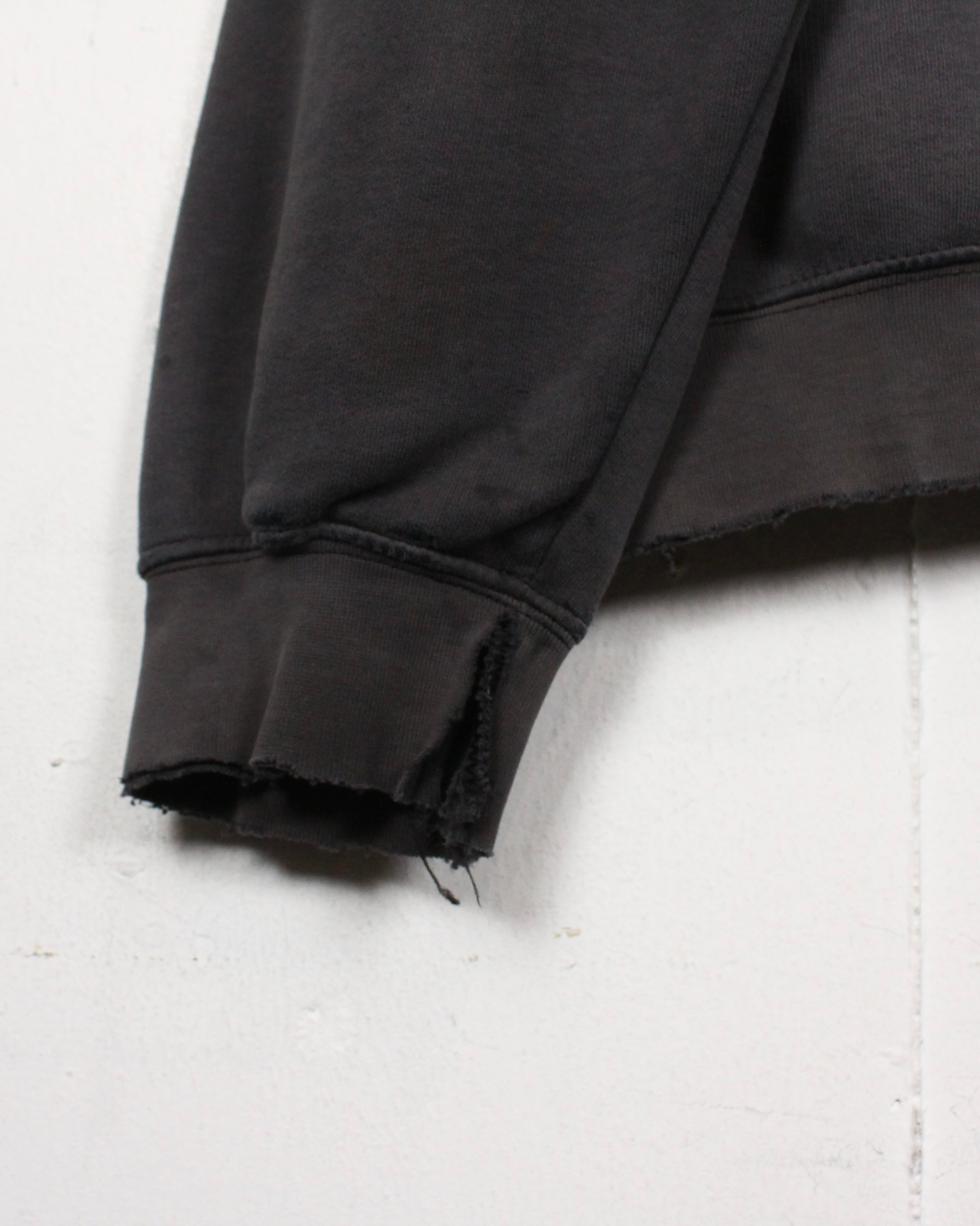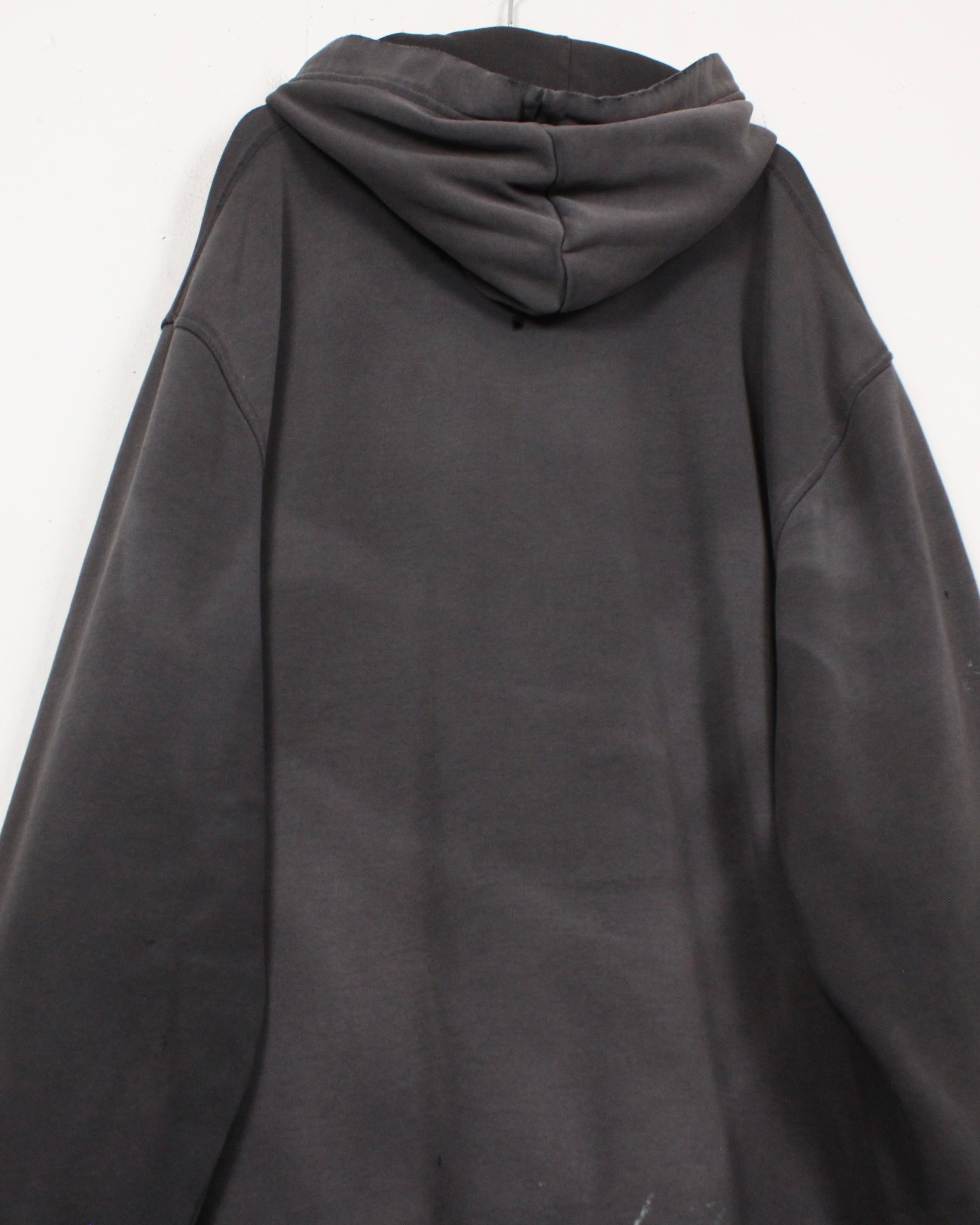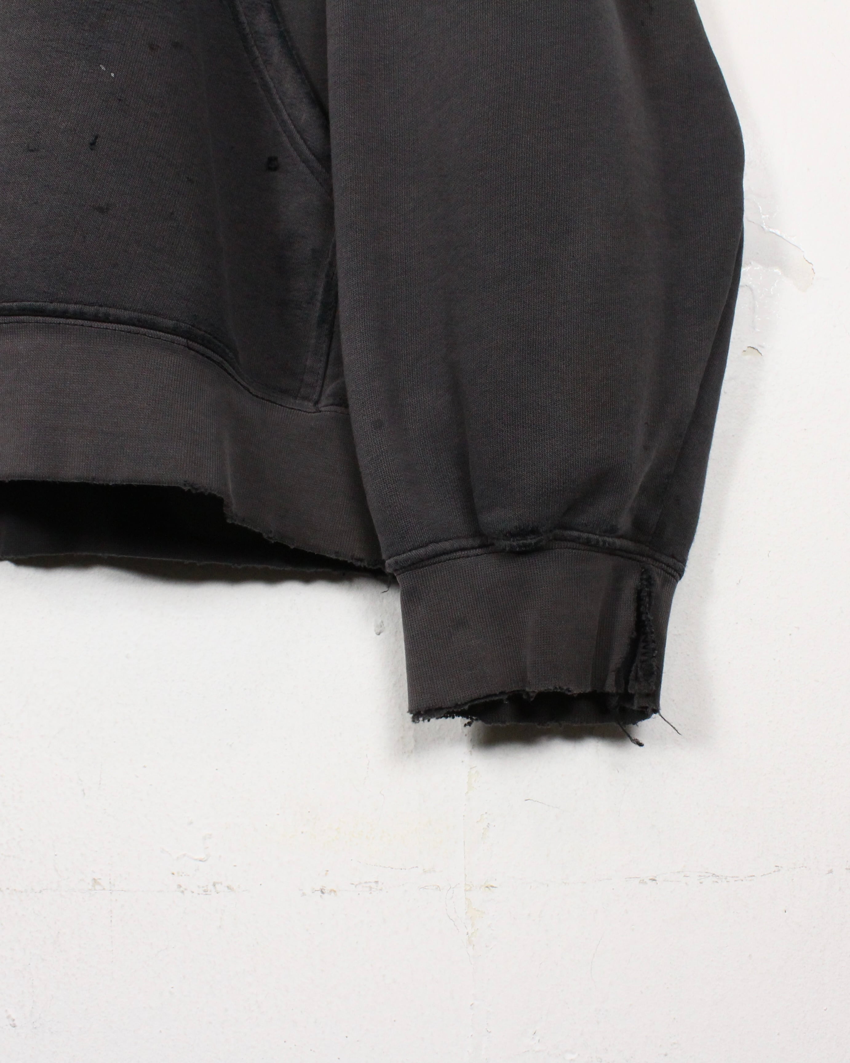 ブラックボディが褪色してグレー寄りに変化した色合いは、現行品では絶対に表現できない一点モノの風合い。さらに、カンガルーポケット周りや裾、袖口に現れたダメージや摩耗がリアルな使用感を物語り、ストリートウェアとしての説得力をより一層高めています。