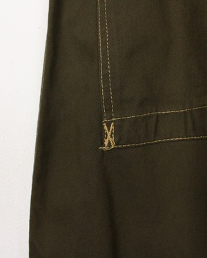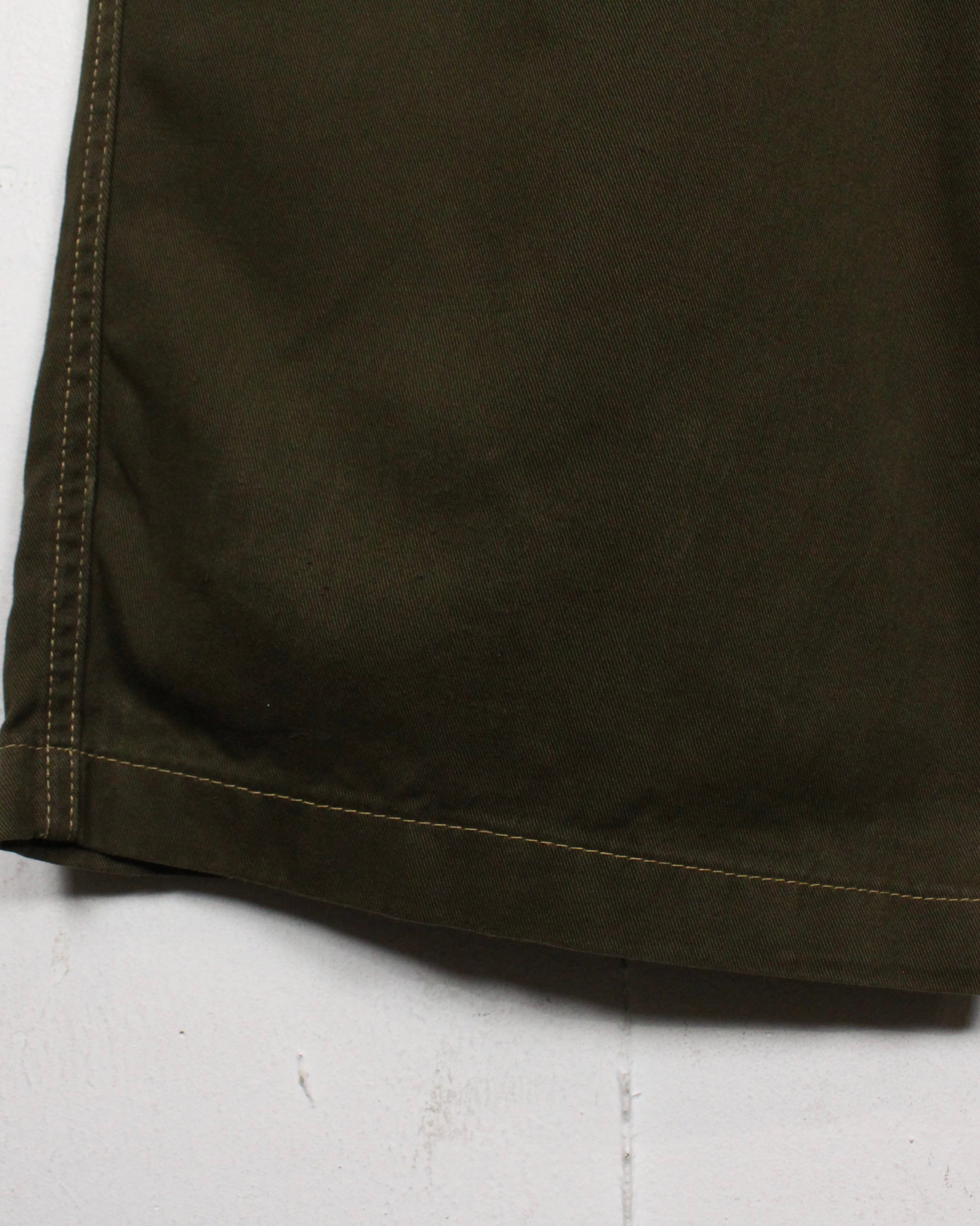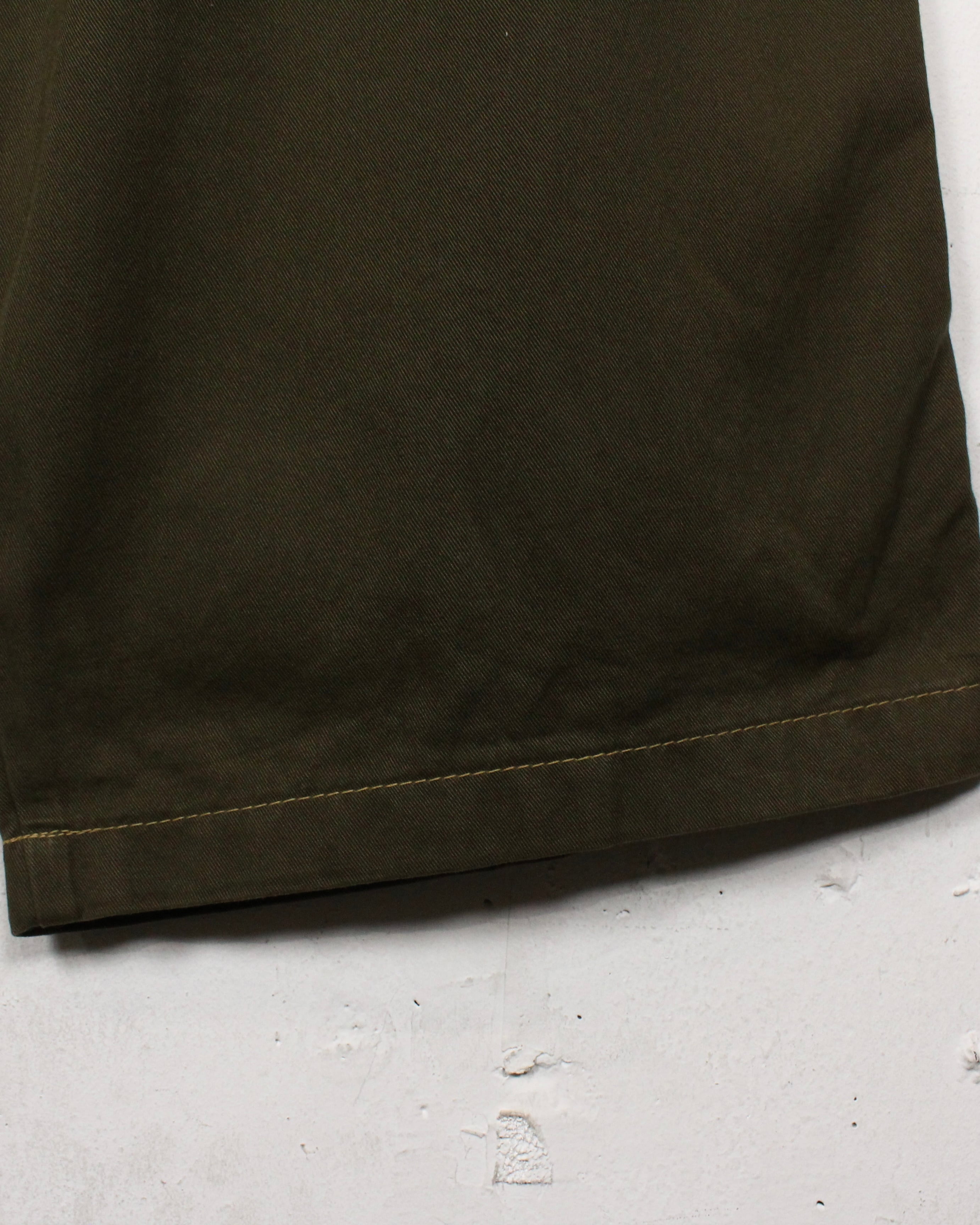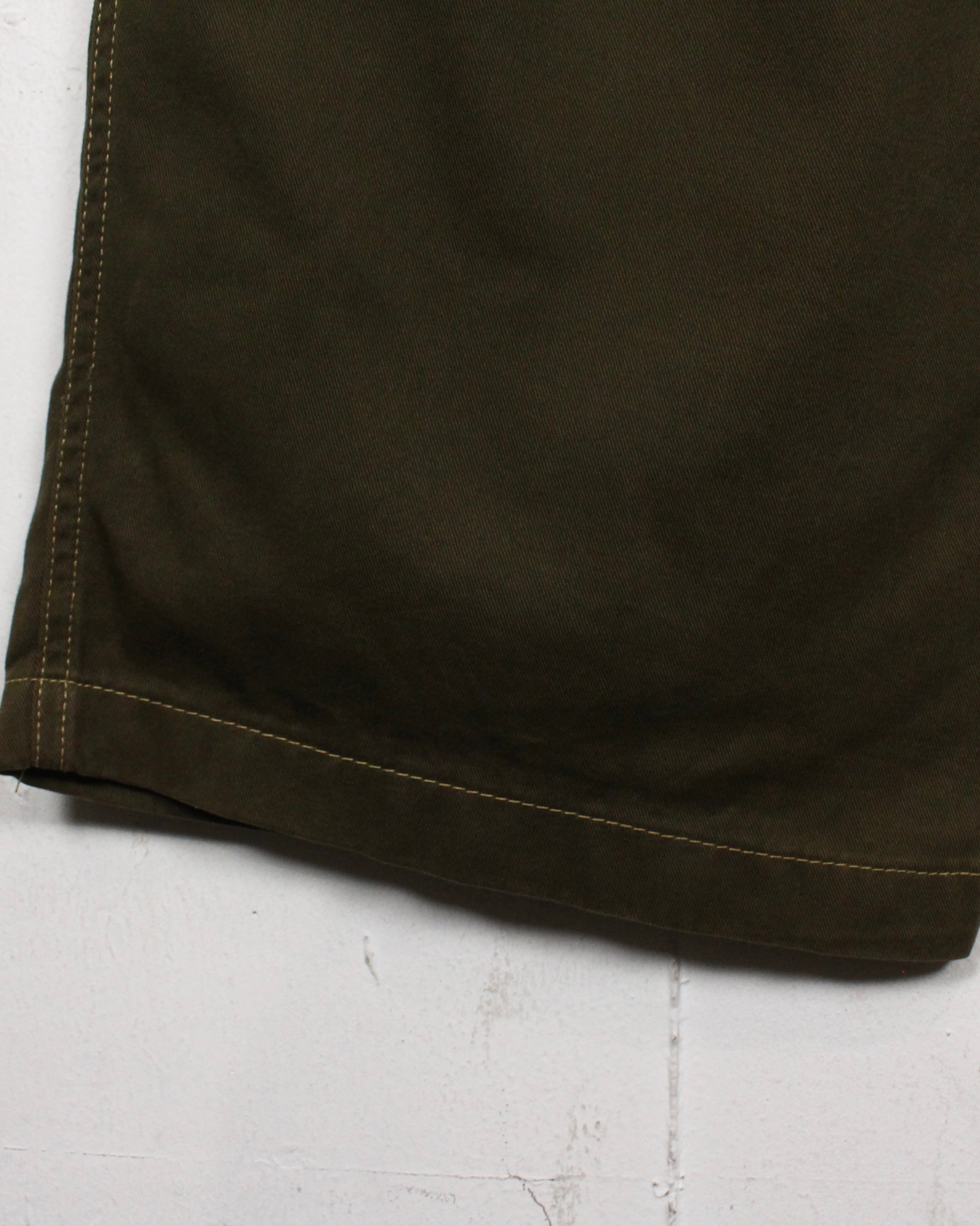 深みのあるオリーブグリーンのボディに、ツイル織りのタフな生地感を持たせつつも、ワイドなシルエットが圧倒的な存在感を演出しています。