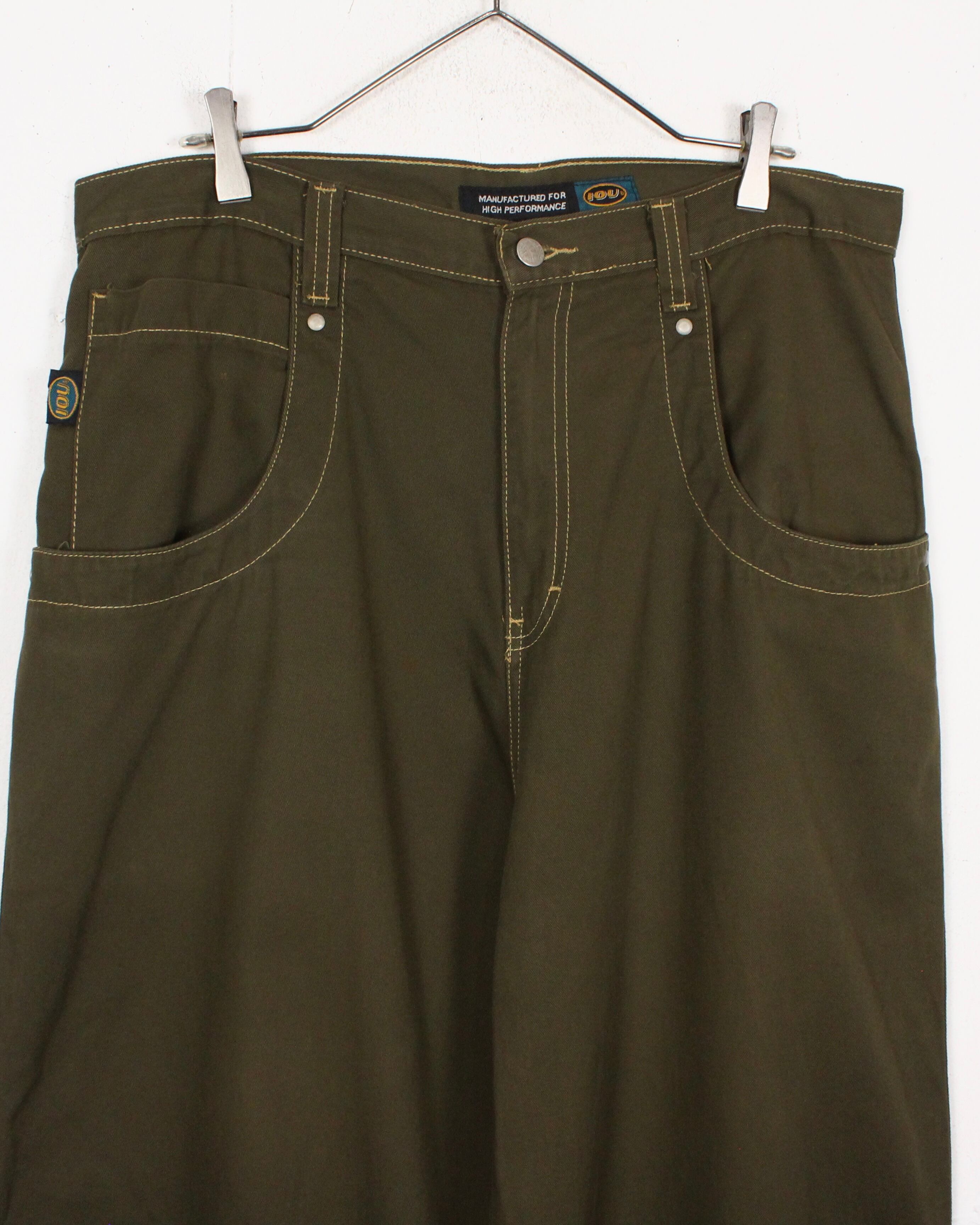 ヒップから裾にかけてゆとりをもたせた極太シルエットは、まさに90’sカルチャーを色濃く反映。レイヴやクラブシーンで映える独特のフォルムは、当時の空気感を今に伝える一本です。