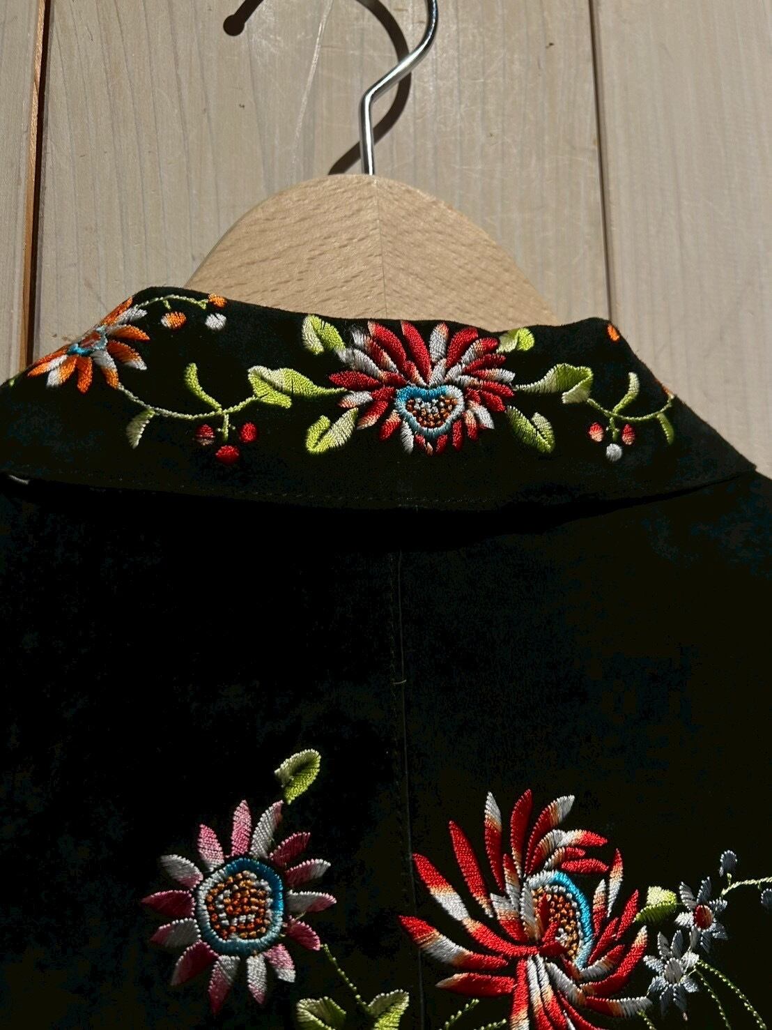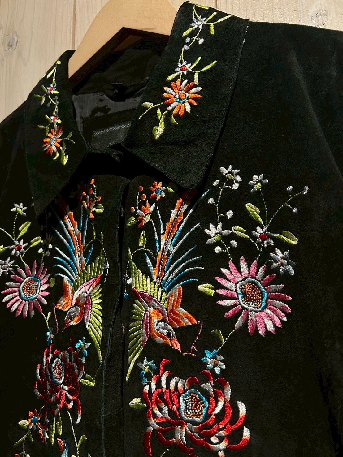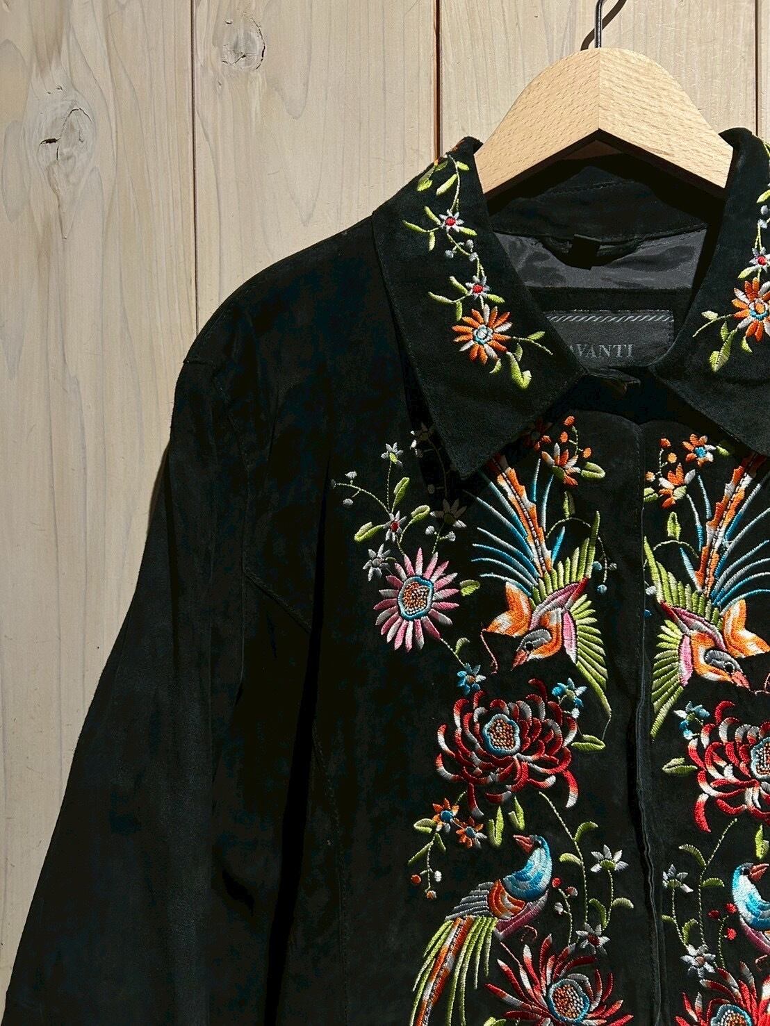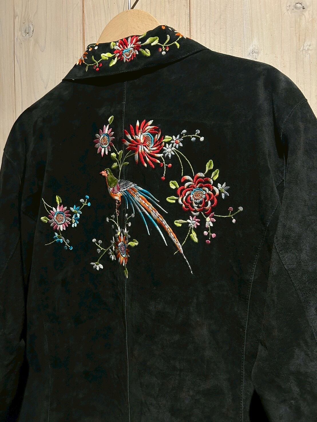 黒のスエードレザーをベースに、全面に鮮やかな刺繍を施したスペシャルなレザージャケット。
