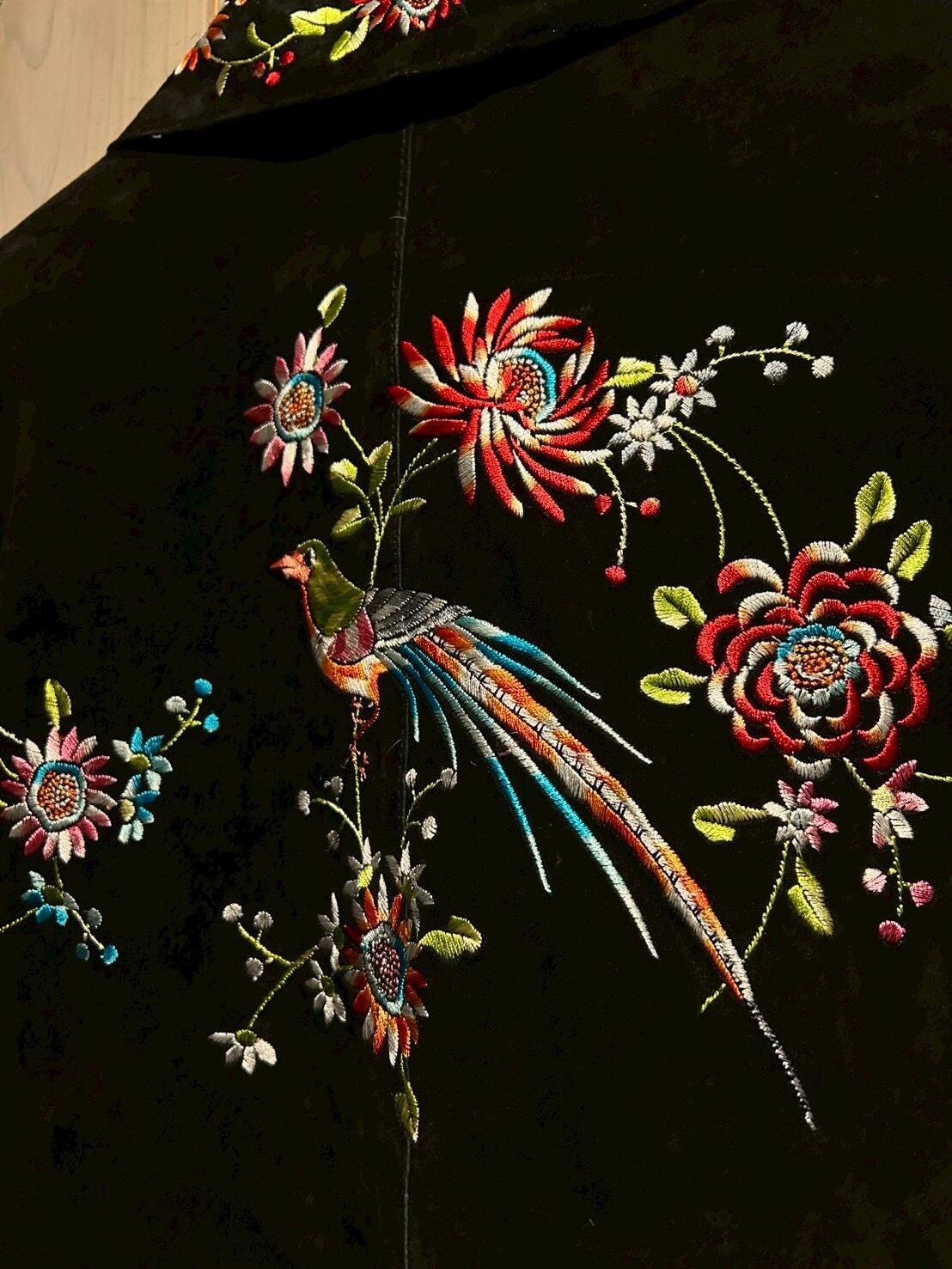 フロントには花々と共に舞う鳥が左右に配置され、生命力と華やかさを表現。さらに襟や裾、袖口にまで余すところなく刺繍を施すことで、どの角度から見ても目を惹く仕上がりとなっています。背面にも大きく花鳥を刺繍し、後ろ姿まで抜かりのないデザイン性が際立ちます。