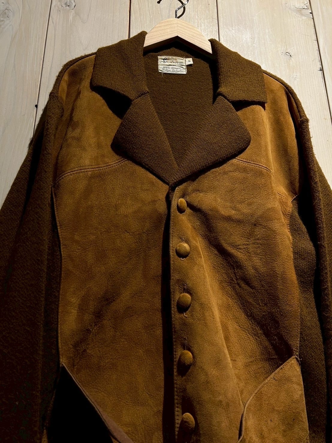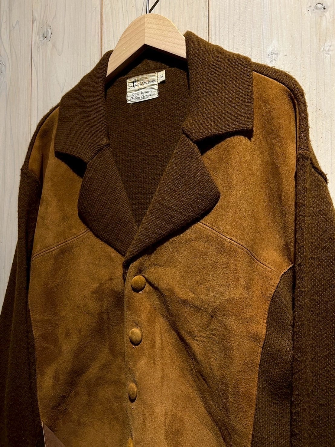 ボディフロントにスエードレザーを贅沢に切り替え、ボディやスリーブにはニット素材を組み合わせた、異素材を掛け合わせた70'sヴィンテージのニットジャケット。