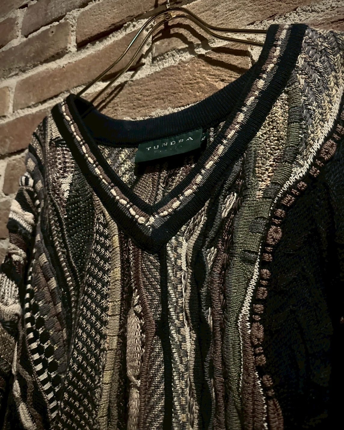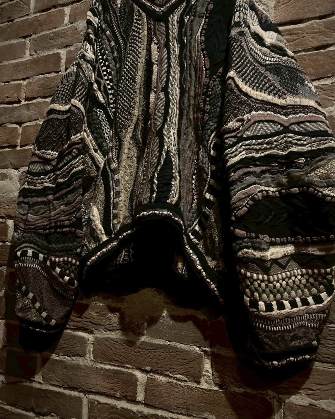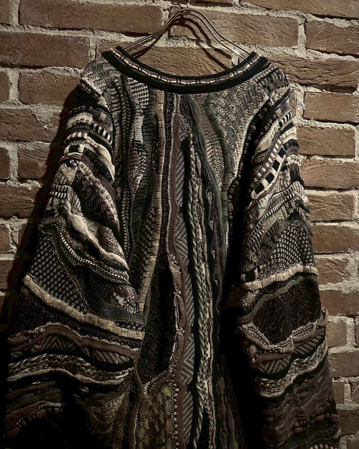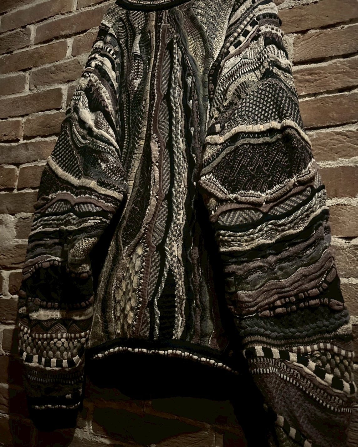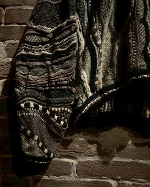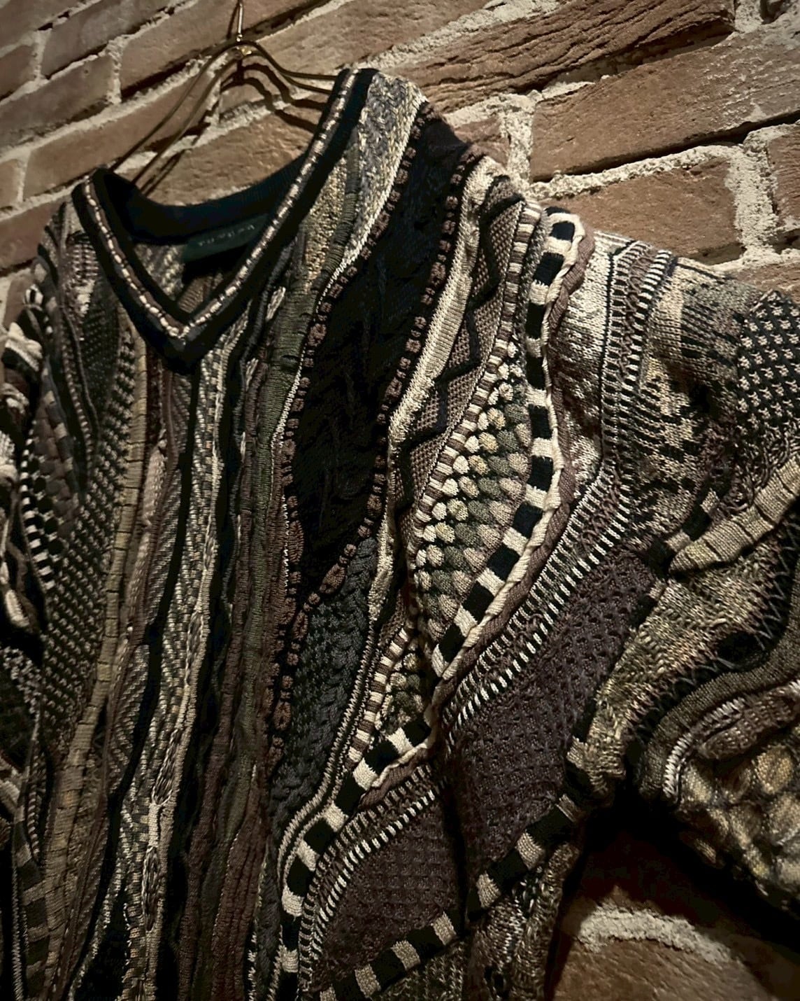 まるでアートピースのように仕上げられた独特の編み地は、90年代を象徴するCOOGI系のデザインを彷彿とさせつつ、よりシックで落ち着いたムードを演出しています。特徴的な3Dのニッティングは、光の当たり方や角度によって表情を変え、存在感を一層際立たせてくれます。