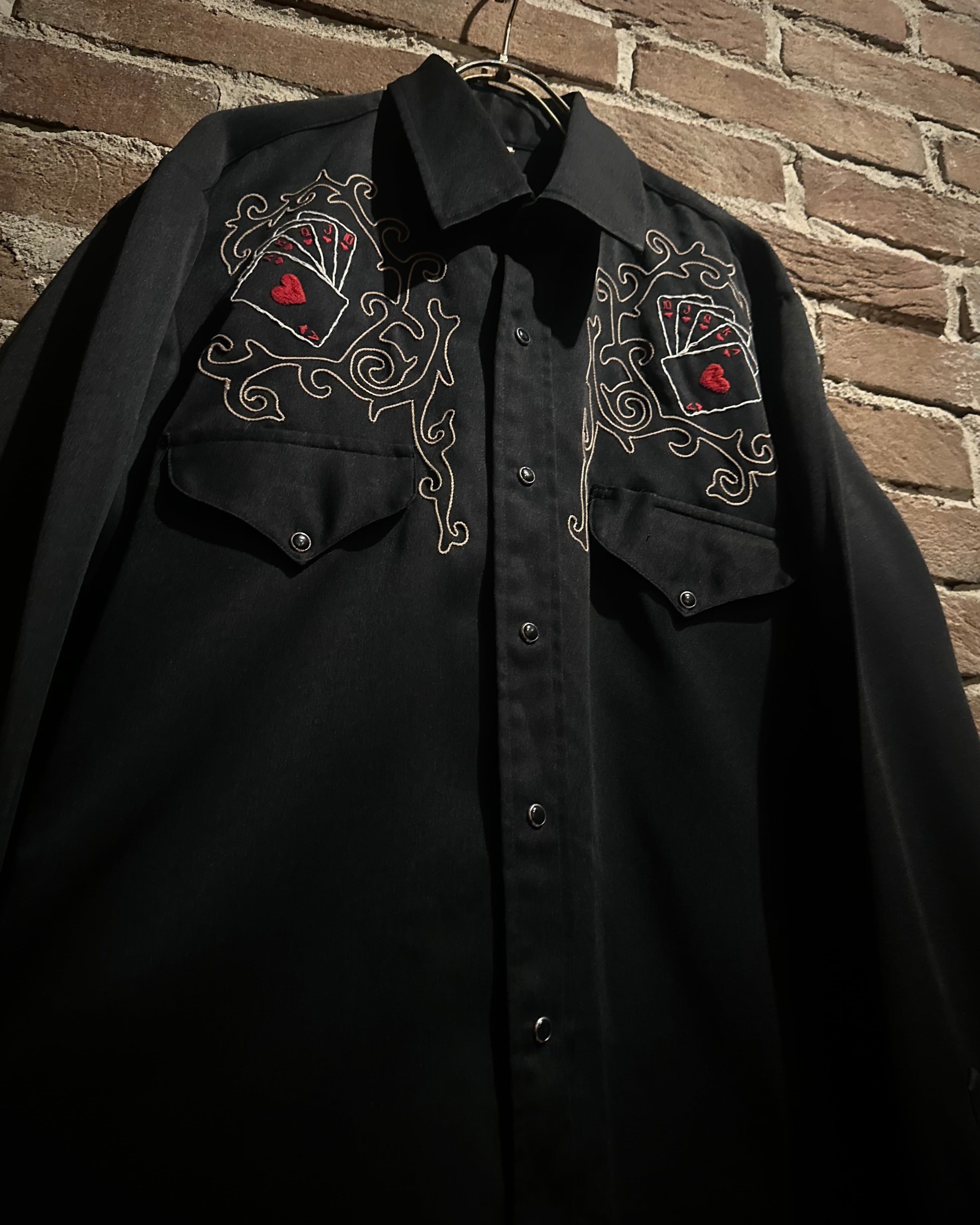 フロント両胸には、ハートのトランプモチーフを刺繍で施し、その周囲を取り巻くように流れるような装飾的刺繍を配置。繊細かつ大胆なデザインが、ブラックボディに映え、存在感を際立たせています。