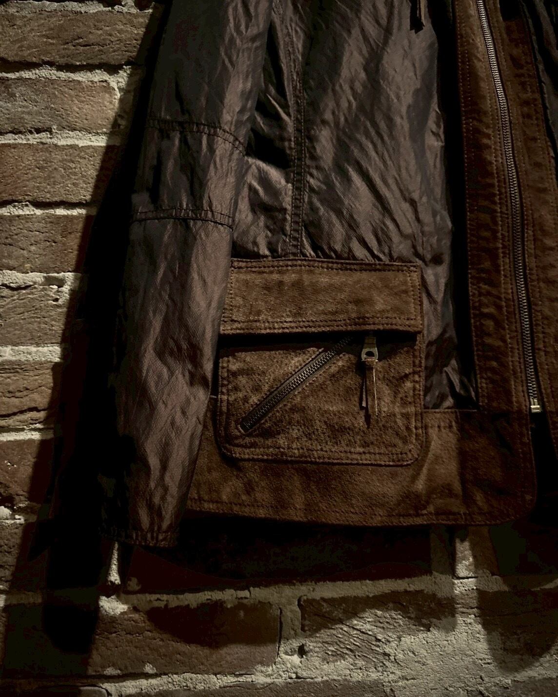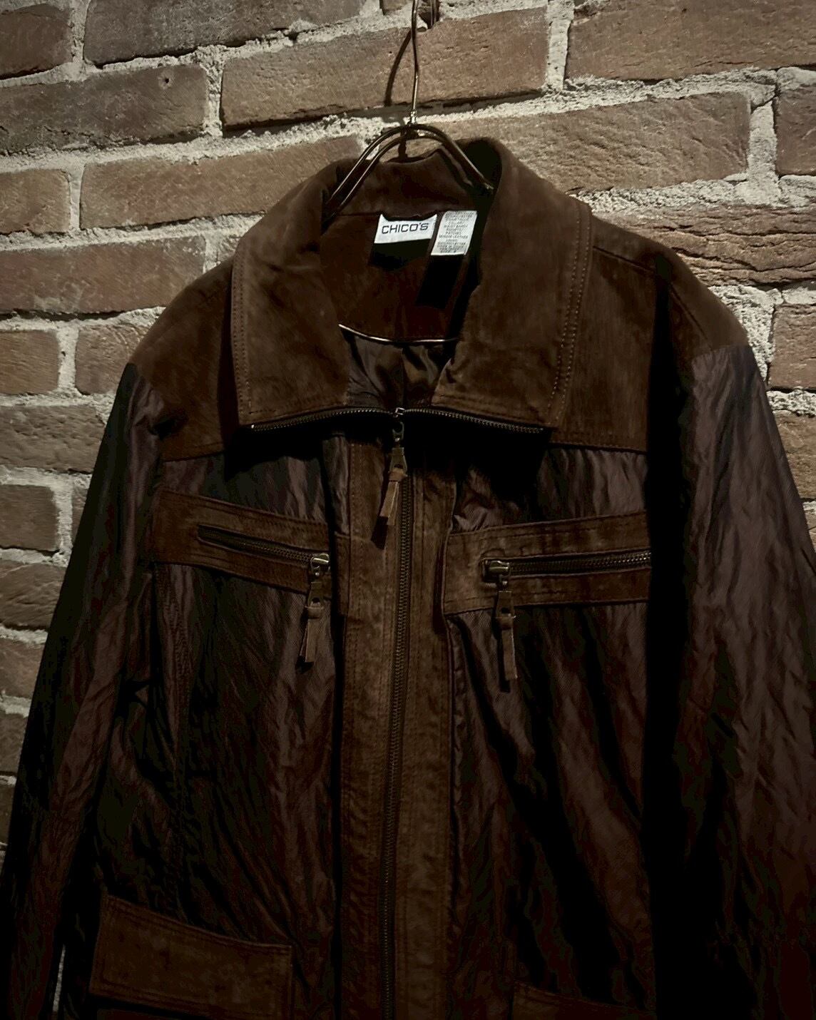 しっとりと柔らかなスエードレザーと、独特な光沢を放つナイロン素材を切り替えたジップアップジャケット。ブラウンのワンカラーでまとめられながらも、異素材のコンビネーションが奥行きある立体感を生み出し、見る角度によって表情を変える仕上がりになっています。レザーの重厚感とナイロンの軽快さを絶妙にミックスさせたデザインセンスは、やはりCHICO’Sならではの感性が光りますね。