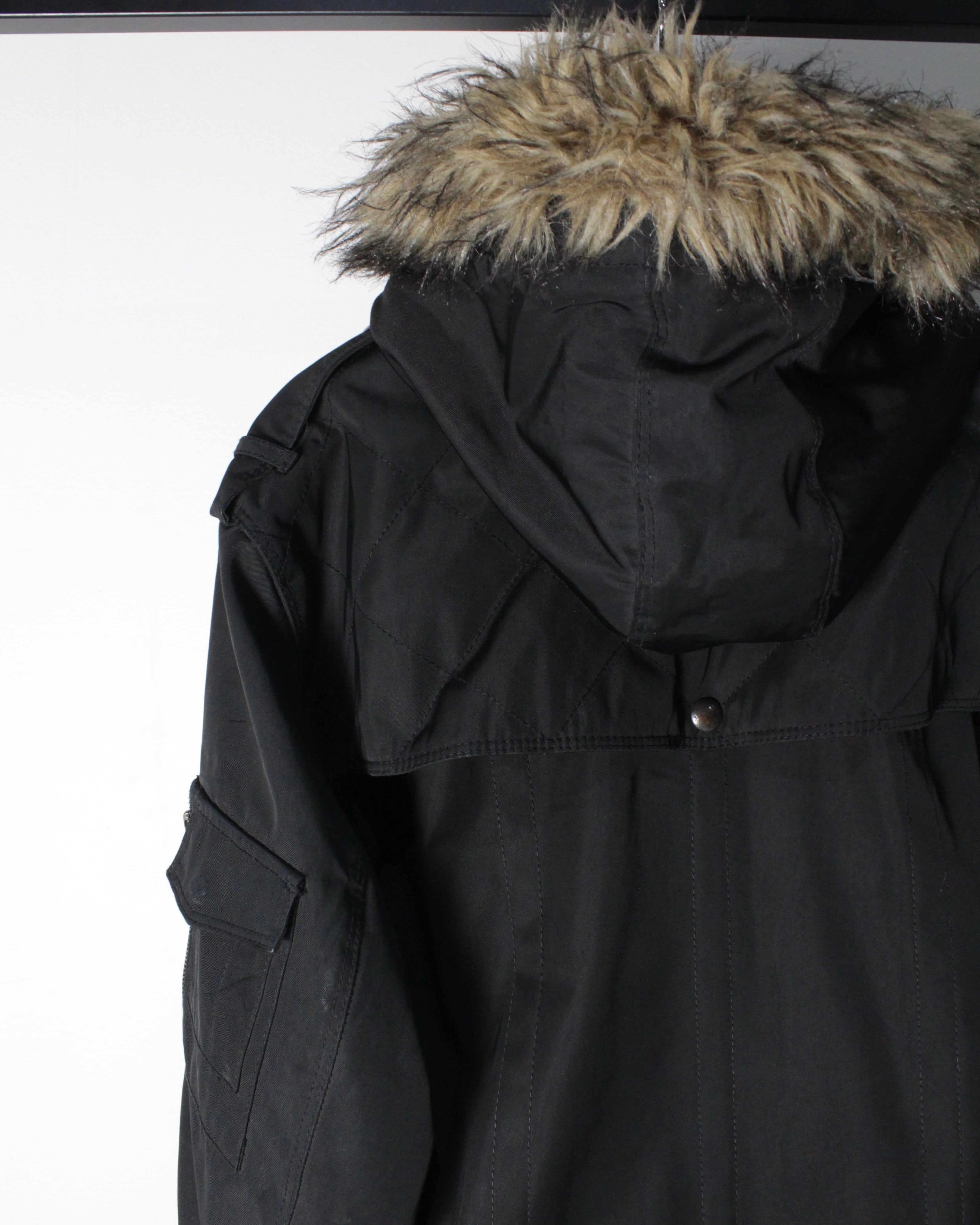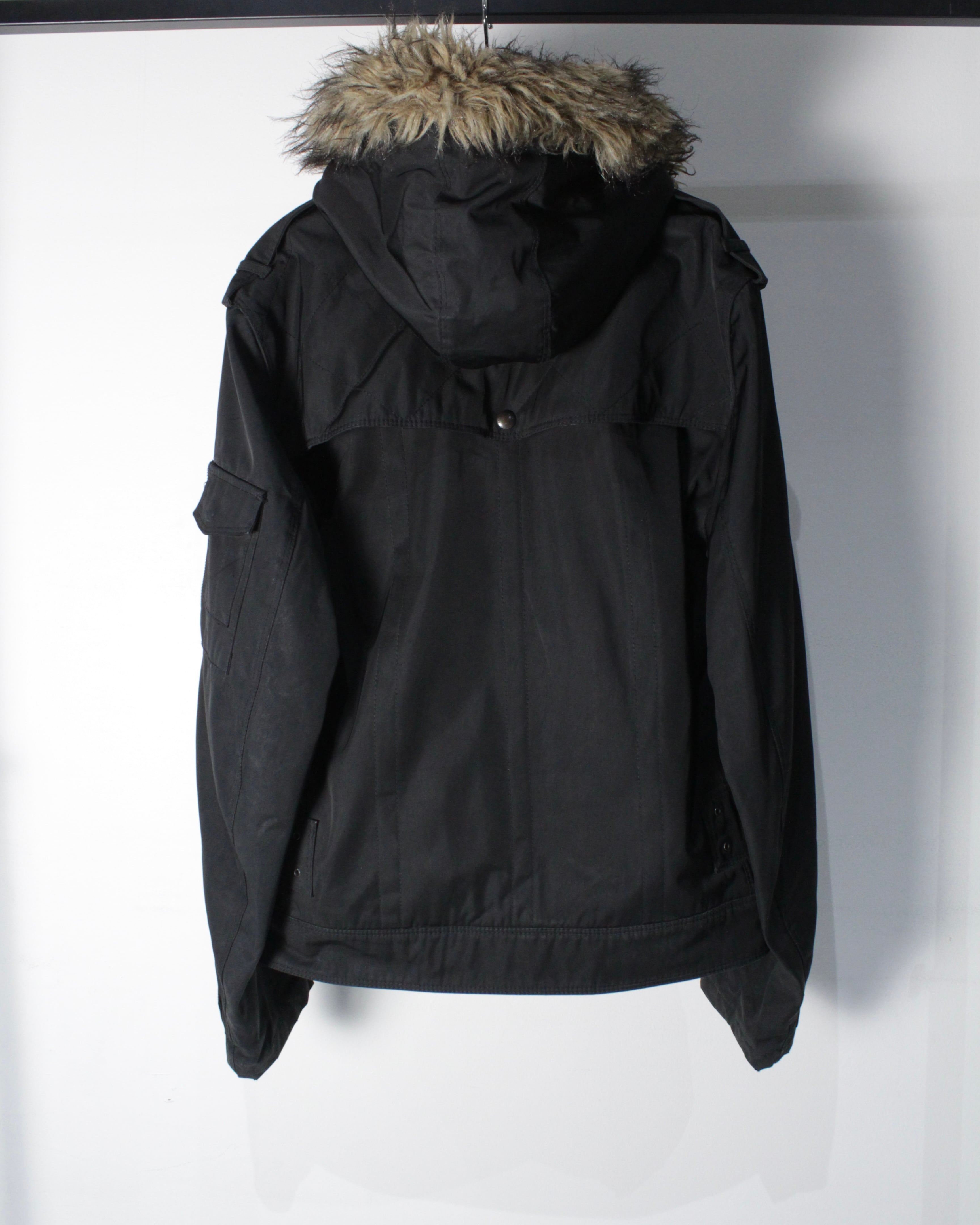フロントにはフラップ付きの大容量ポケットとジップポケットを組み合わせ、収納力とアクセントを両立。アームにはミリタリーらしいユーティリティポケットを配置し、男らしい無骨さを強調。背面から見ても立体感のあるシルエットが際立ち、野暮ったさを感じさせません。