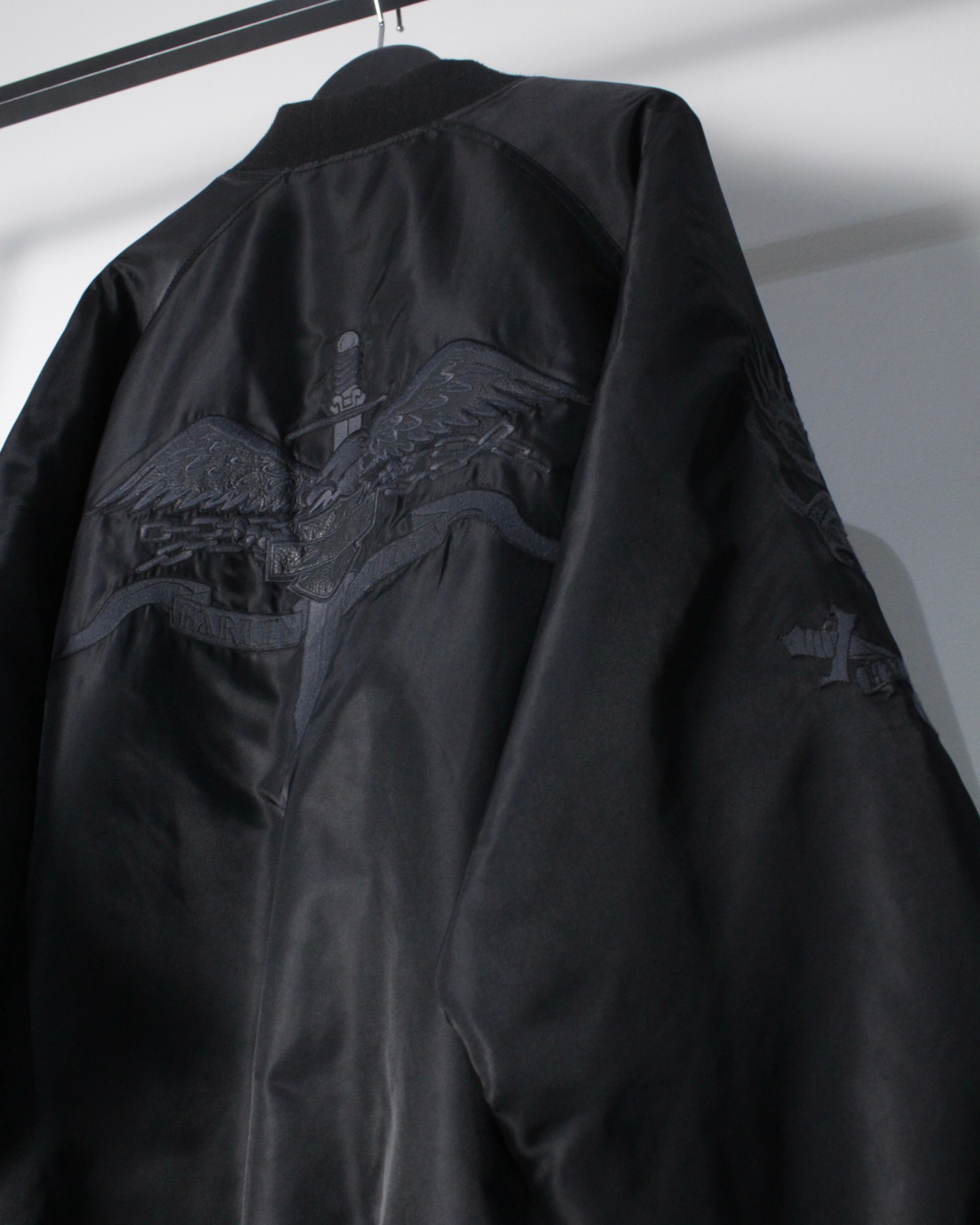 フロントにはブランドを象徴するロゴを刺繍し、袖にはフレイムをまとったスカルモチーフやイーグルロゴ刺繍を大胆に配置。さらに背面には白頭鷲とソードを組み合わせた、レザーを切り替えた迫力のビッグモチーフを落とし込み、見る者を圧倒する存在感を放ちます。