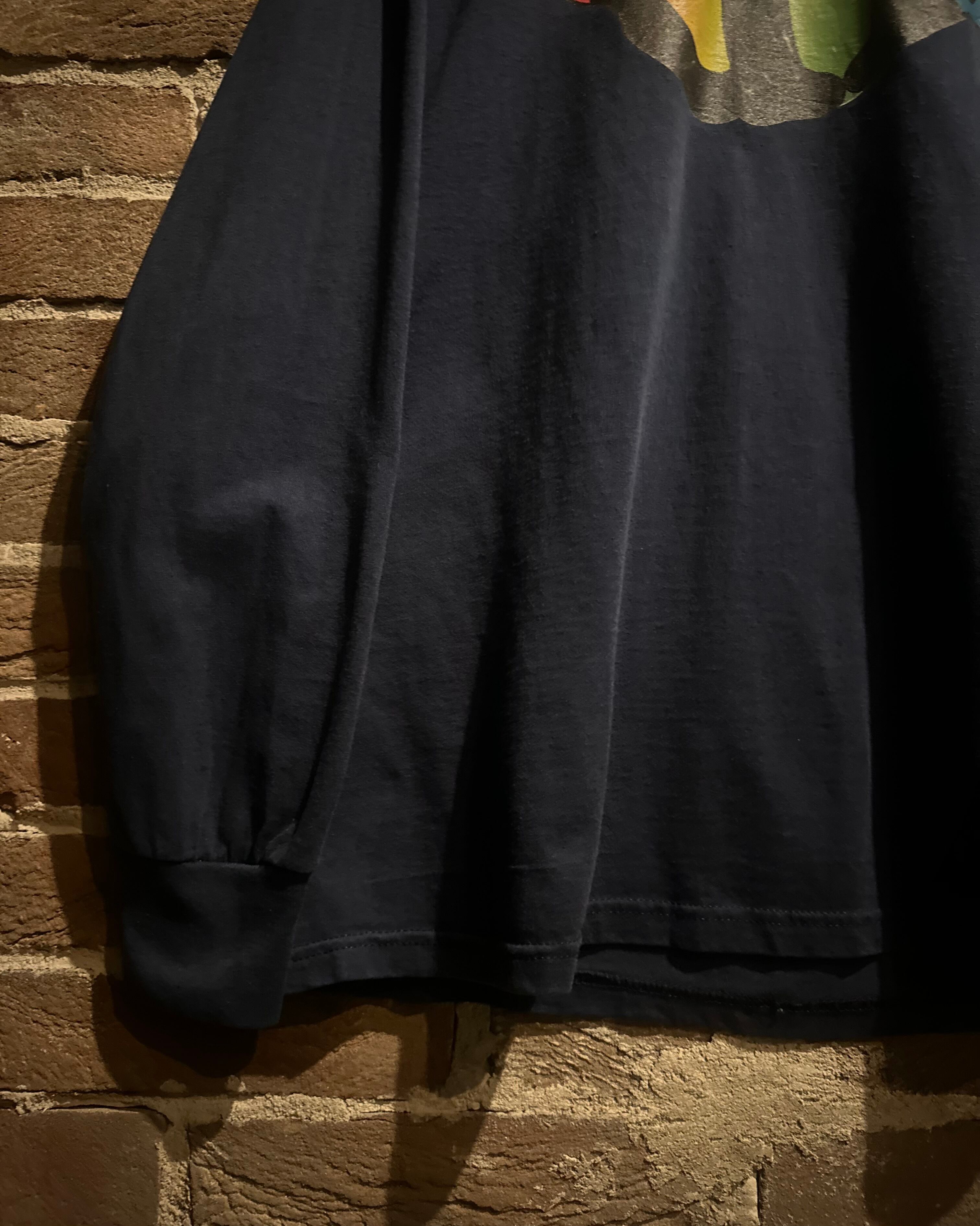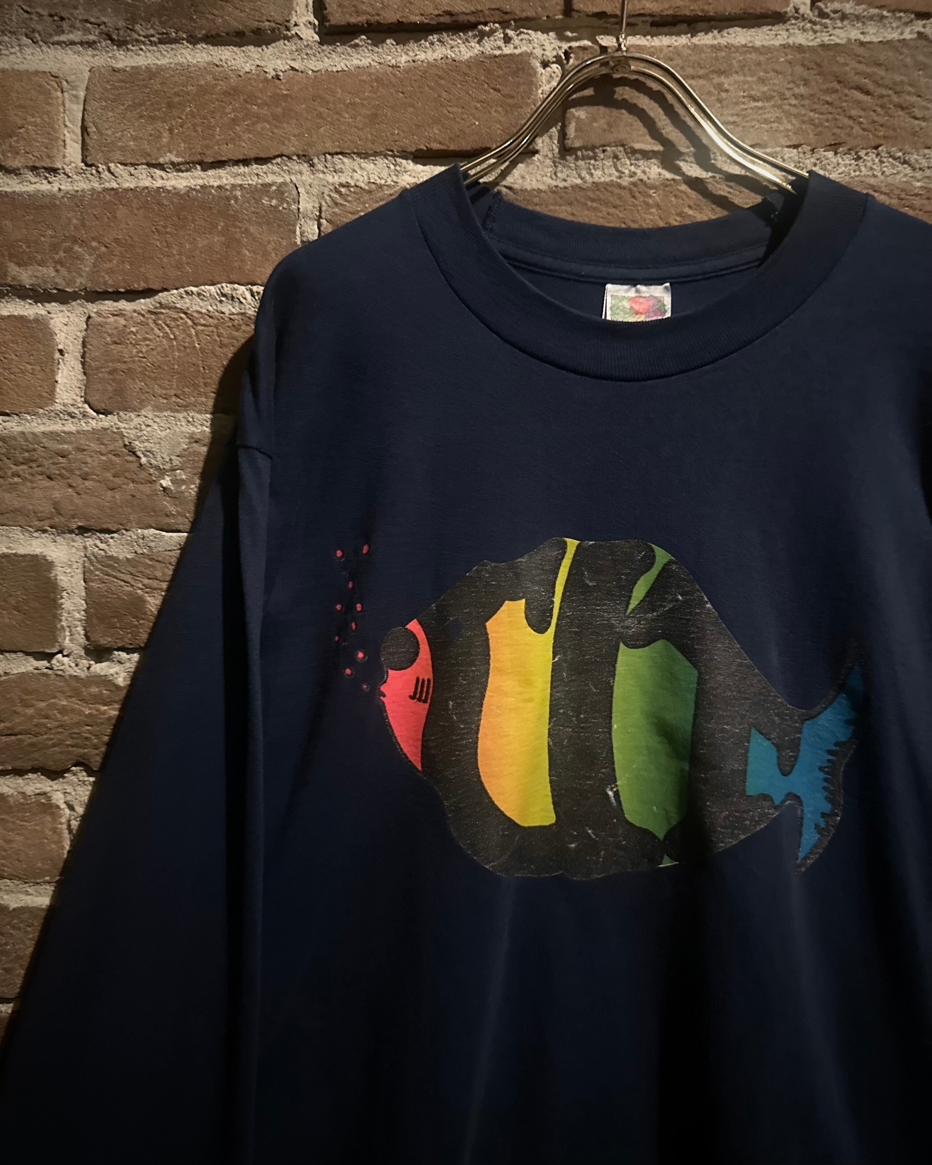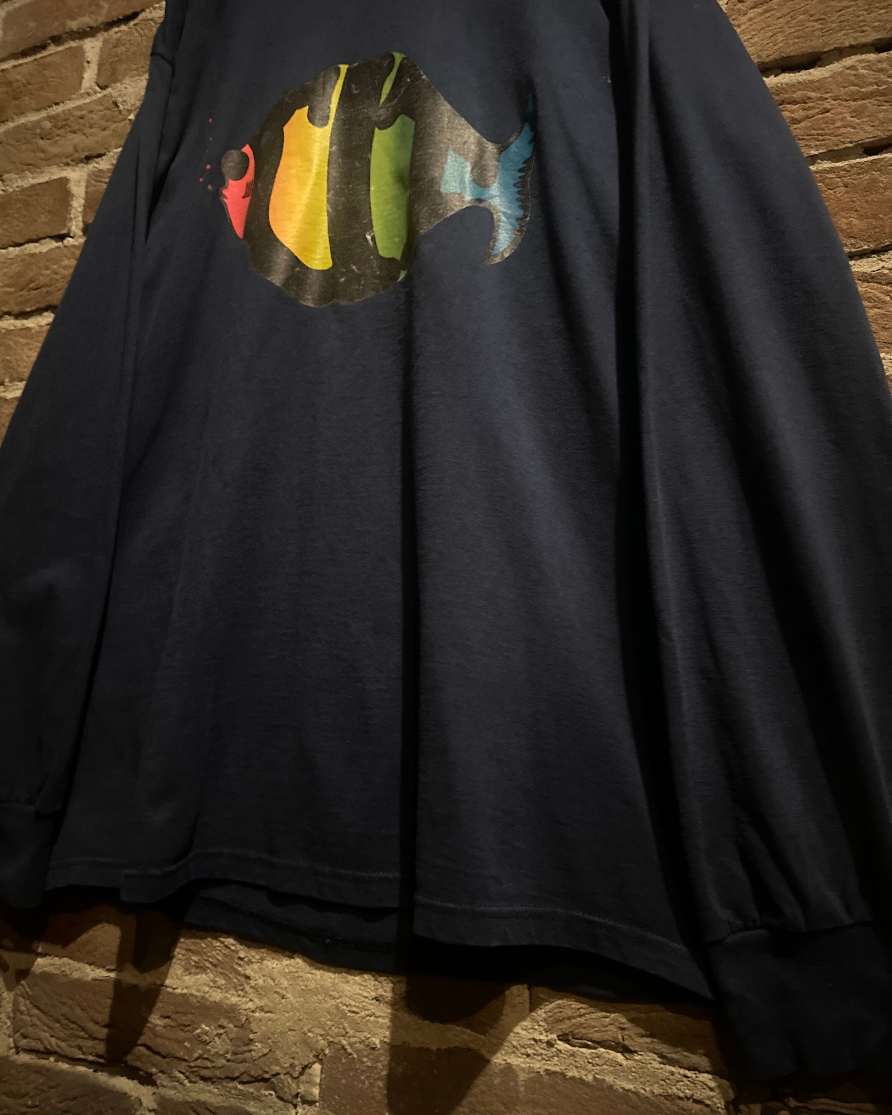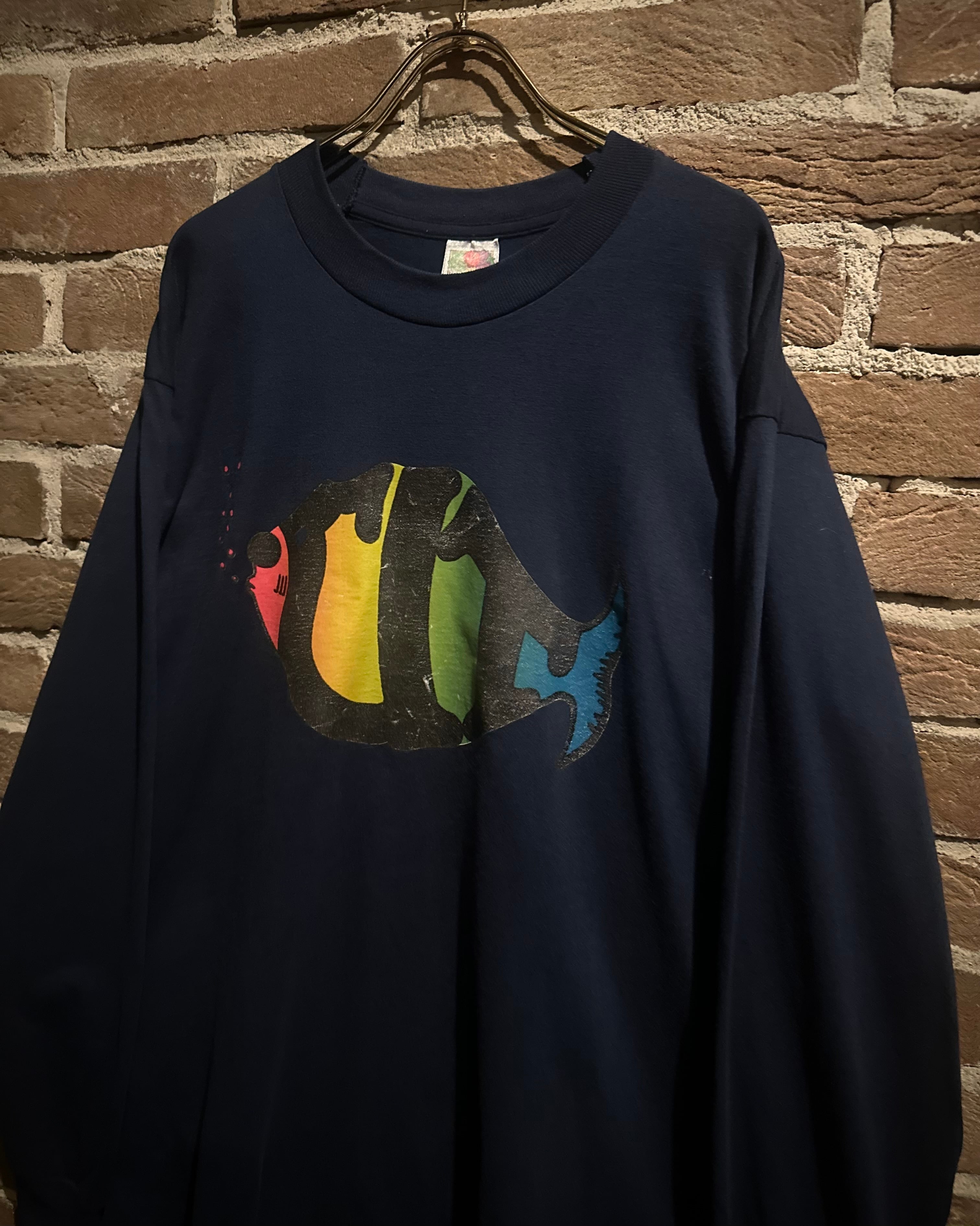 ネイビーのボディに、フロントに鮮やかなグラデーションのカラーリングで表現された魚がプリントされた90'sのロンT。