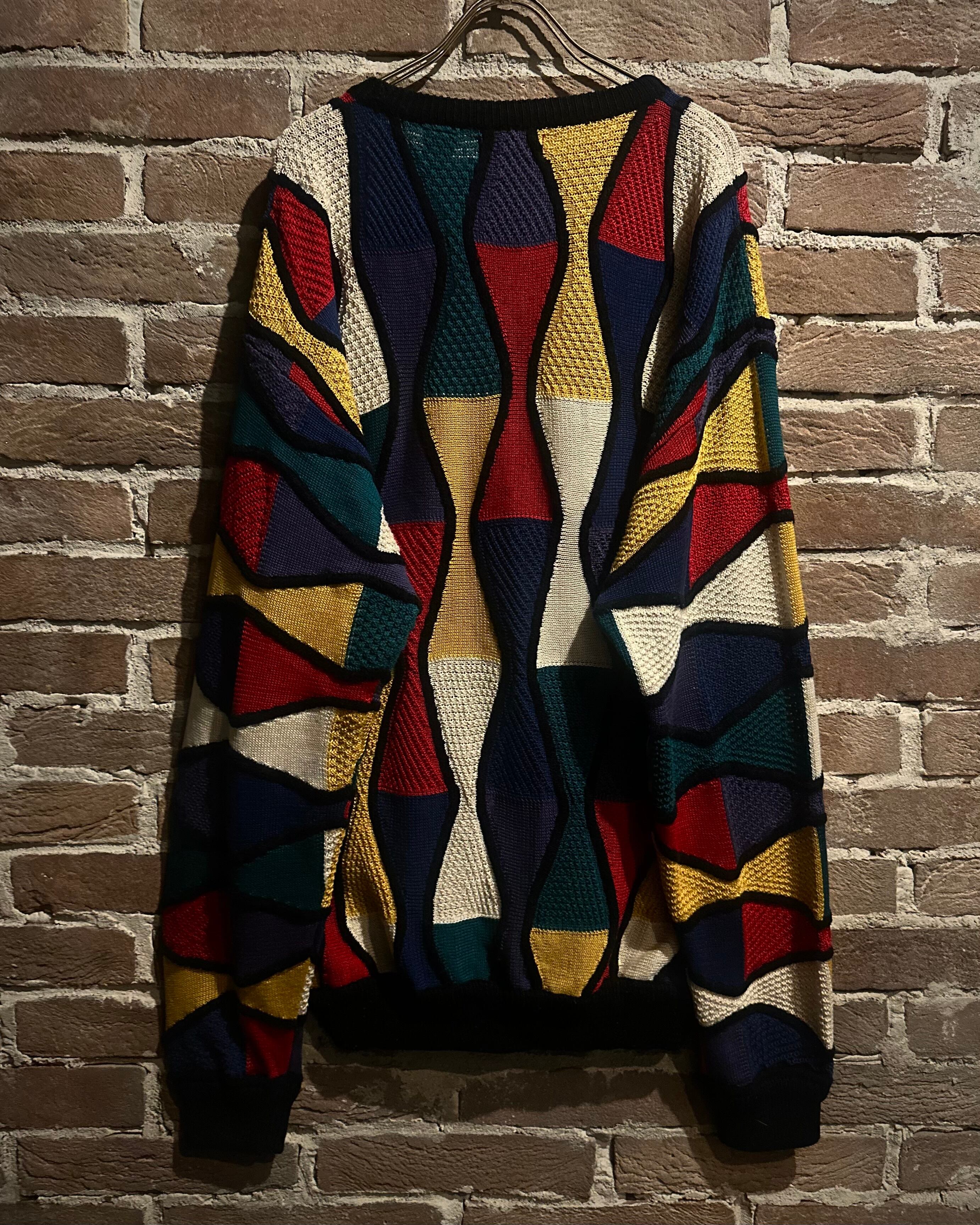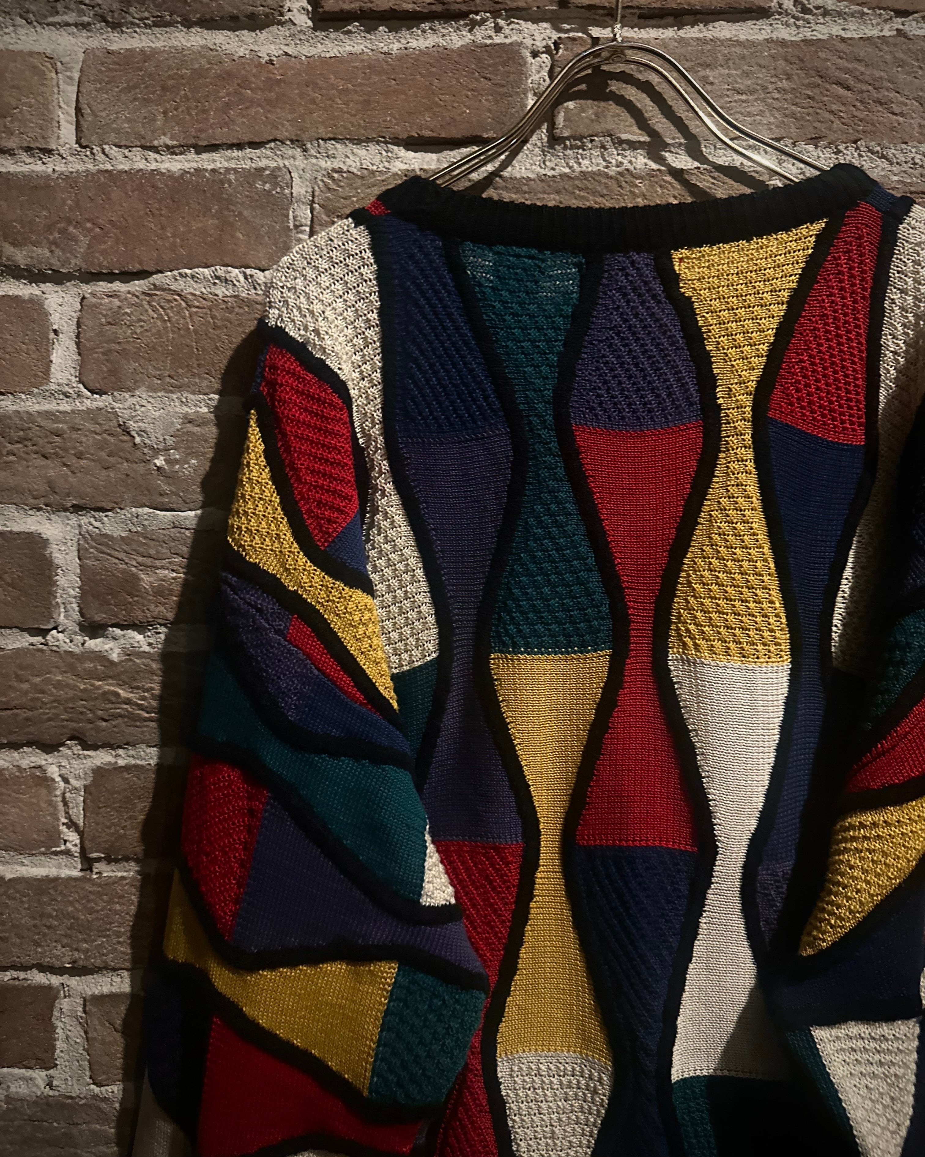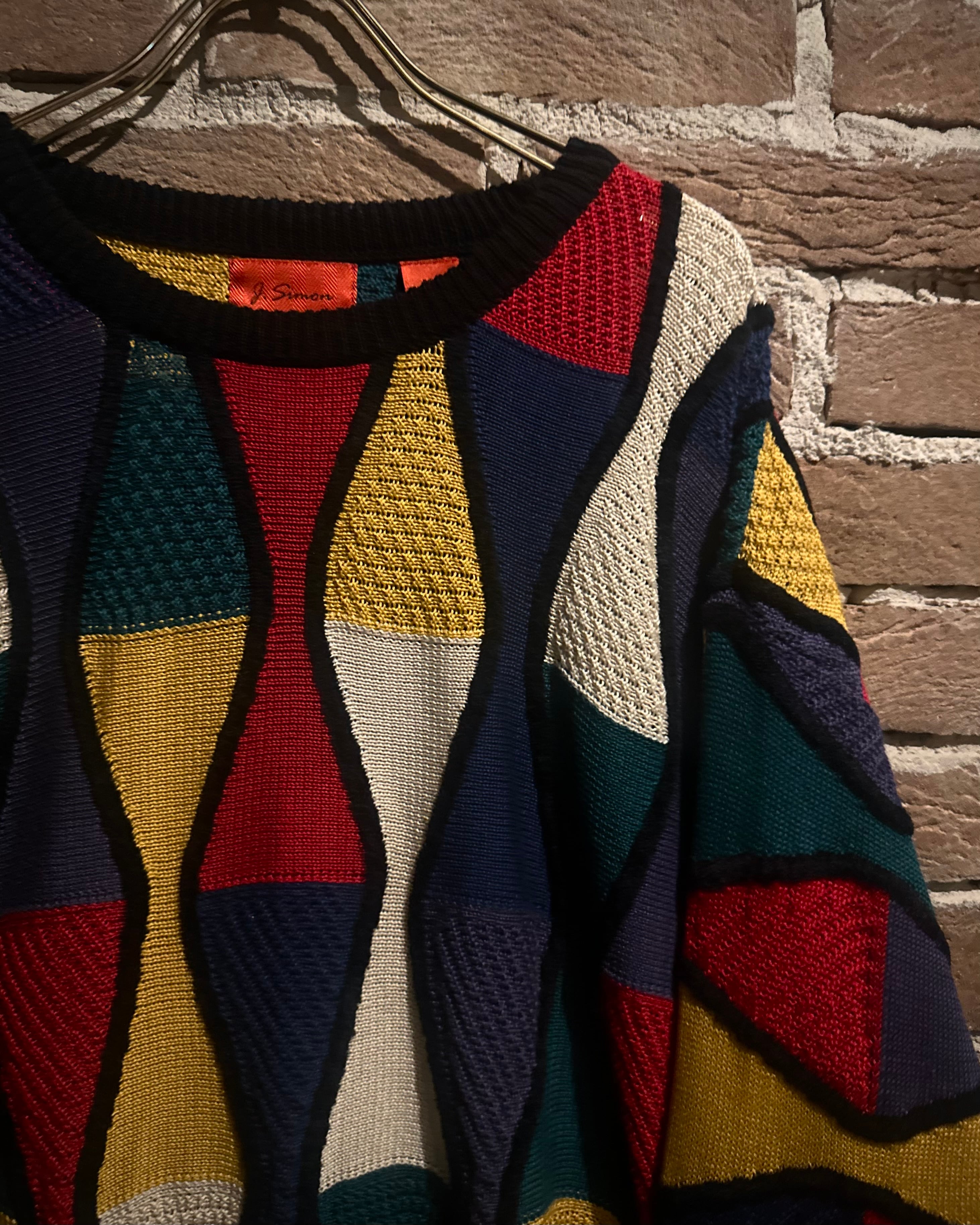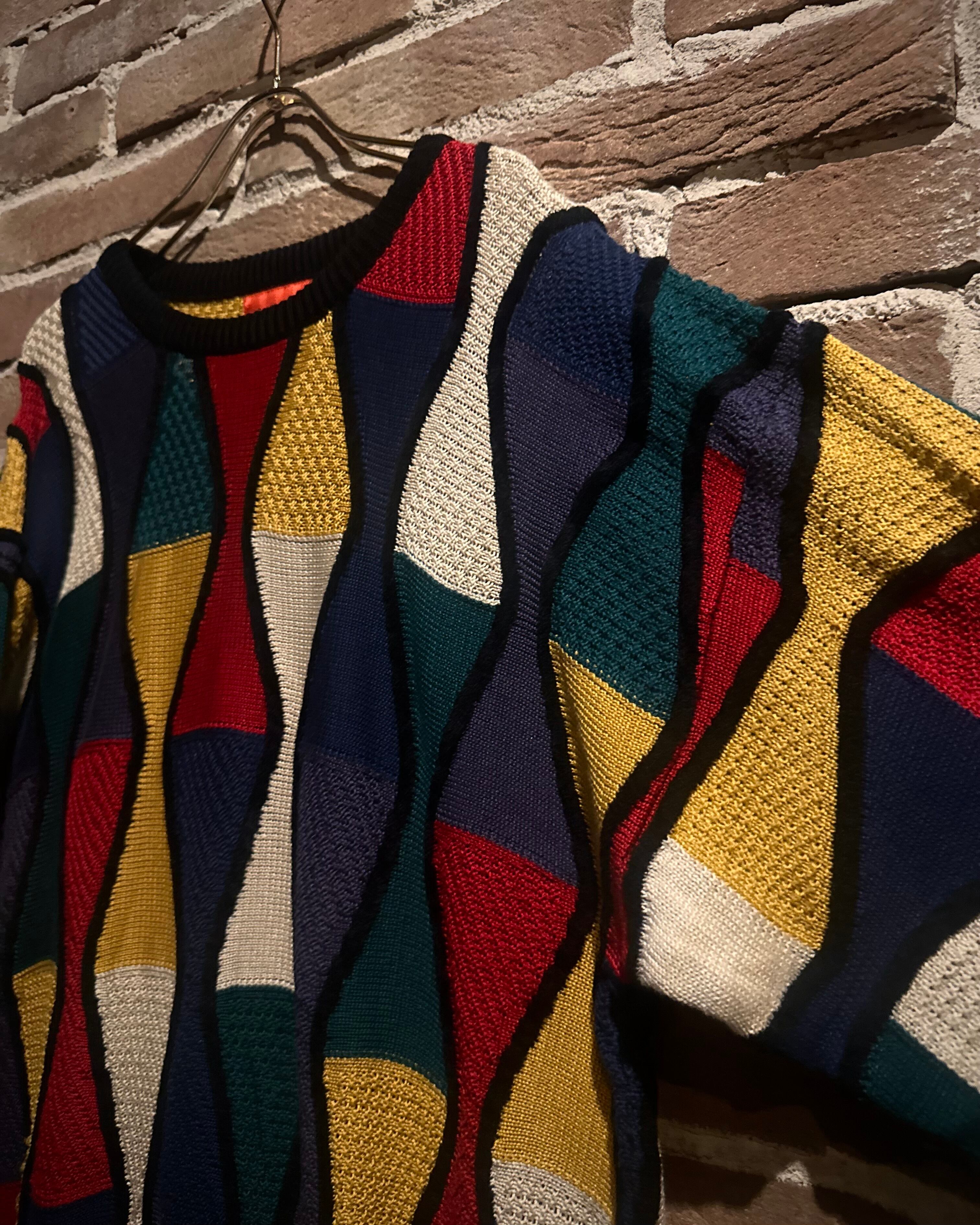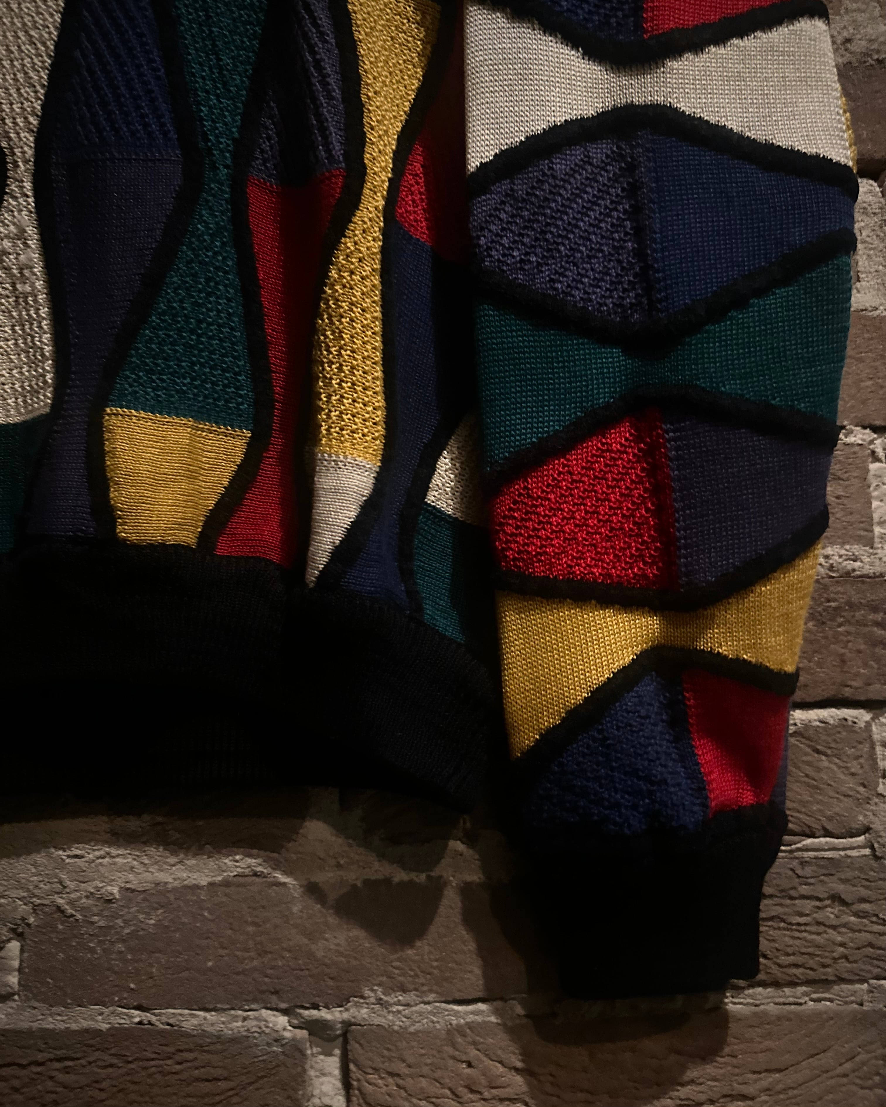 立体的な編み柄と鮮烈なカラーリングが特徴で、存在感は抜群。赤、青、黄、緑といった原色にブラックを効かせることで、モザイクアートのような奥行きある表情を演出しています。