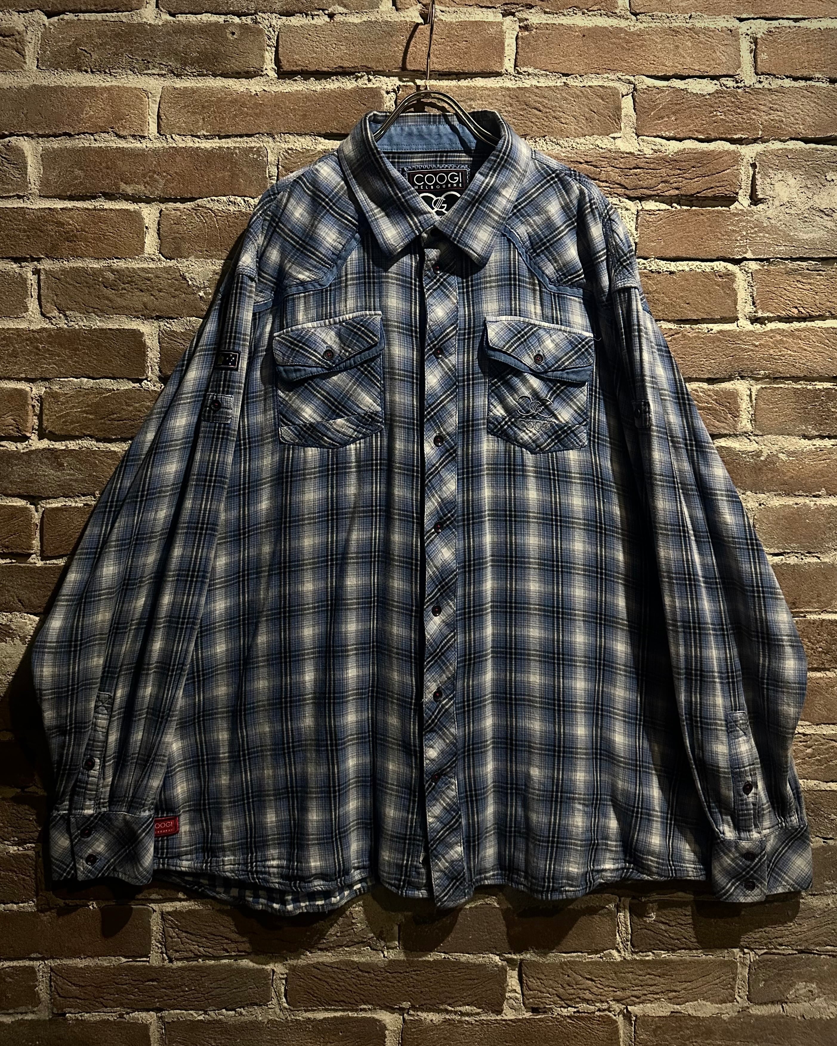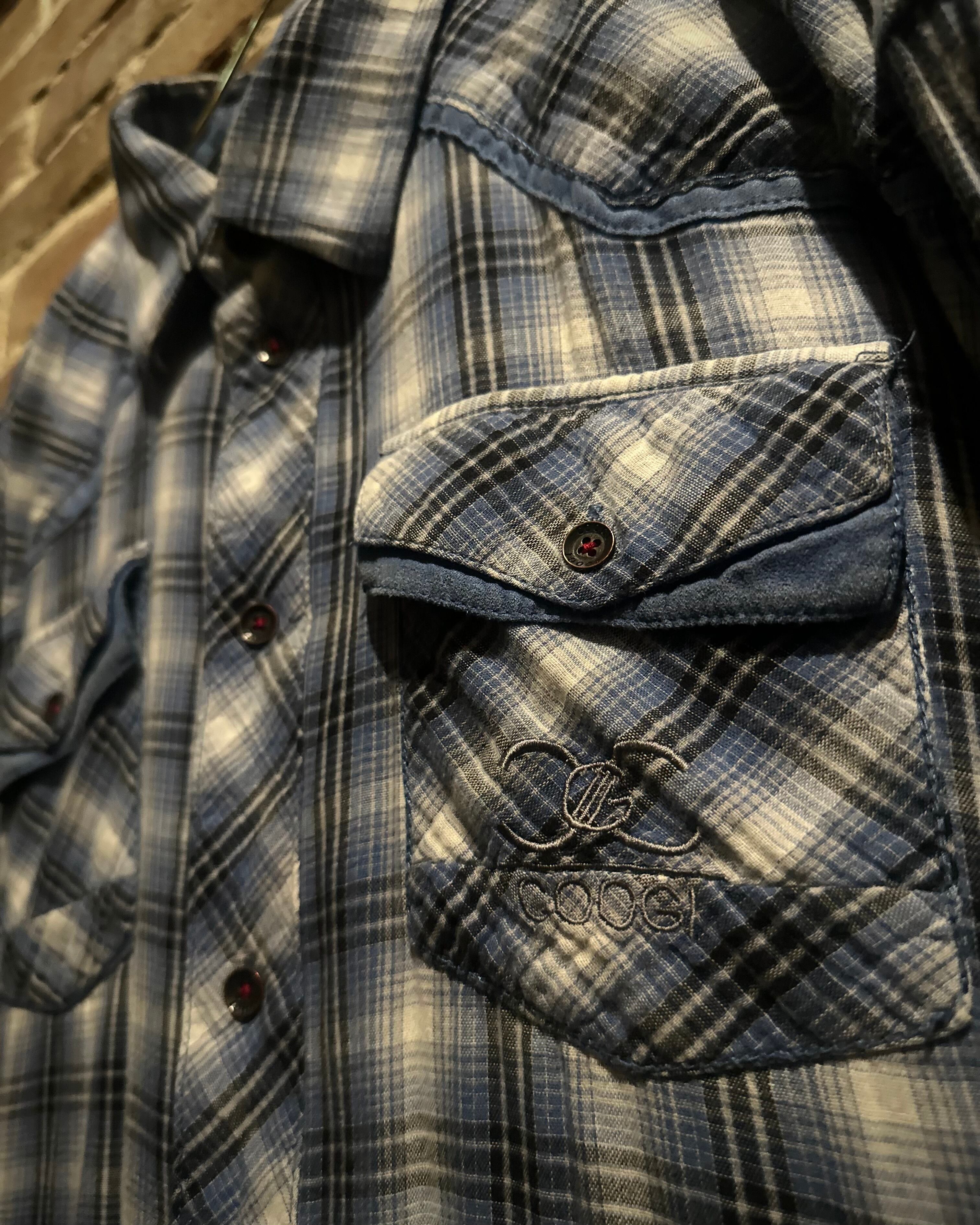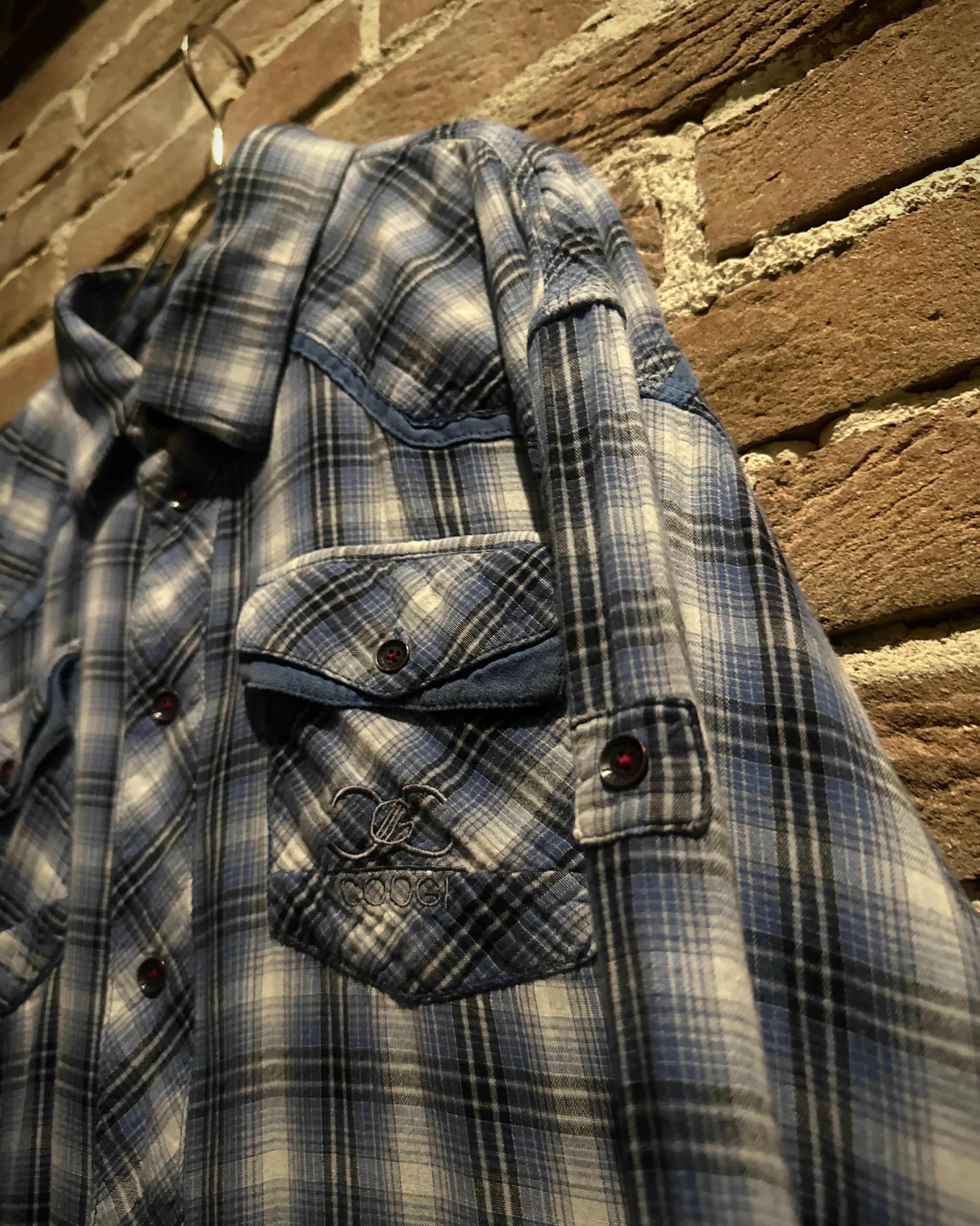 ブルーを基調としたチェック柄に、胸元のフラップポケットにはブランドロゴの刺繍を配置し、派手さを抑えつつも確かにCOOGIらしい存在感を演出しています。さらに、ダブルポケット仕様やヨーク部分の切り替え等のディテール使いも◎