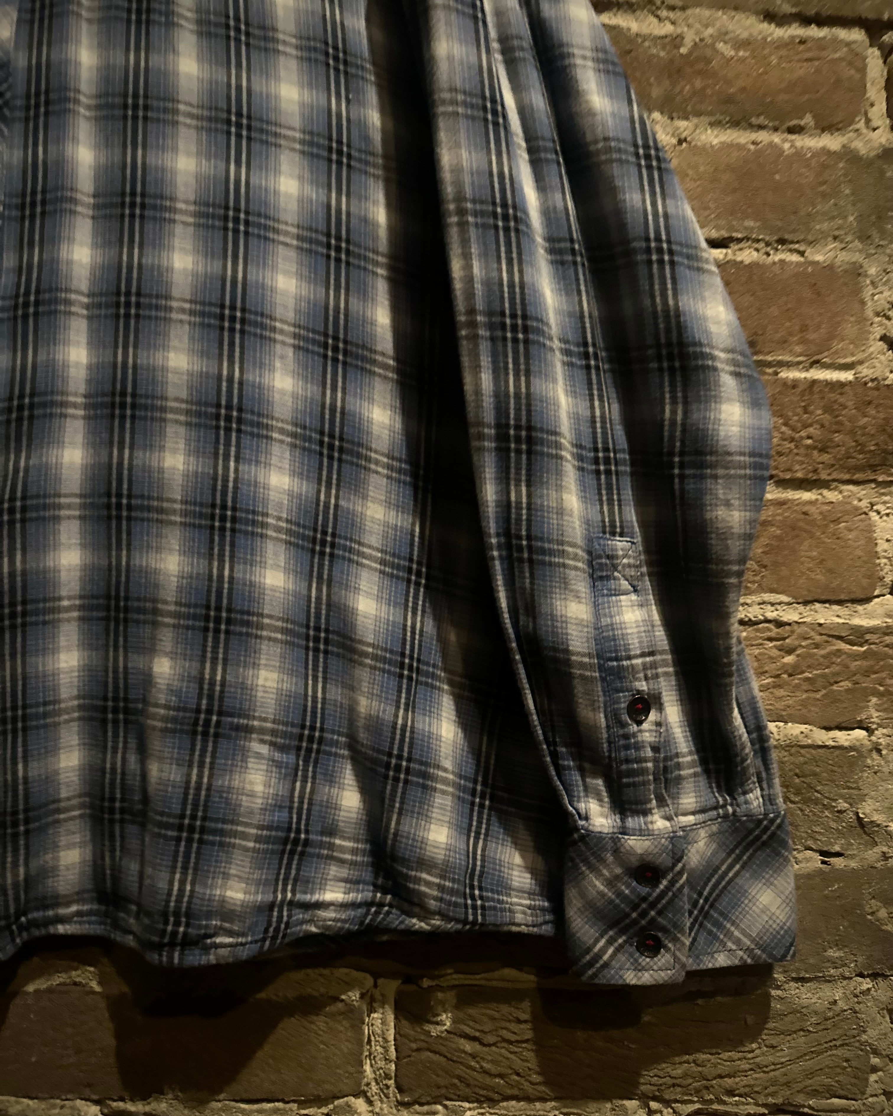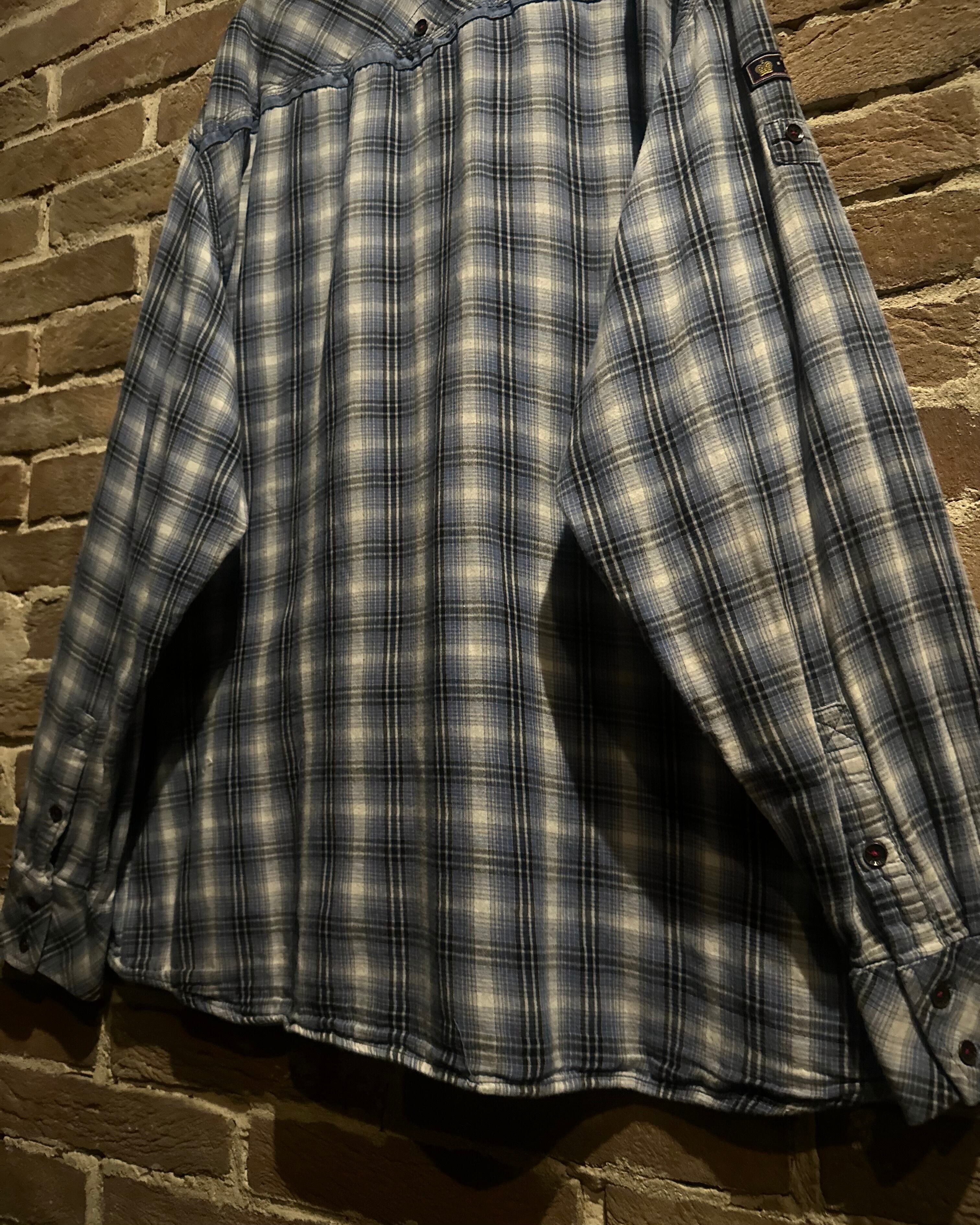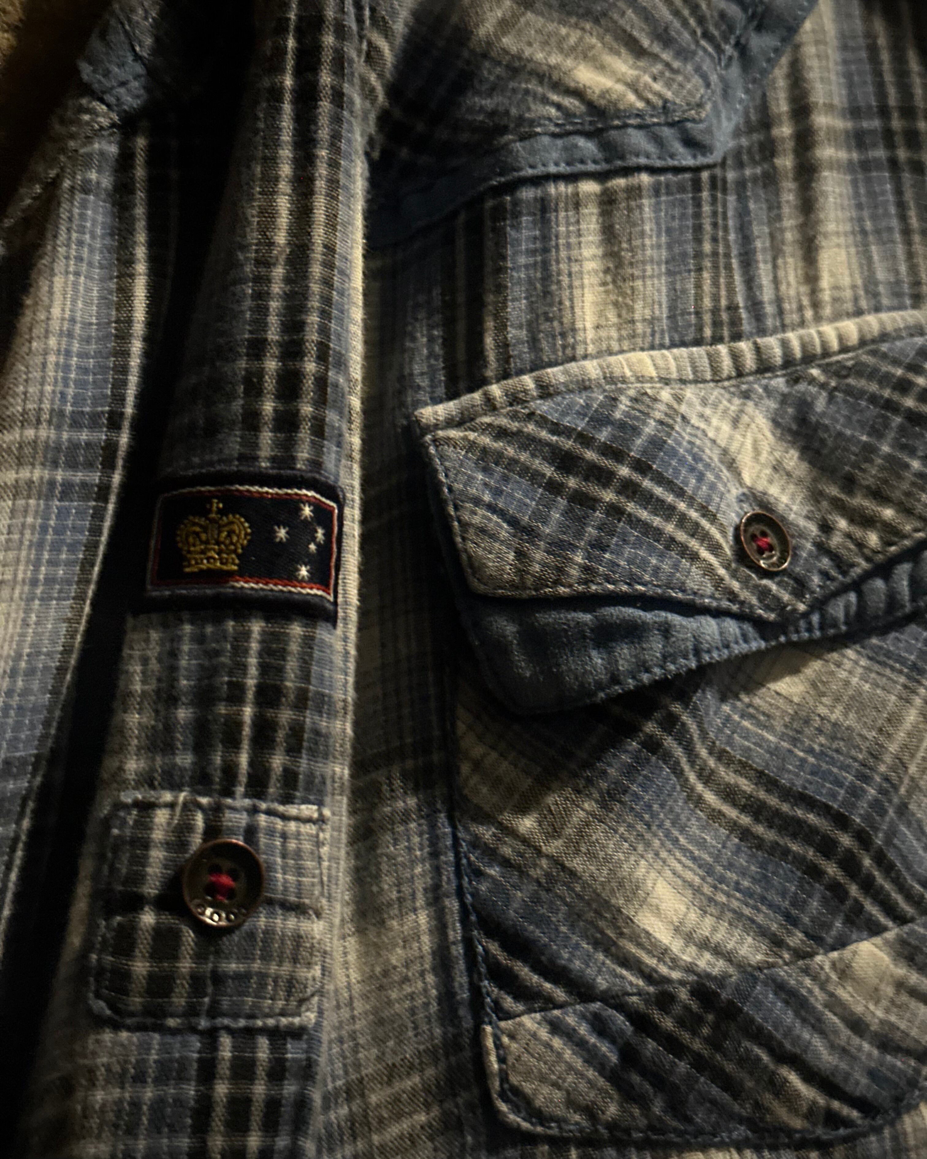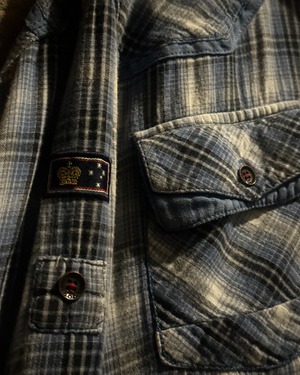 ブルーを基調としたチェック柄に、胸元のフラップポケットにはブランドロゴの刺繍を配置し、派手さを抑えつつも確かにCOOGIらしい存在感を演出しています。さらに、ダブルポケット仕様やヨーク部分の切り替え等のディテール使いも◎