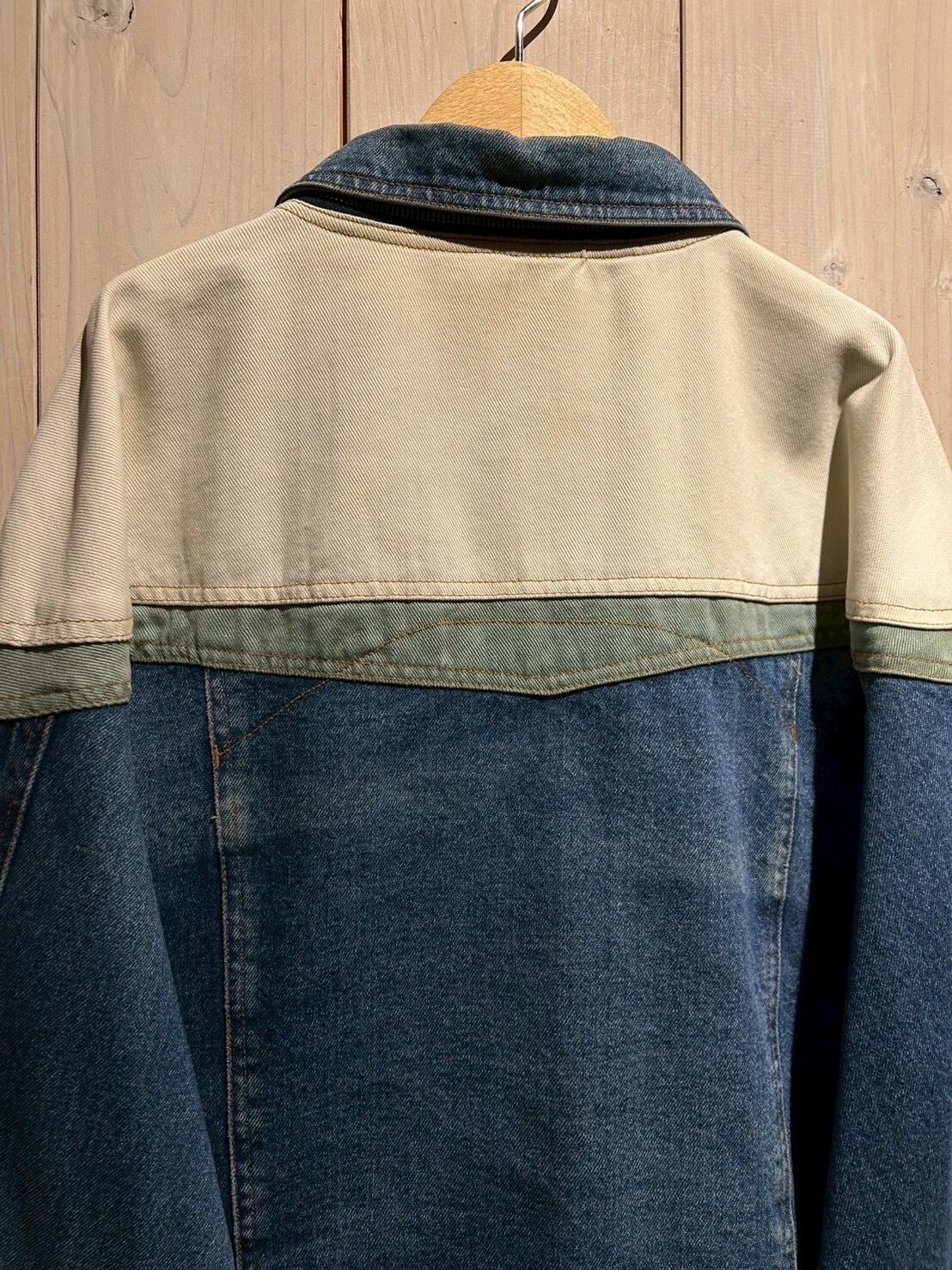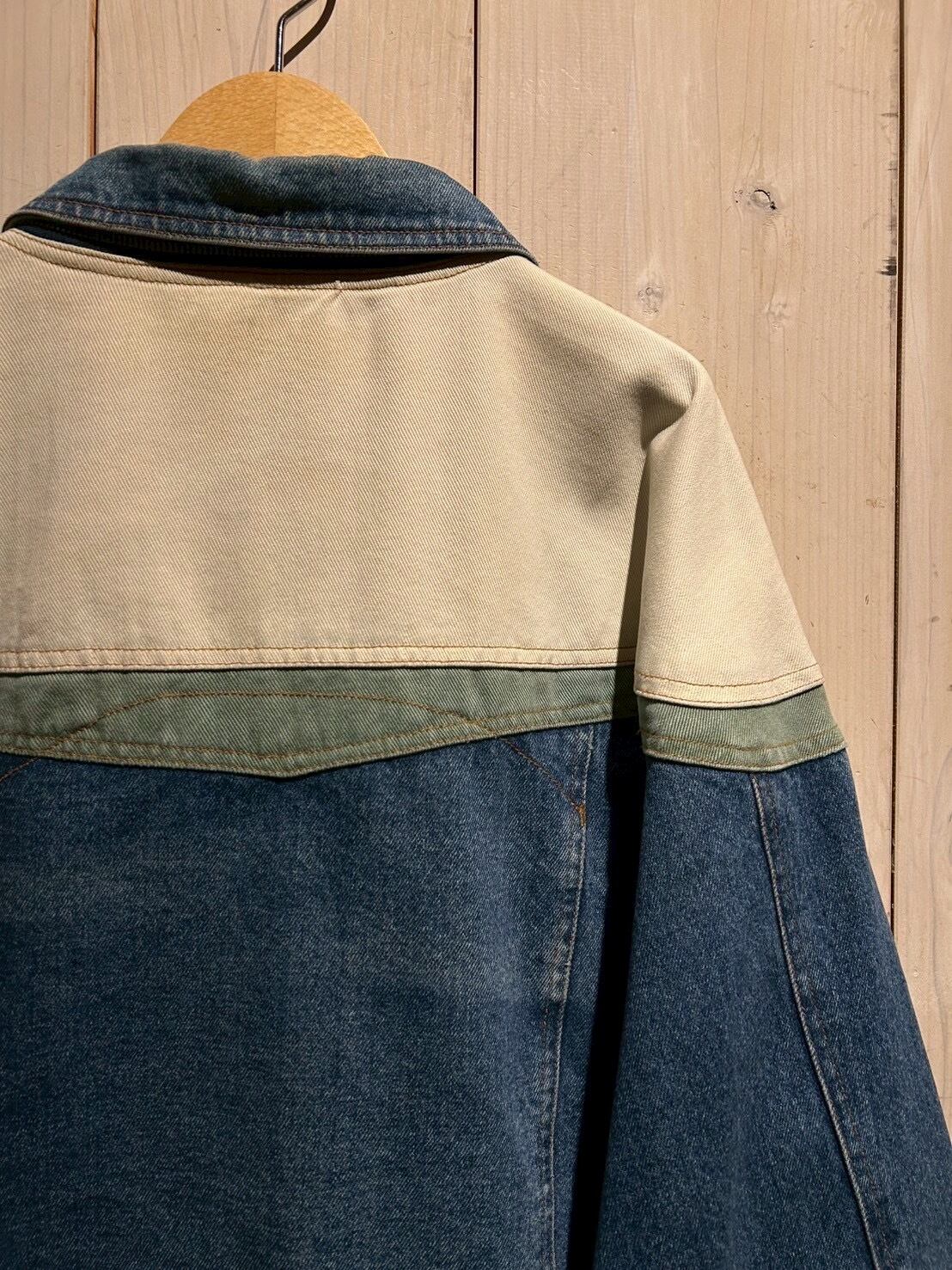 インディゴブルーのデニムをベースに、生成り、淡いグリーンデニムを組み合わせた3トーン仕様で仕立てられており、スタンダードなデニムジャケットに新鮮な表情を与えています。カラーごとの質感の違いも際立ち、見る角度によって印象が変わる遊び心ある1着です。
