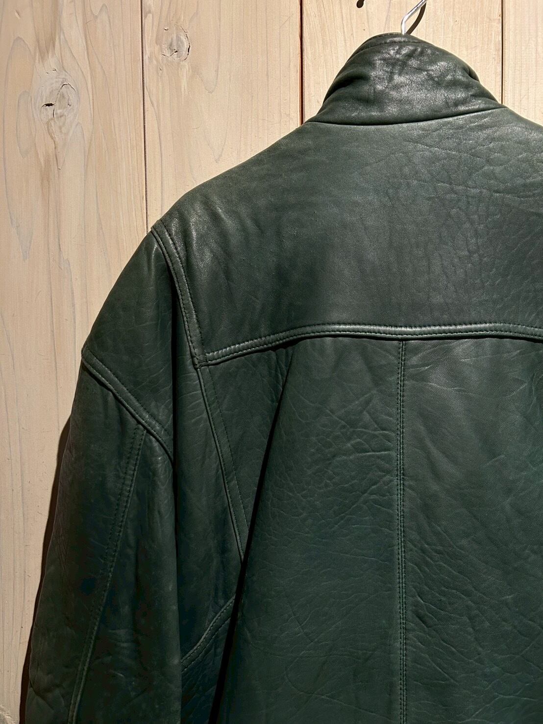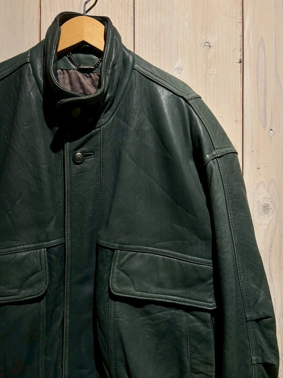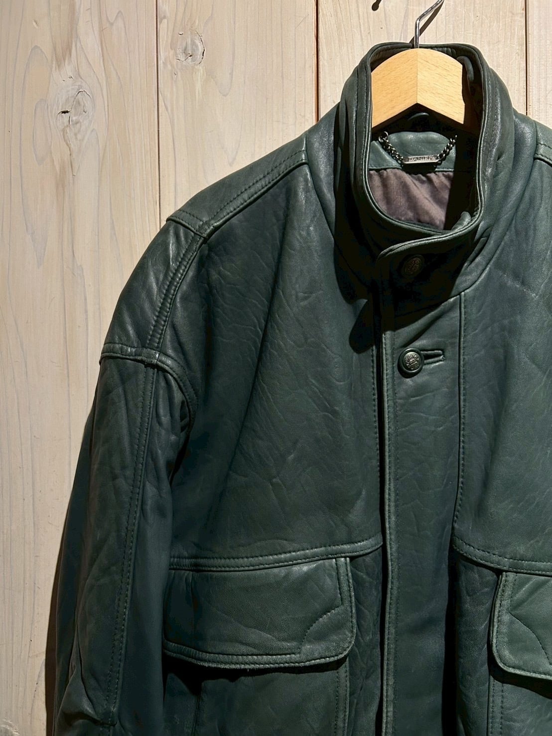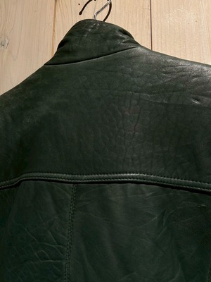 こちらは深みのあるグリーンカラーが印象的なレザージャケット。柔らかくしなやかなレザーを贅沢に使用し、肉厚でありながらも着心地の軽さを感じられる1着。
