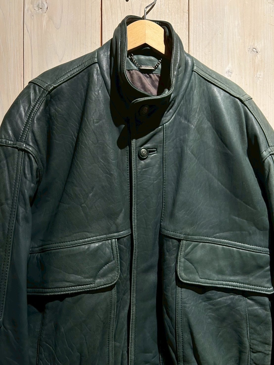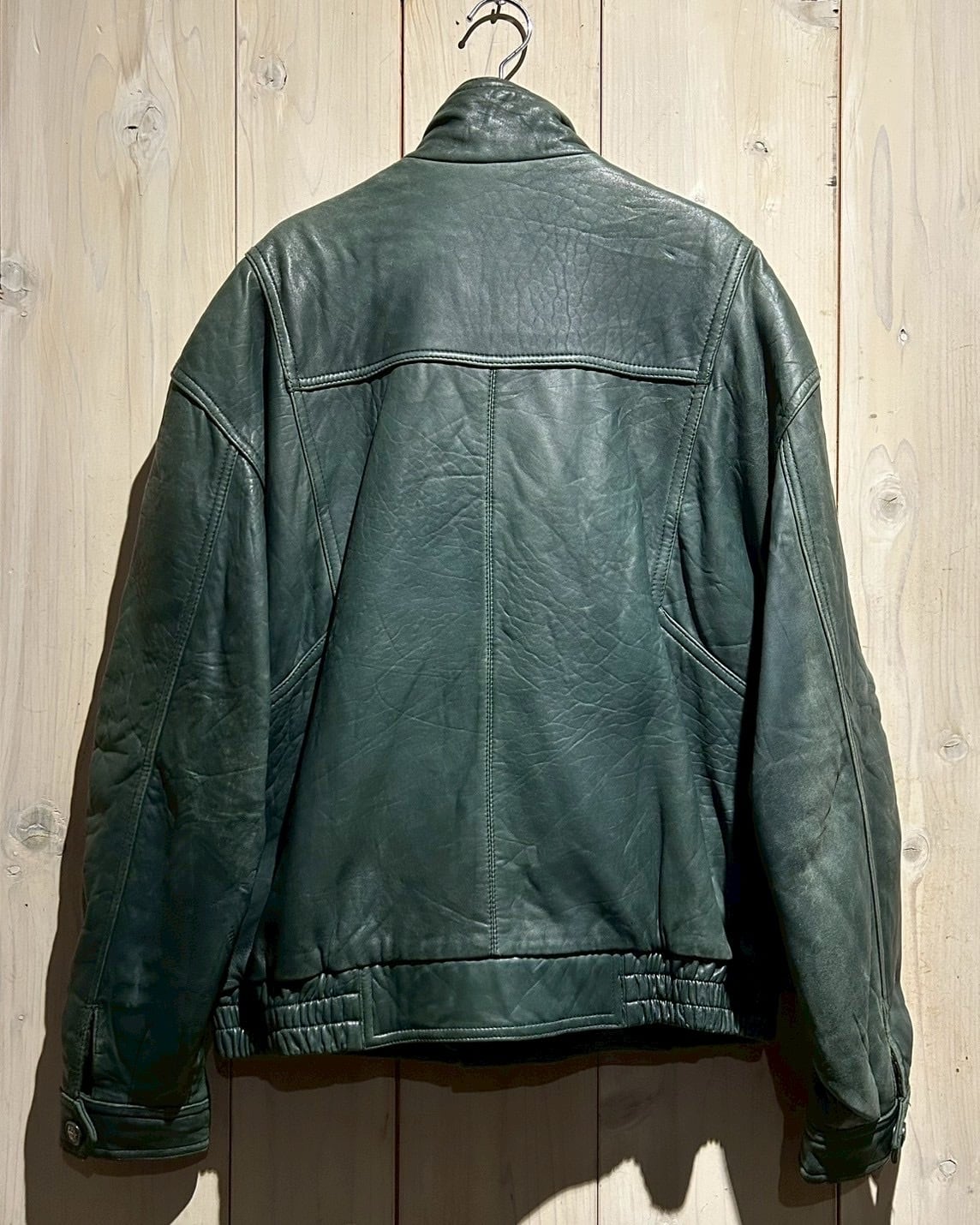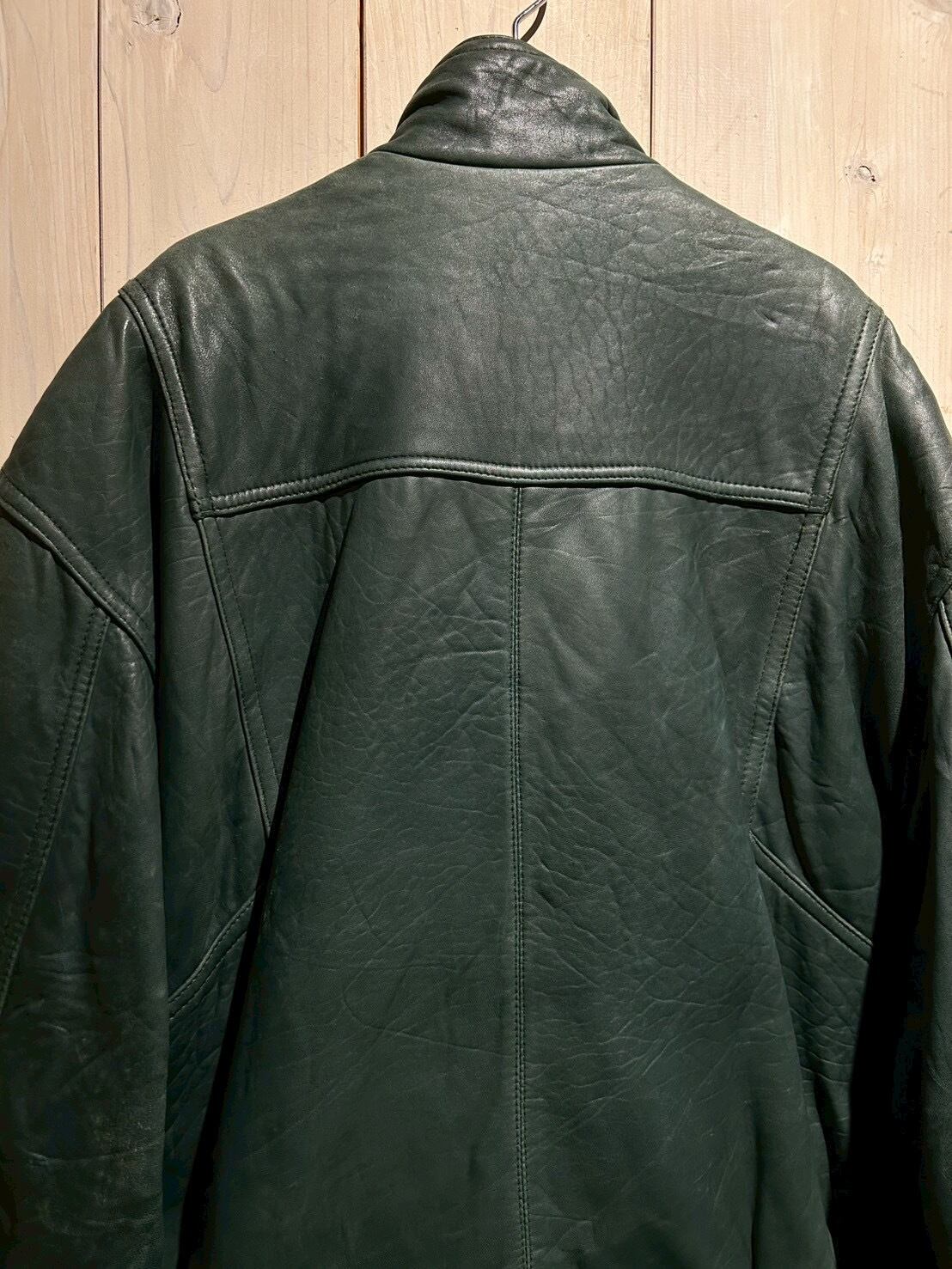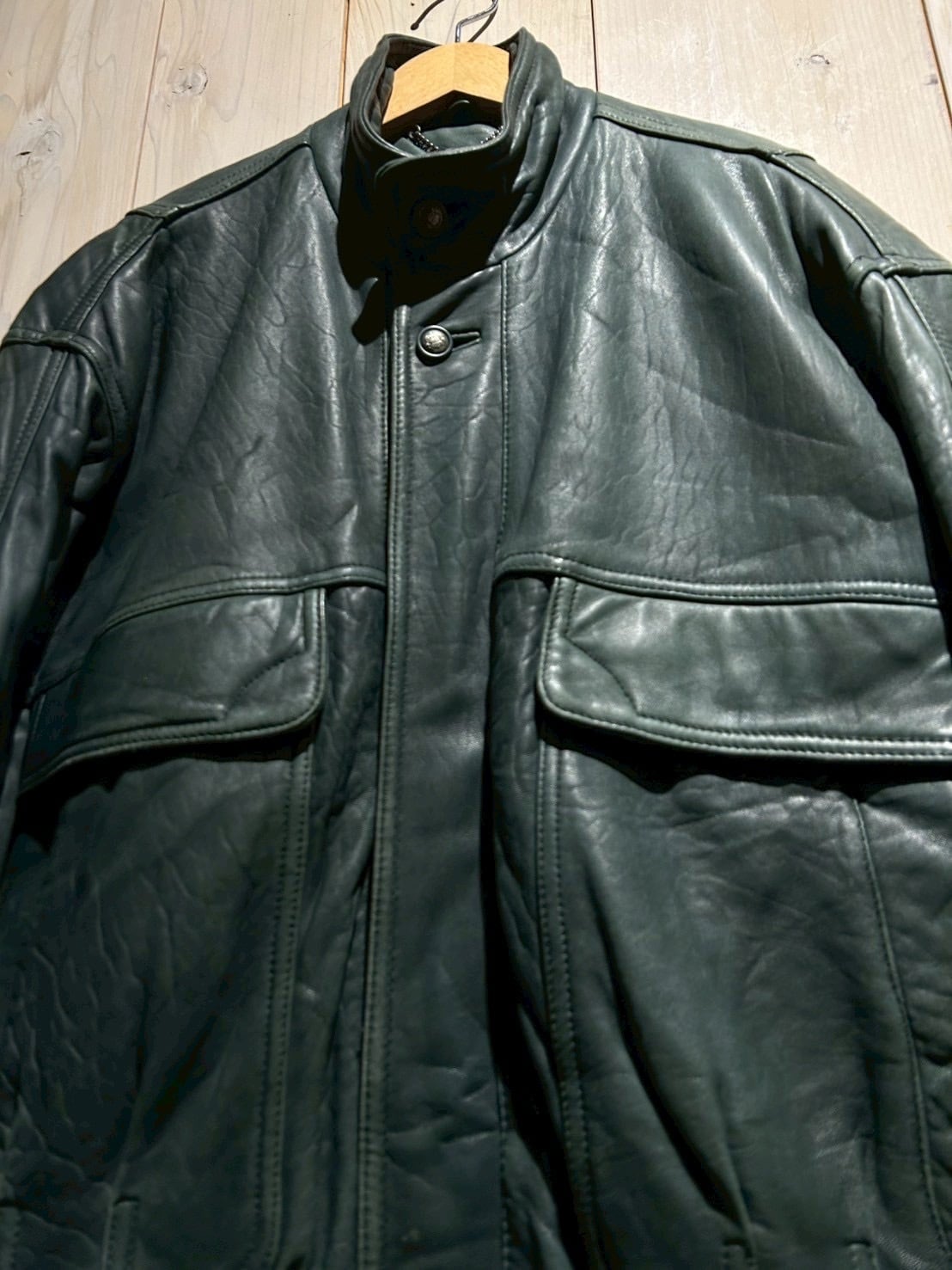 こちらは深みのあるグリーンカラーが印象的なレザージャケット。柔らかくしなやかなレザーを贅沢に使用し、肉厚でありながらも着心地の軽さを感じられる1着。