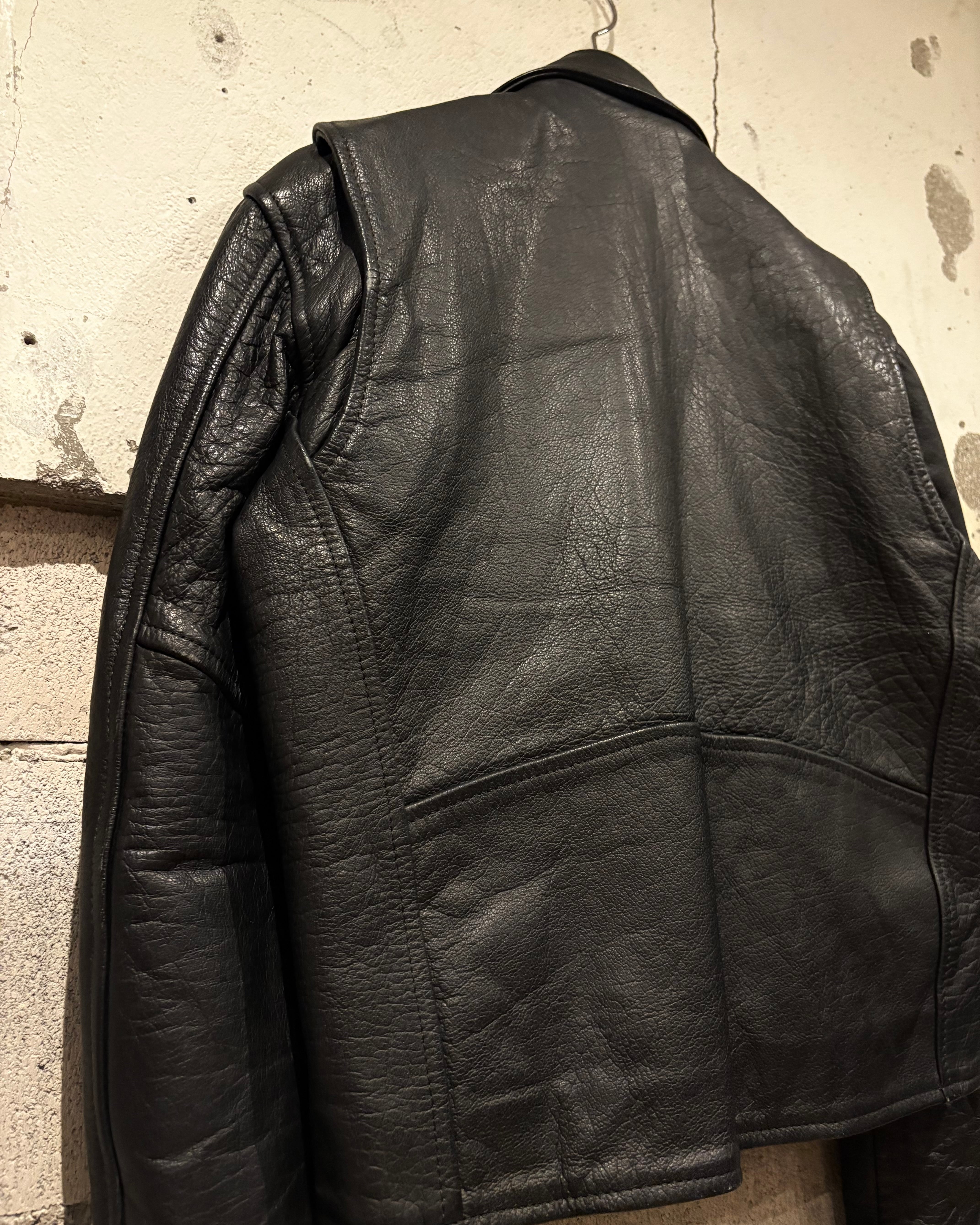 フロントは王道の斜めジップを採用したダブルライダース仕様。3つのジップポケットとスナップ付きフラップポケットを備え、実用性も抜群。さらにウエストベルトが配されており、シルエットの調整やスタイリングにアクセントを加えることが可能です。肩のエポレット、ジップカフ、そしてメタルパーツの存在感が全体に重厚な雰囲気を与え、シンプルながらもディテールで語れる仕上がりになっています。