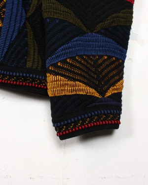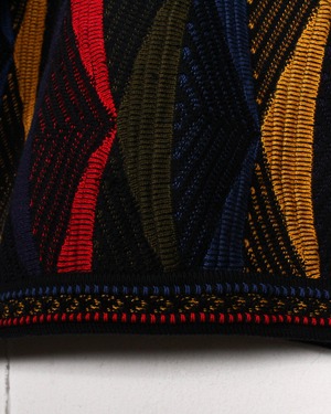 ブラックをベースに、レッド、イエロー、ブルー、オリーブなどを大胆に組み合わせた幾何学的なパターンは、スタイリングの主役として抜群のインパクトを発揮。糸の凹凸によって浮かび上がる立体感は、他のニットでは味わえない奥行きのある表情を作り出しています。