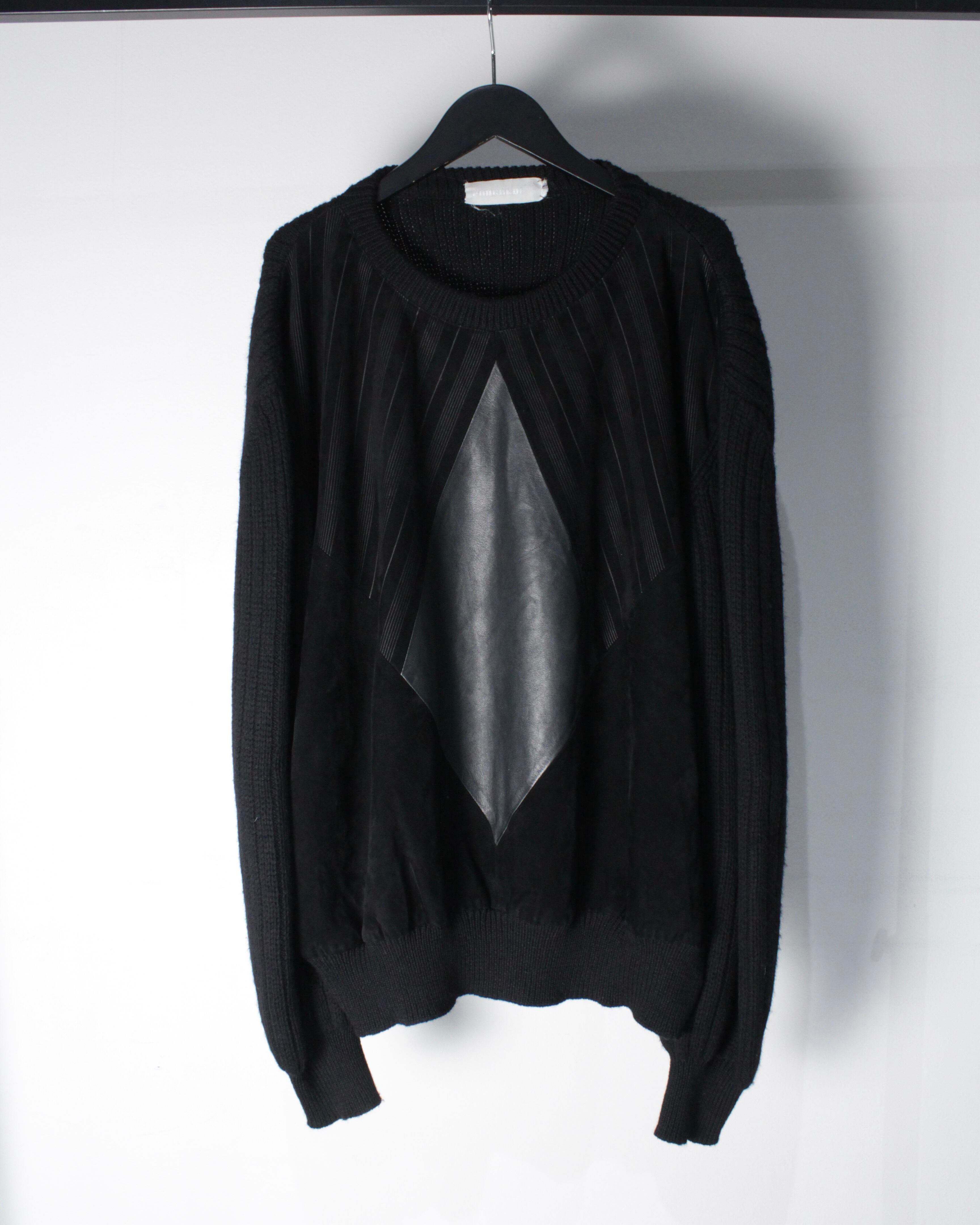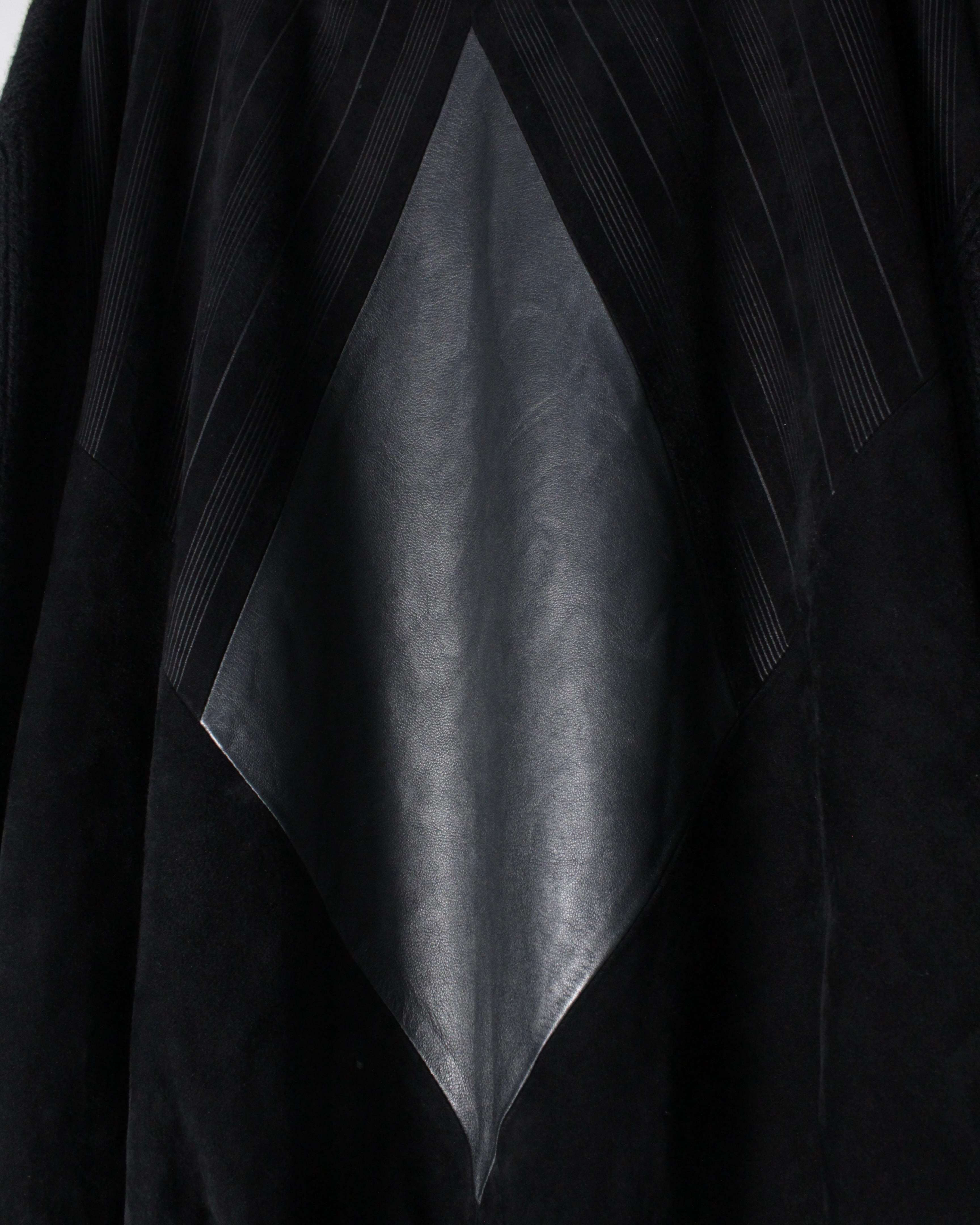 胸元に配置されたダイヤモンド型のスムースレザーが強いインパクトを放ち、周囲を囲むスエードの落ち着いた質感とのコントラストが奥行きある表情を生み出しています。