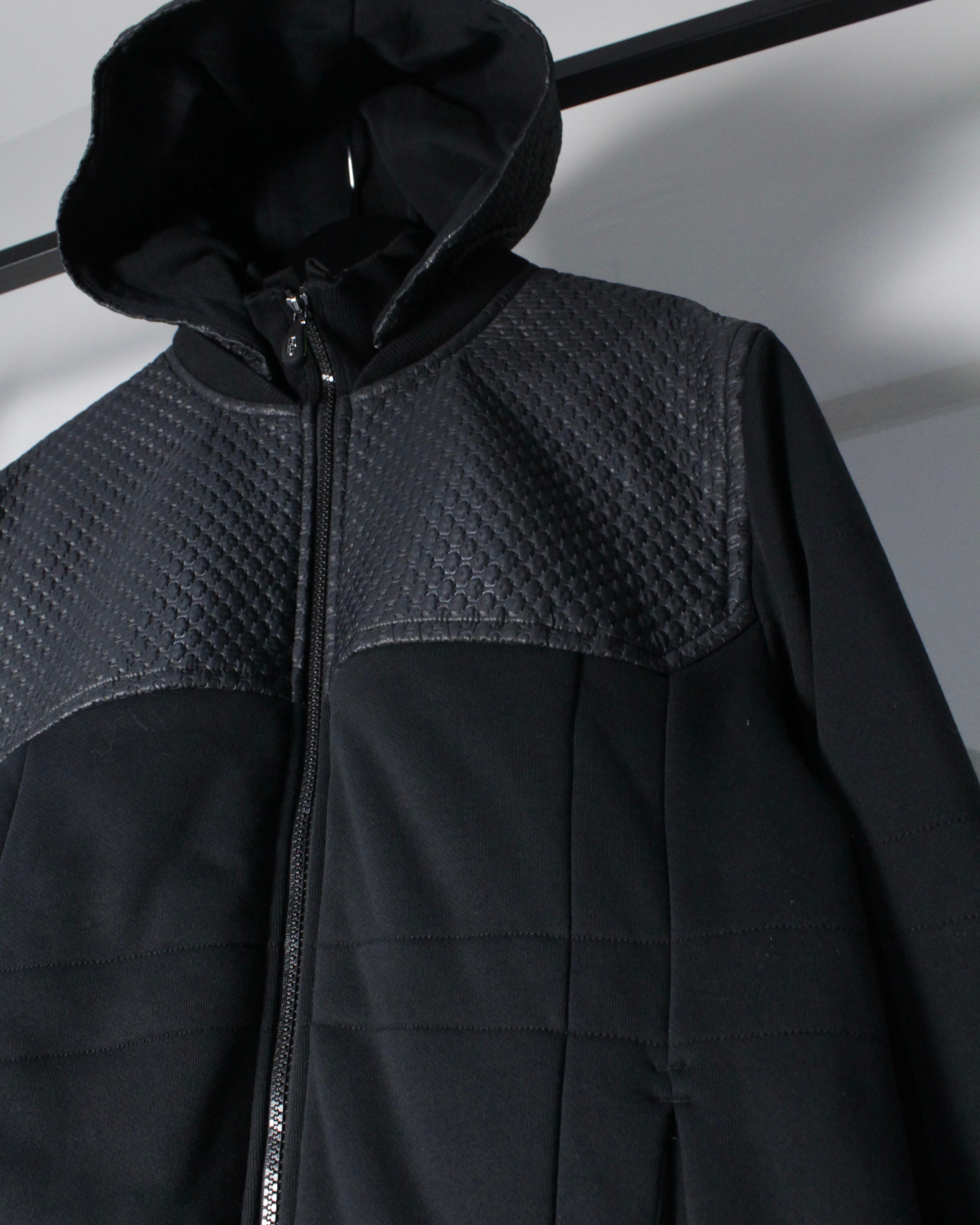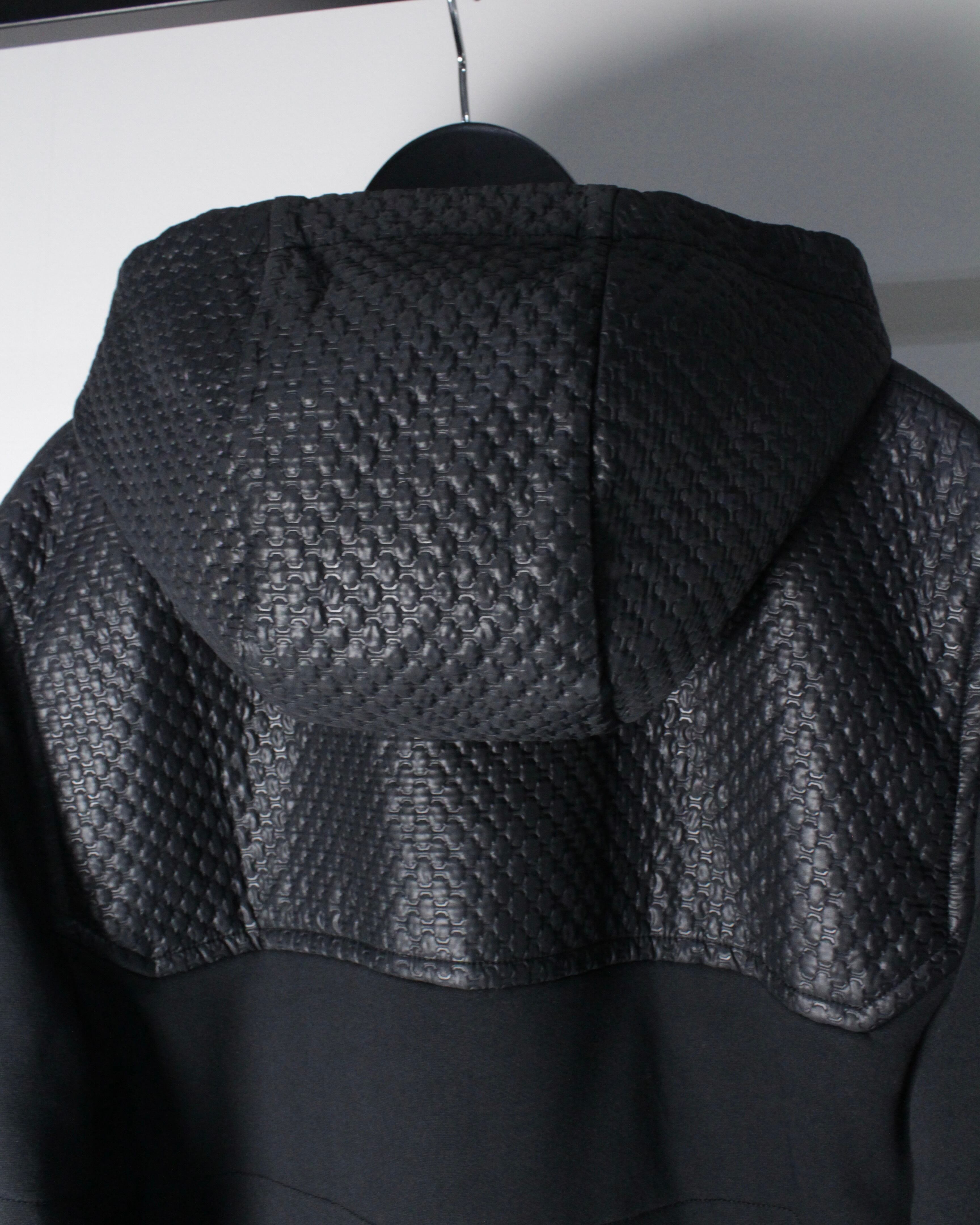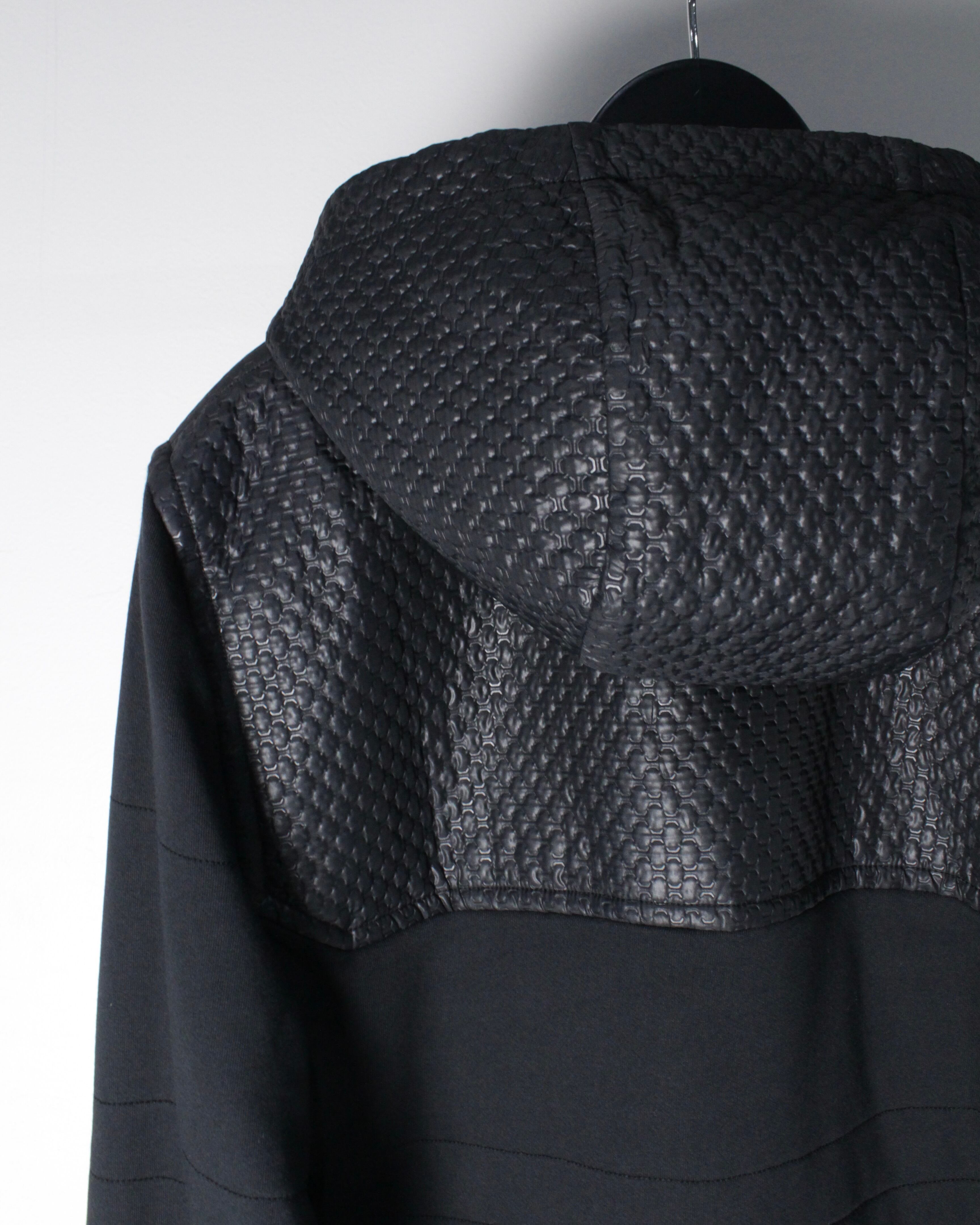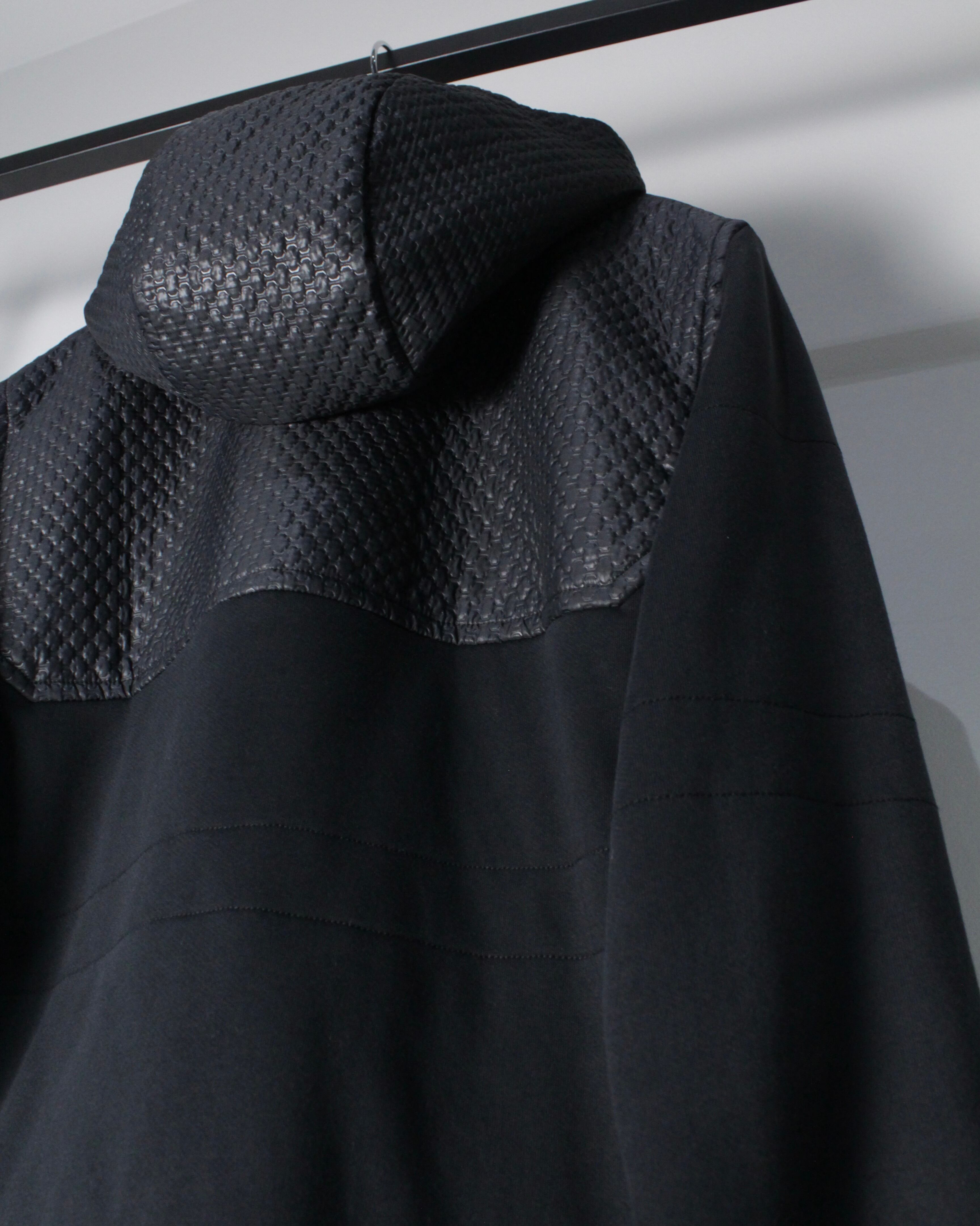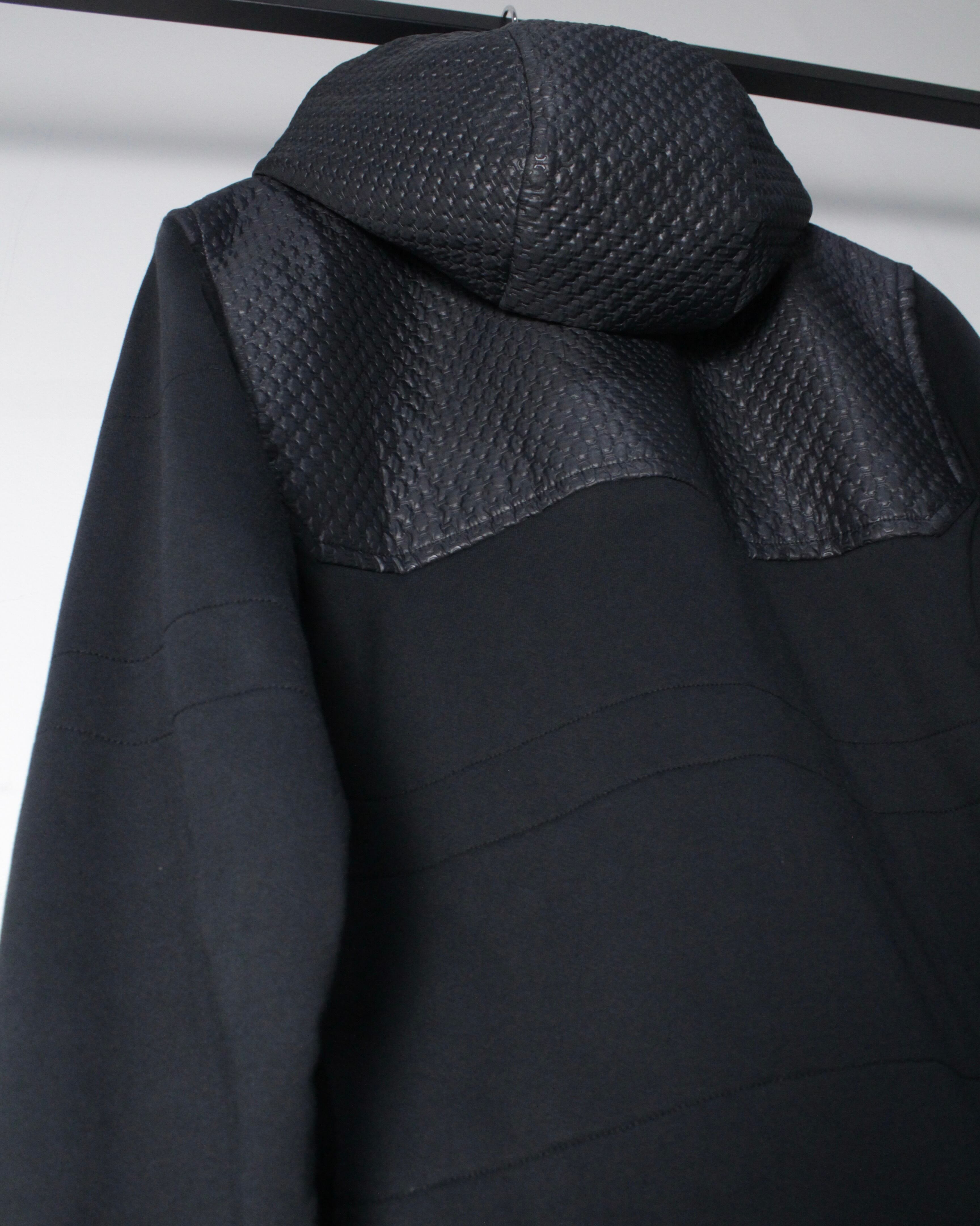 フロントからショルダーにかけてレザー調のキルティング素材が切り替えられた1着。繊細な幾何学的パターンが浮かび上がるように配置され、シンプルなブラックボディに立体感と重厚感をプラス。マットな生地とのコントラストが視覚的に引き締まった印象を与え、スタイリング全体をモードなムードへと引き上げてくれます。