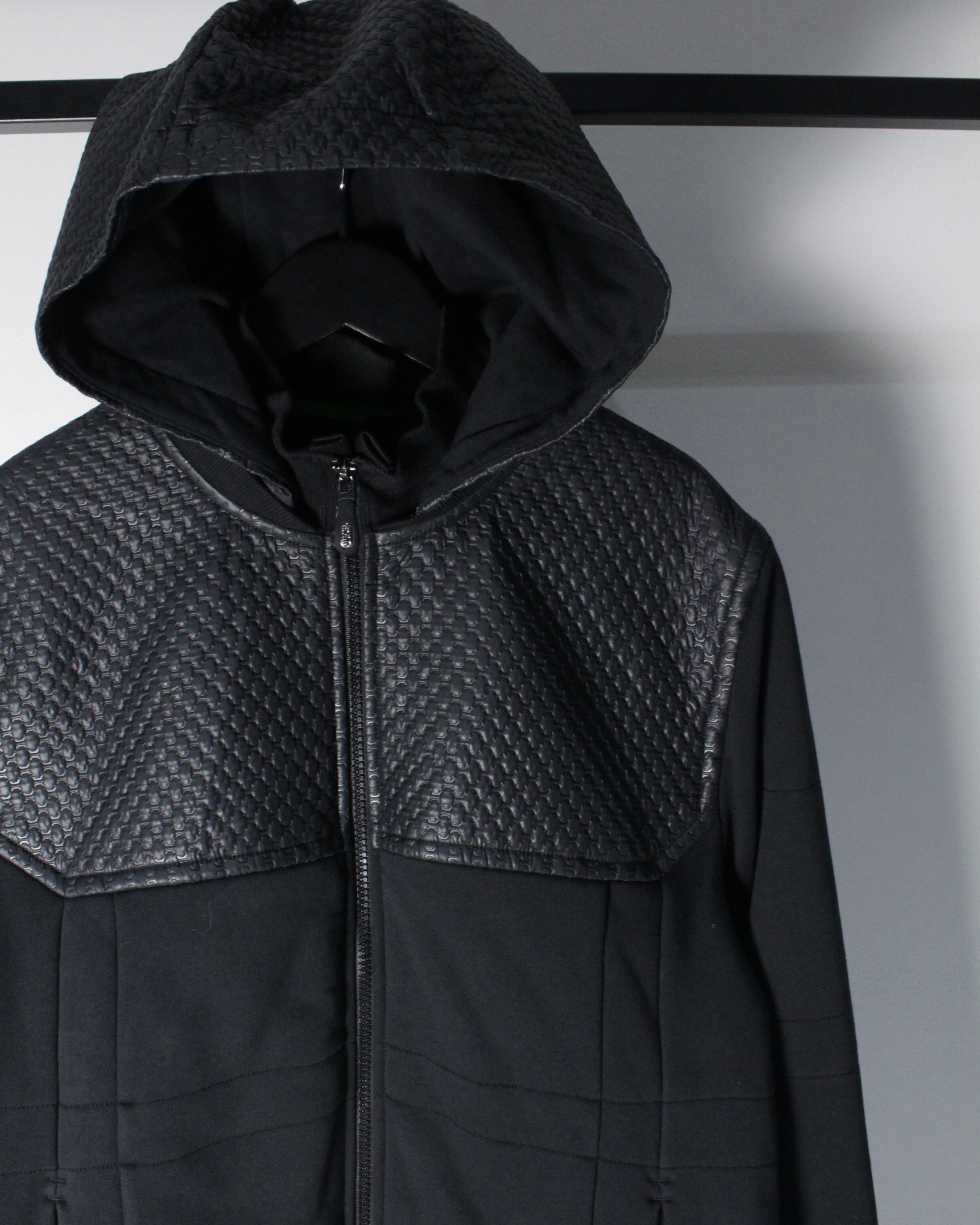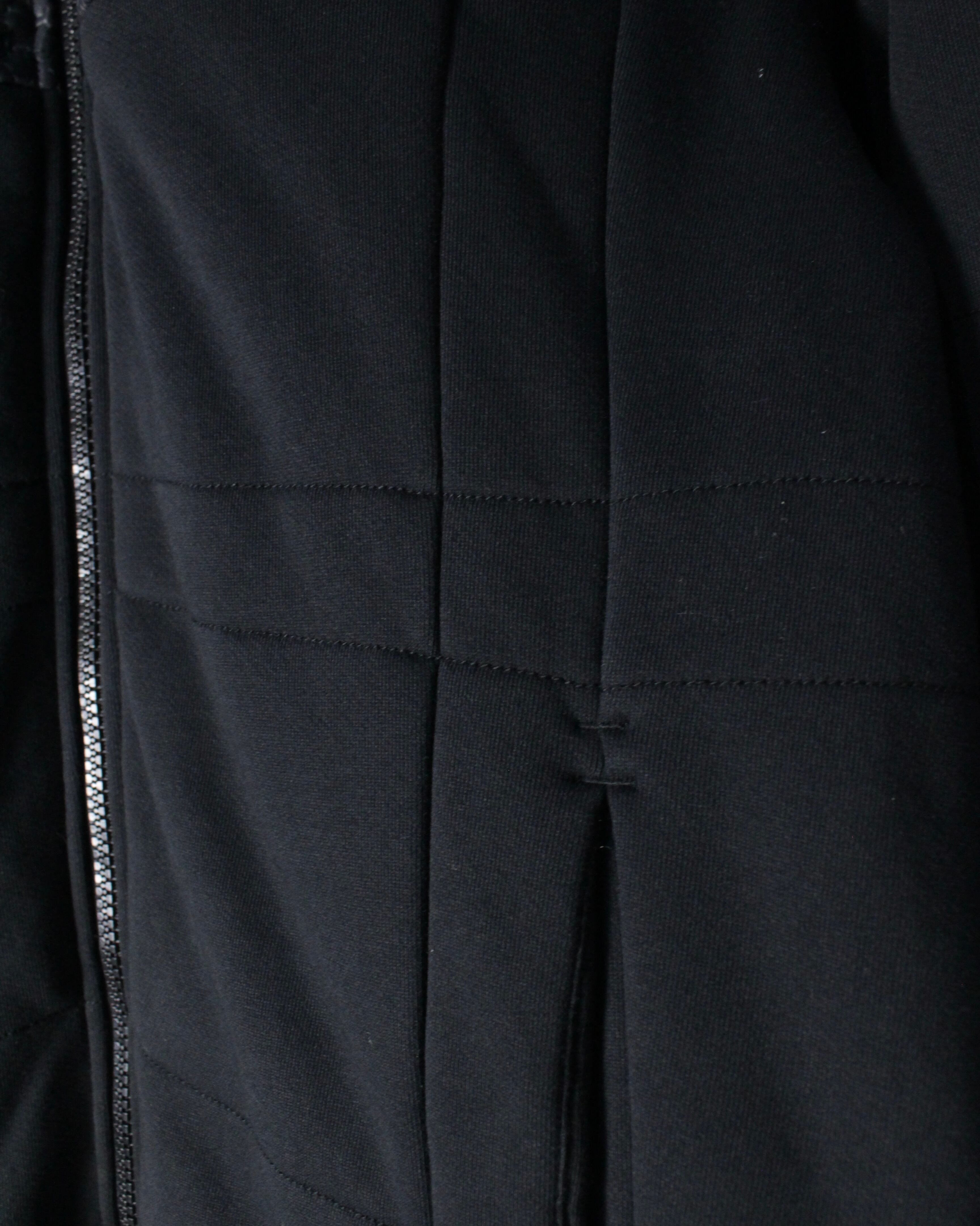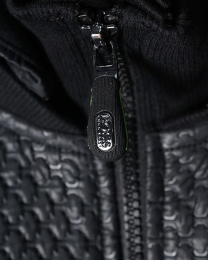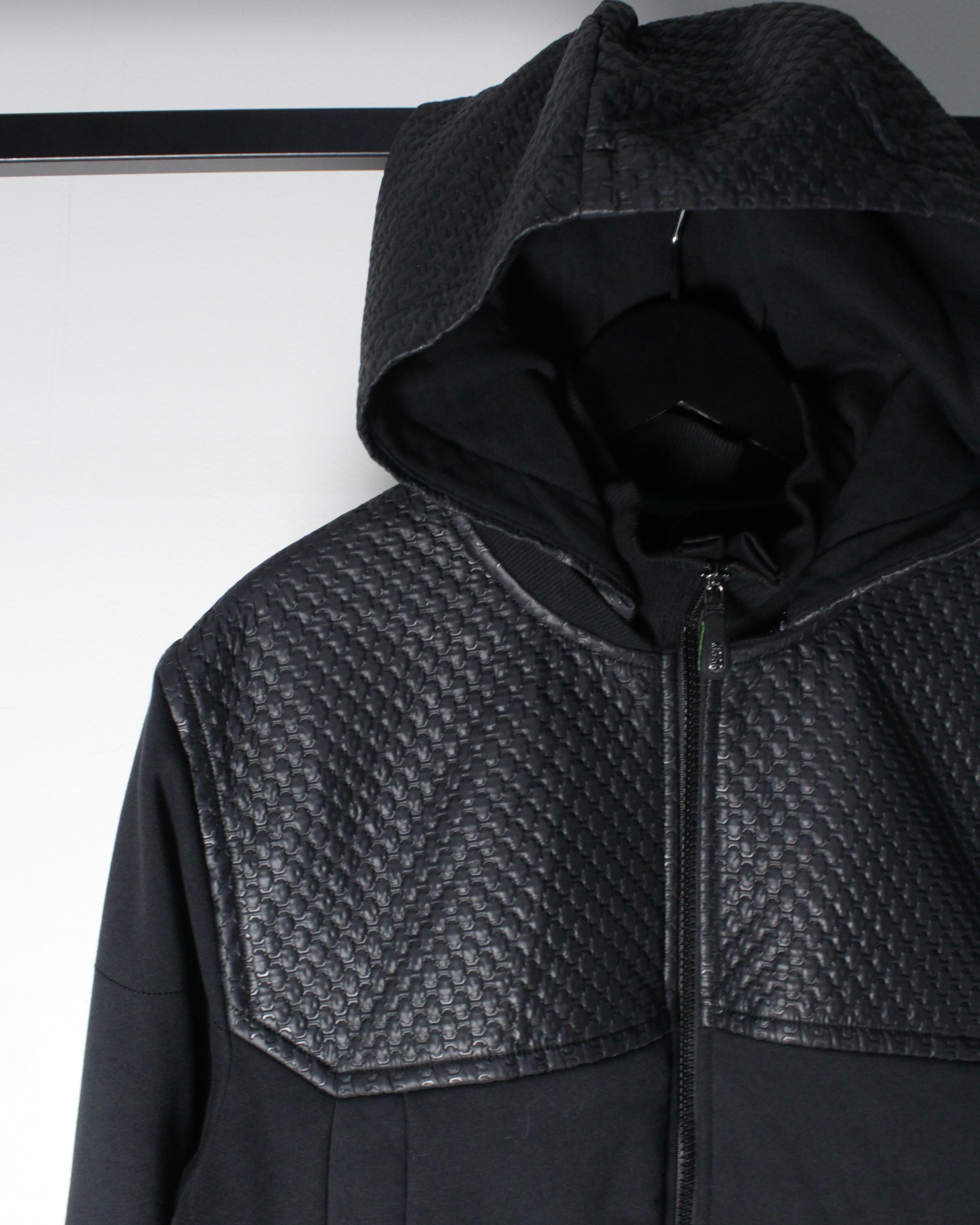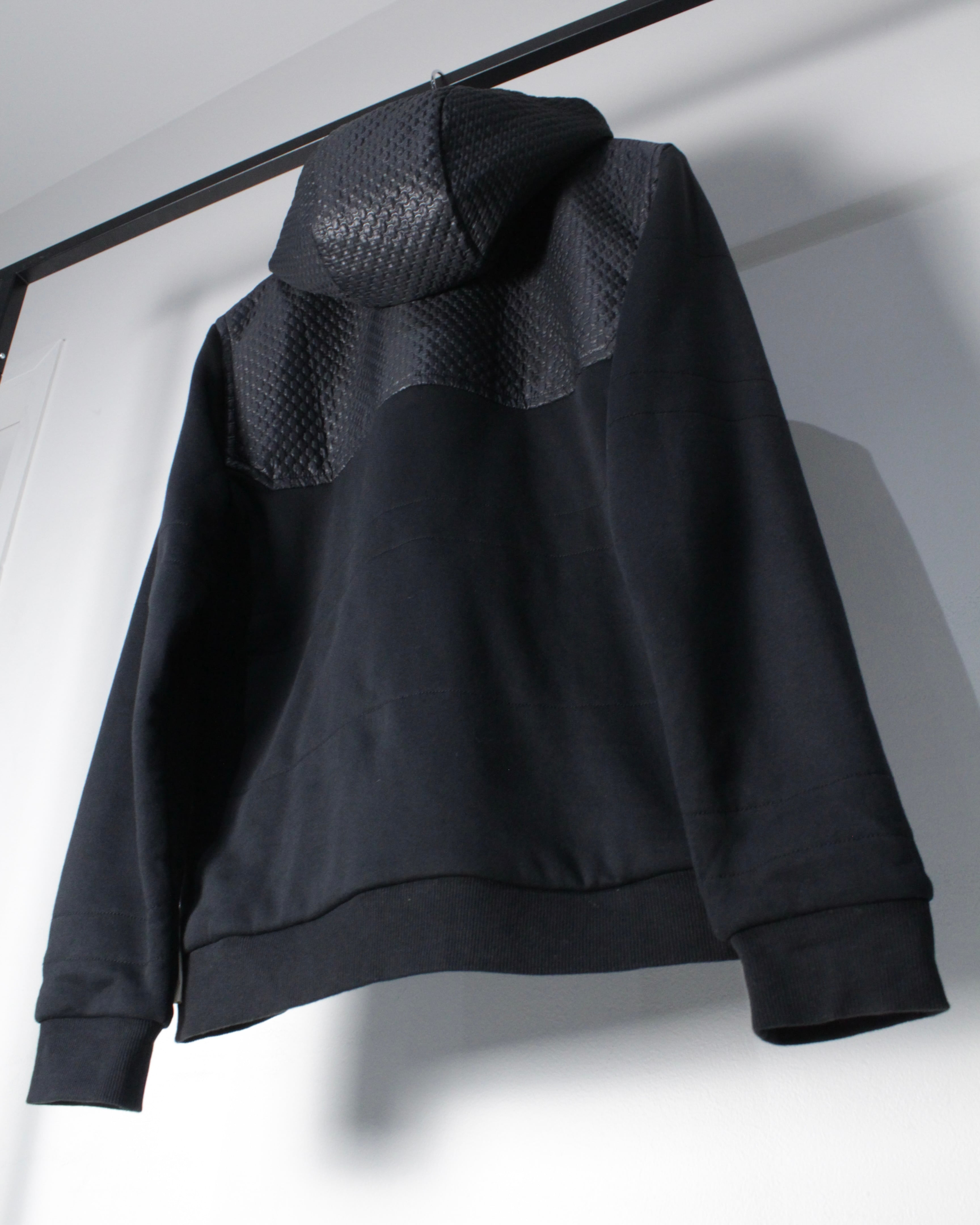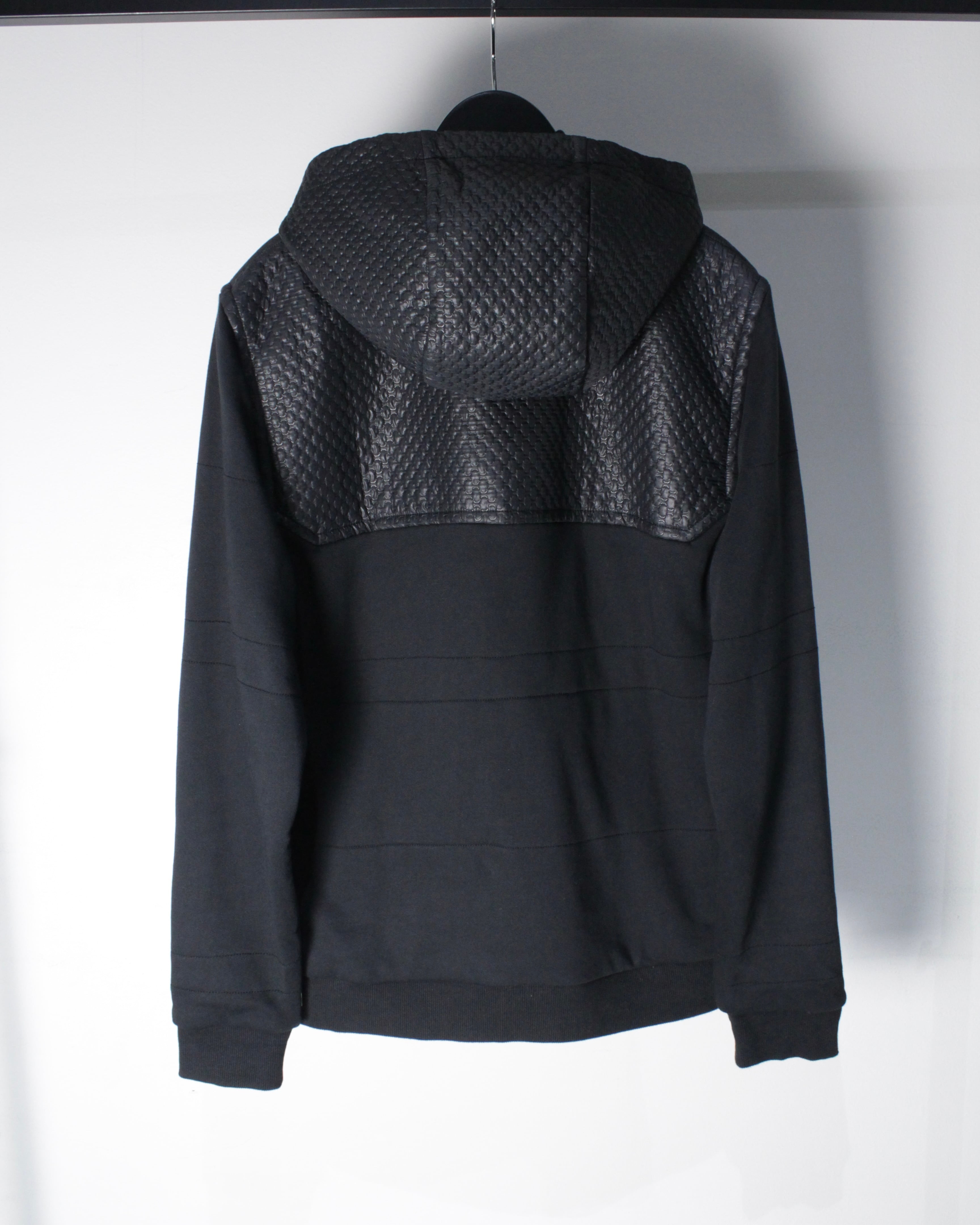 フロントからショルダーにかけてレザー調のキルティング素材が切り替えられた1着。繊細な幾何学的パターンが浮かび上がるように配置され、シンプルなブラックボディに立体感と重厚感をプラス。マットな生地とのコントラストが視覚的に引き締まった印象を与え、スタイリング全体をモードなムードへと引き上げてくれます。