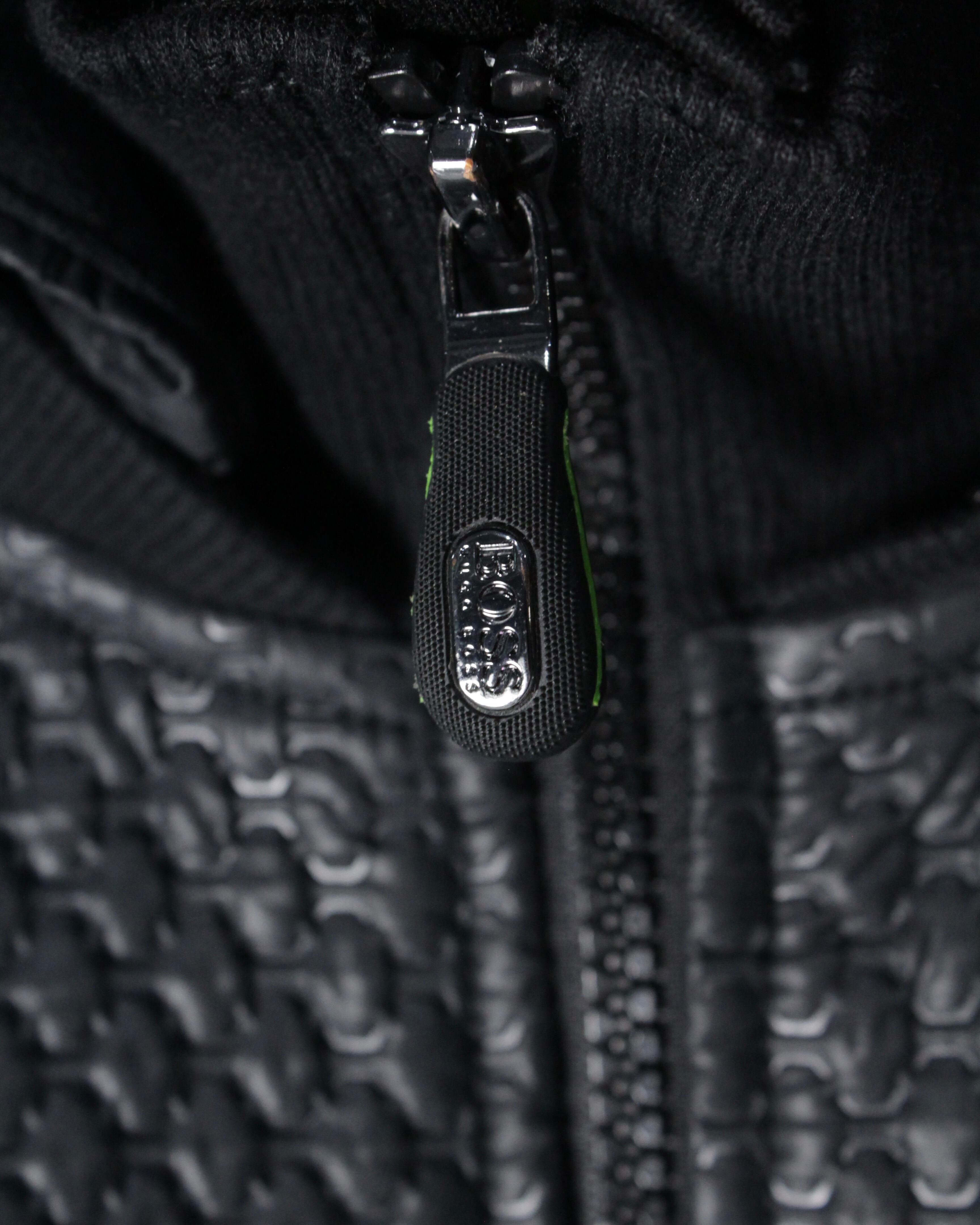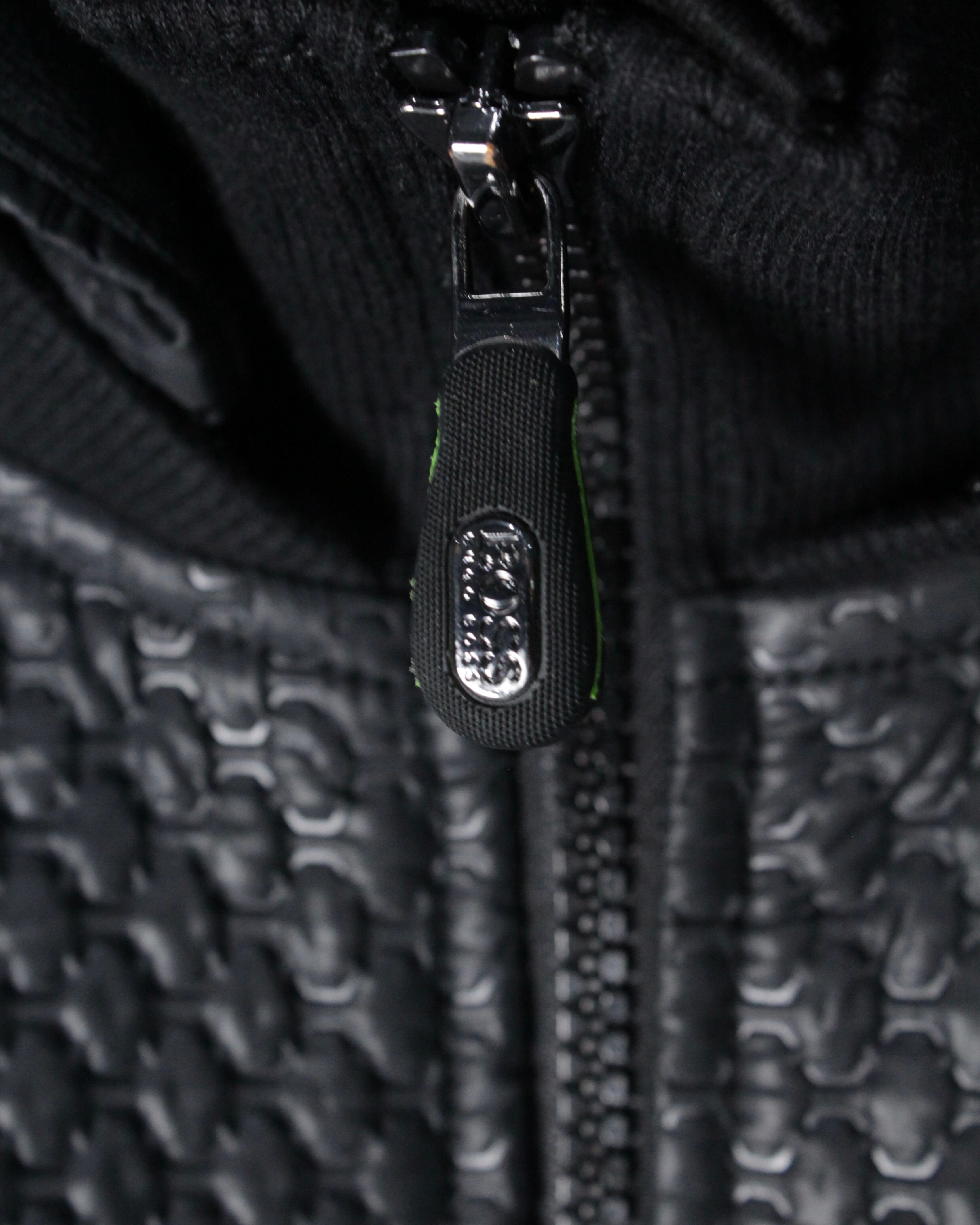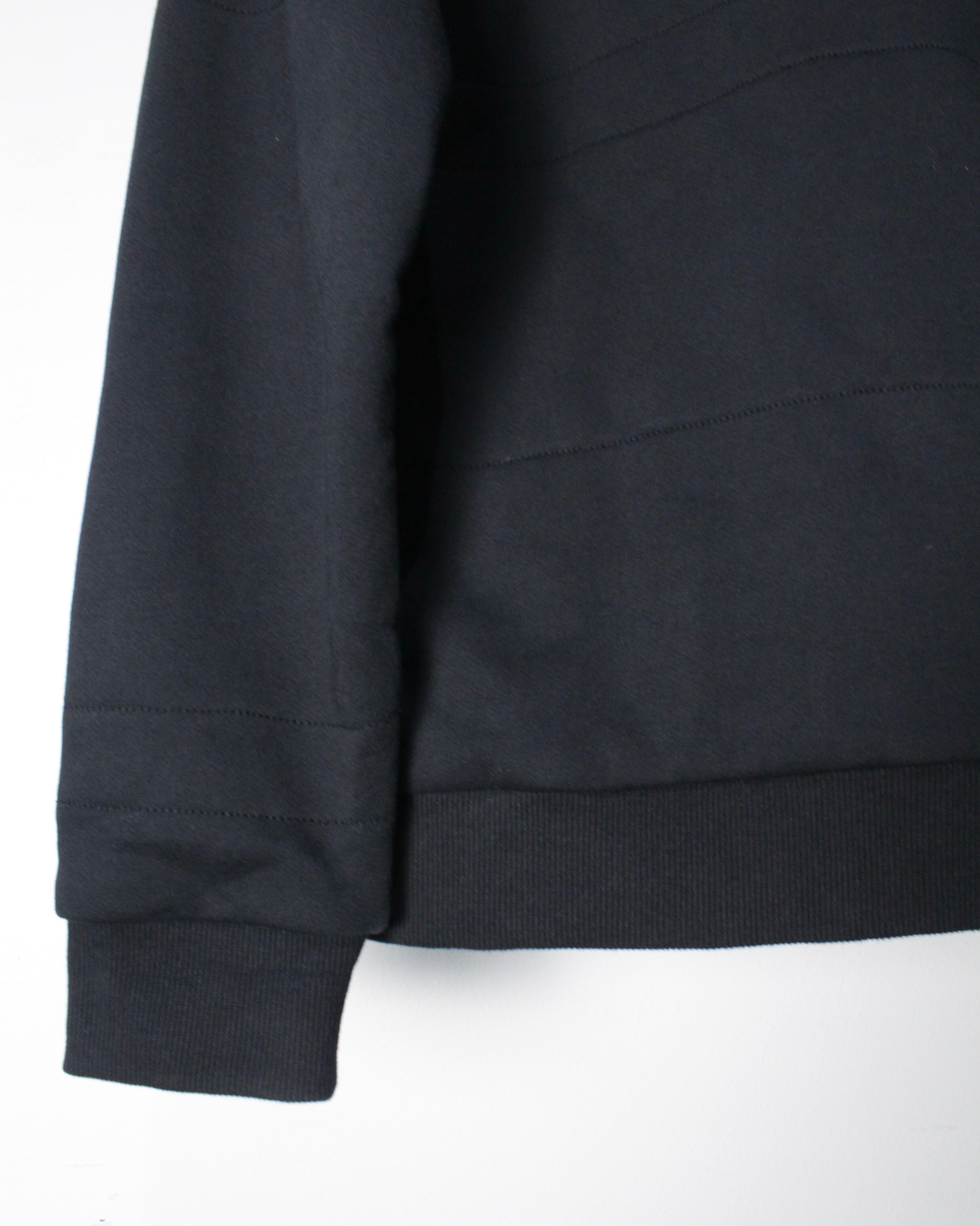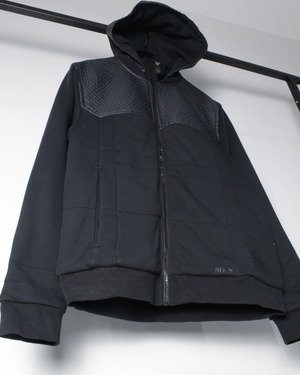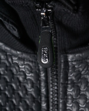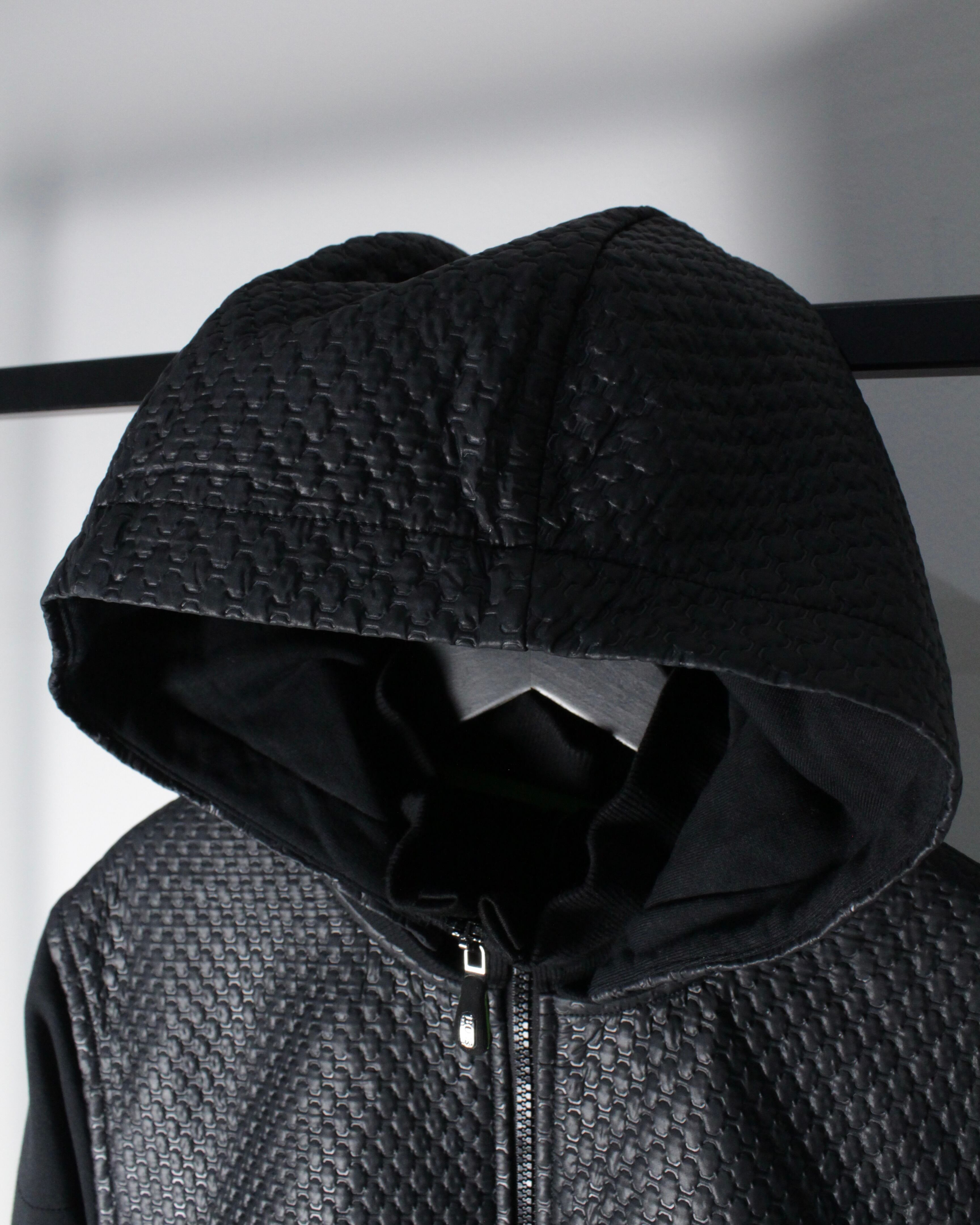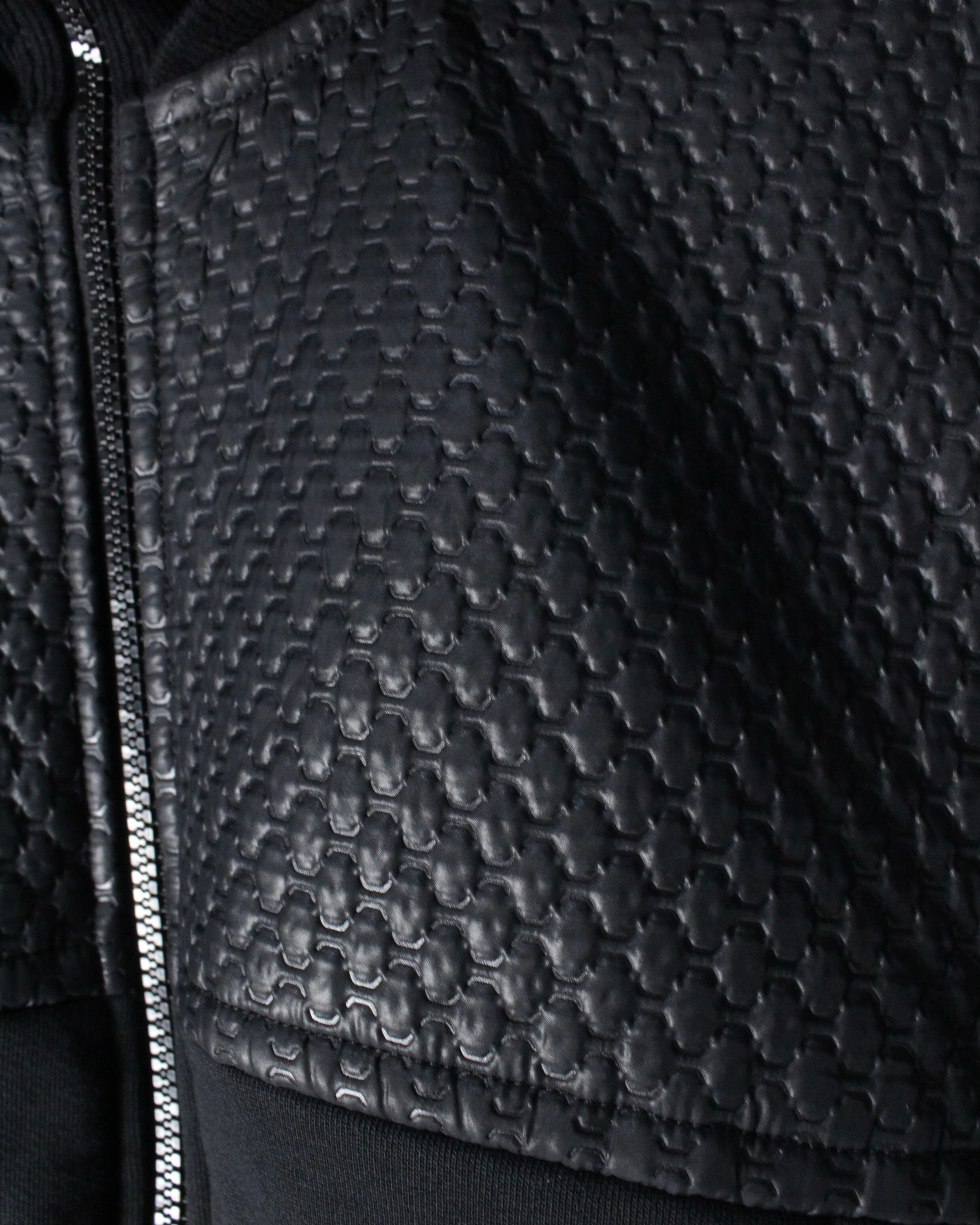 フロントからショルダーにかけてレザー調のキルティング素材が切り替えられた1着。繊細な幾何学的パターンが浮かび上がるように配置され、シンプルなブラックボディに立体感と重厚感をプラス。マットな生地とのコントラストが視覚的に引き締まった印象を与え、スタイリング全体をモードなムードへと引き上げてくれます。