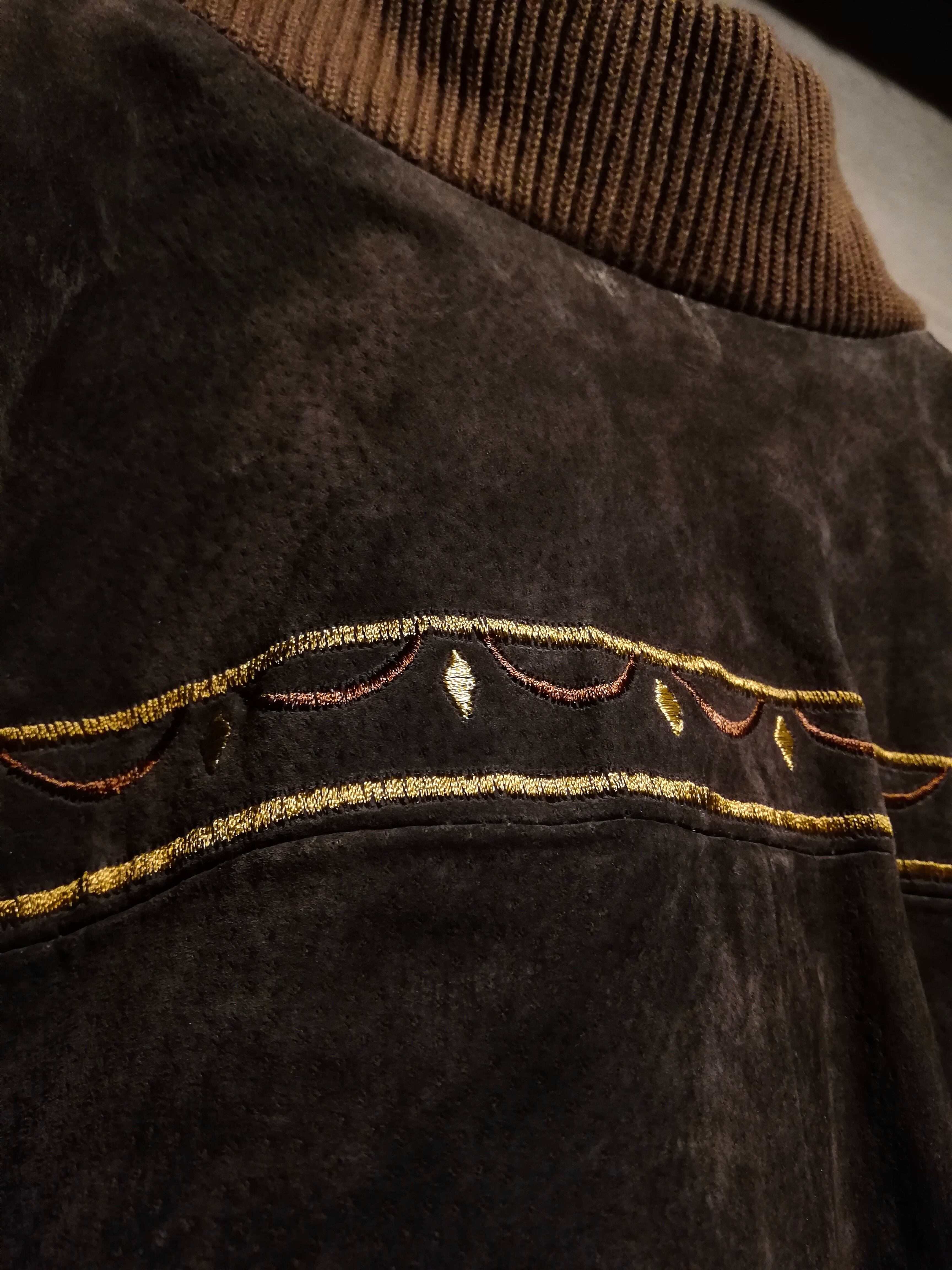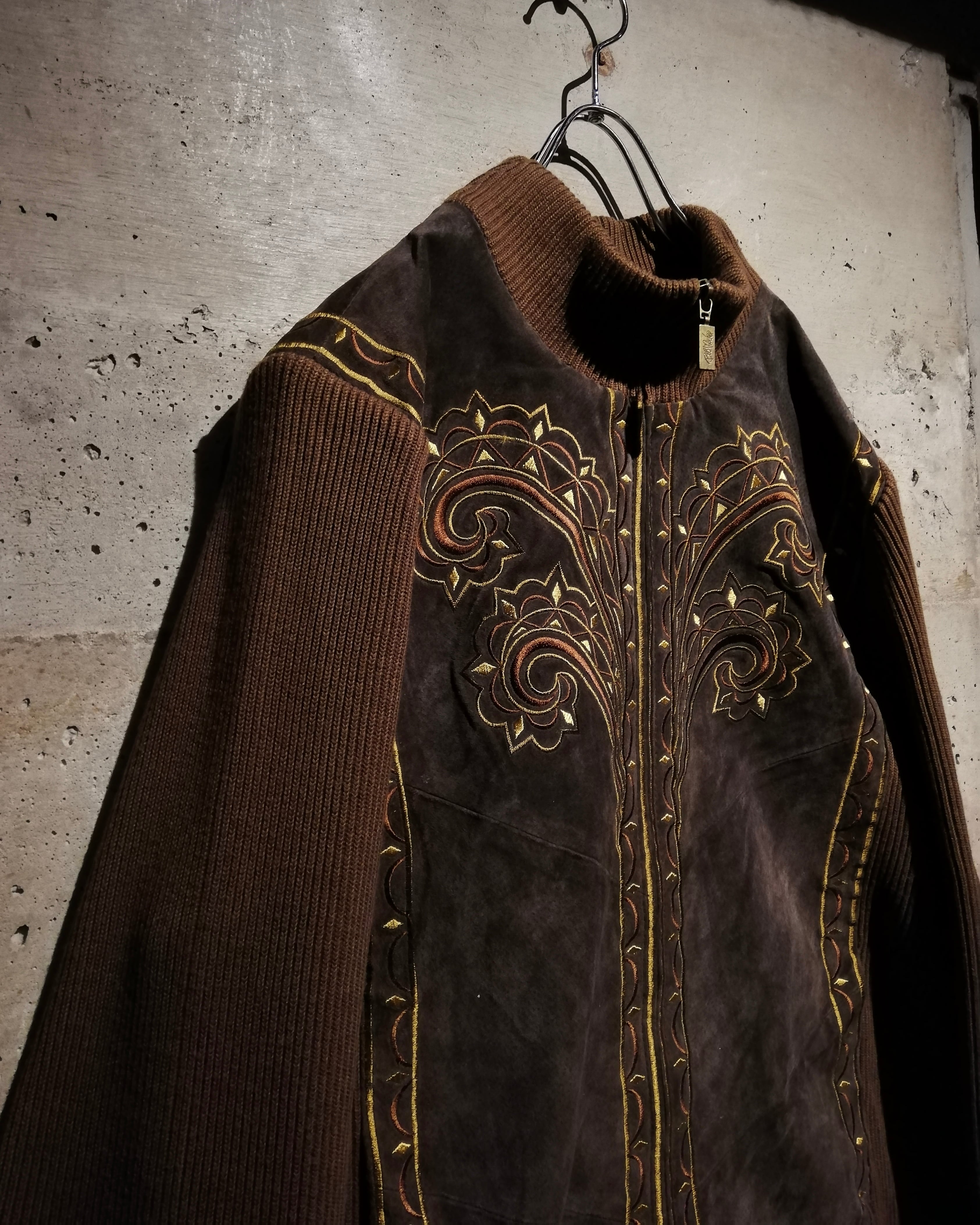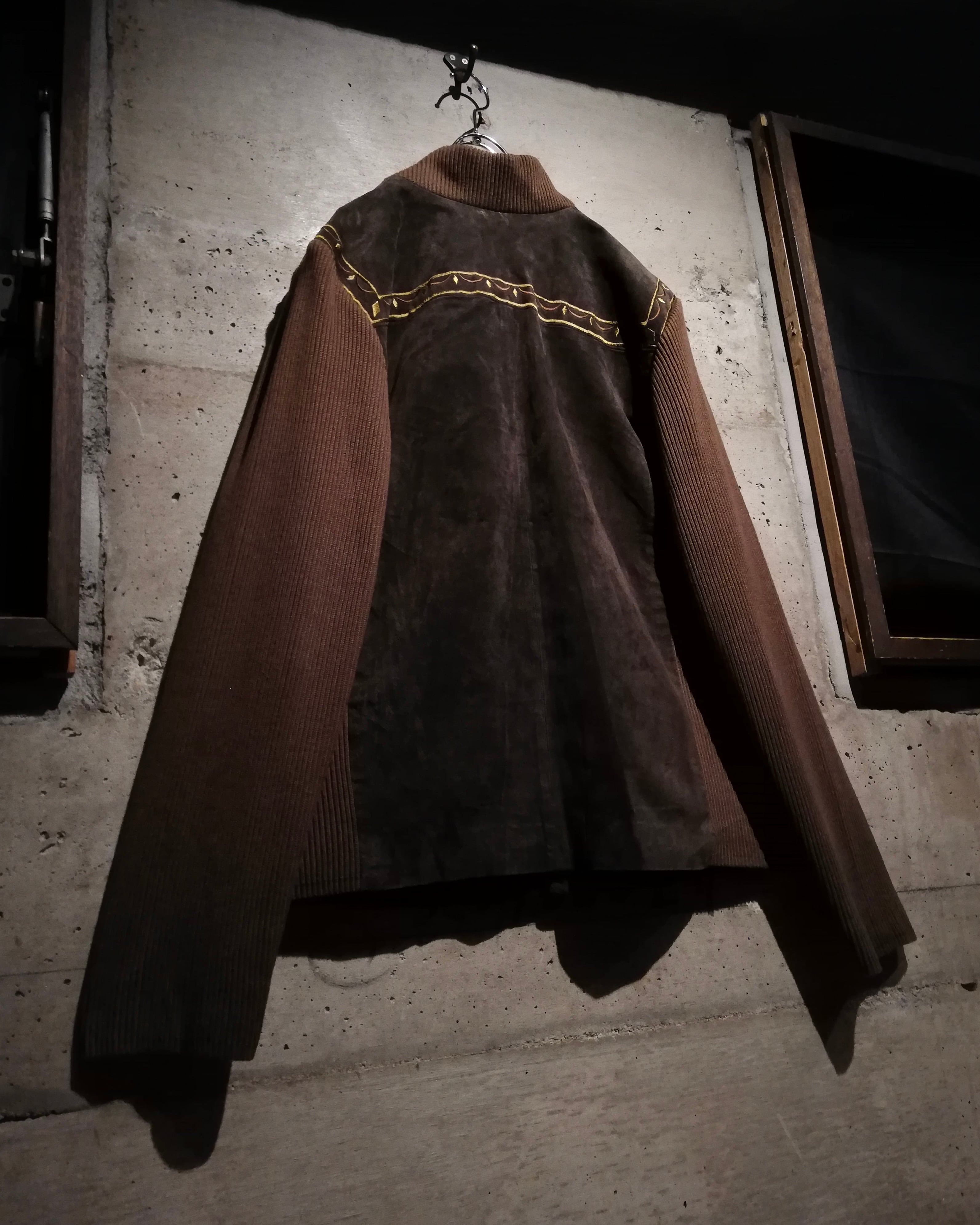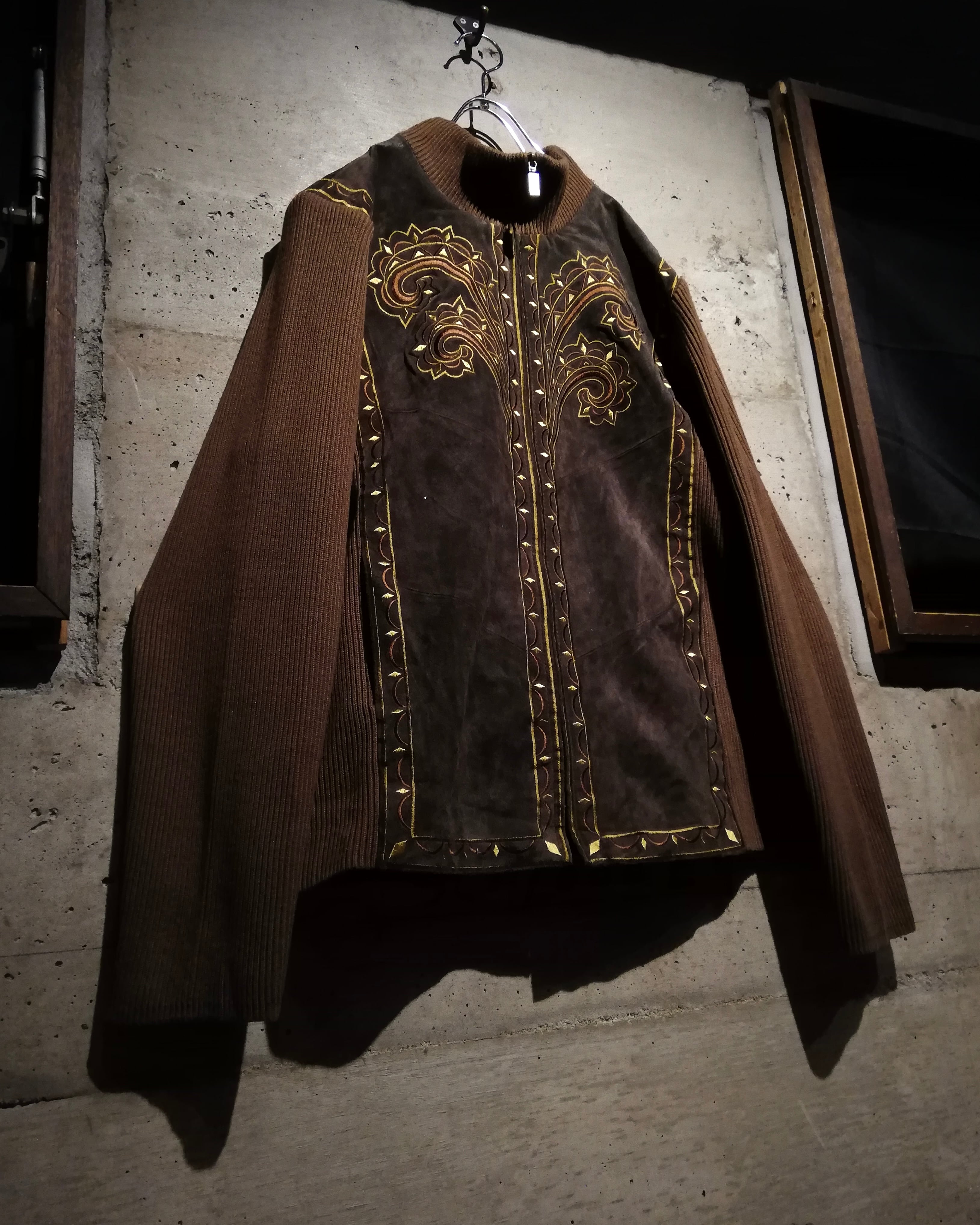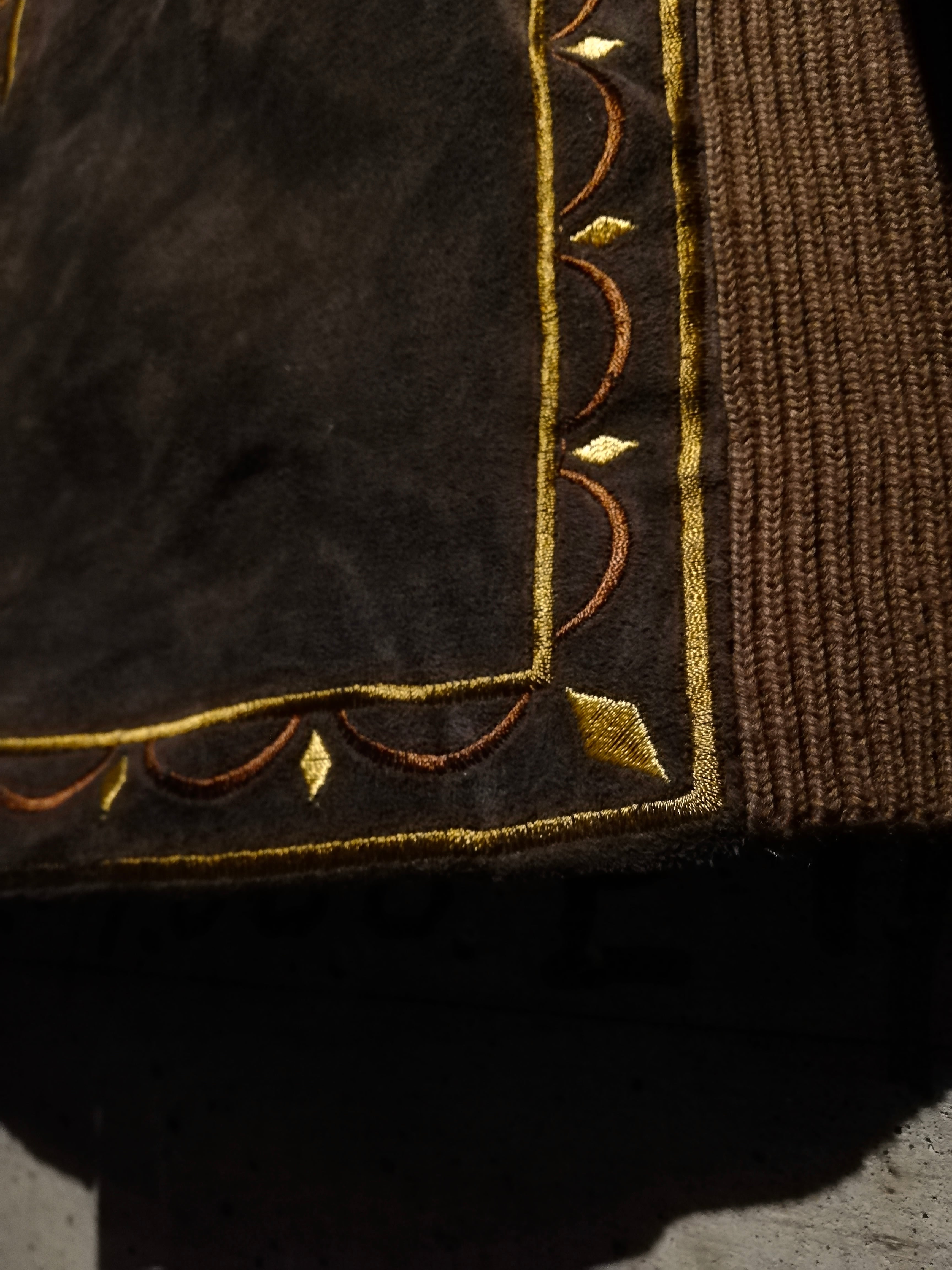 伸縮性の高いブラウンのリブニットをベースに、前背面にボディと同色の張りとコシの美しいピッグスウェードレザーを切り替え。その上からこのブランドならではの繊細かつアーティスティックなフレーバーを漂わせる刺繍を刻み込んだドライバーズニットジャケット。