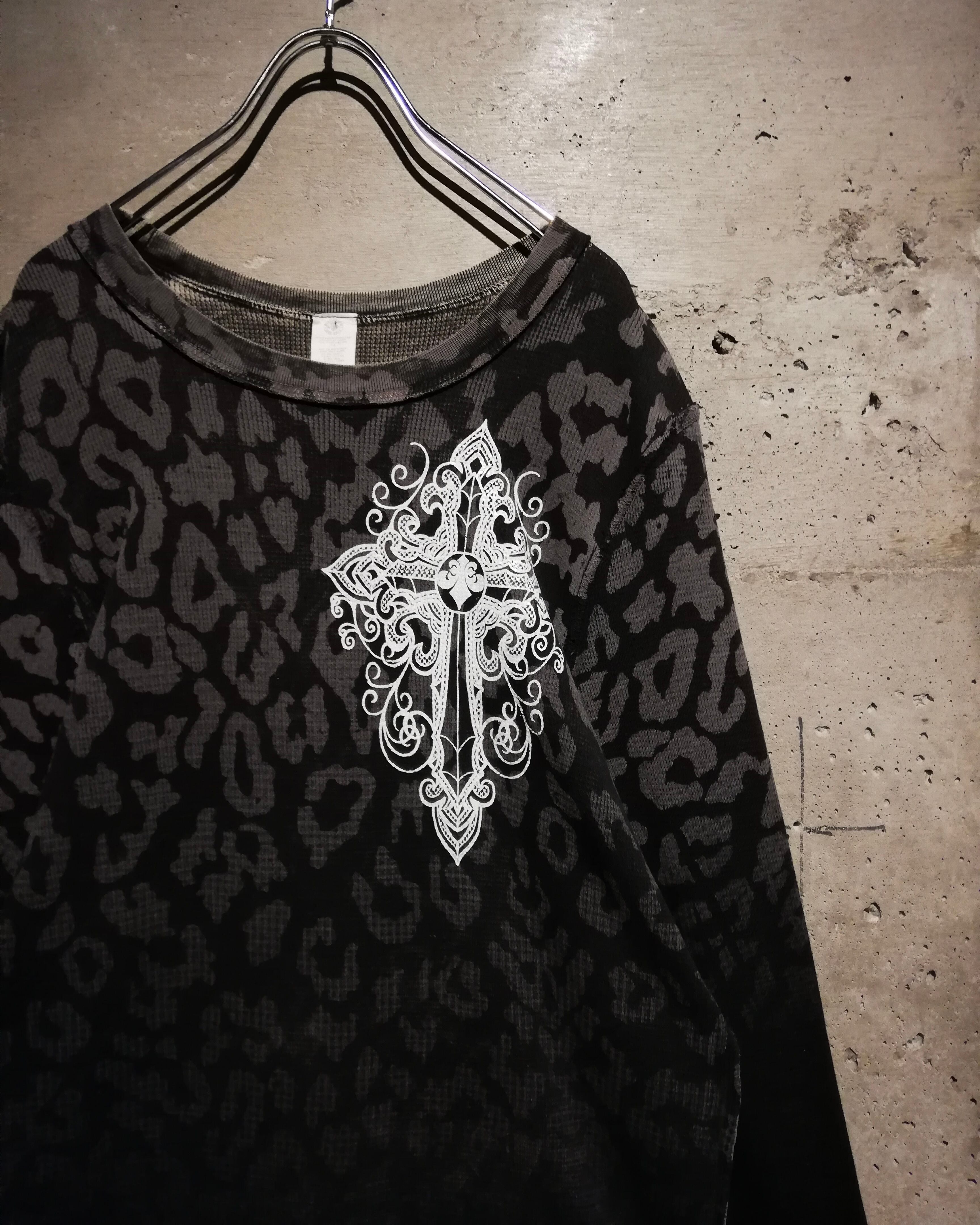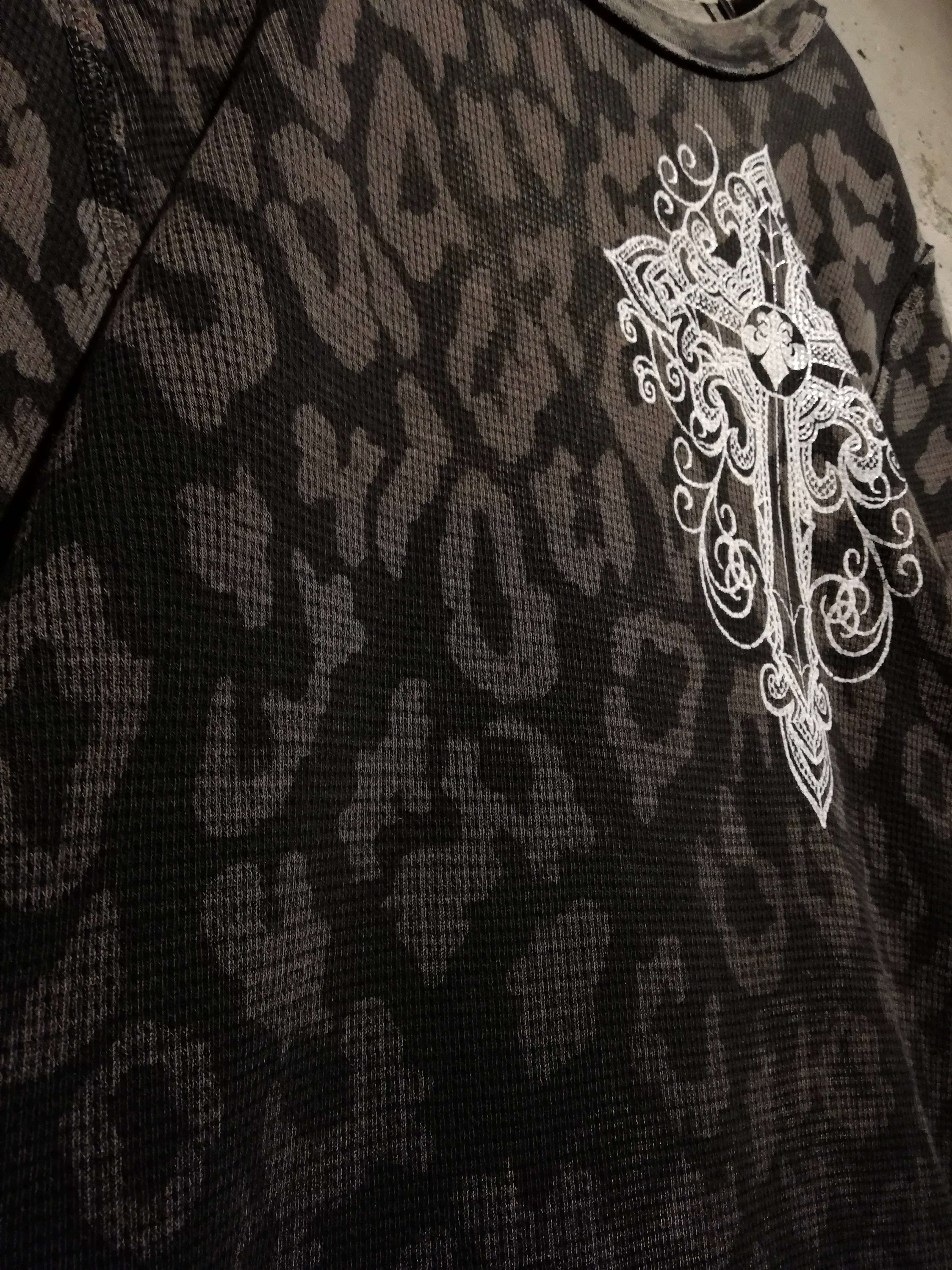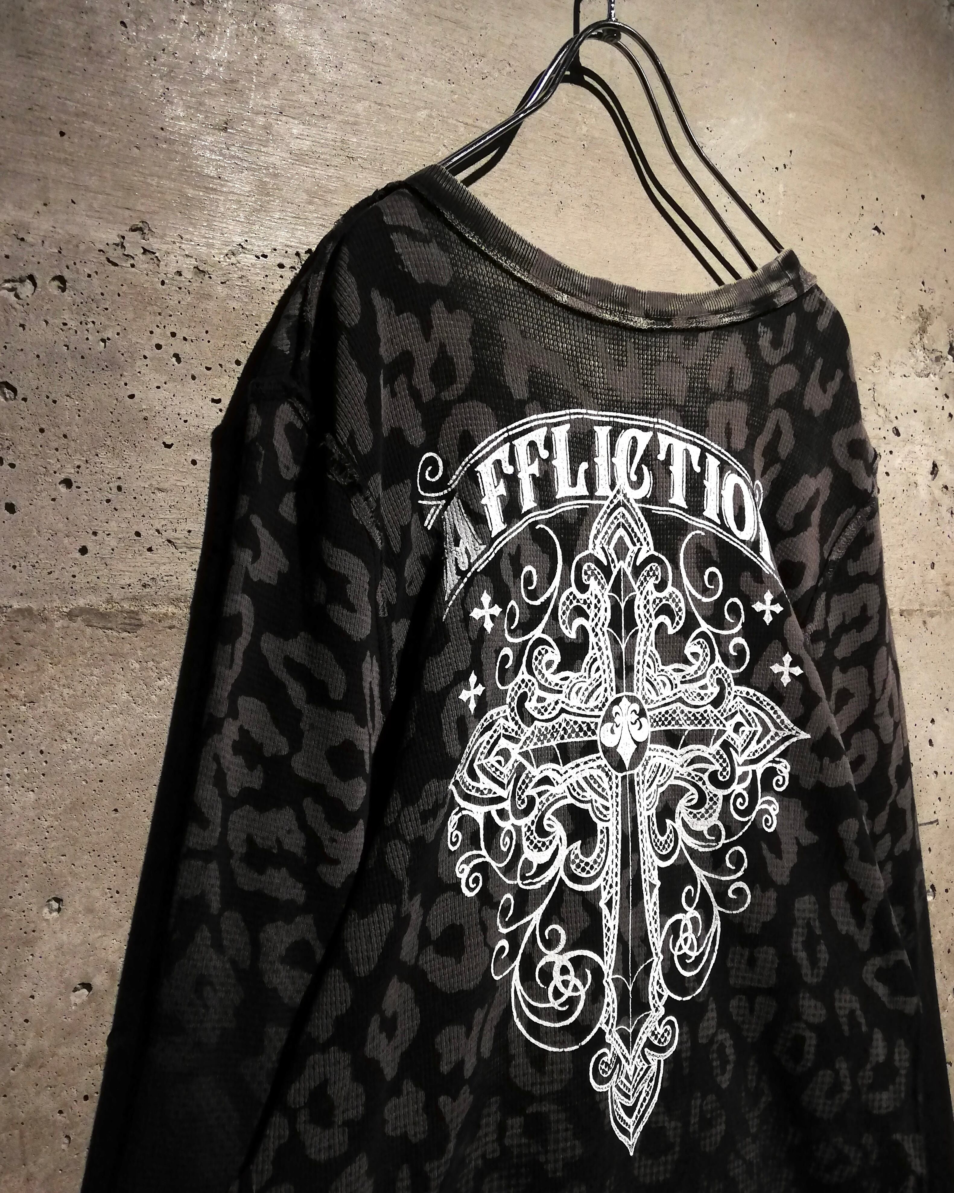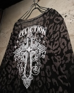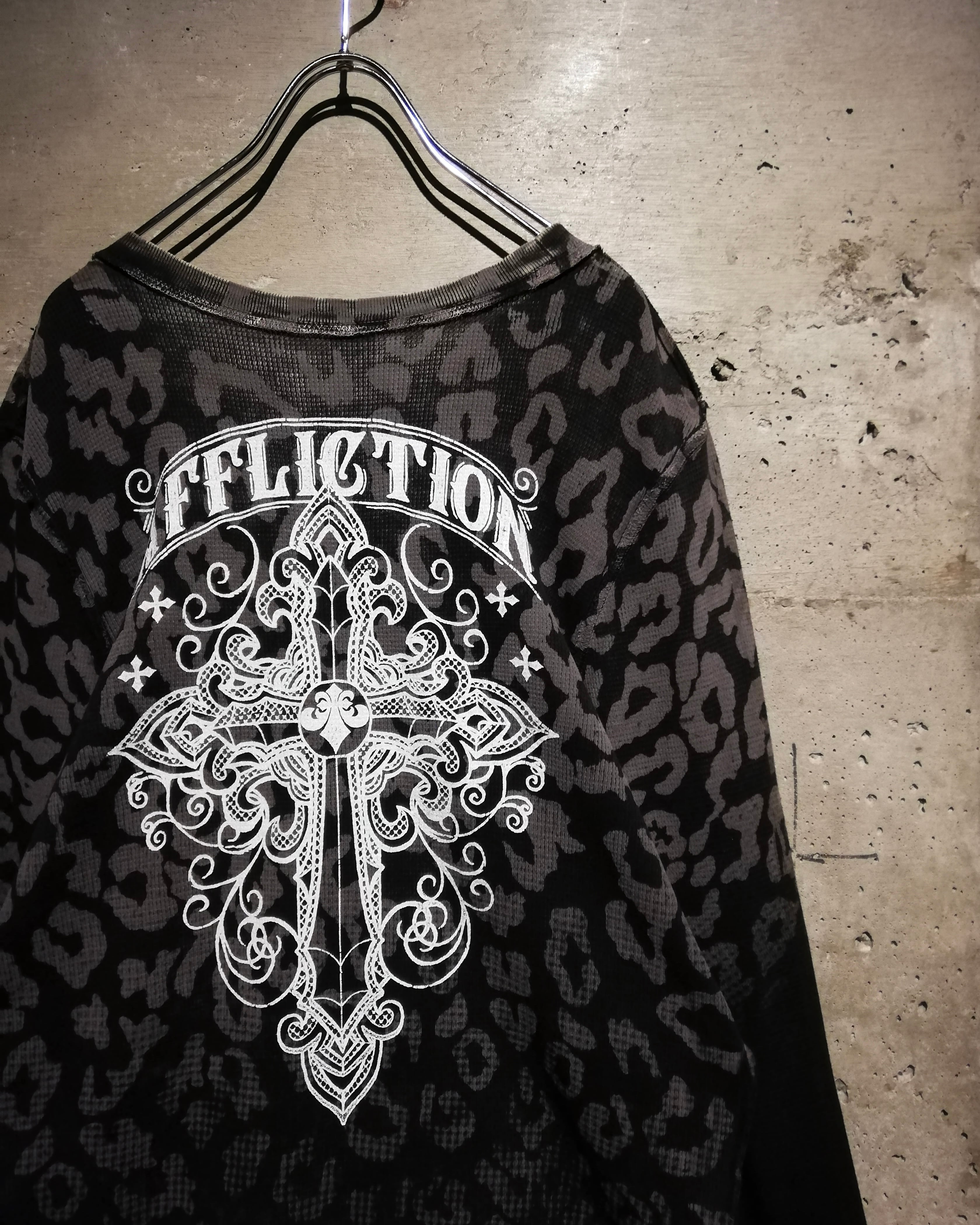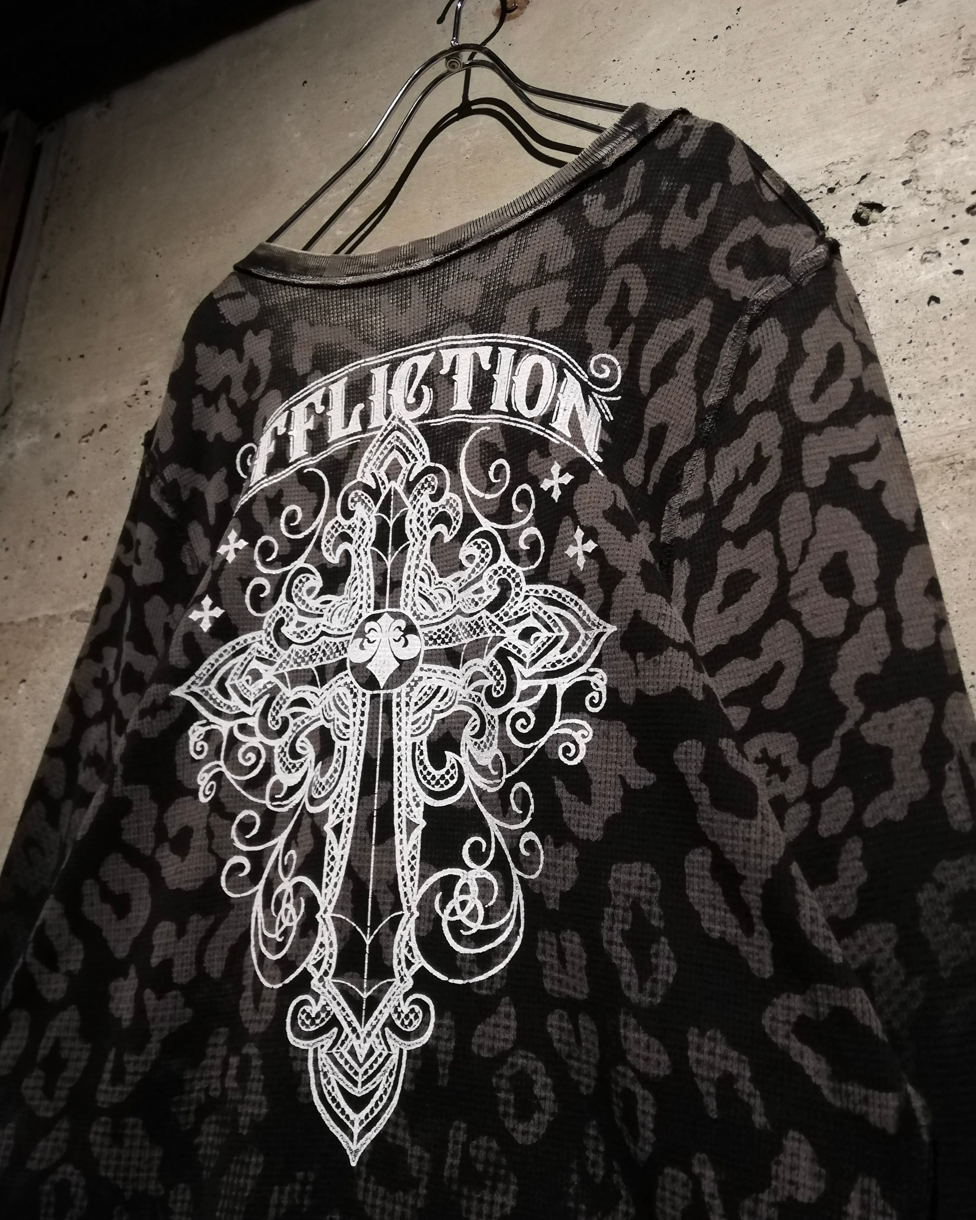 ブラック×グレーのレオパードパターンが落とし込まれたボディに、フロントにはブランドを象徴するクロスモチーフが鎮座。背面には “AFFLICTION” のロゴと共に、荘厳で緻密なデザインのクロスが大きく描かれています。