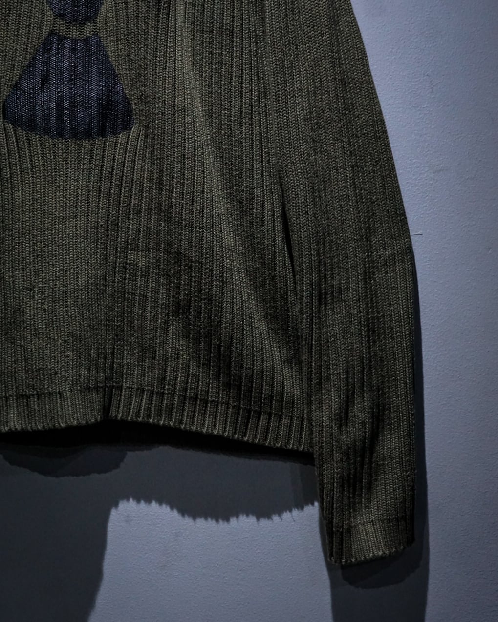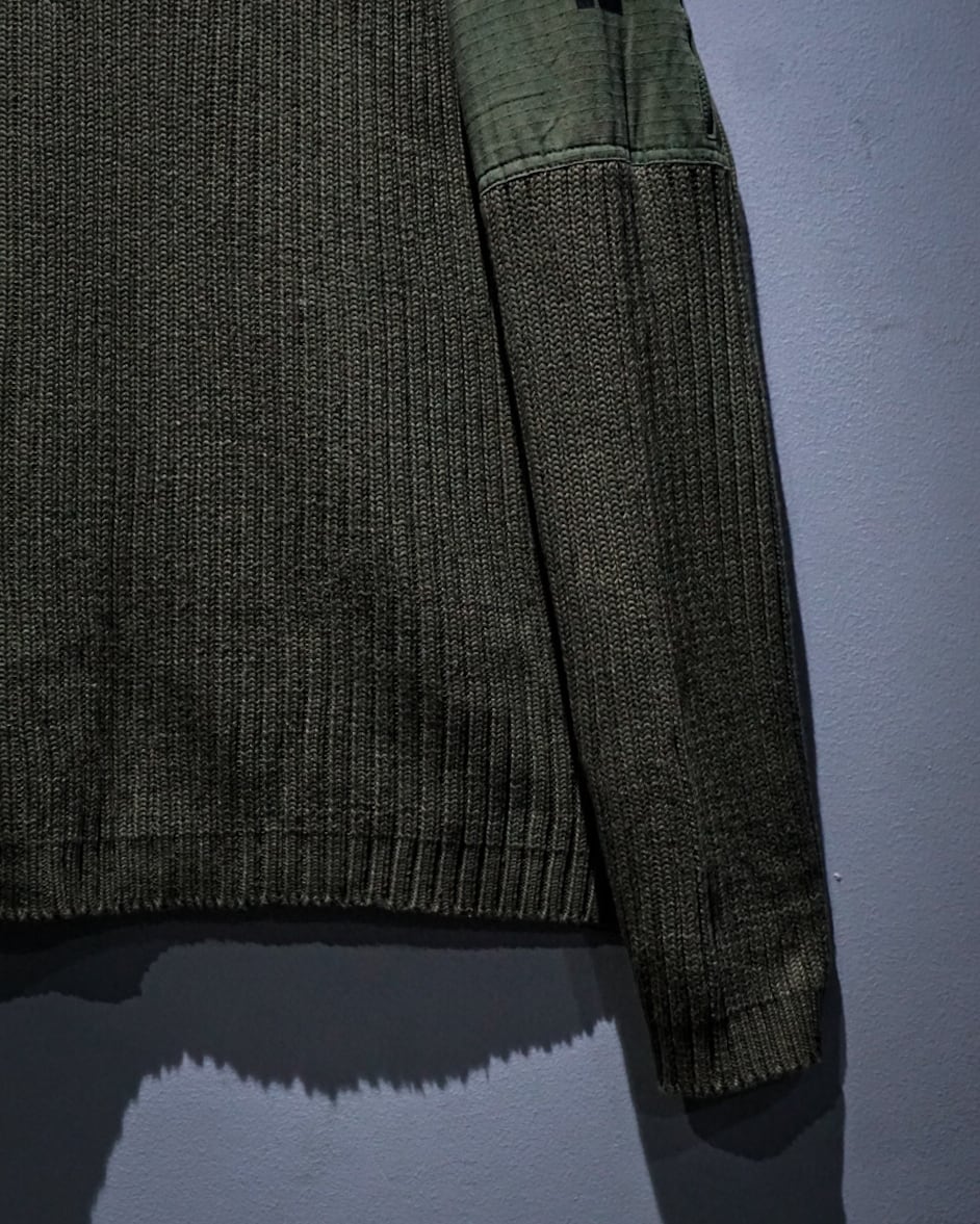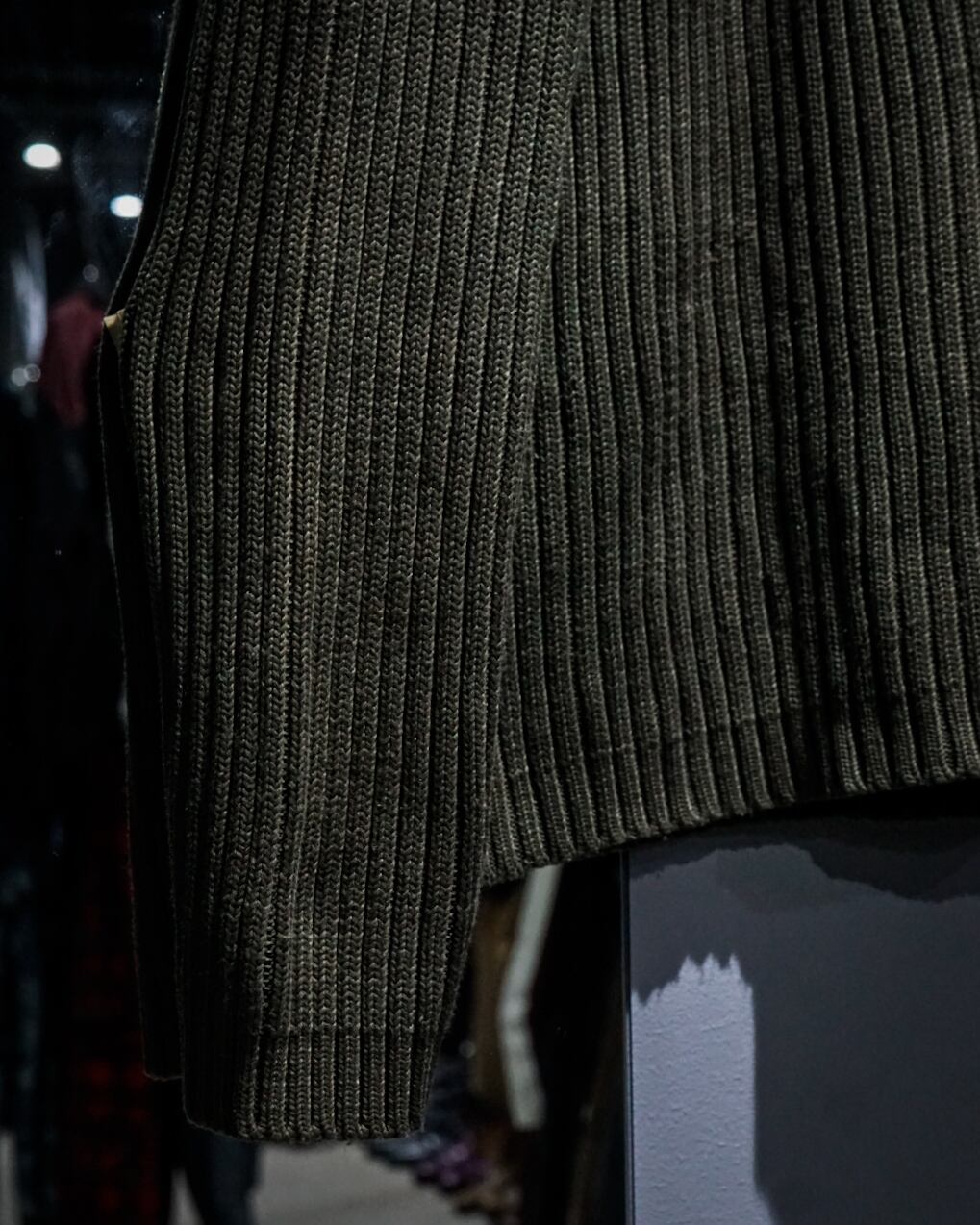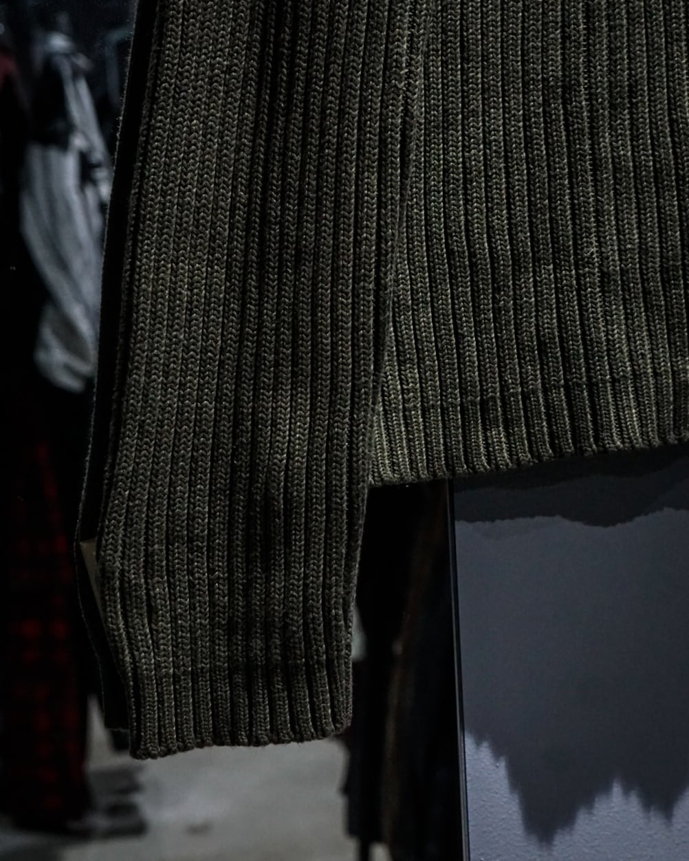 全体は深いオリーブカラーのコットン×アクリル混リブ編みボディを採用し、程よい厚みとタフさを備えつつも着心地は柔らかく快適。