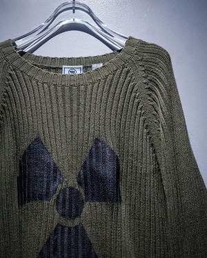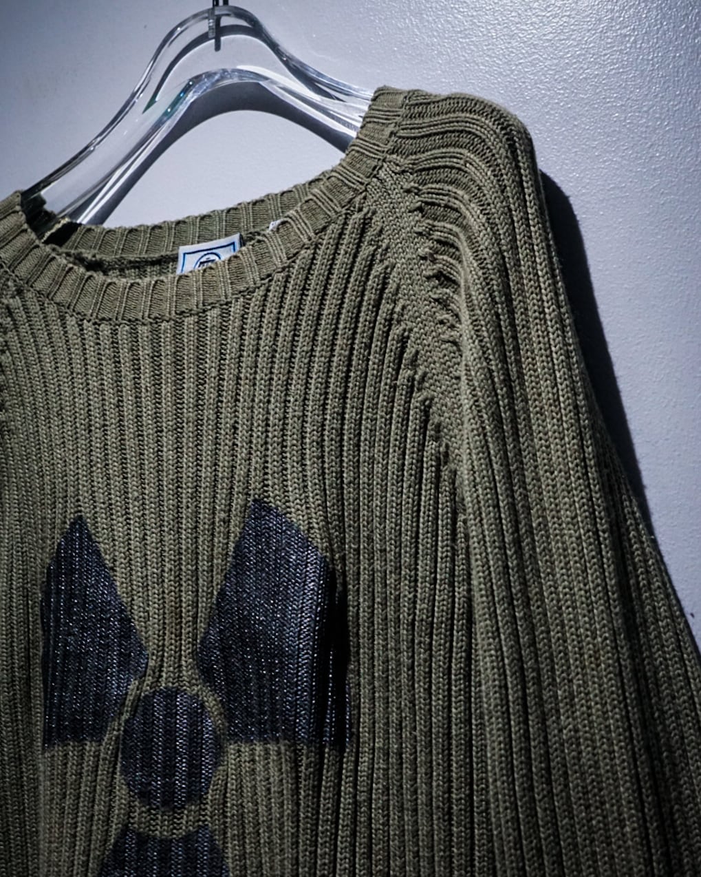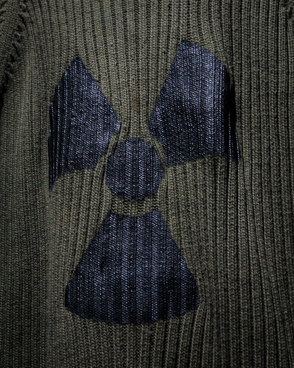 フロント中央に大きく“放射能マーク”をペイントした、無骨さとアイロニカルな遊び心を同居させたニット。