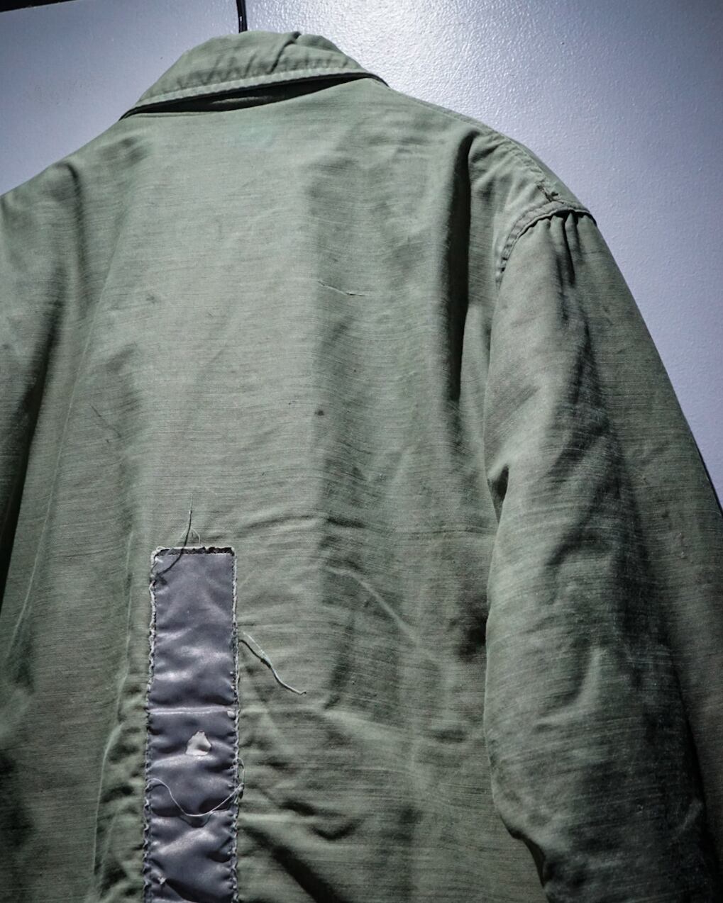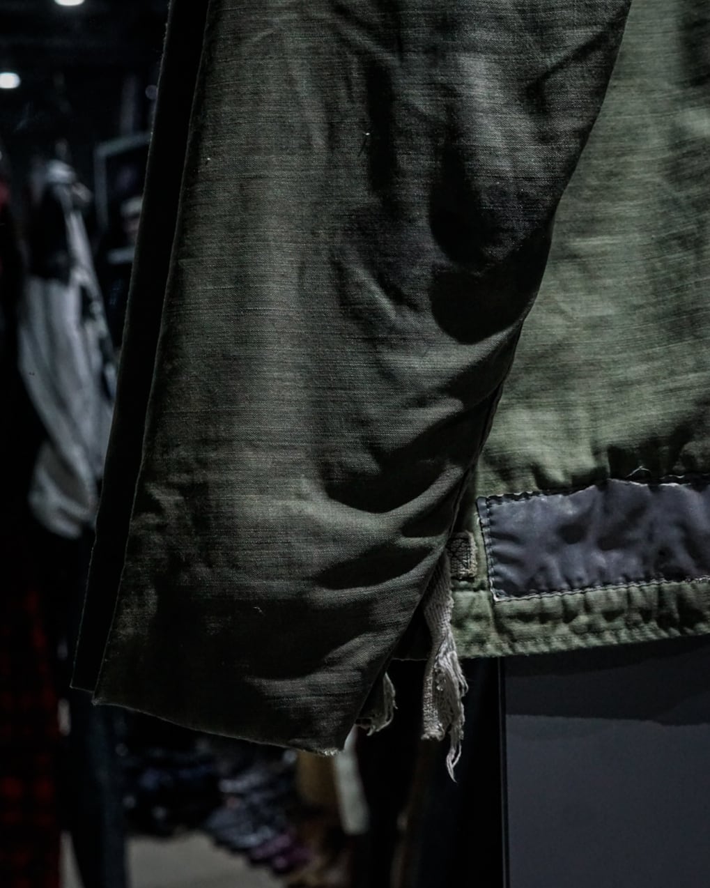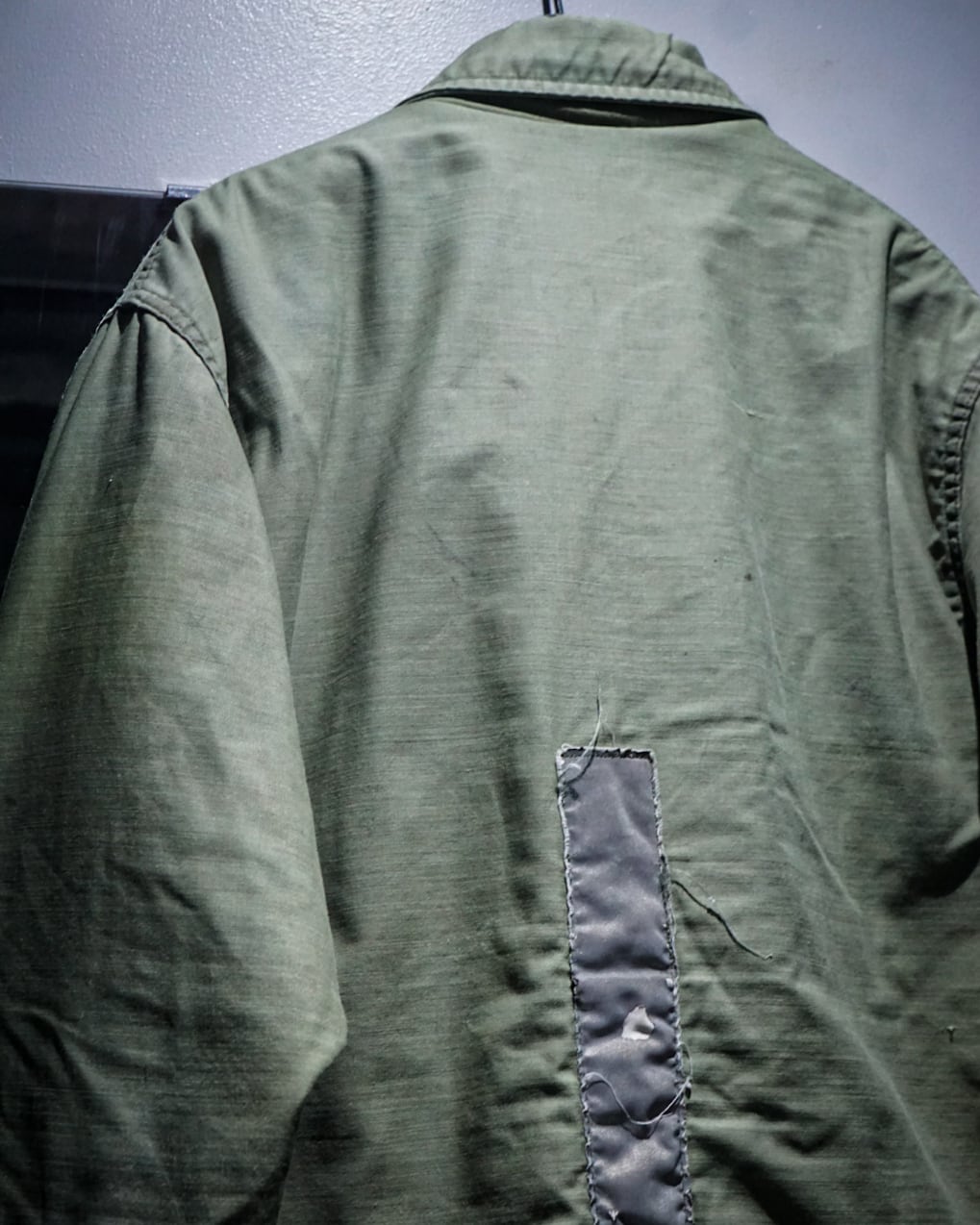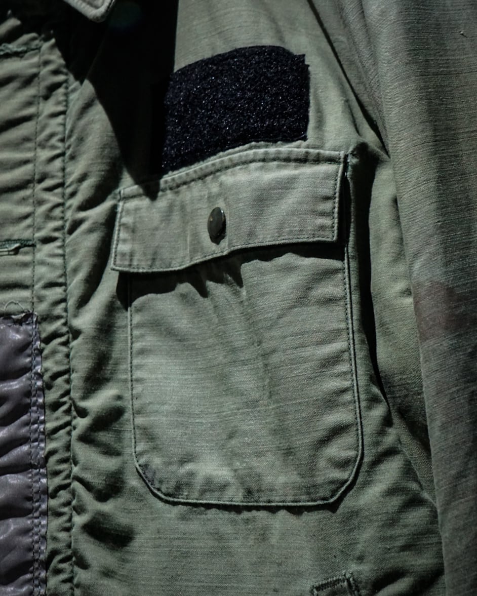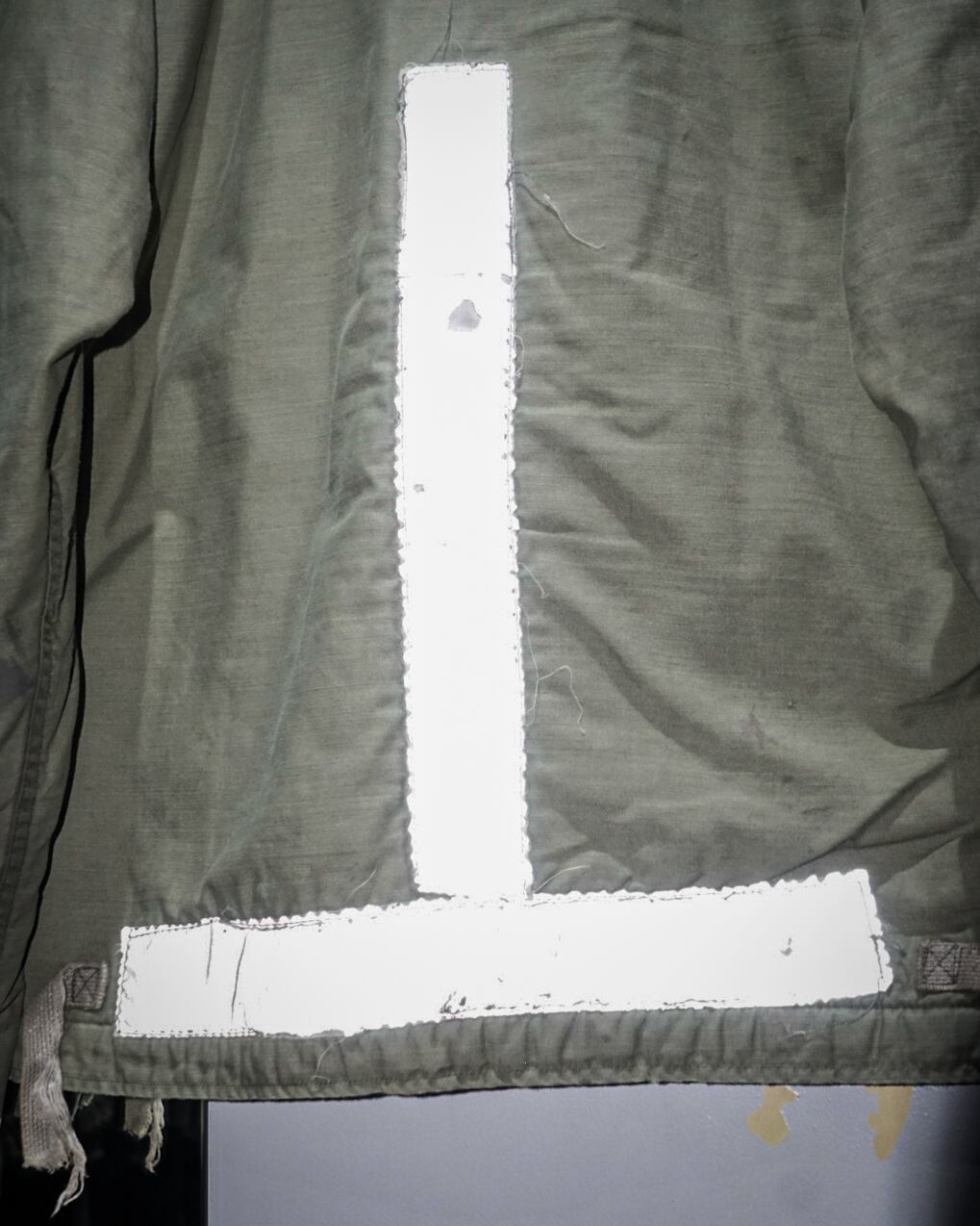 こちらの1着はフロントと背面にリフレクターのカスタムが施された特別な仕様。オリジナルのミリタリーウェアとしての無骨な雰囲気に加え、リメイクによる唯一無二の存在感を放っています。リフレクターは光を受けることで表情が変わり、ナイトシーンや街灯の下で独自の魅力を引き立ててくれるのもポイントです。