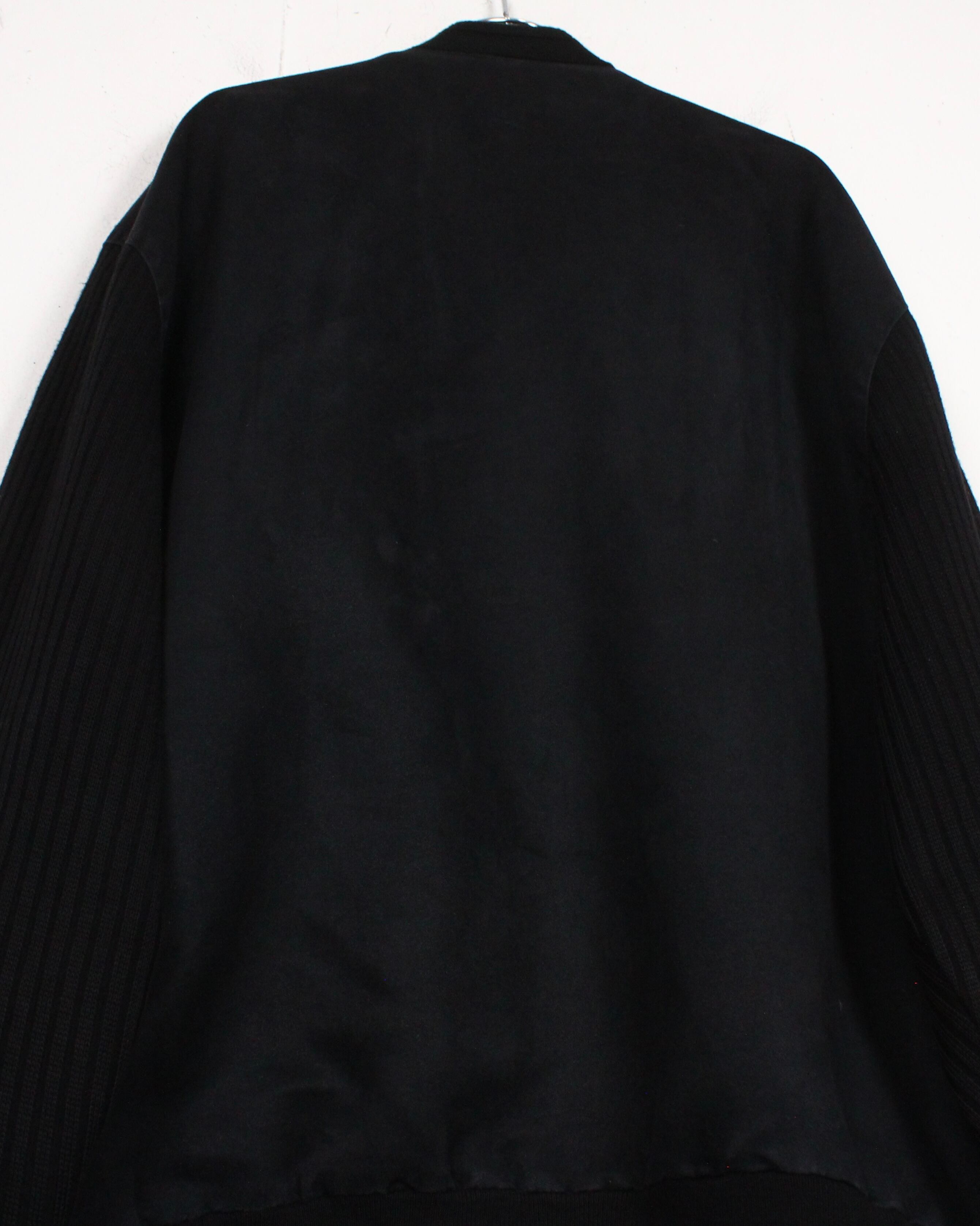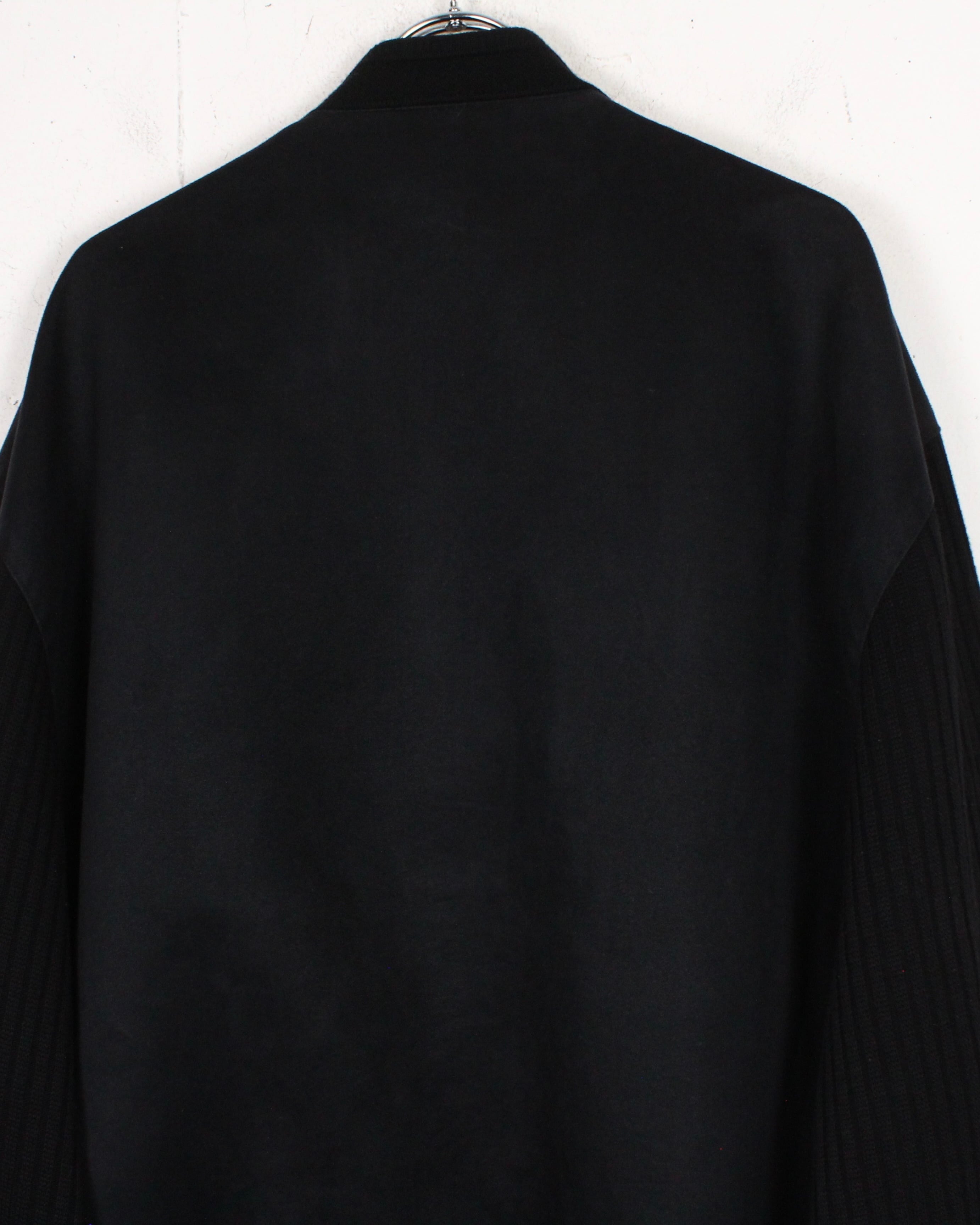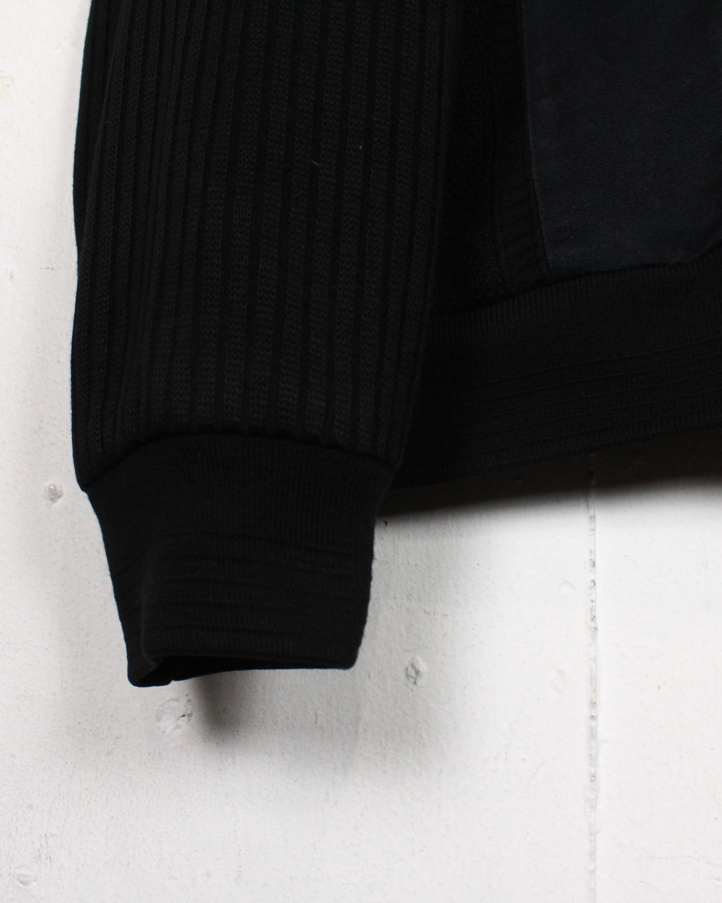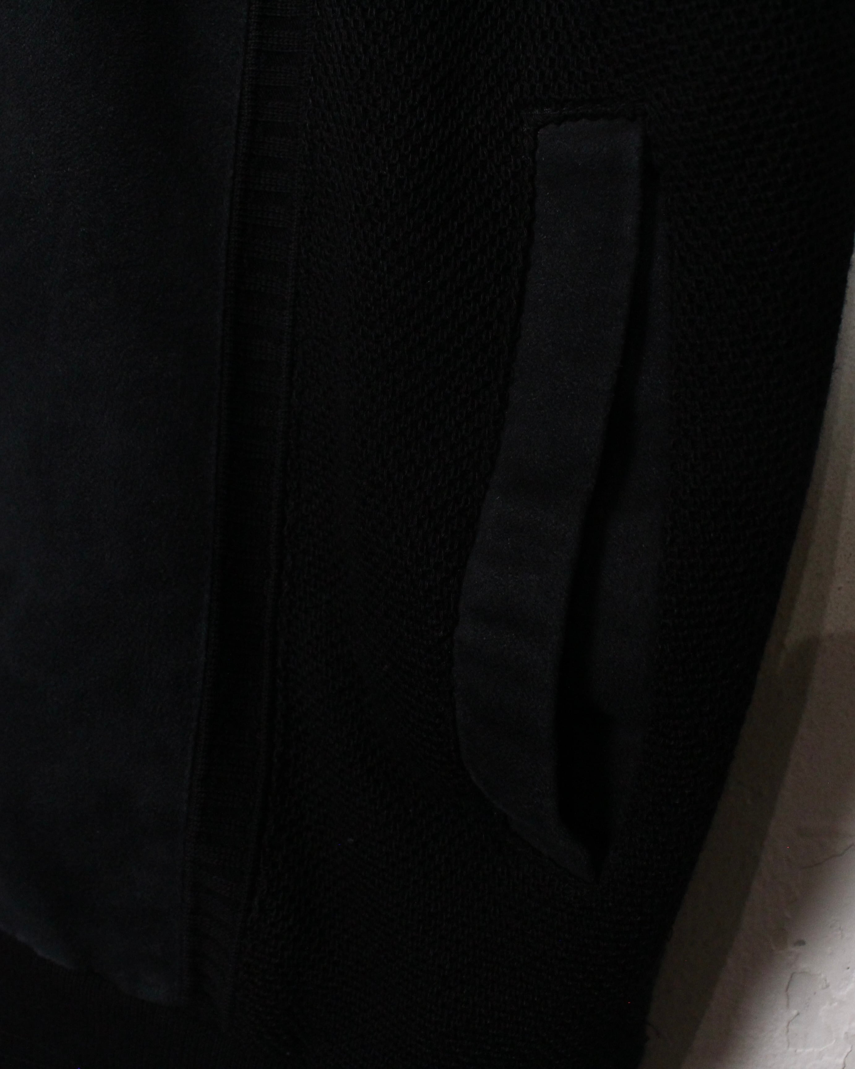 フロント、背面にはフェイクスエードを使用し、しっとりとした質感と奥行きのある表情を演出。スリーブやサイドにはニットを組み合わせることで、動きやすさと通気性を確保しつつ、無骨さとモード感が共存する仕上がりとなっています。