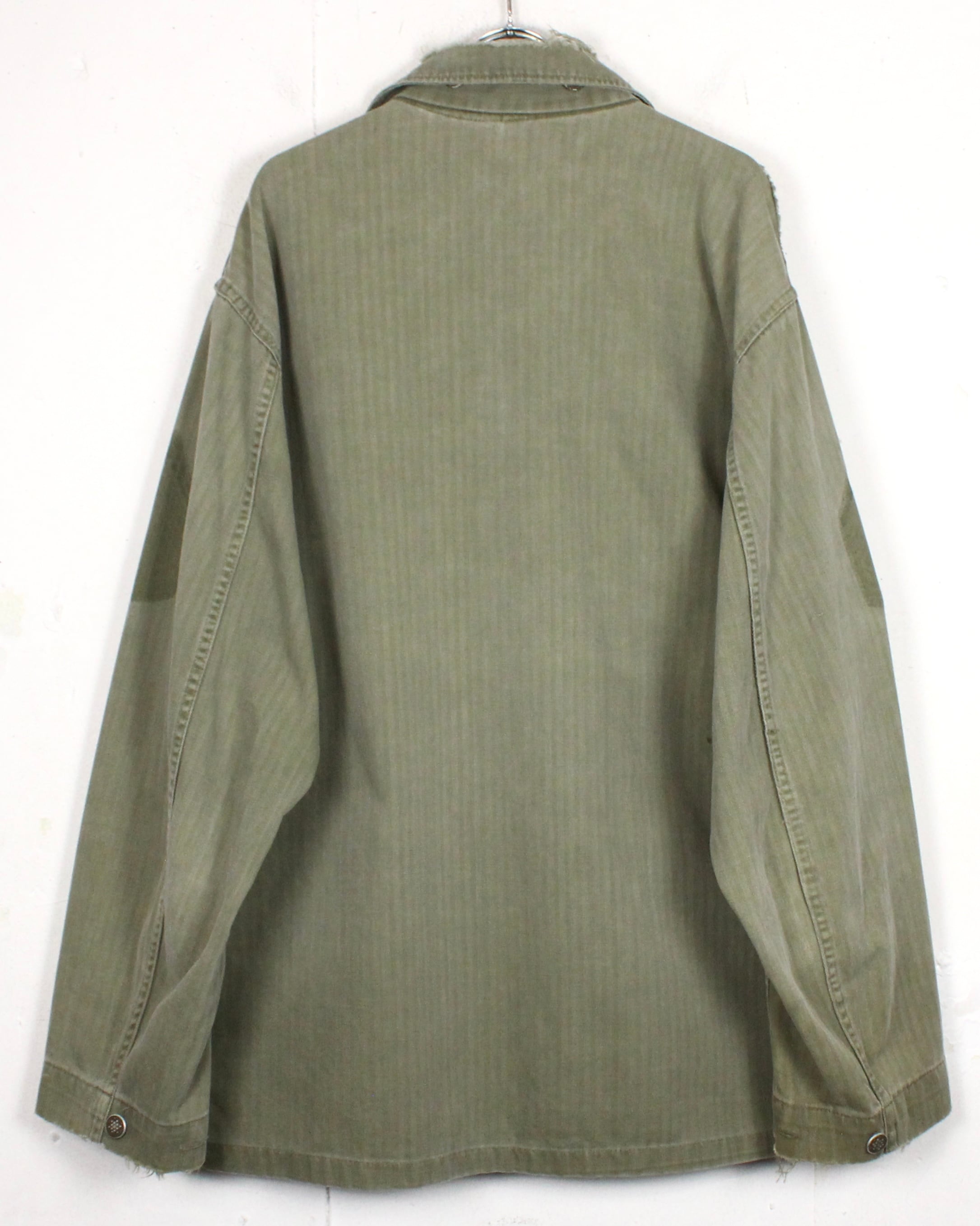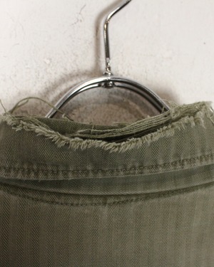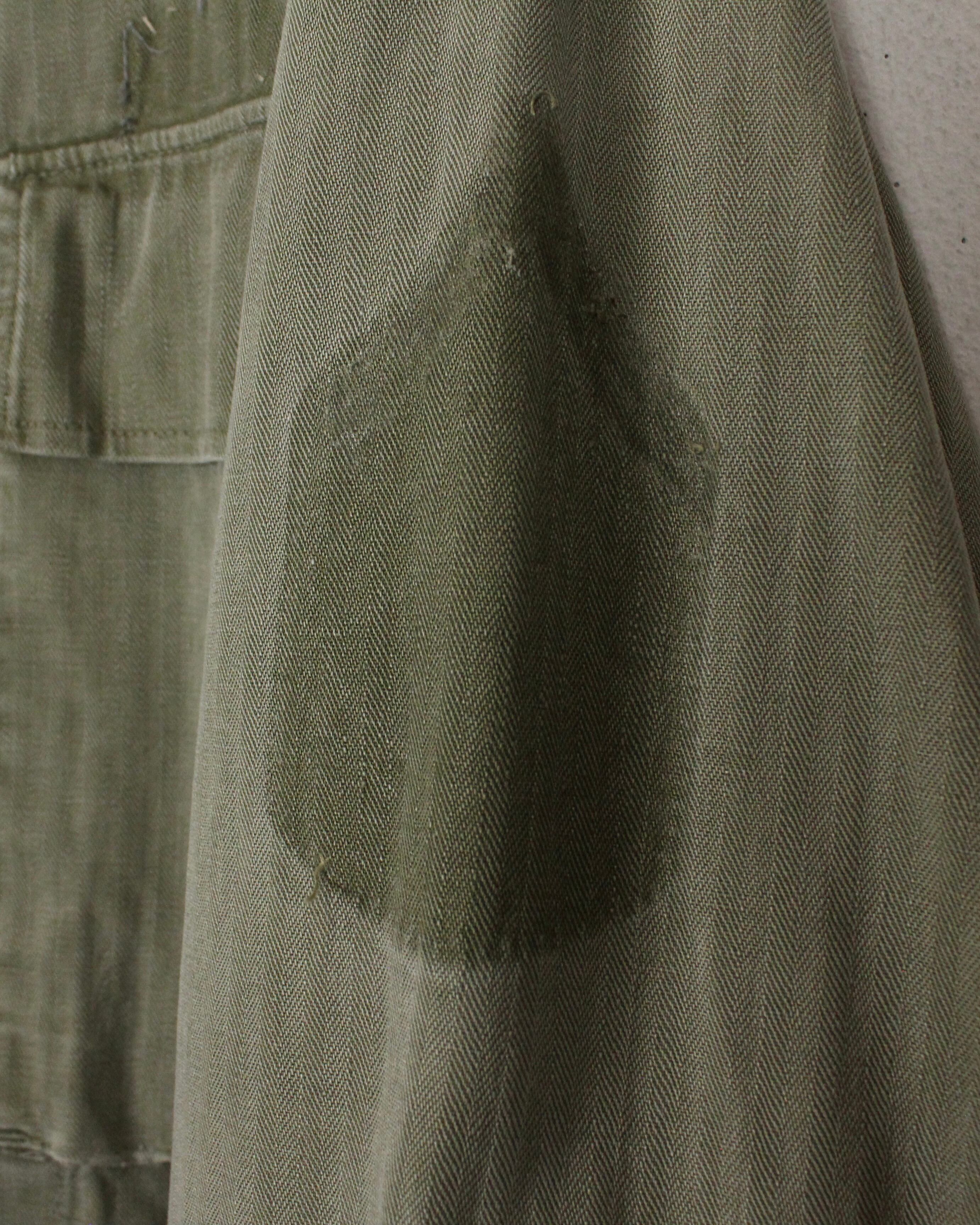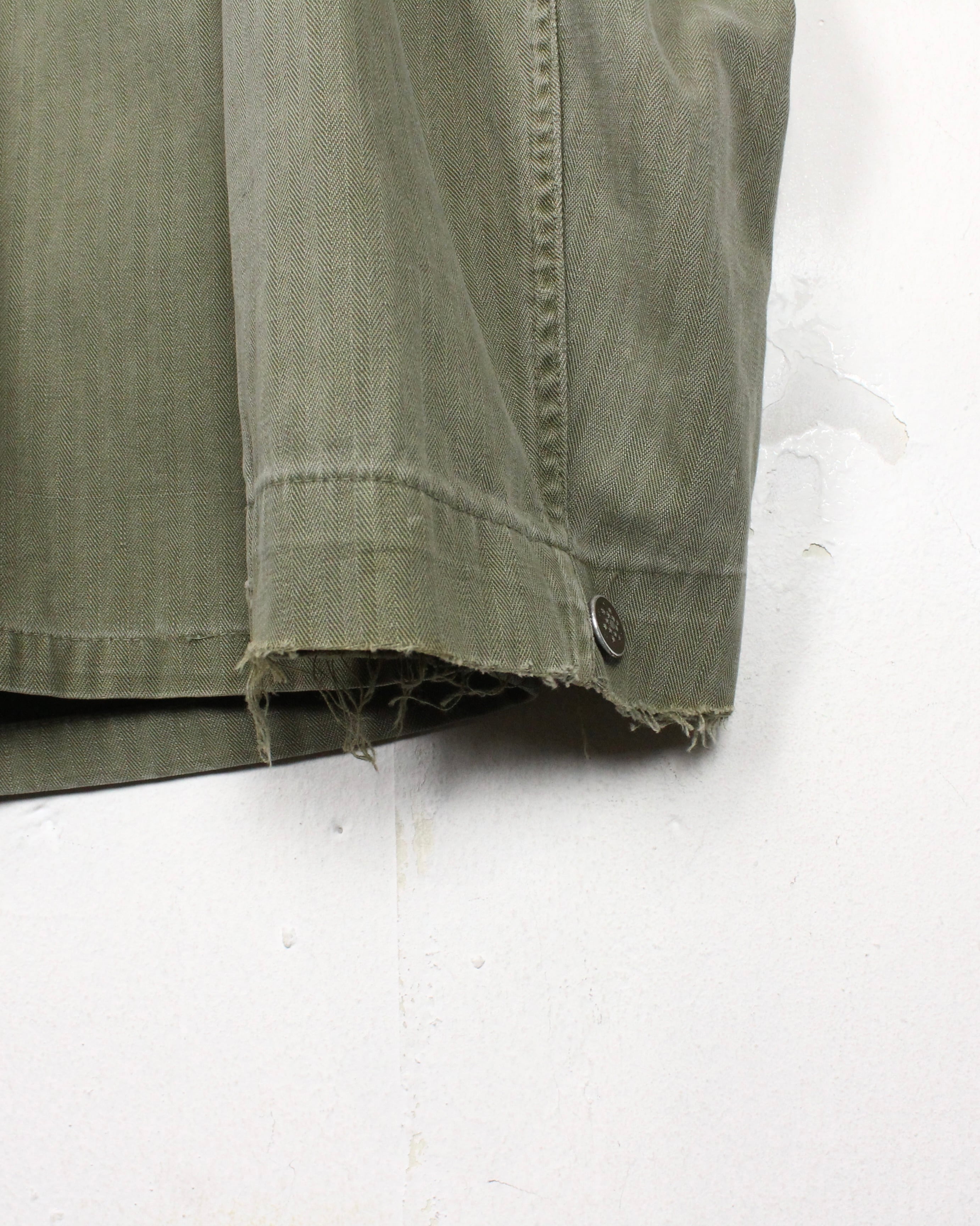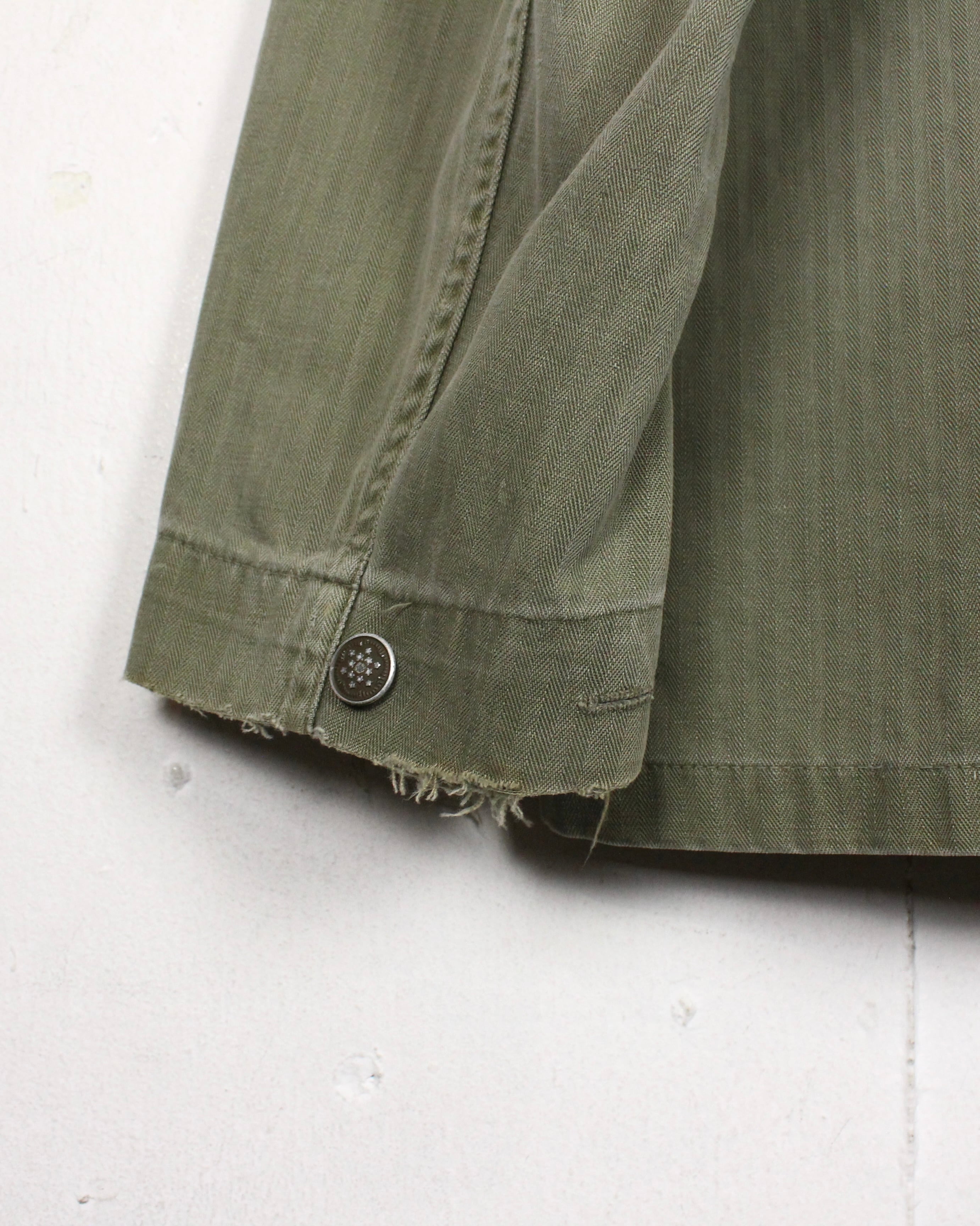 最大の特徴は、ヘリンボーンツイル生地。特有の独特な凹凸が生地に立体感を与え、摩耗や引き裂きに強い堅牢さを備えています。オリーブドラブの色味もフェード感が増すことで深みを増し、唯一無二の表情を楽しむことができます。