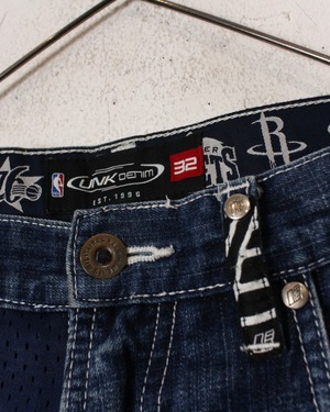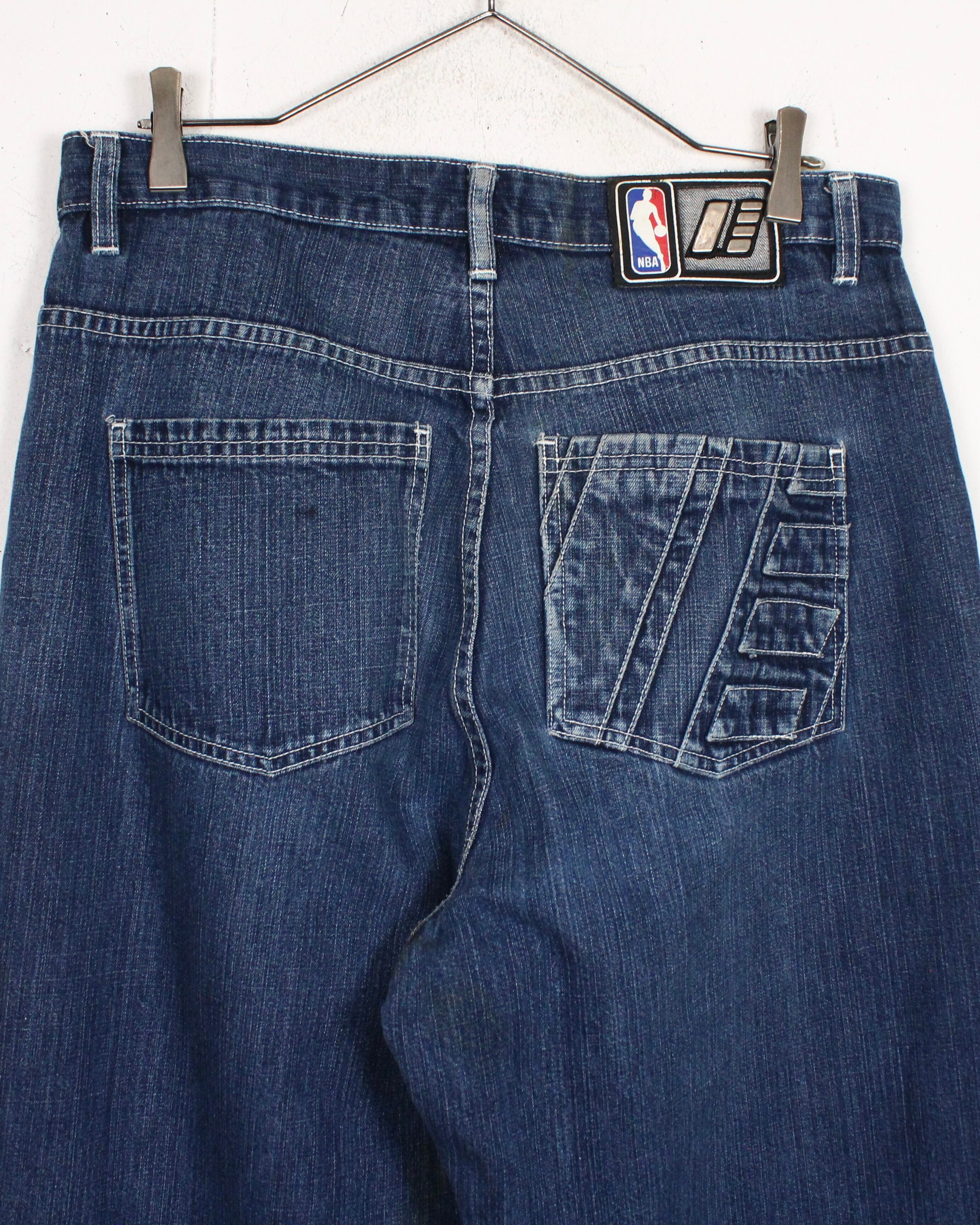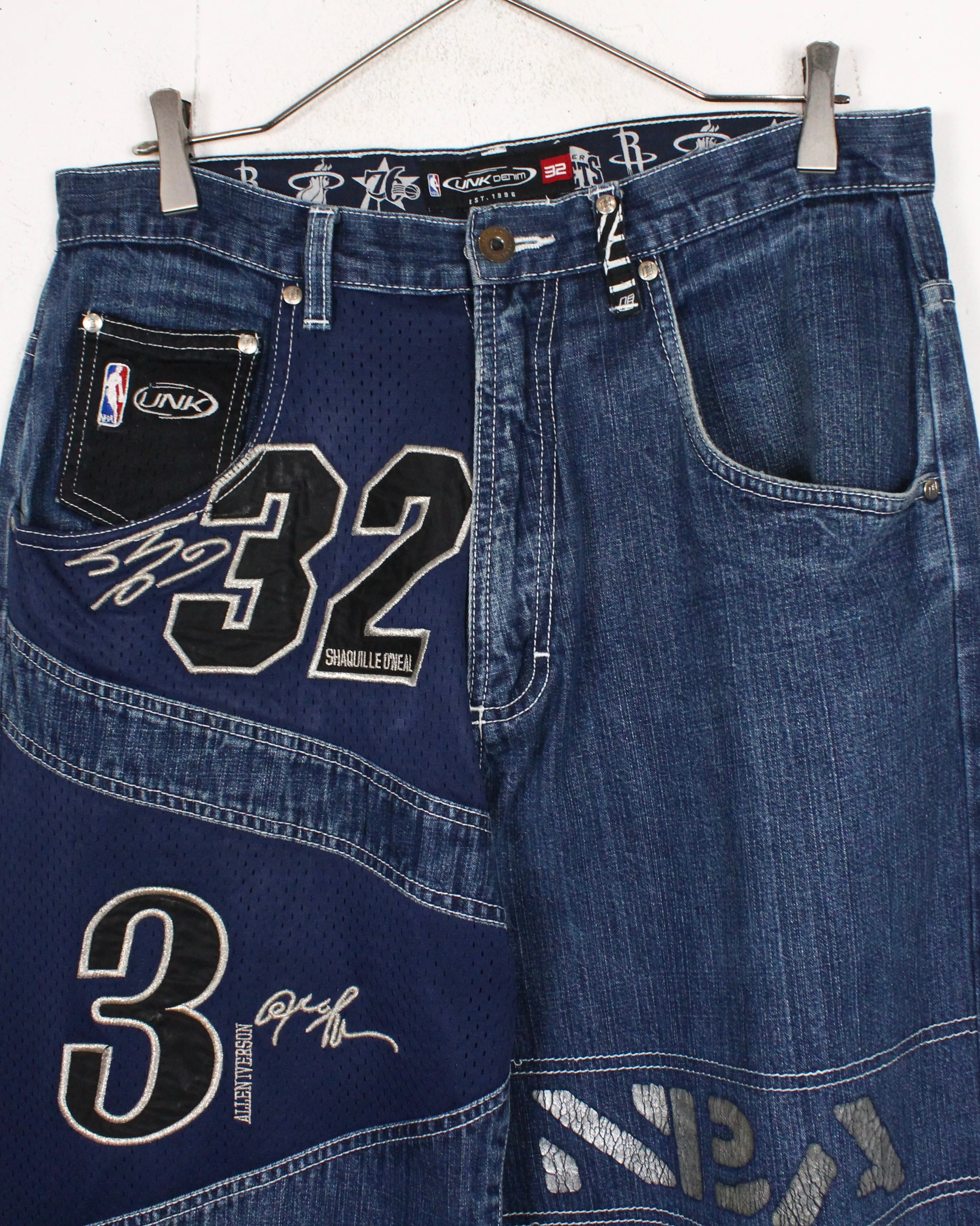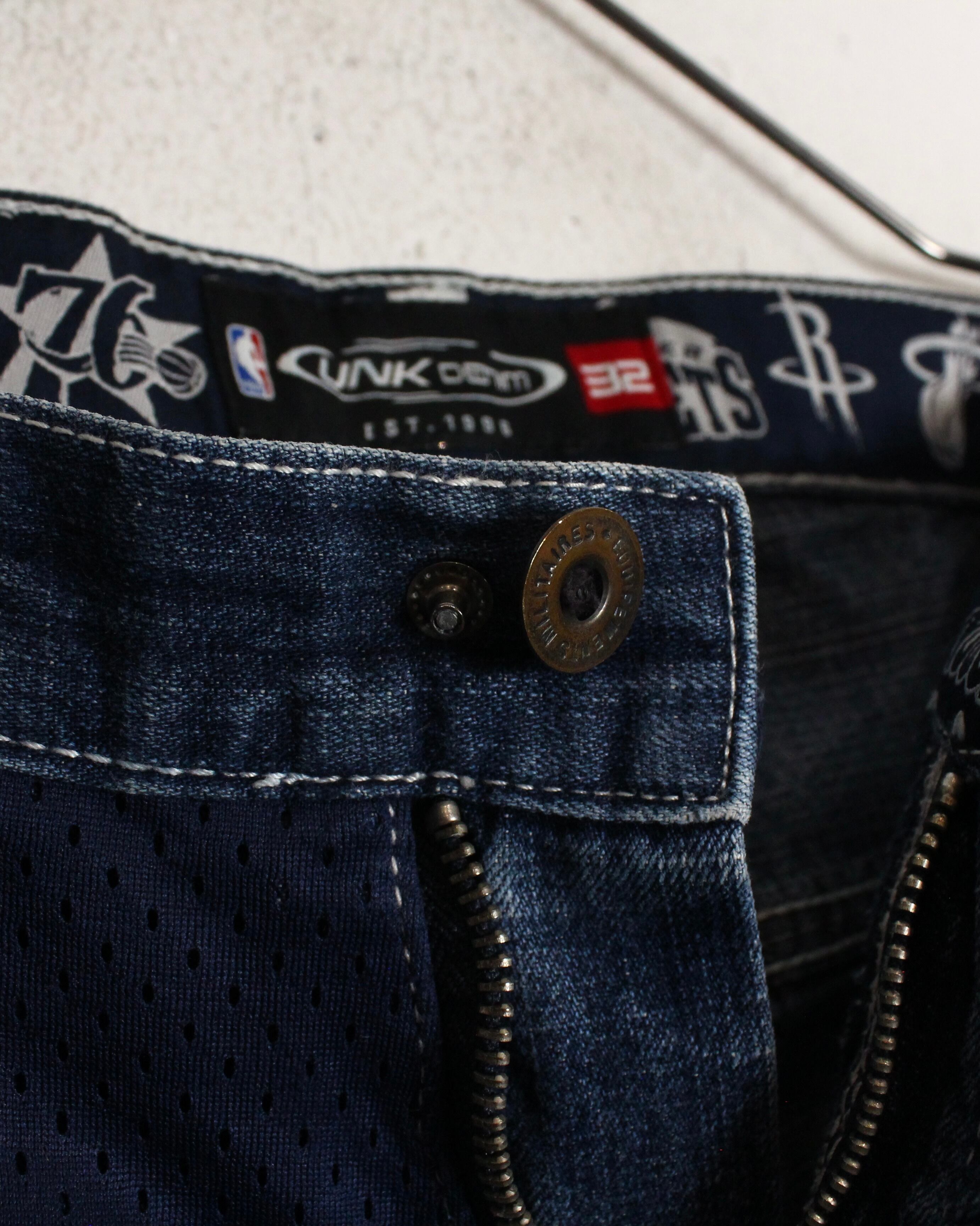 デニム自体はしっかりとしたインディゴ生地で、フロントの切り替えと絶妙なコントラストを形成。ウエスト裏やポケット口、さらにはバックポケットにはUNKならではのロゴやNBAモチーフが散りばめられ、360度どこから見ても抜群の存在感を放ちます。