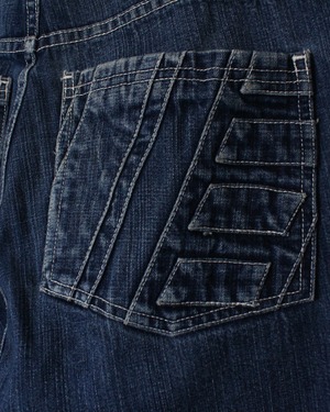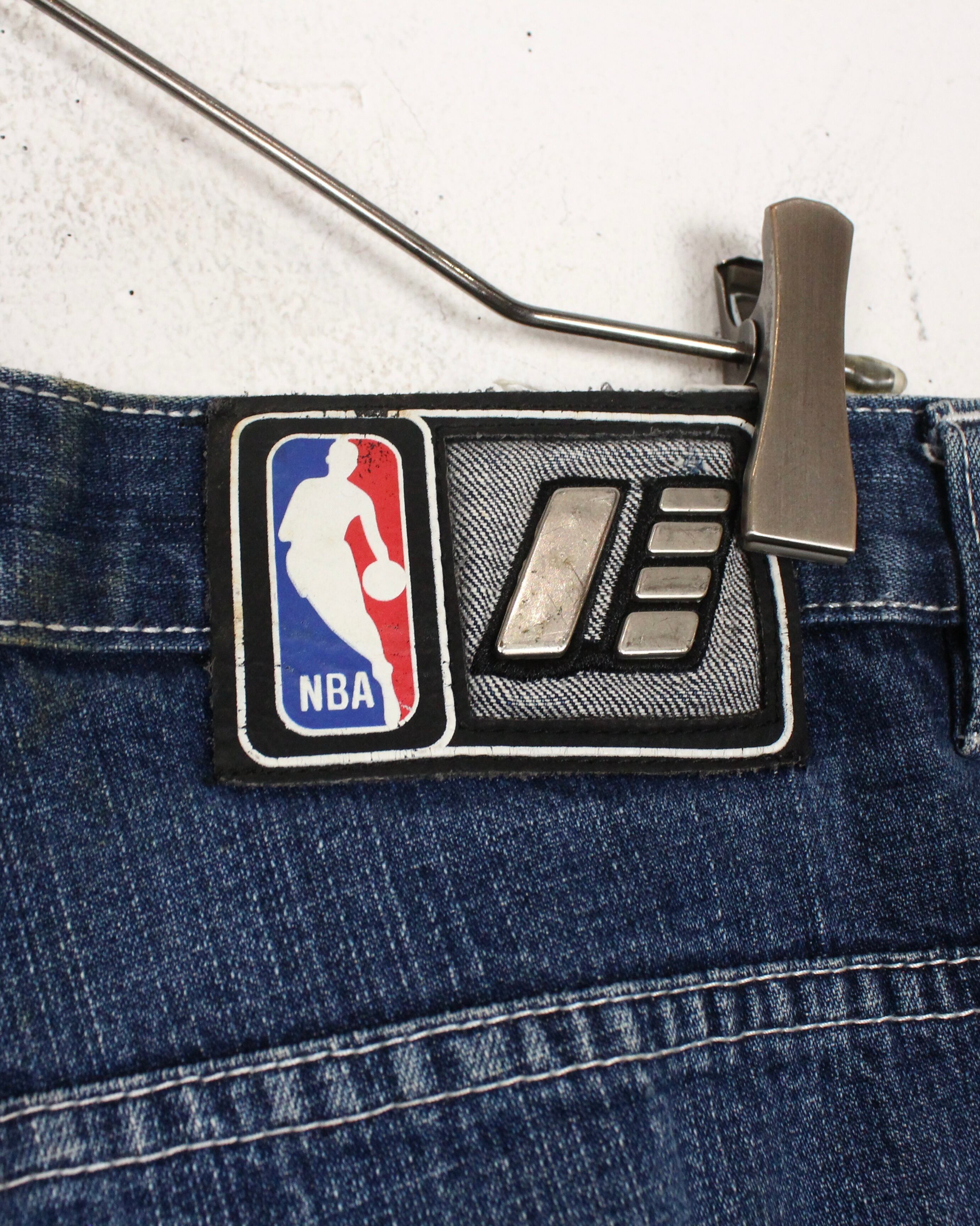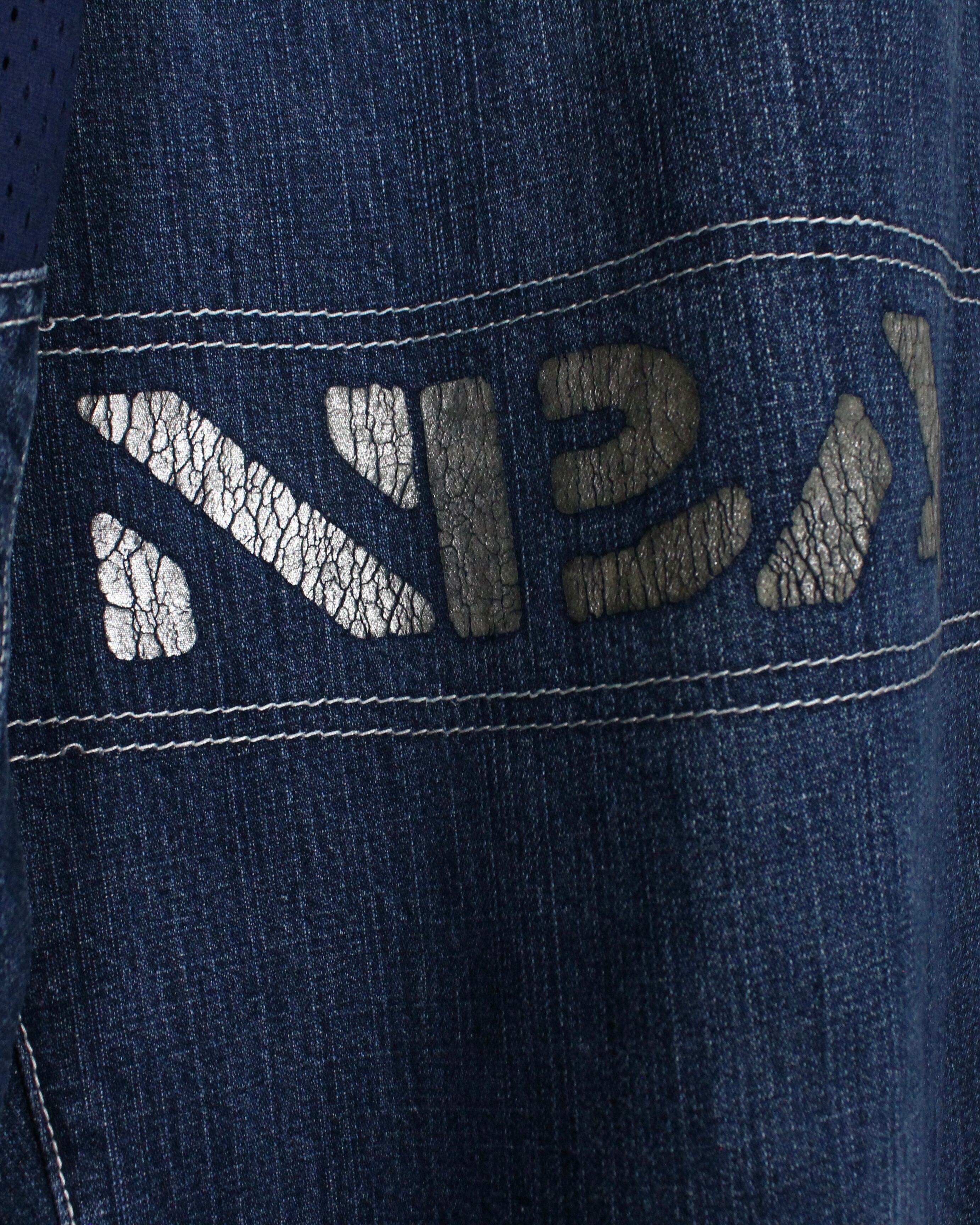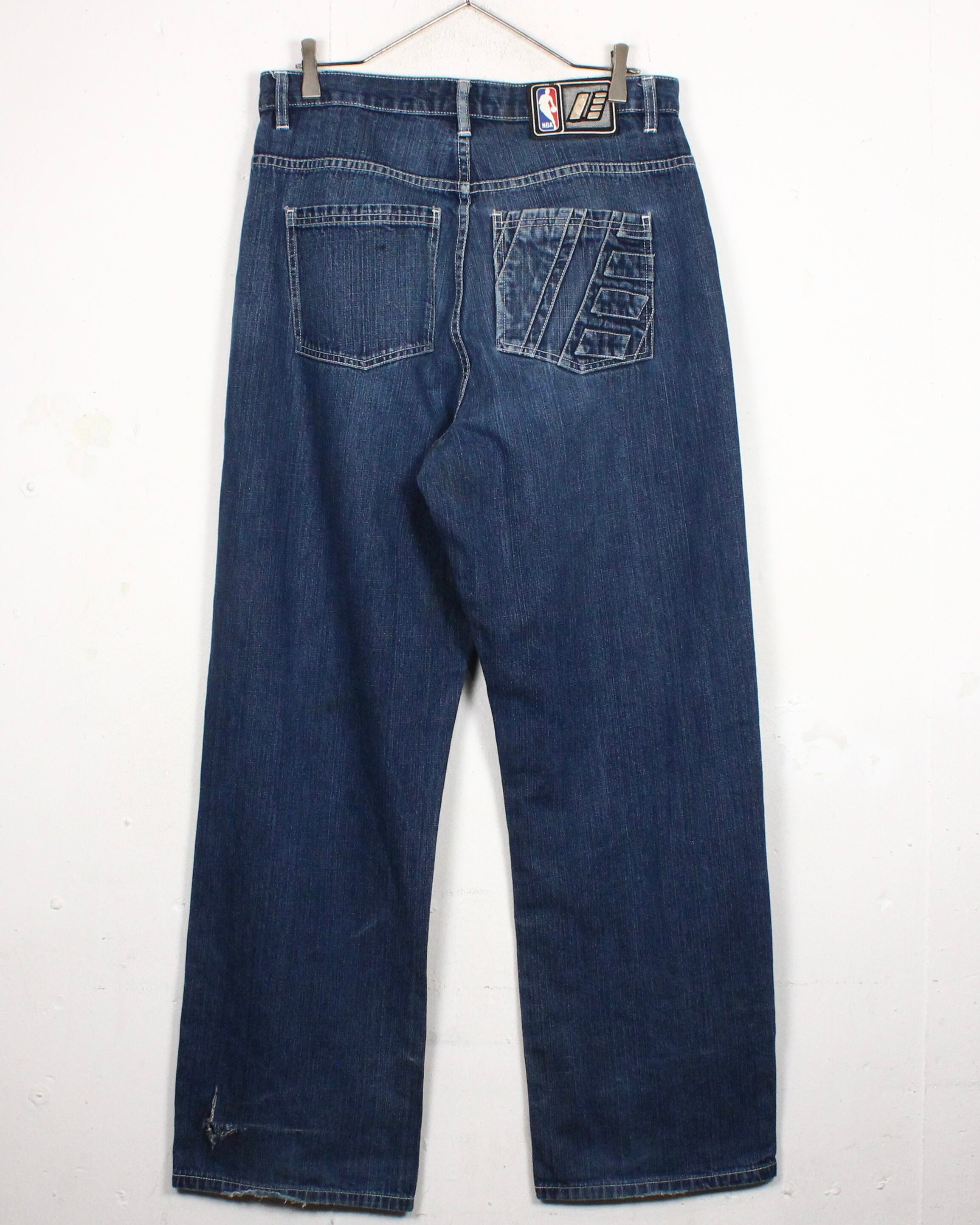 デニム自体はしっかりとしたインディゴ生地で、フロントの切り替えと絶妙なコントラストを形成。ウエスト裏やポケット口、さらにはバックポケットにはUNKならではのロゴやNBAモチーフが散りばめられ、360度どこから見ても抜群の存在感を放ちます。