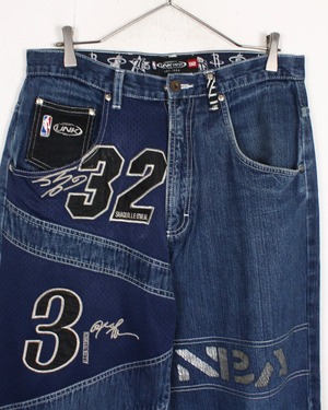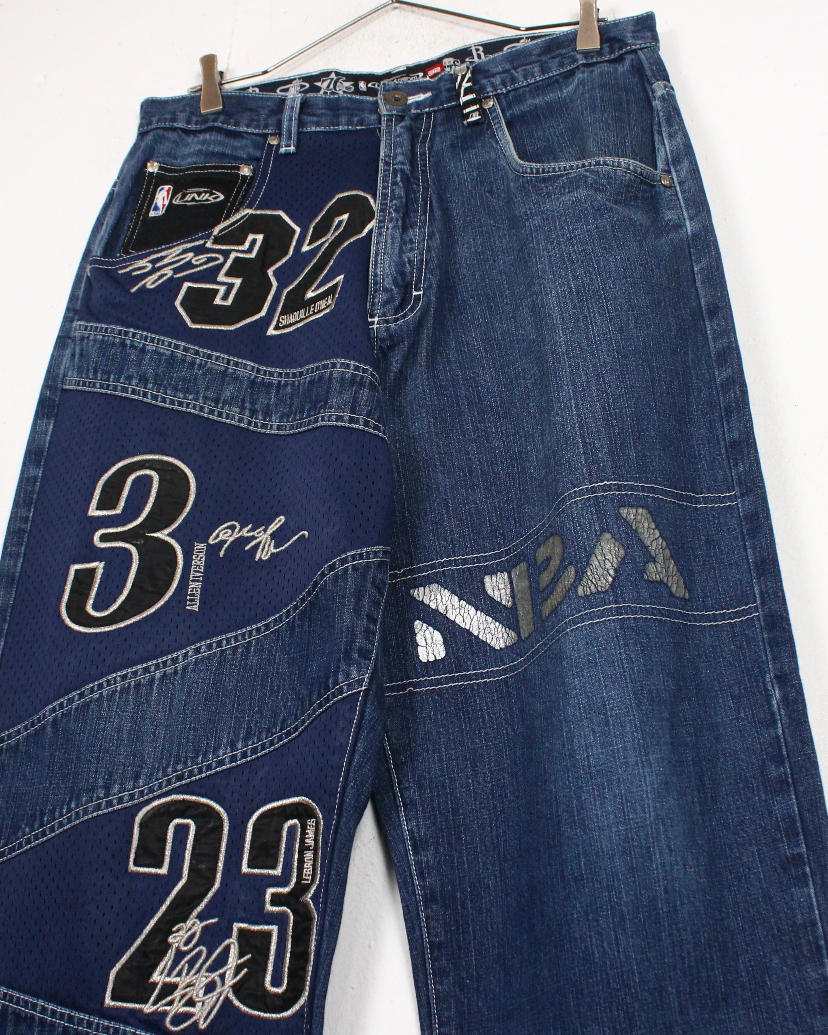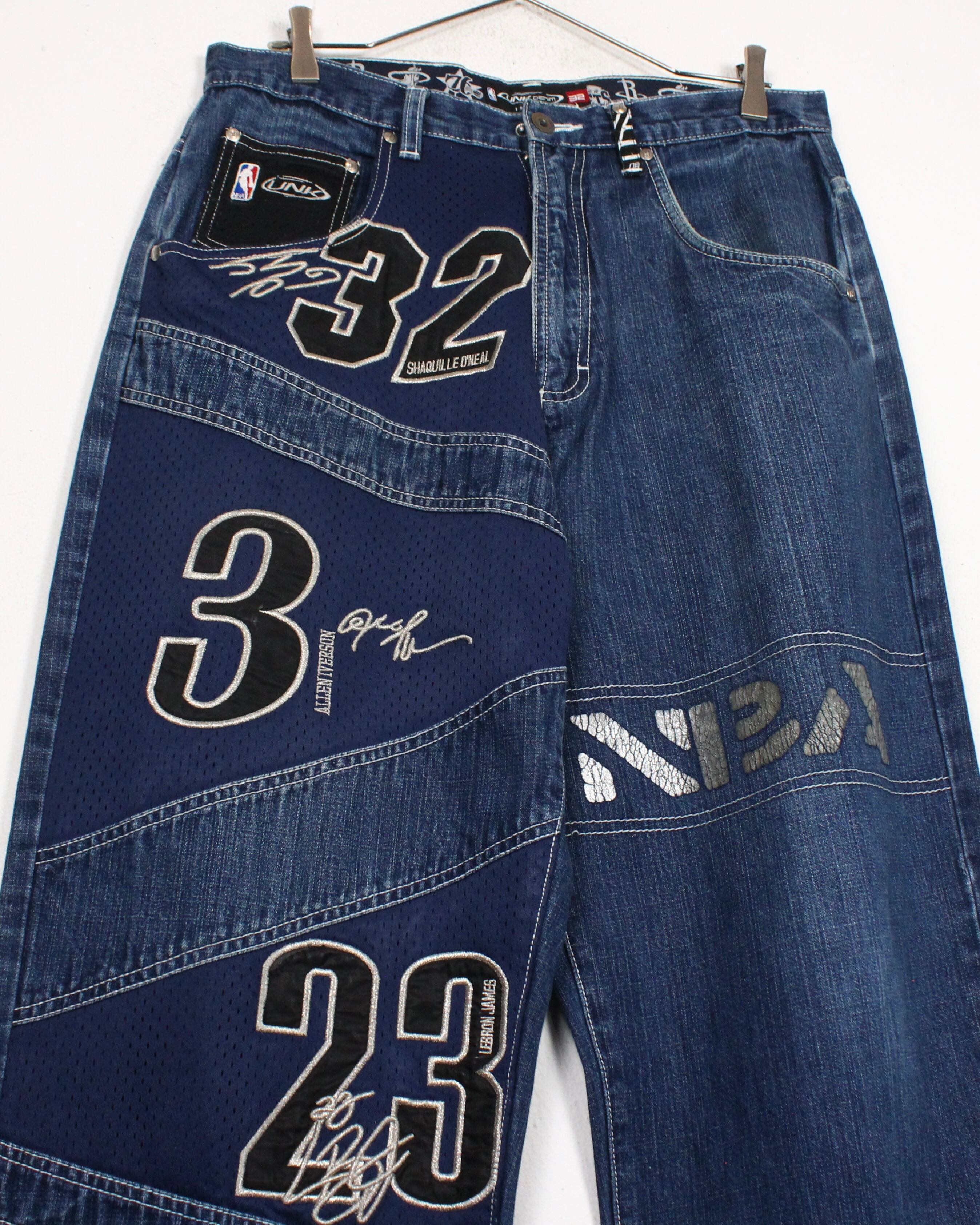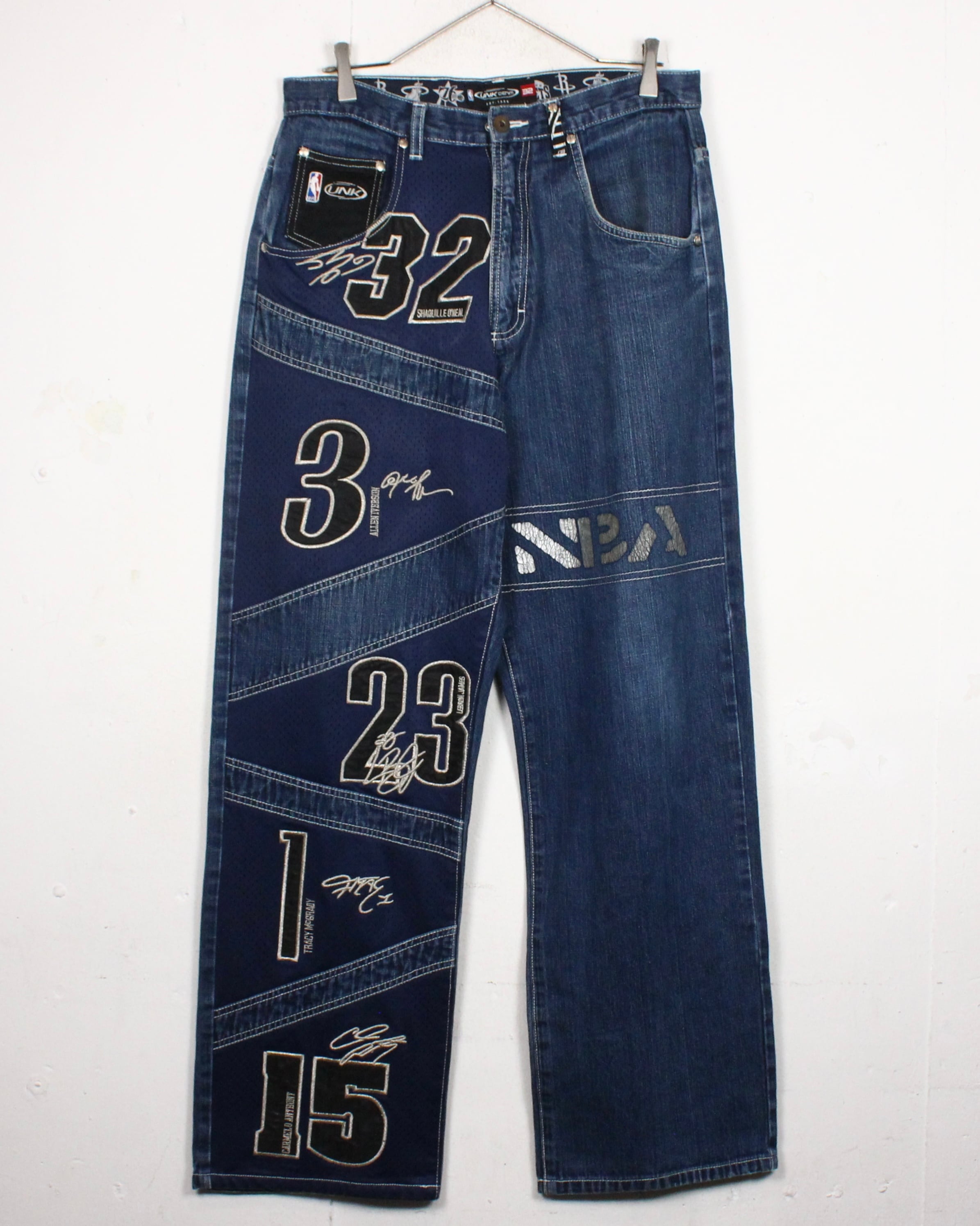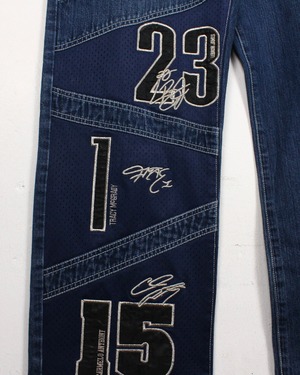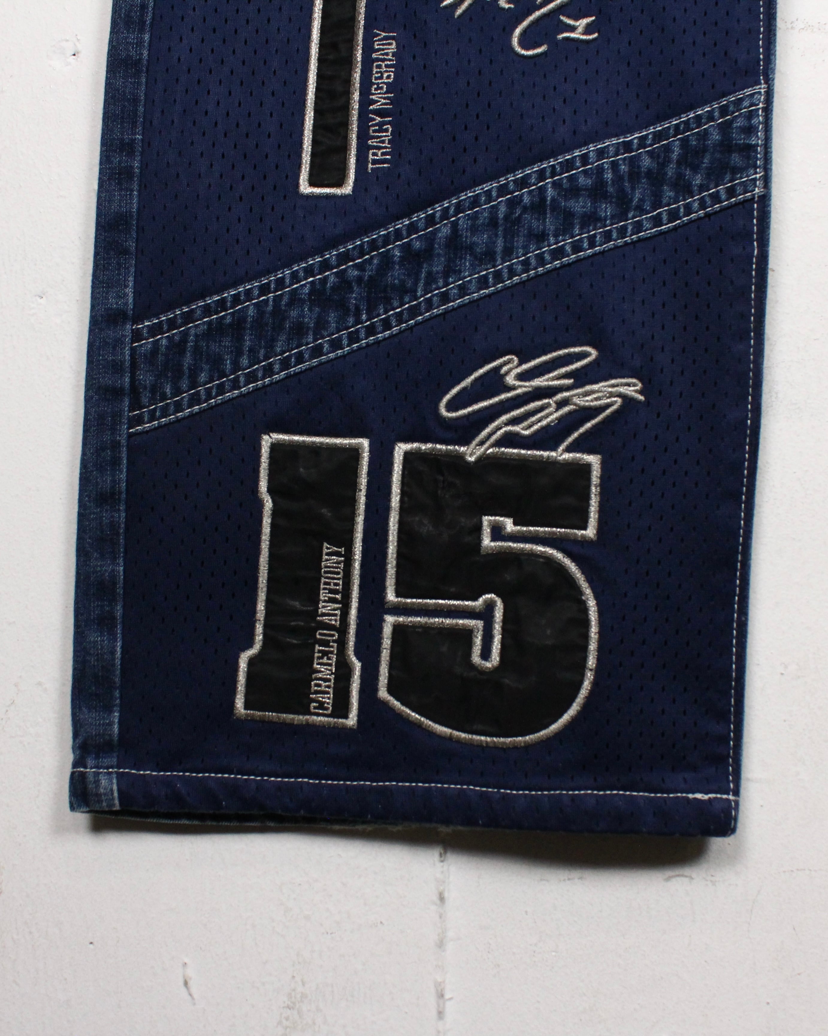 インディゴのボディに、フロントにはNBAを象徴するスター選手たちのナンバーとサイン刺繍を大胆に載せたバギーパンツ。