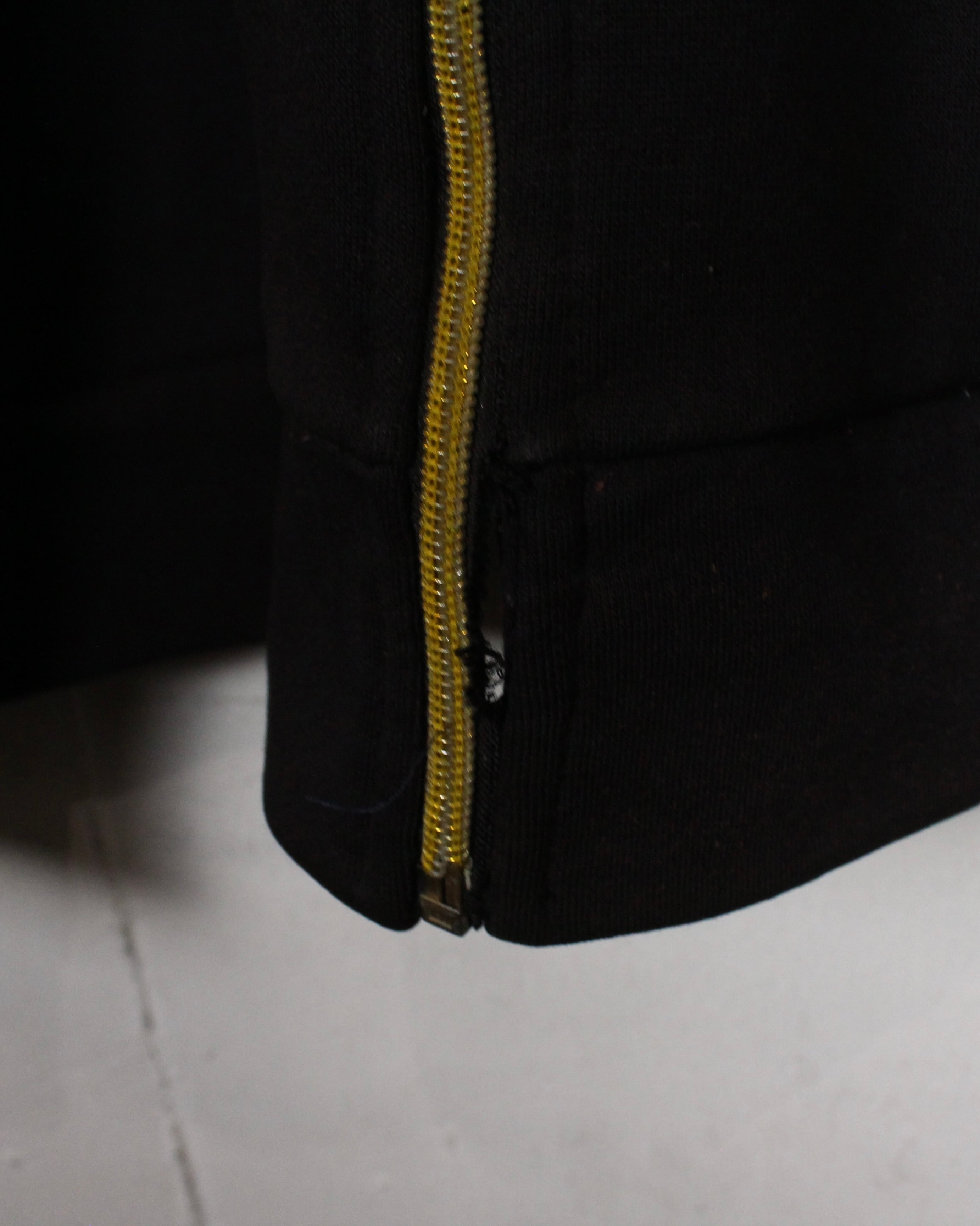 フードのドローコードが通常の紐ではなく一部がチェーン仕様になっており、ウェア全体に重厚感が加わり、単なるプリントフーディを超えた特別感を演出しています。ゴールドのジップもアクセントとなり、ラグジュアリーさとアンダーグラウンドな空気感を両立。