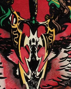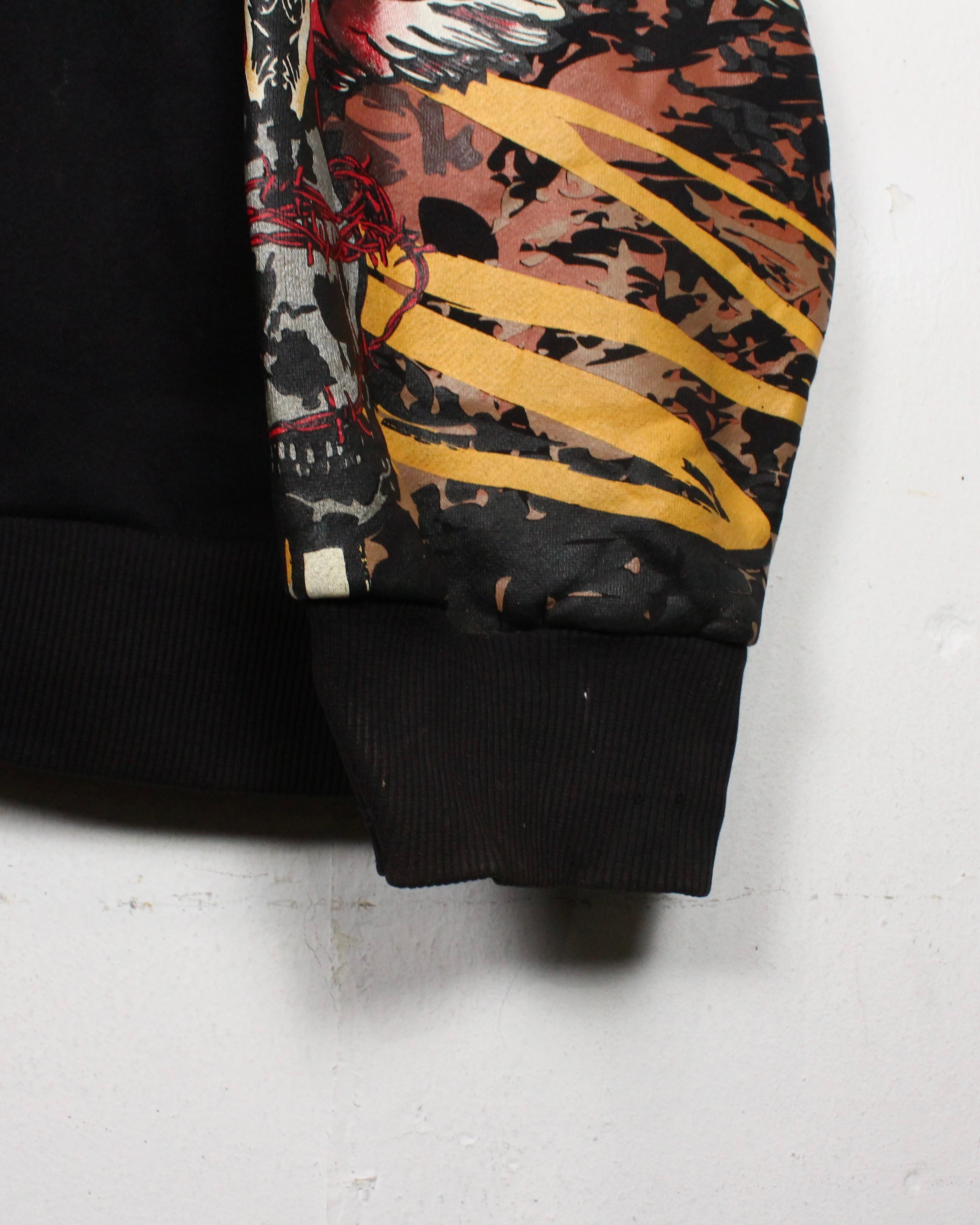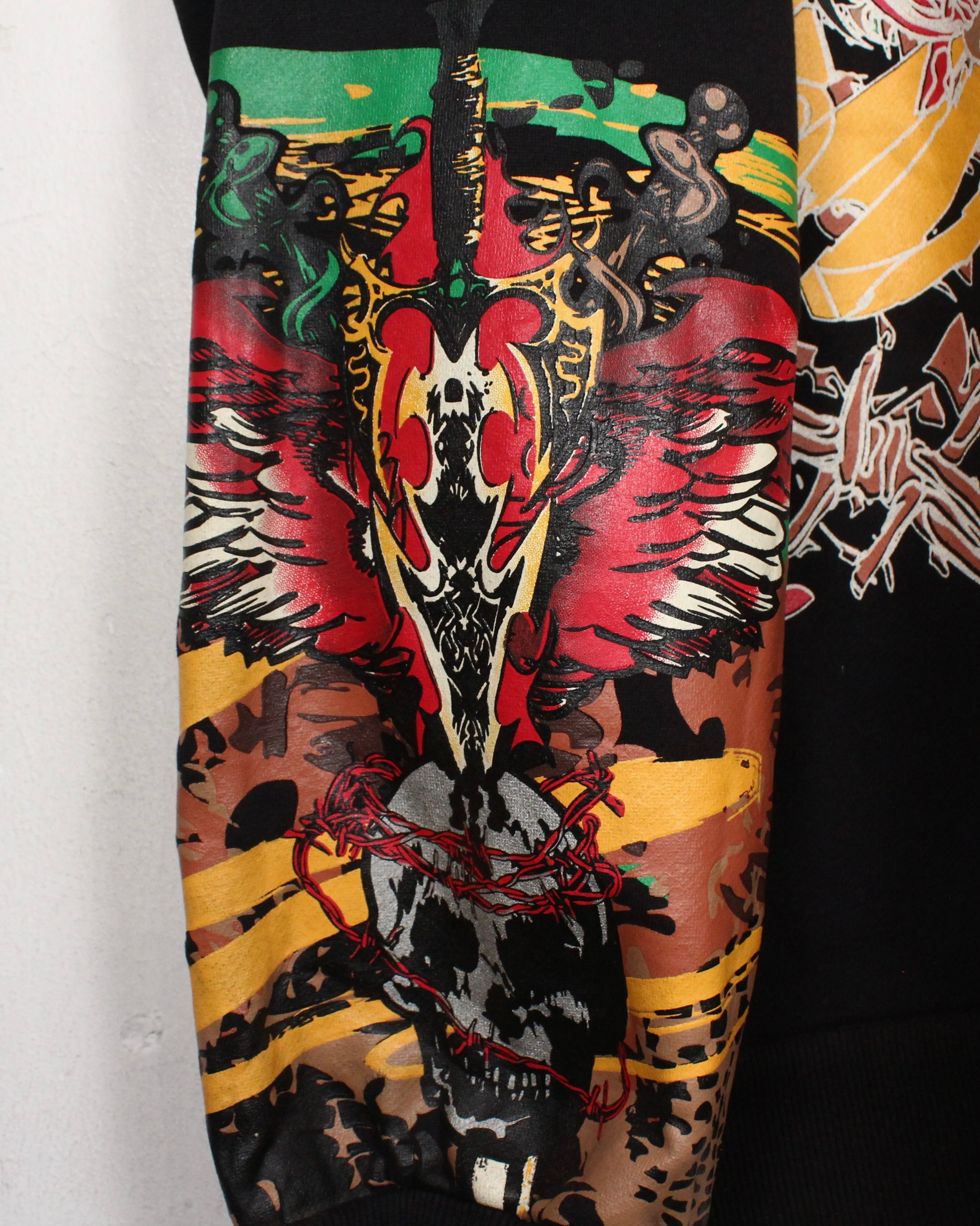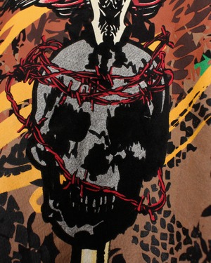 全体を覆うように施されたグラフィックは、スカルなど多様なモチーフが重なり合い、カオティックでありながらも独自の世界観を作り出しています。プリントの一部分はフロッキープリントで表現され、背面には翼を広げたスカルモチーフを大きく配置。見る者に強烈なインパクトを与える1着です。